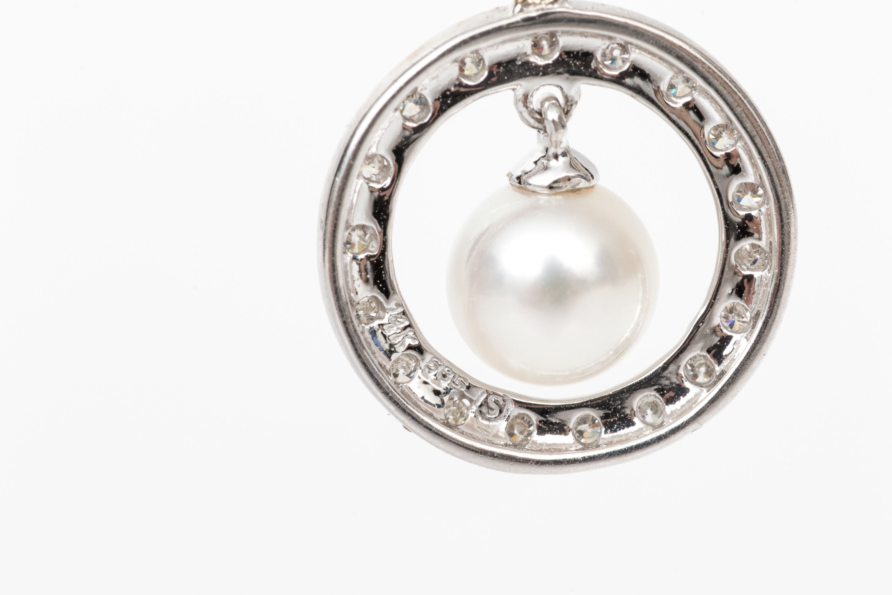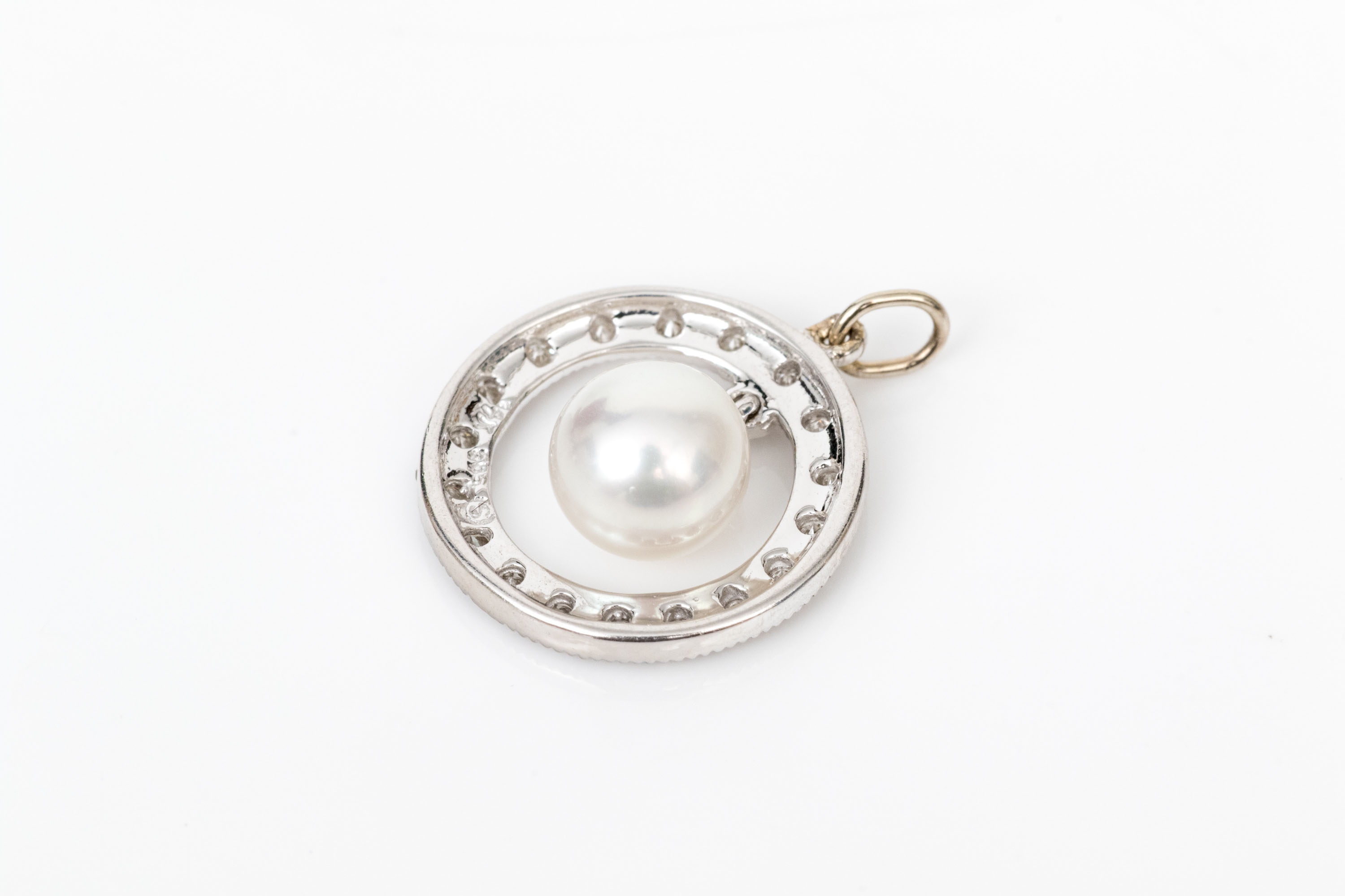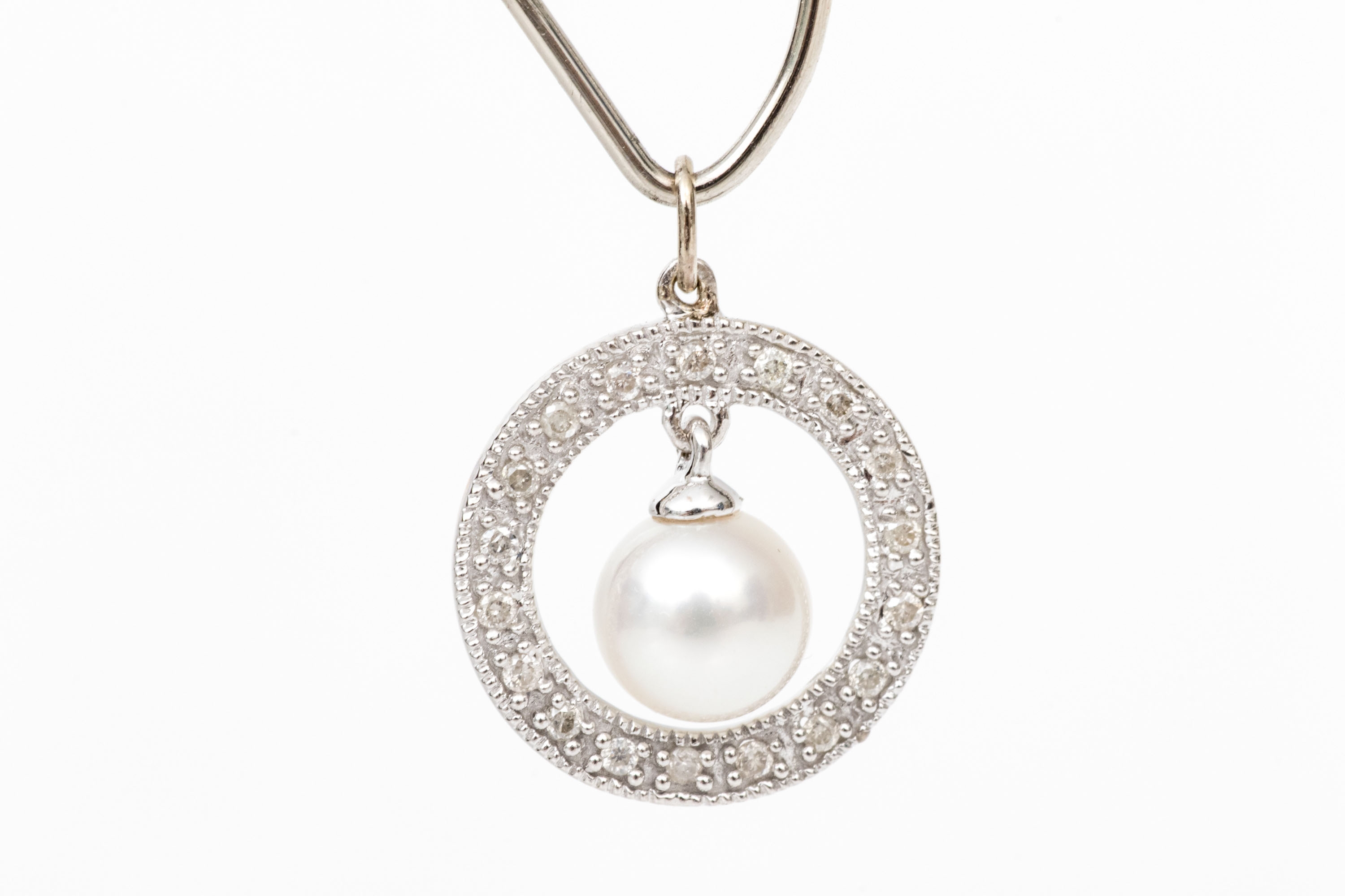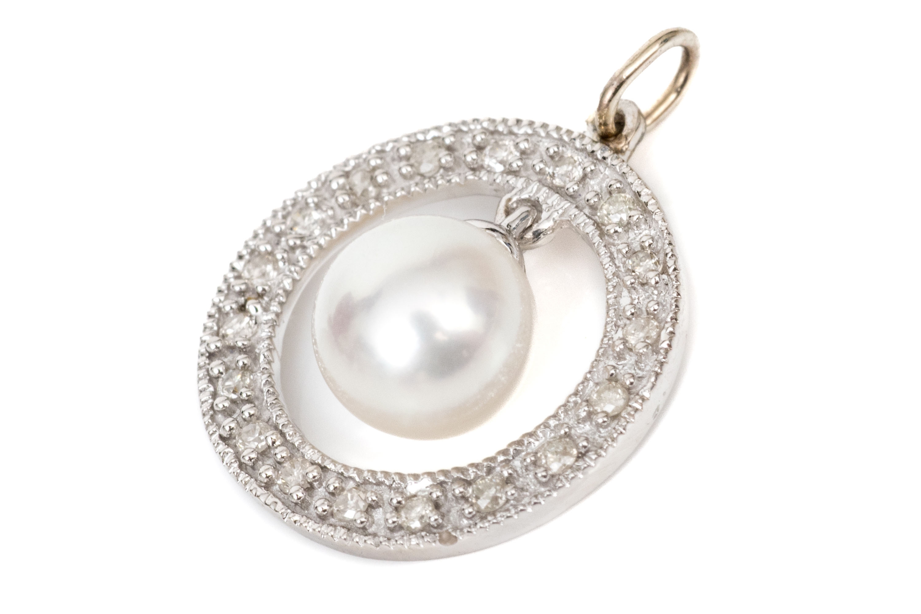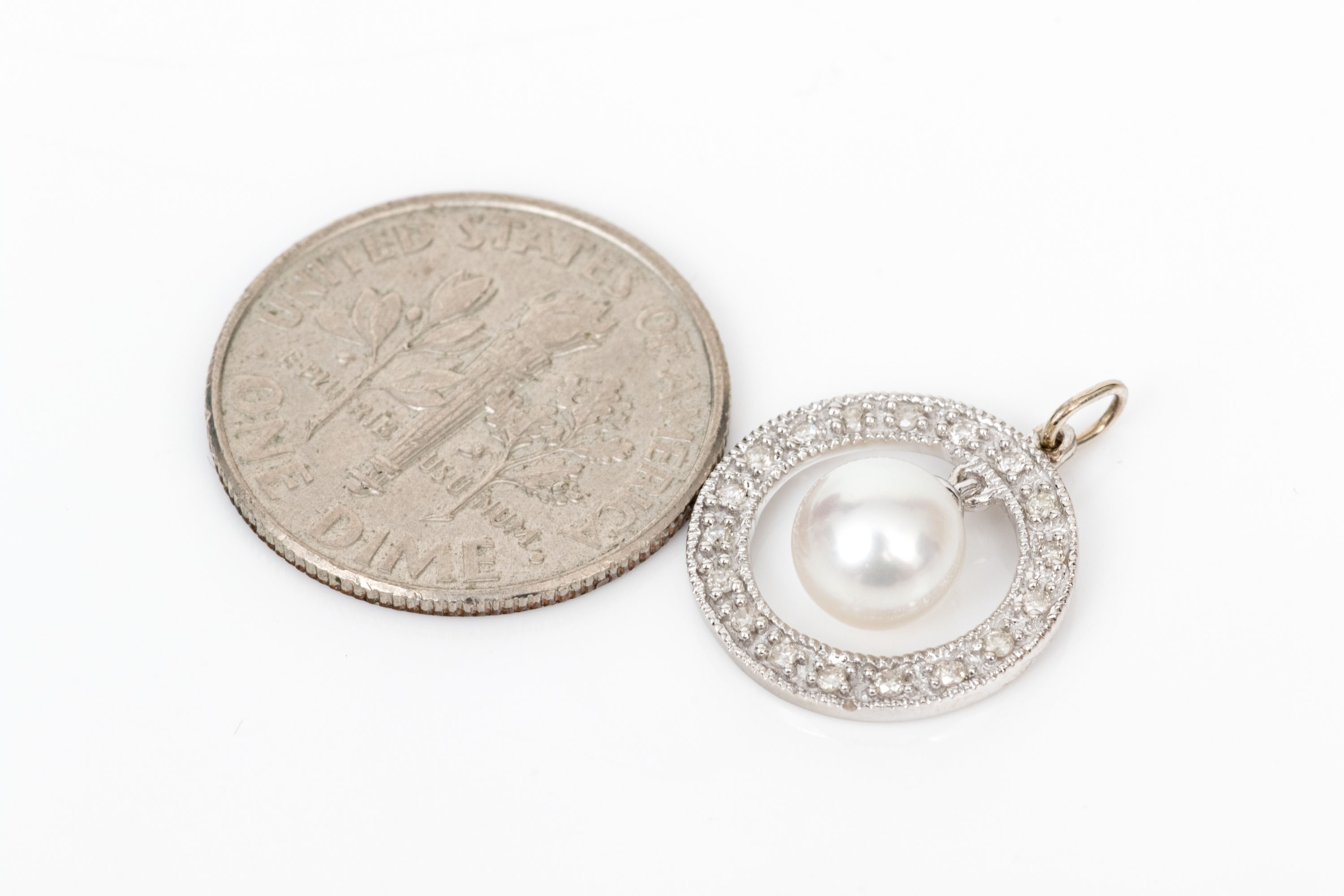 14k white gold pretty diamond halo and cultured pearl set pendant, app. 0.09 TCW, finished with a 5.8 mm cultured pearl, white toned, and a jump ring style bale