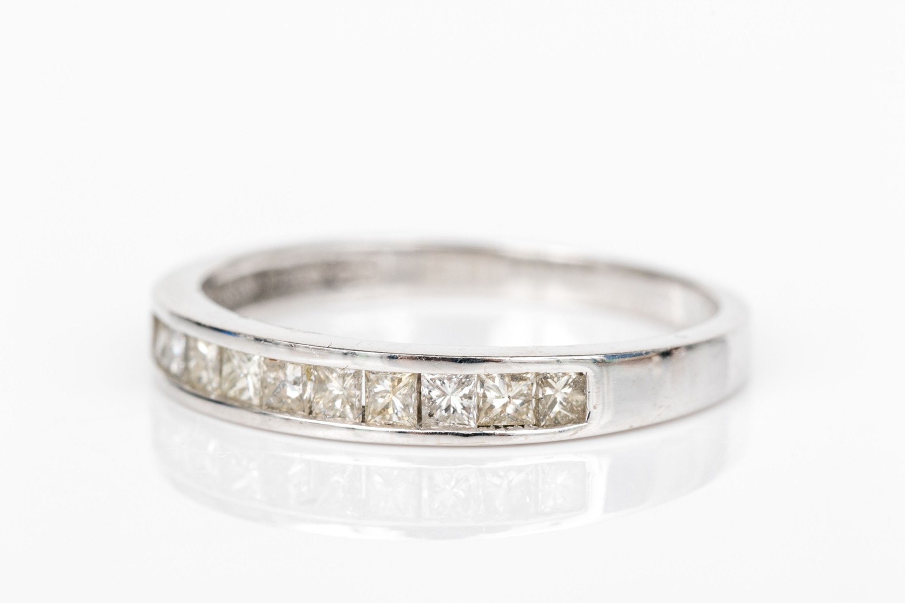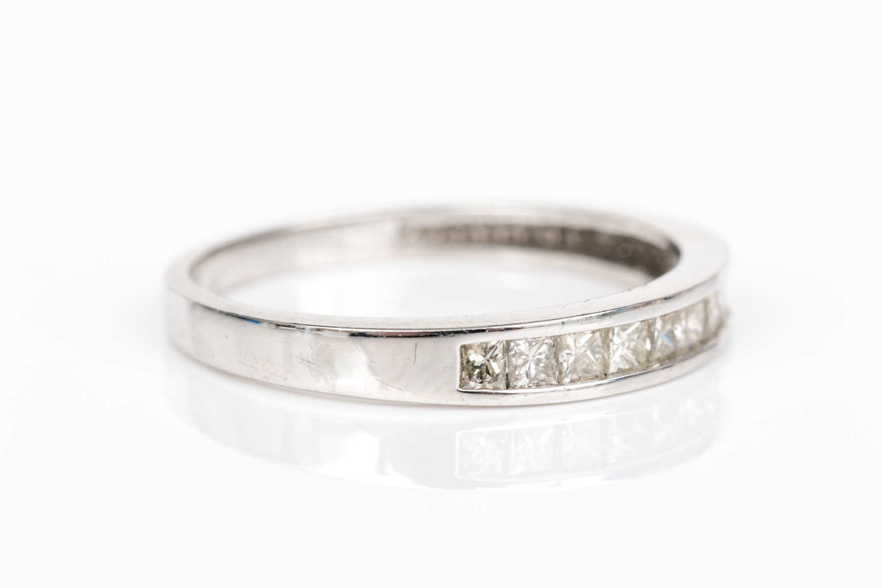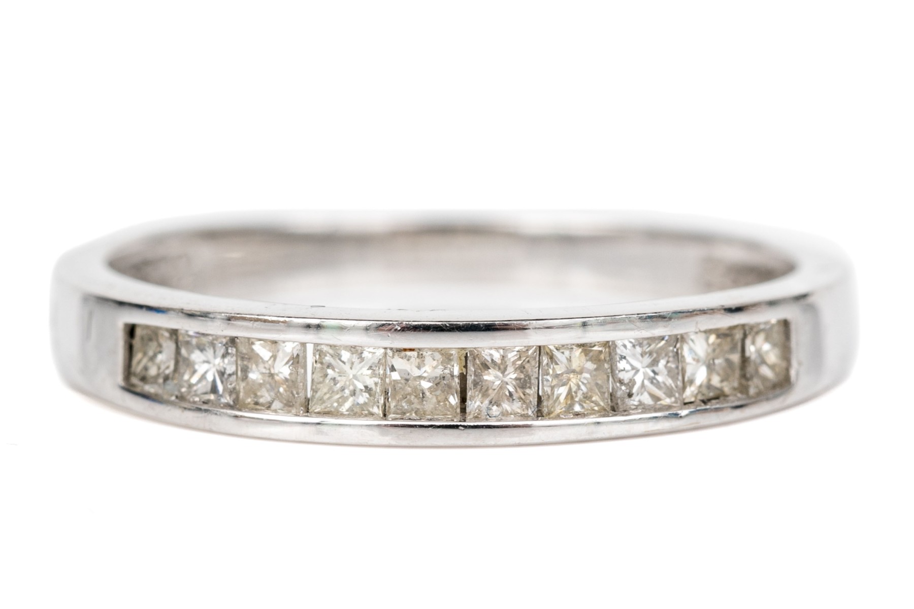 14k white gold pretty princess cut diamond channel set band, app. 0.20 TCW, size 7. The diamonds are I1 clarity, K to L color