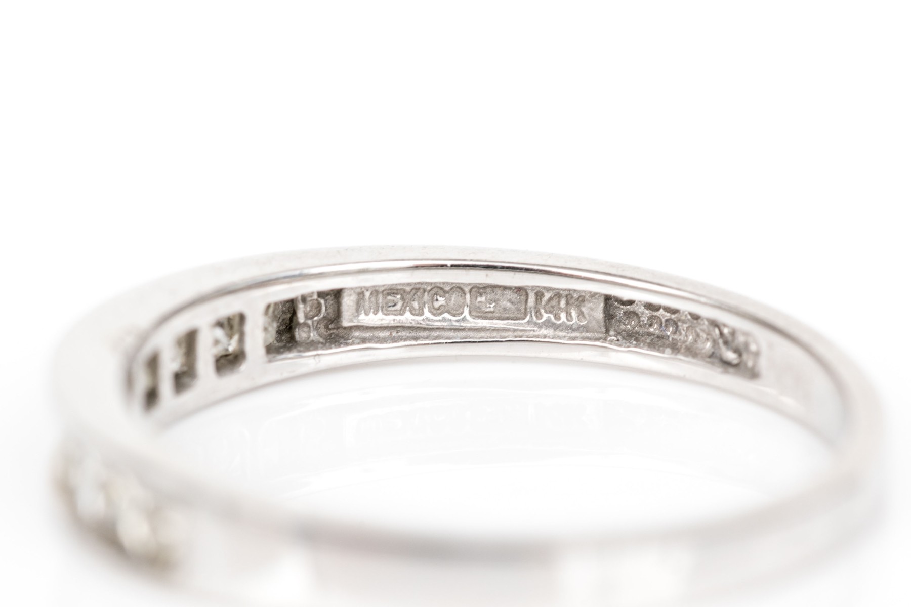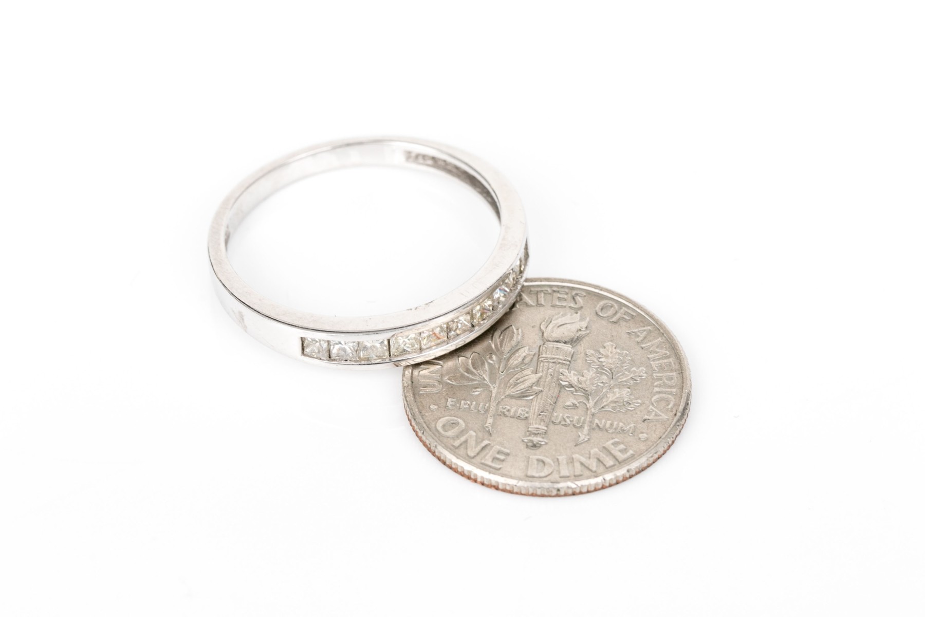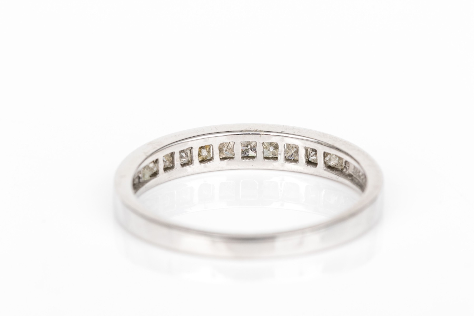 14k white gold pretty princess cut diamond channel set band, app. 0.20 TCW, size 7. The diamonds are I1 clarity, K to L color