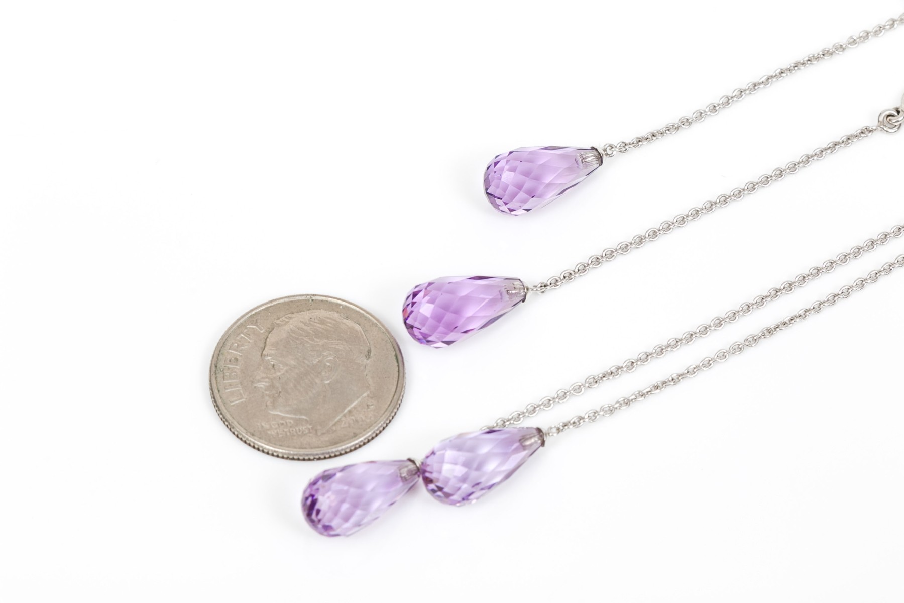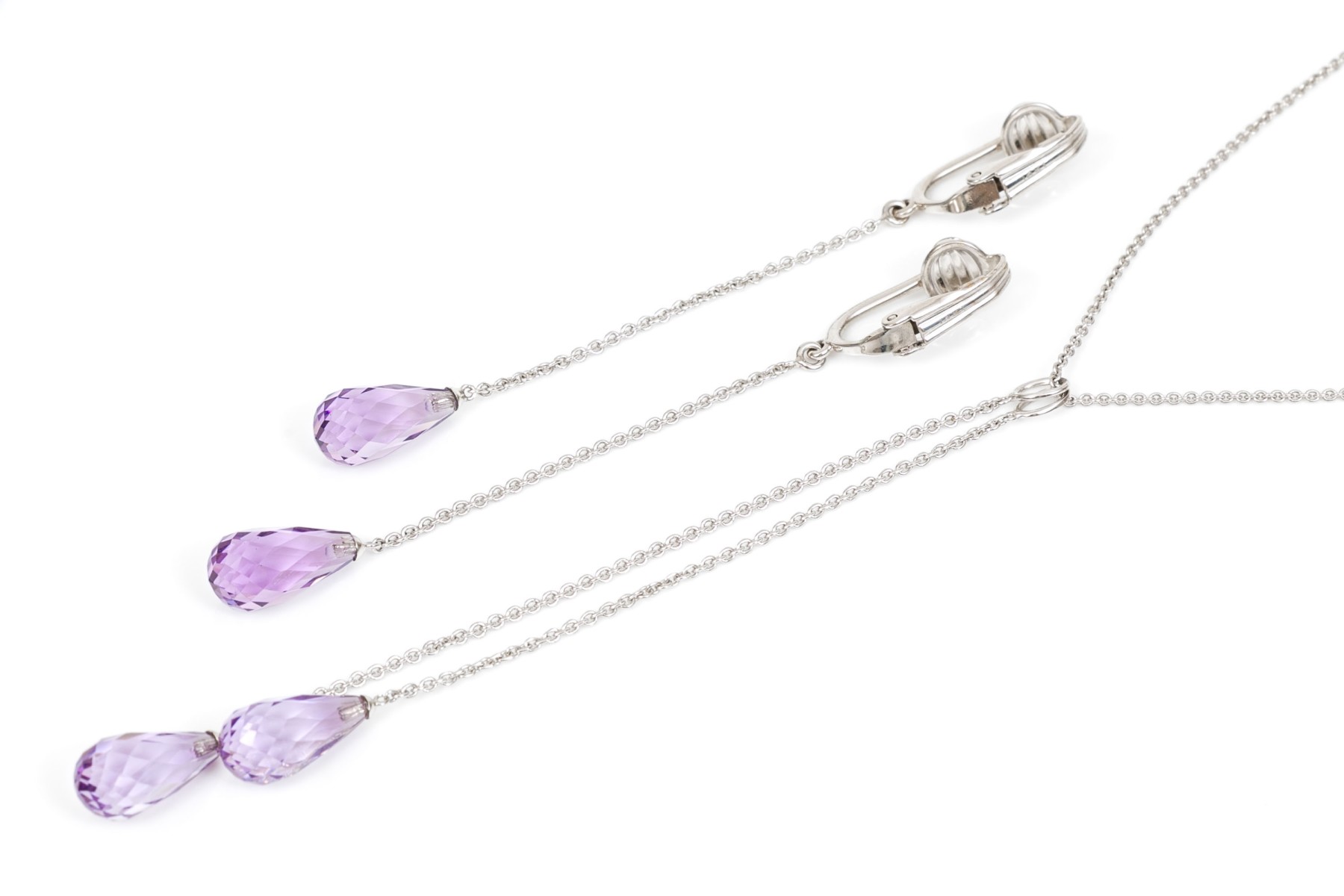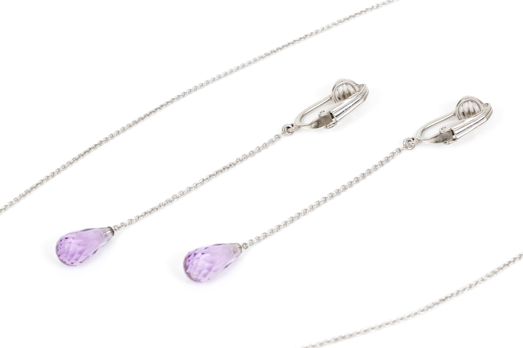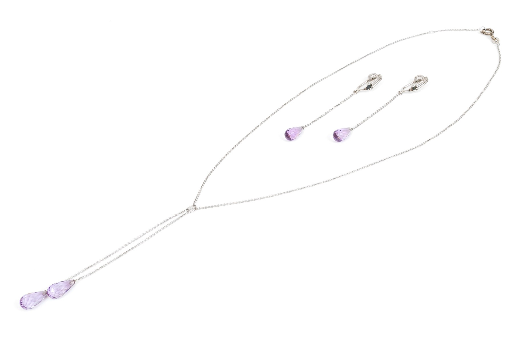 14k white gold pretty briolette amethyst necklace and earrings set. This fun set features a "y" style necklace, with light purple amethyst briolette ends, accompanied by matching drop pendant earrings with clip on style backs. The necklace is finished with a spring ring style clasp.