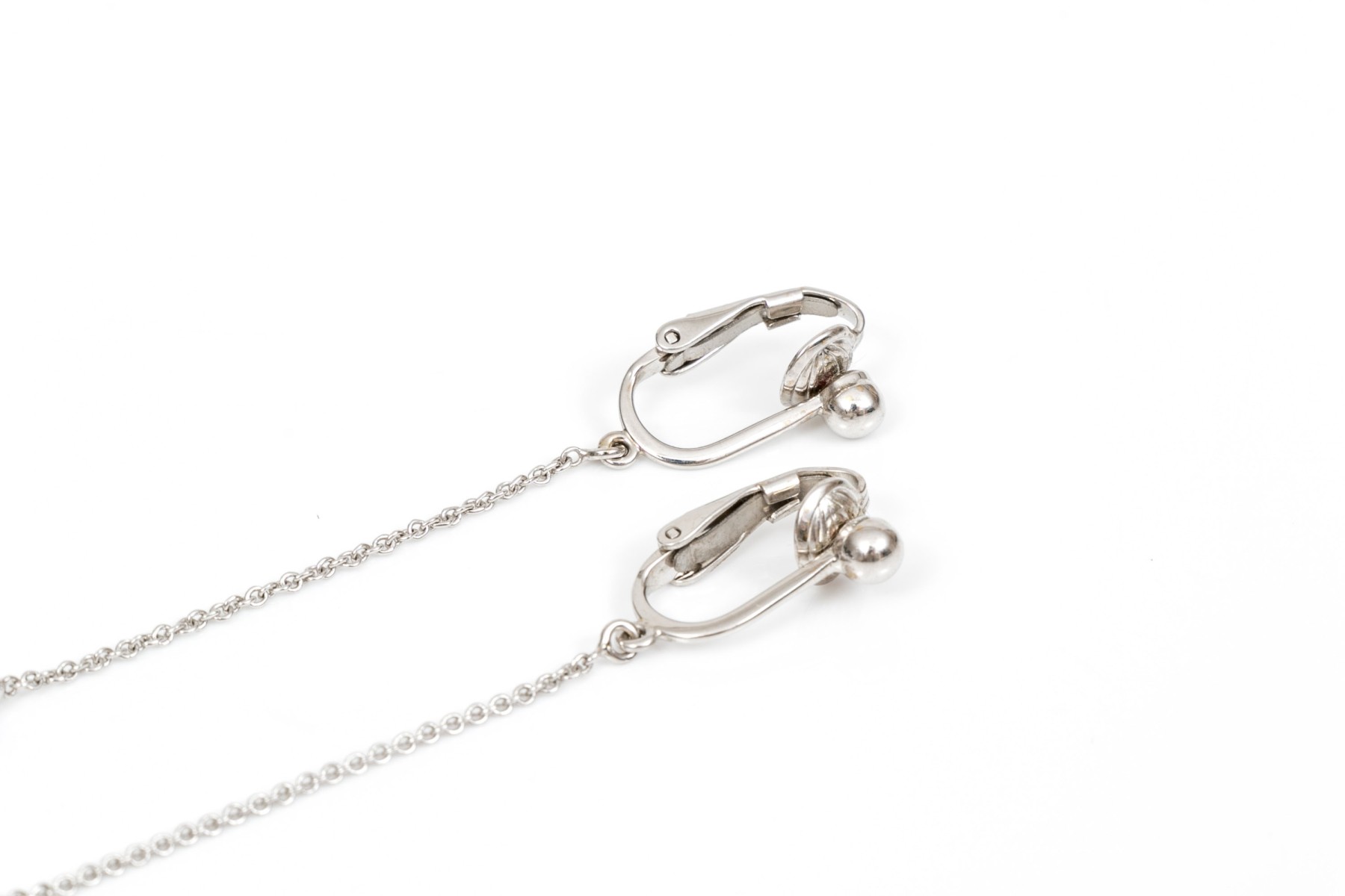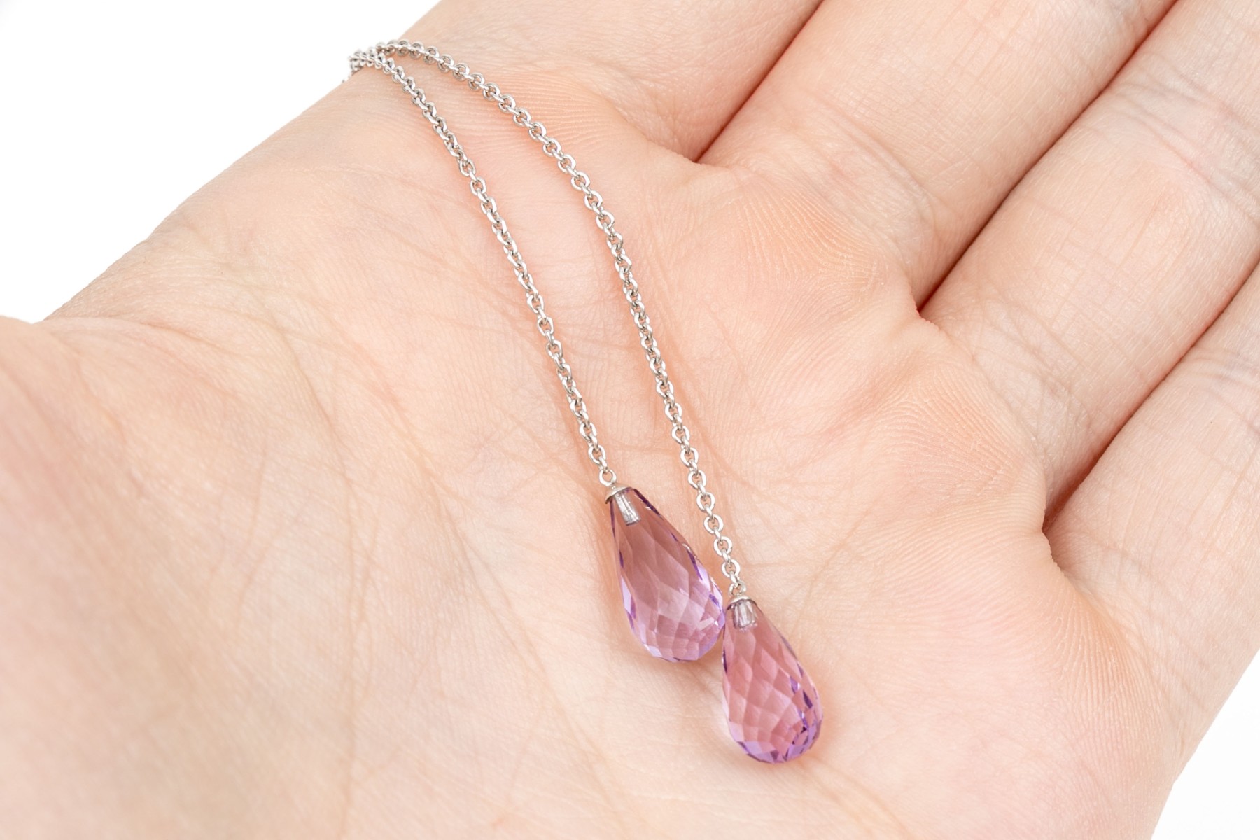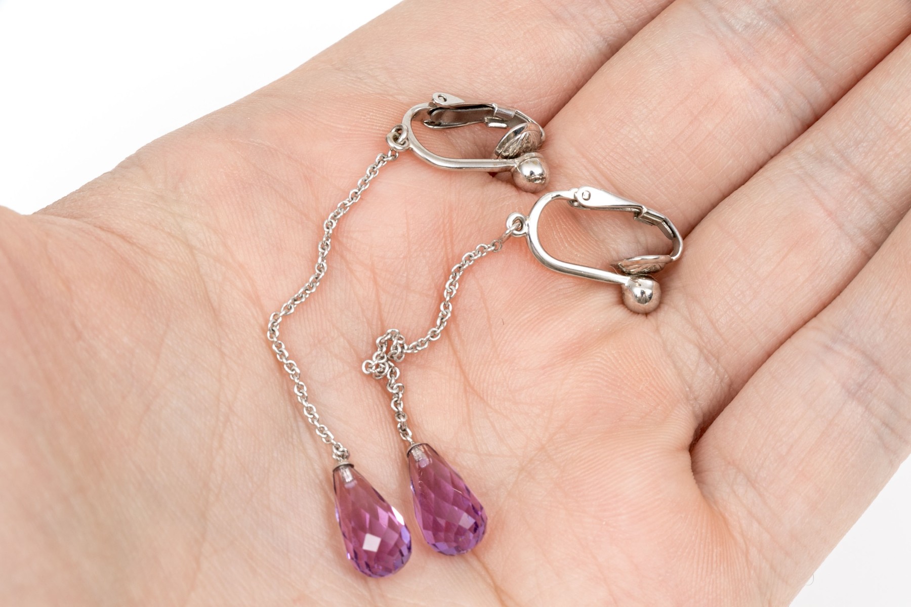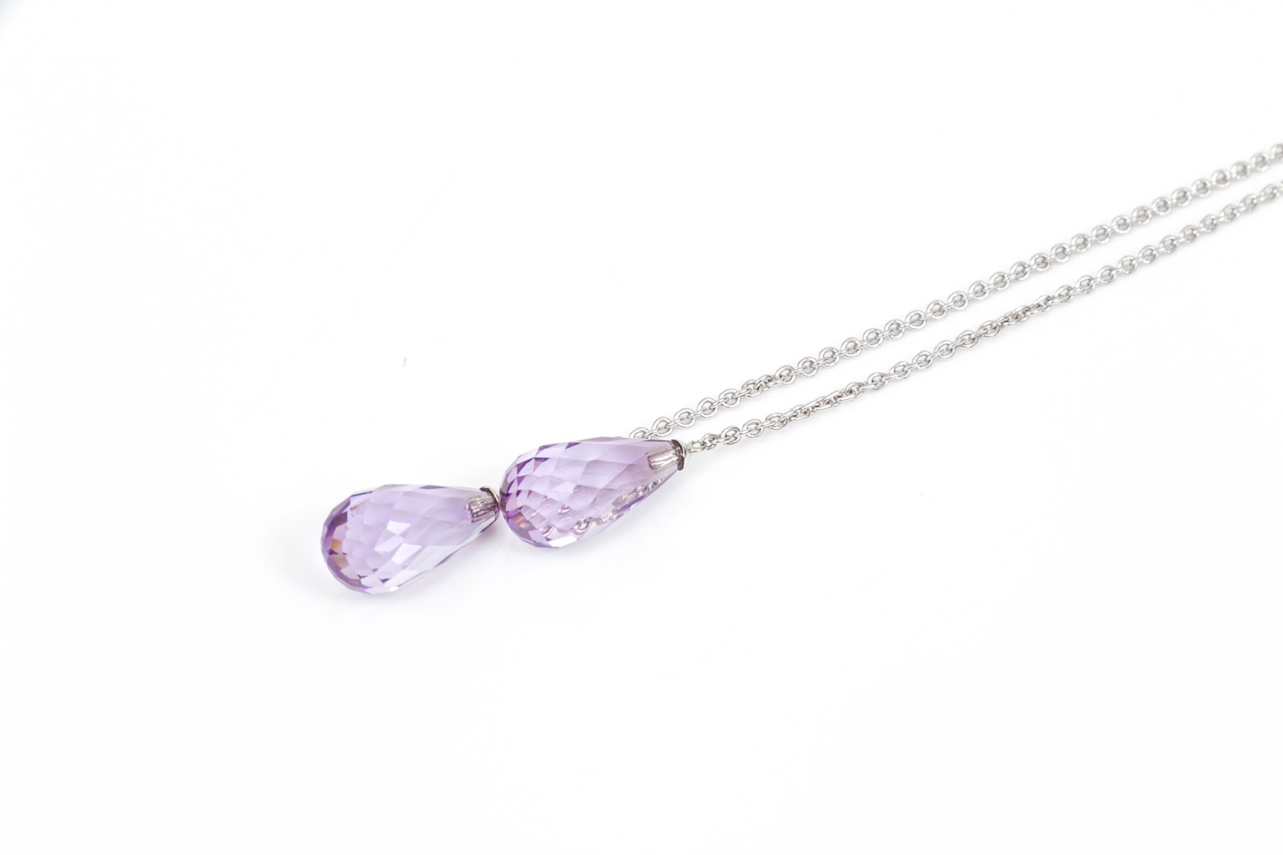 14k white gold pretty briolette amethyst necklace and earrings set. This fun set features a "y" style necklace, with light purple amethyst briolette ends, accompanied by matching drop pendant earrings with clip on style backs. The necklace is finished with a spring ring style clasp.