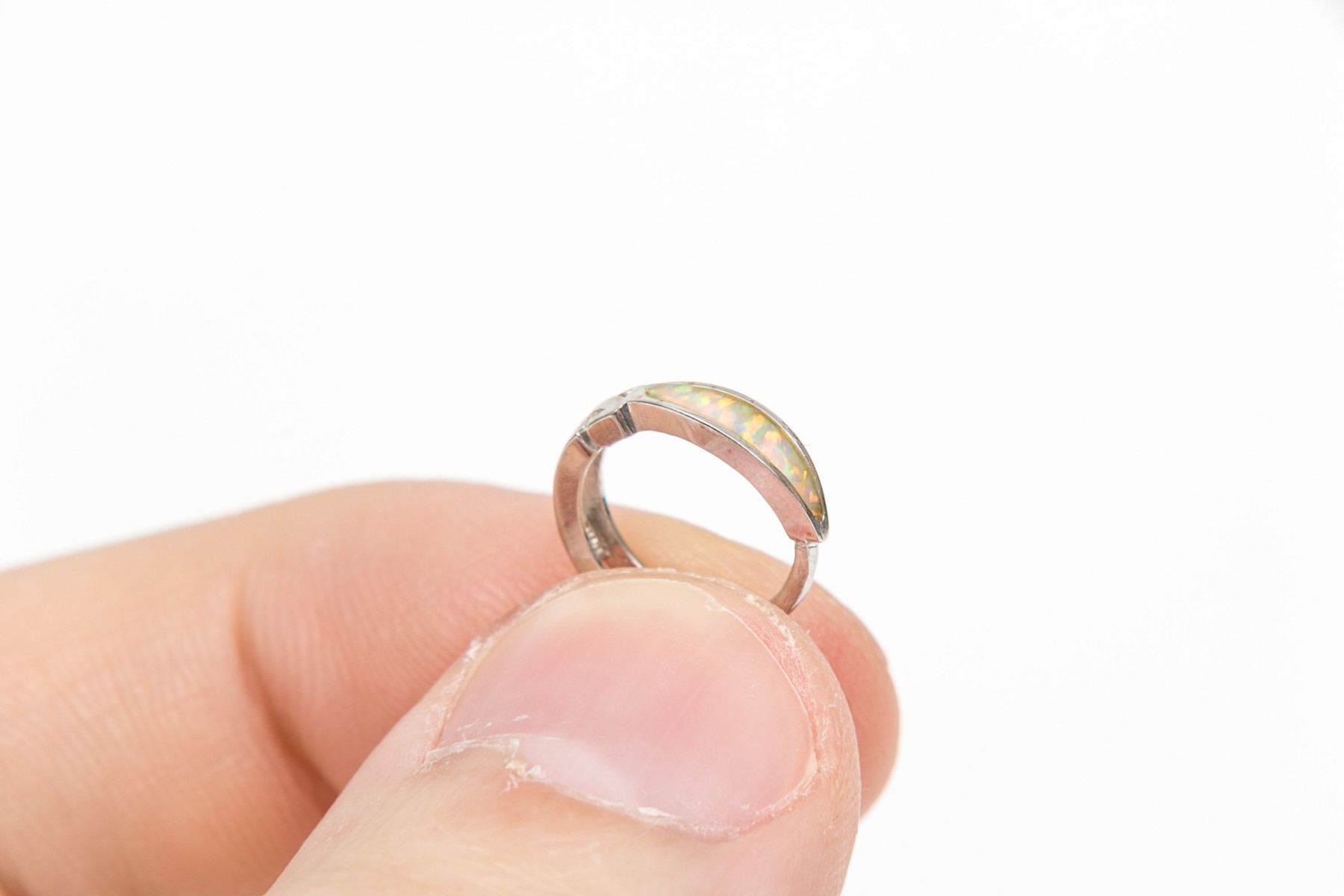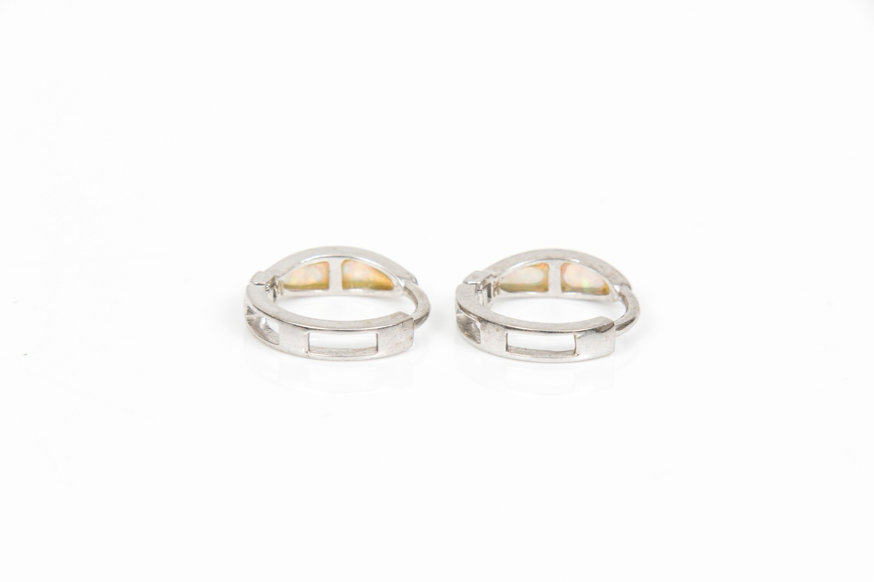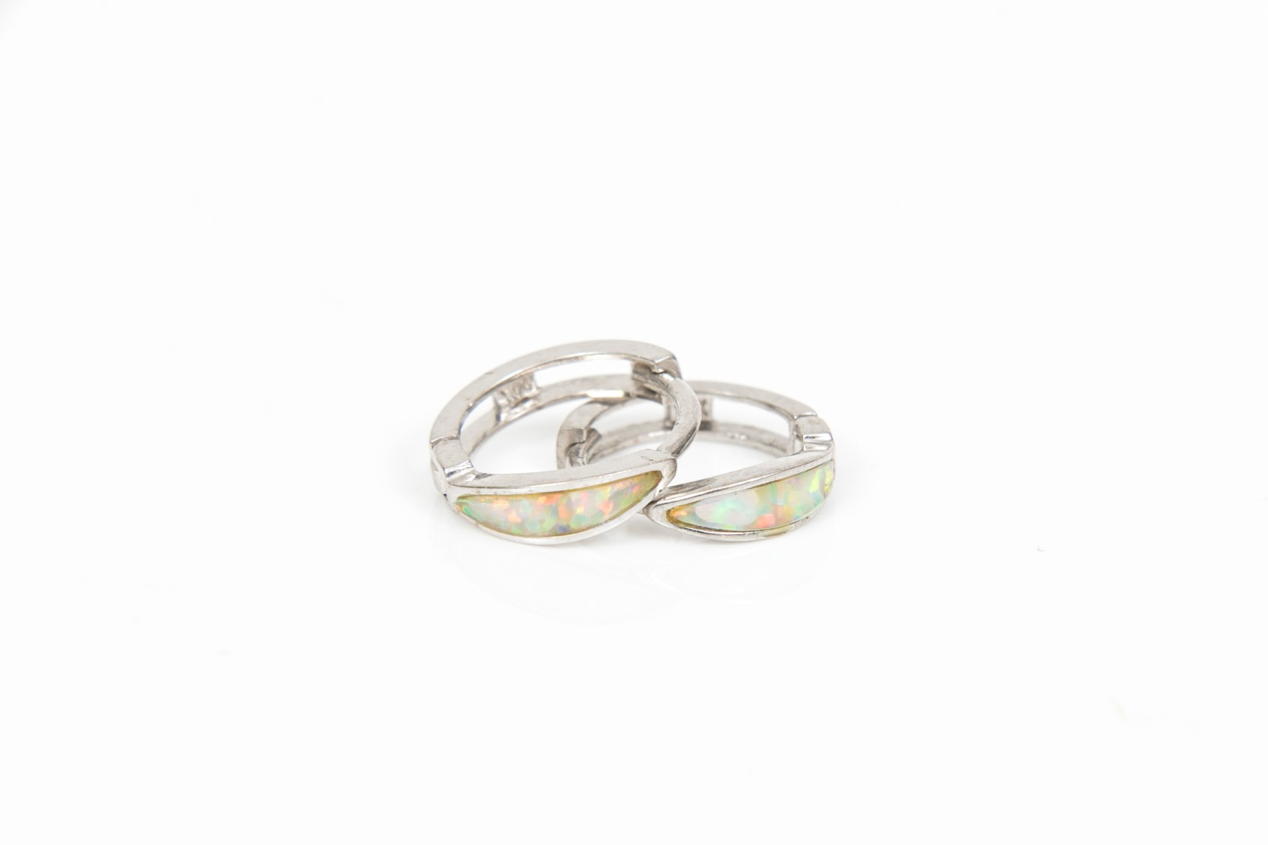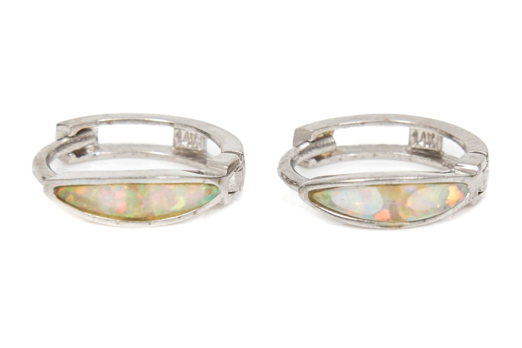 14k white gold pretty small channel faux opal hinged hoop earrings, finished by snap closures