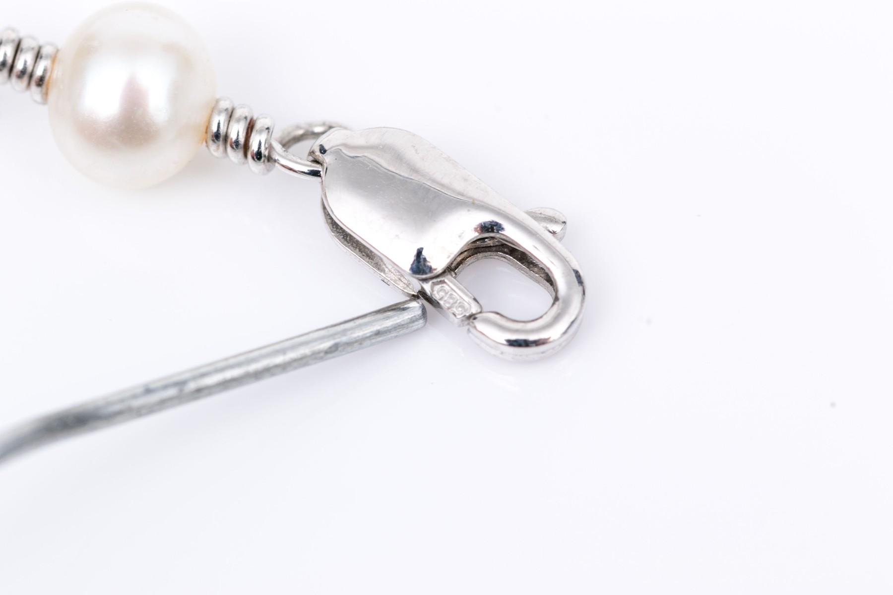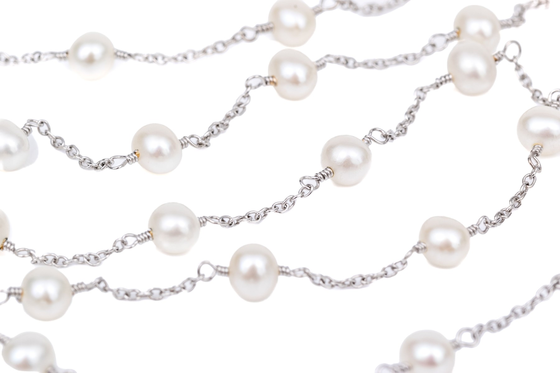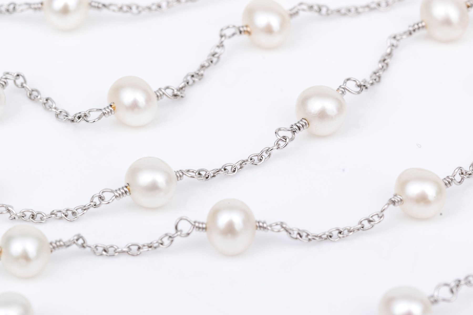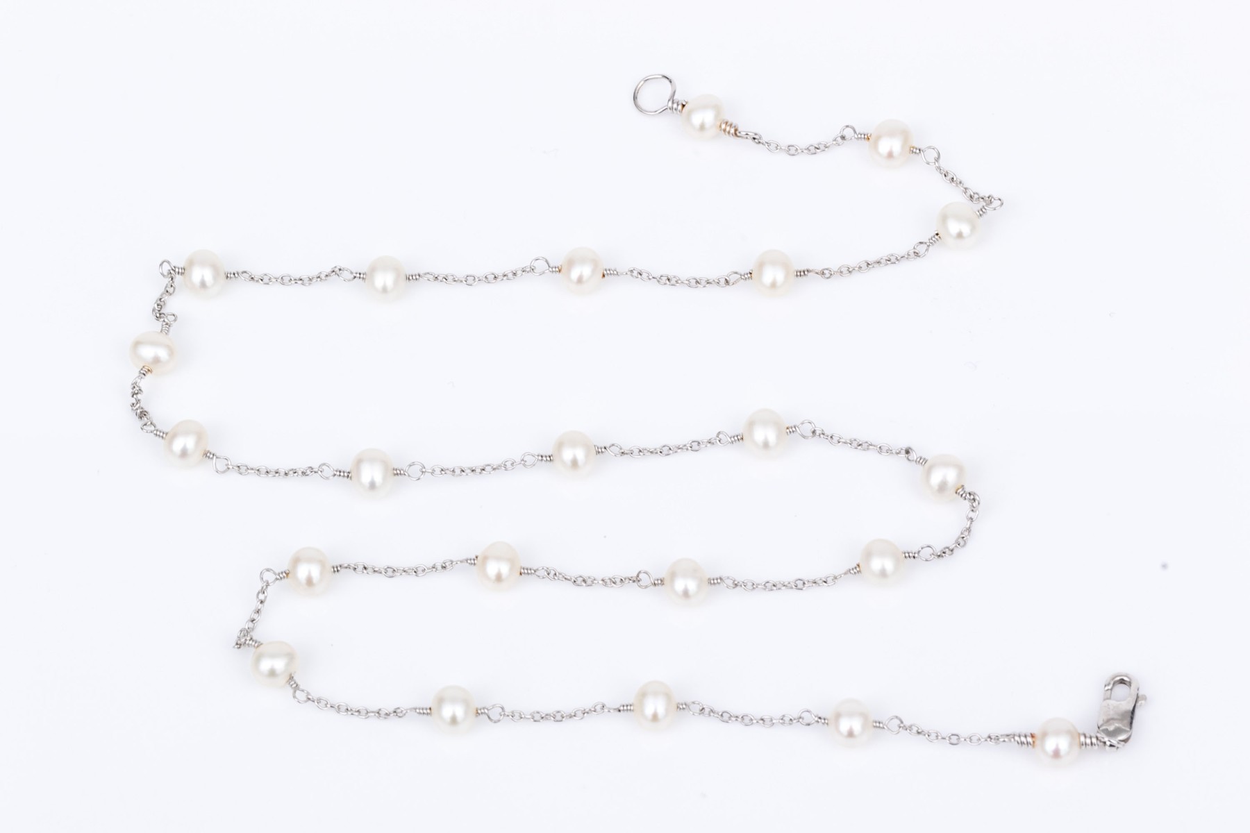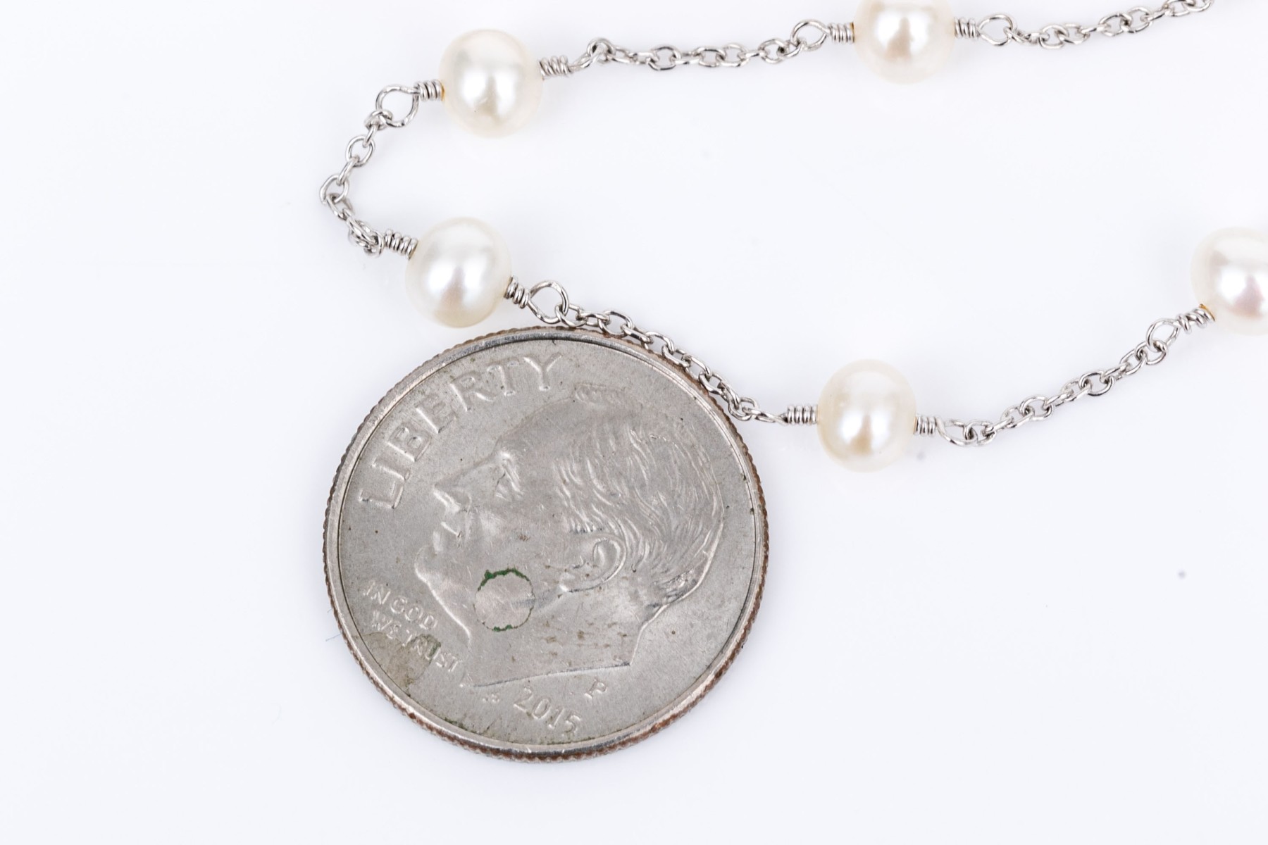 14k white gold pretty white cultured freshwater pearl station necklace, 4.75 mm cultured freshwater pearls, finished with a lobster claw style clasp