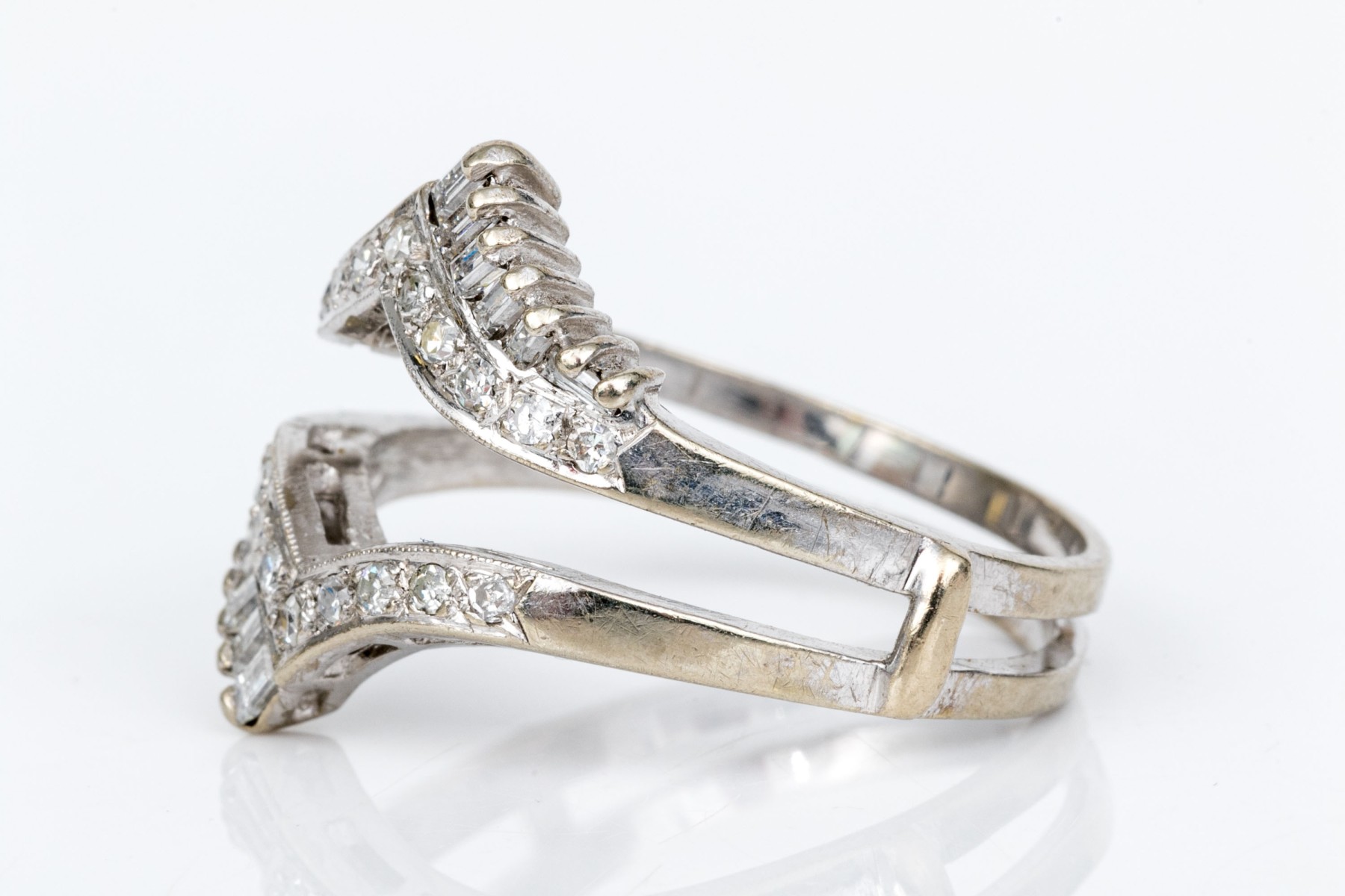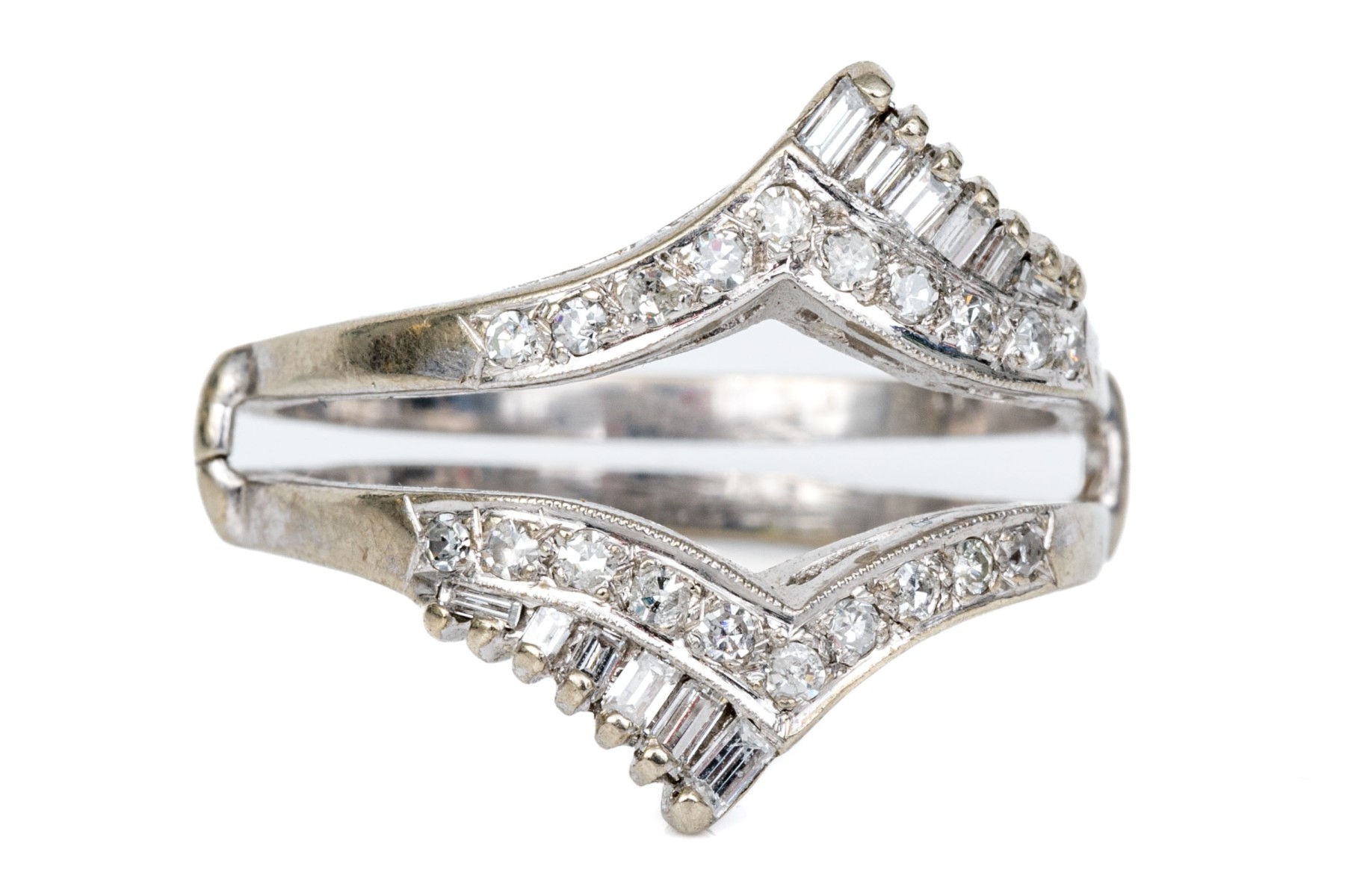 14k white gold retro baguette and round diamond set guard ring, app. 0.32 TCW, size 11