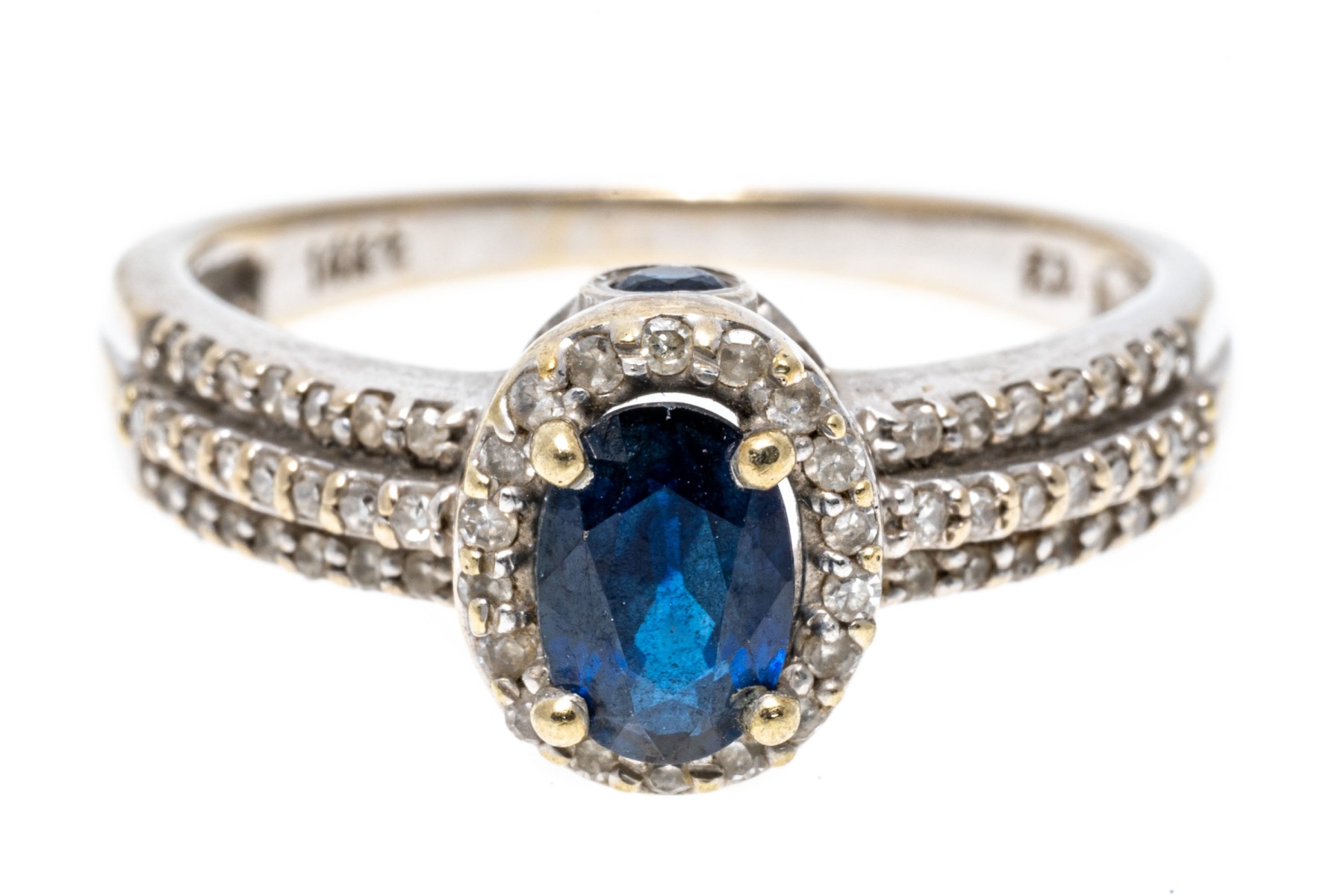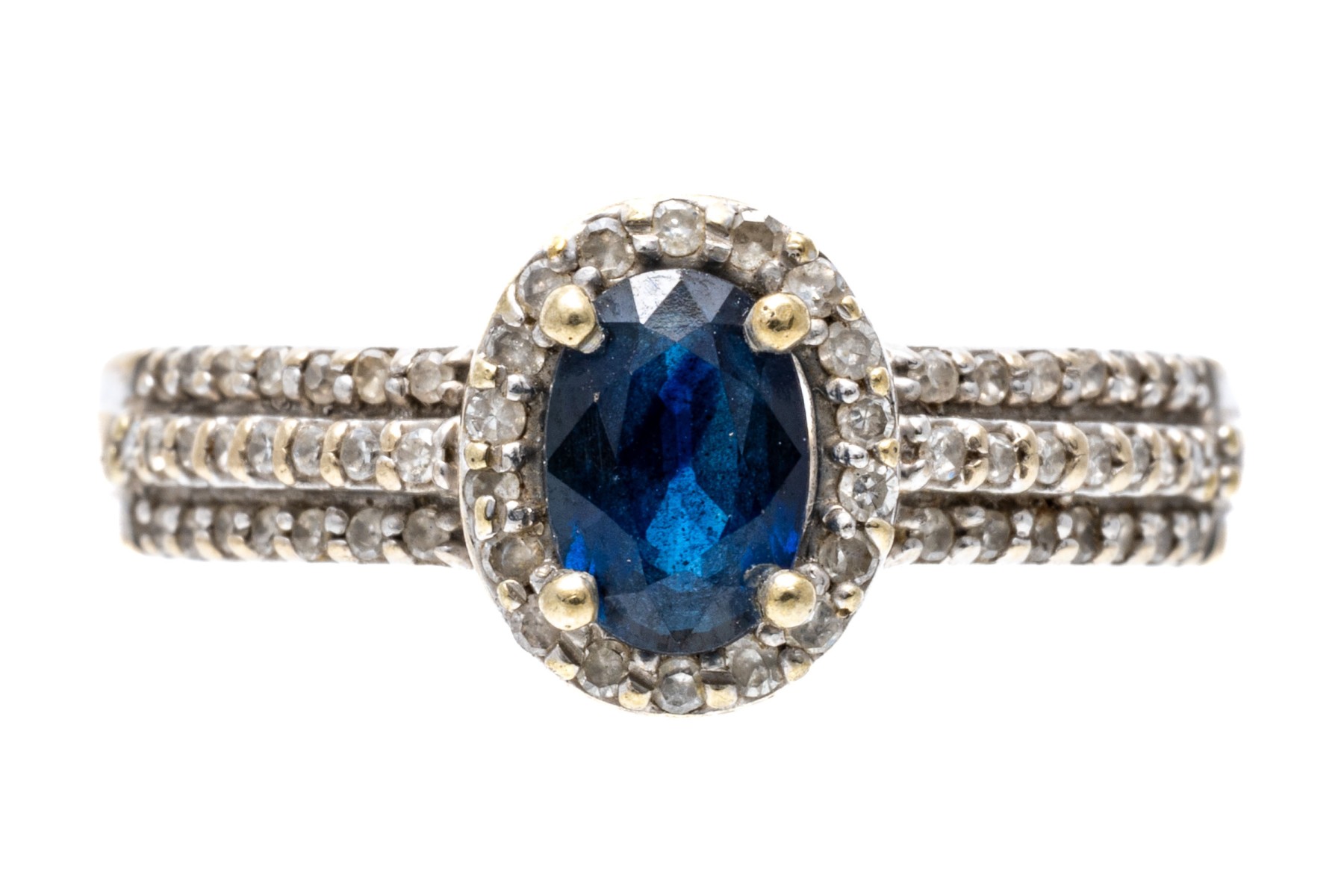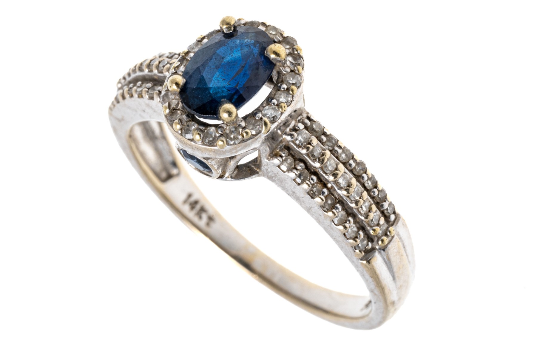 A contemporary white gold ring displaying a dark blue, oval faceted sapphire surrounded by a halo of diamonds, complementing a tiered design of pave set diamonds along the shoulders for excellent shimmer and visual interest.
