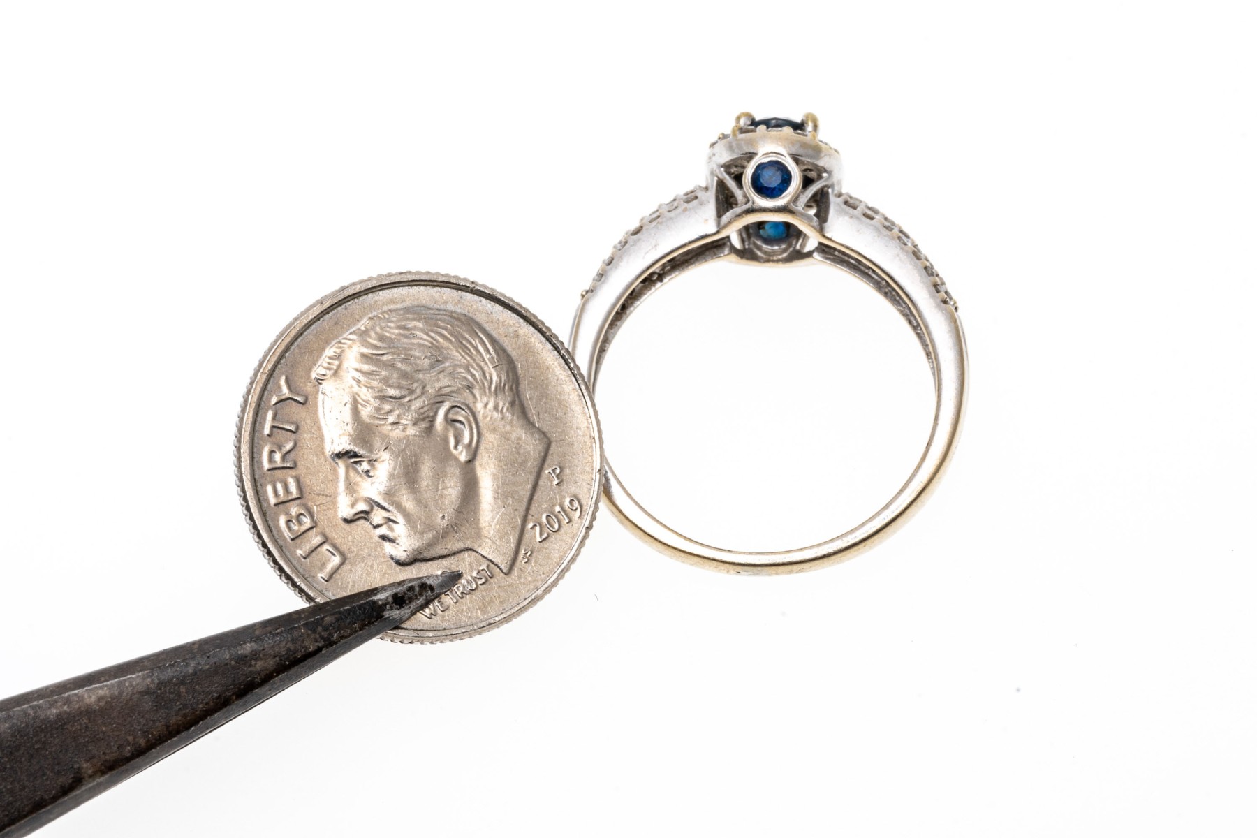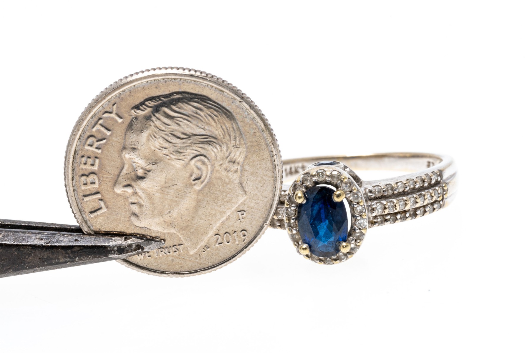 The sapphire is approximately 0.59 CTS. The diamonds are approximately 0.15 TCW.
