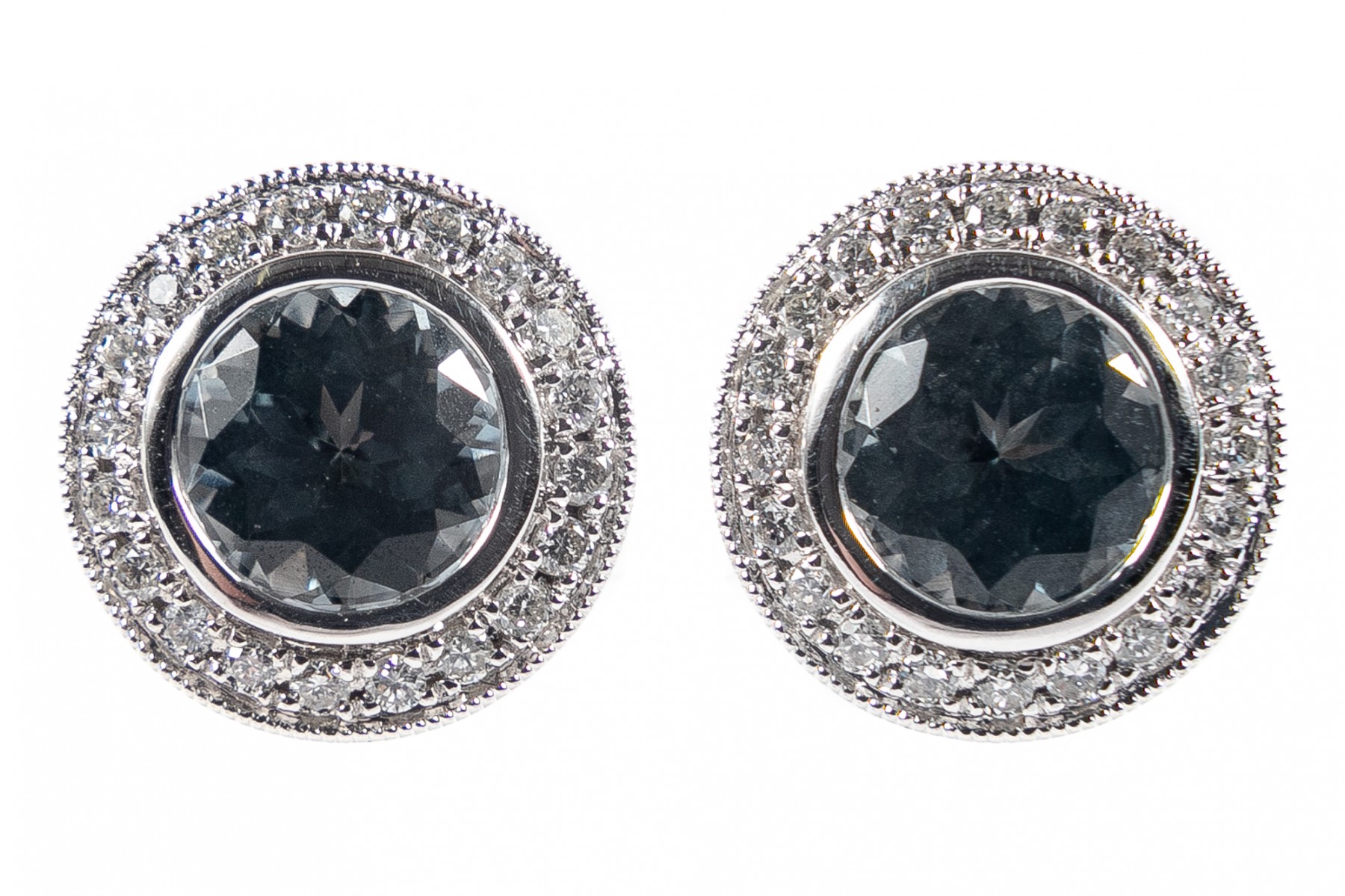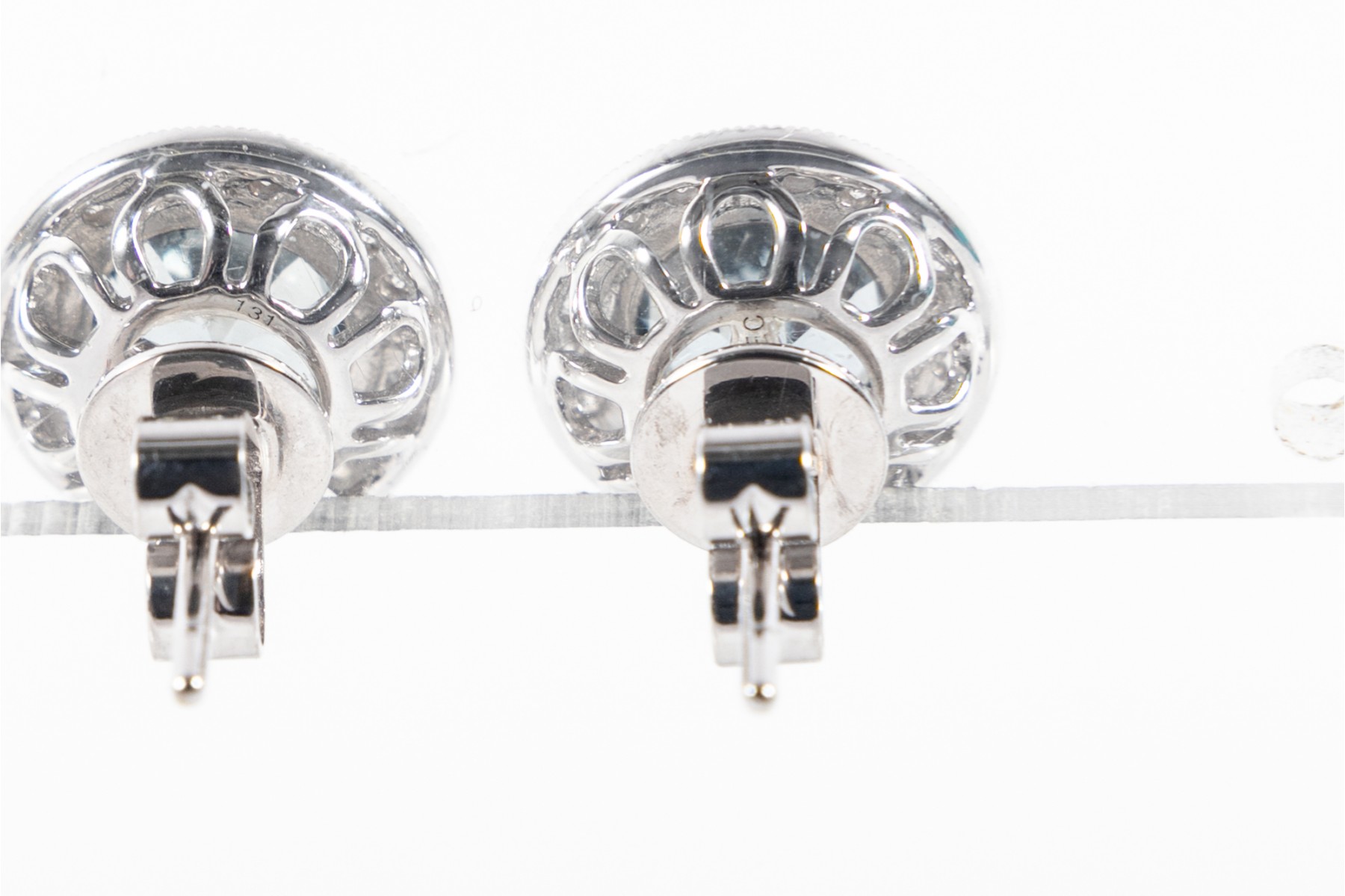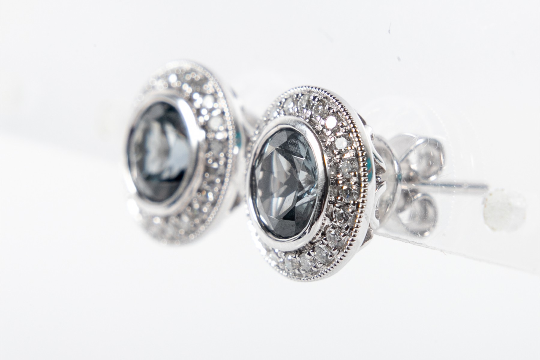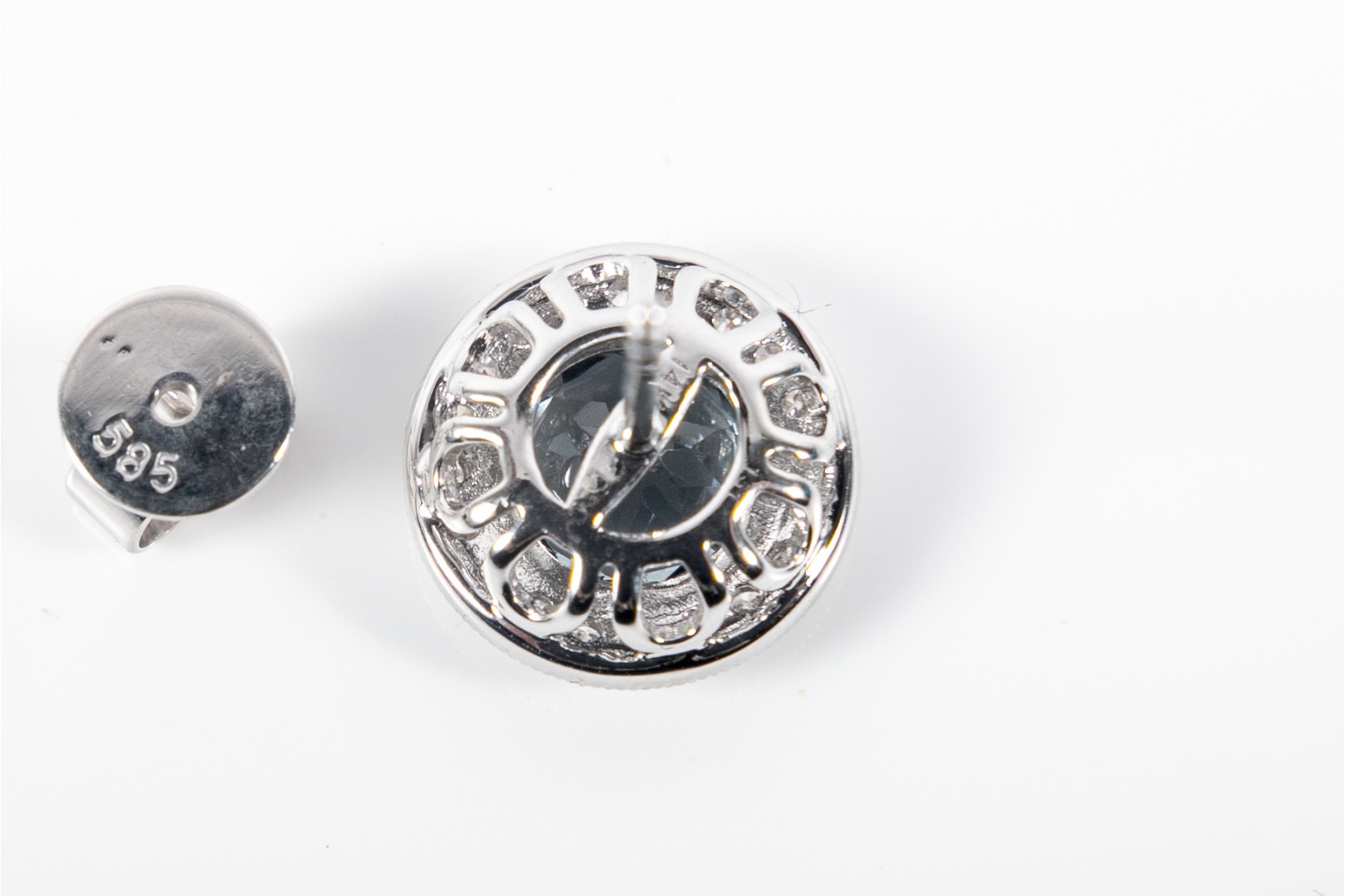A beautiful pair of white gold studs displaying round sapphire in pale indigo, surrounded by a halo of round white moissanites.