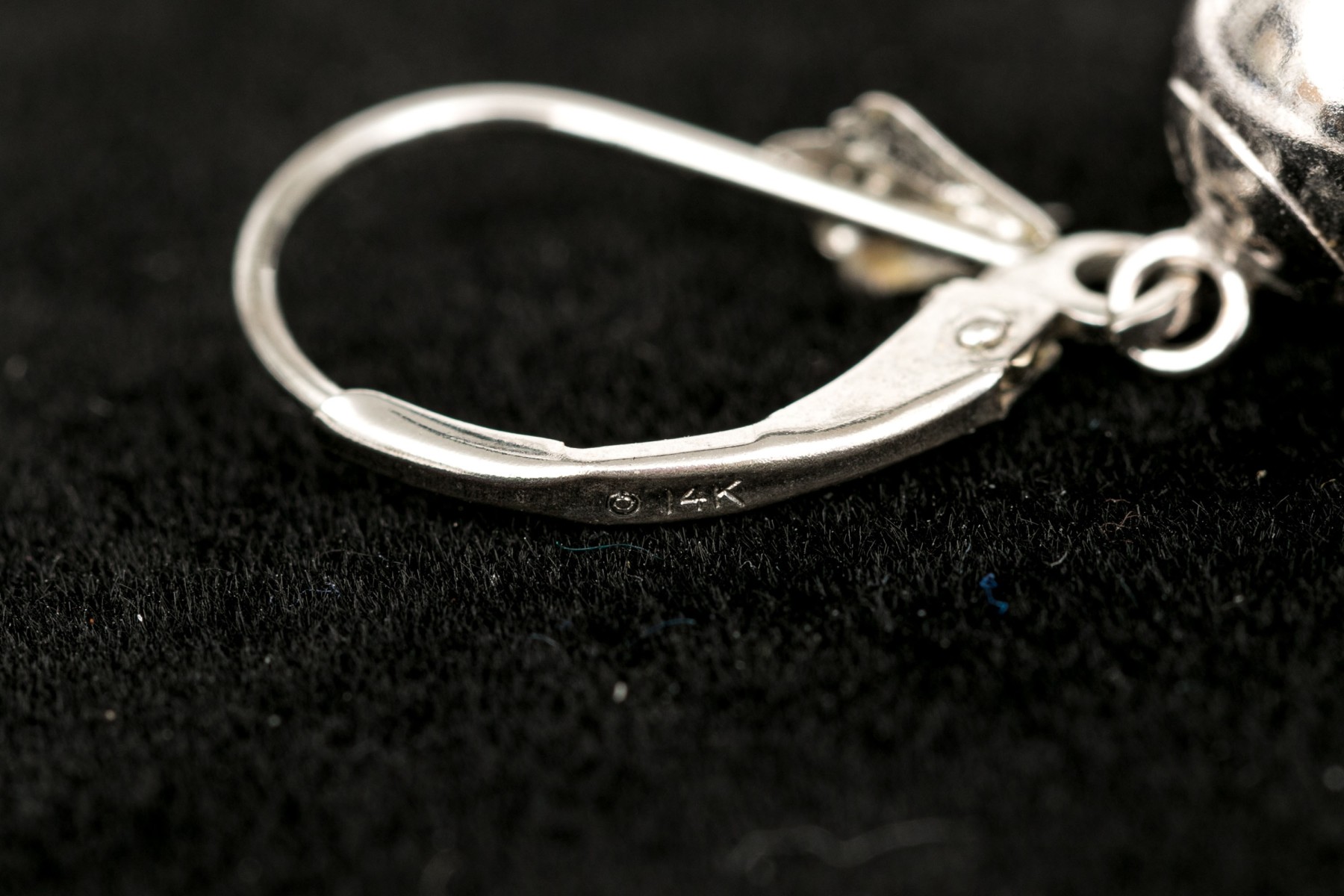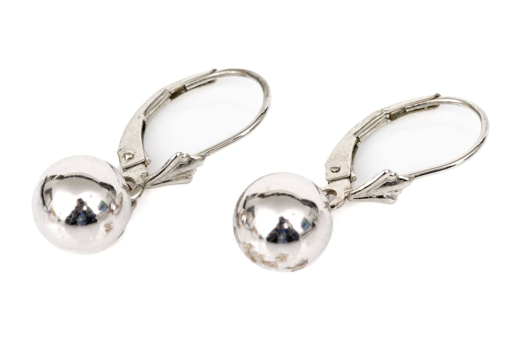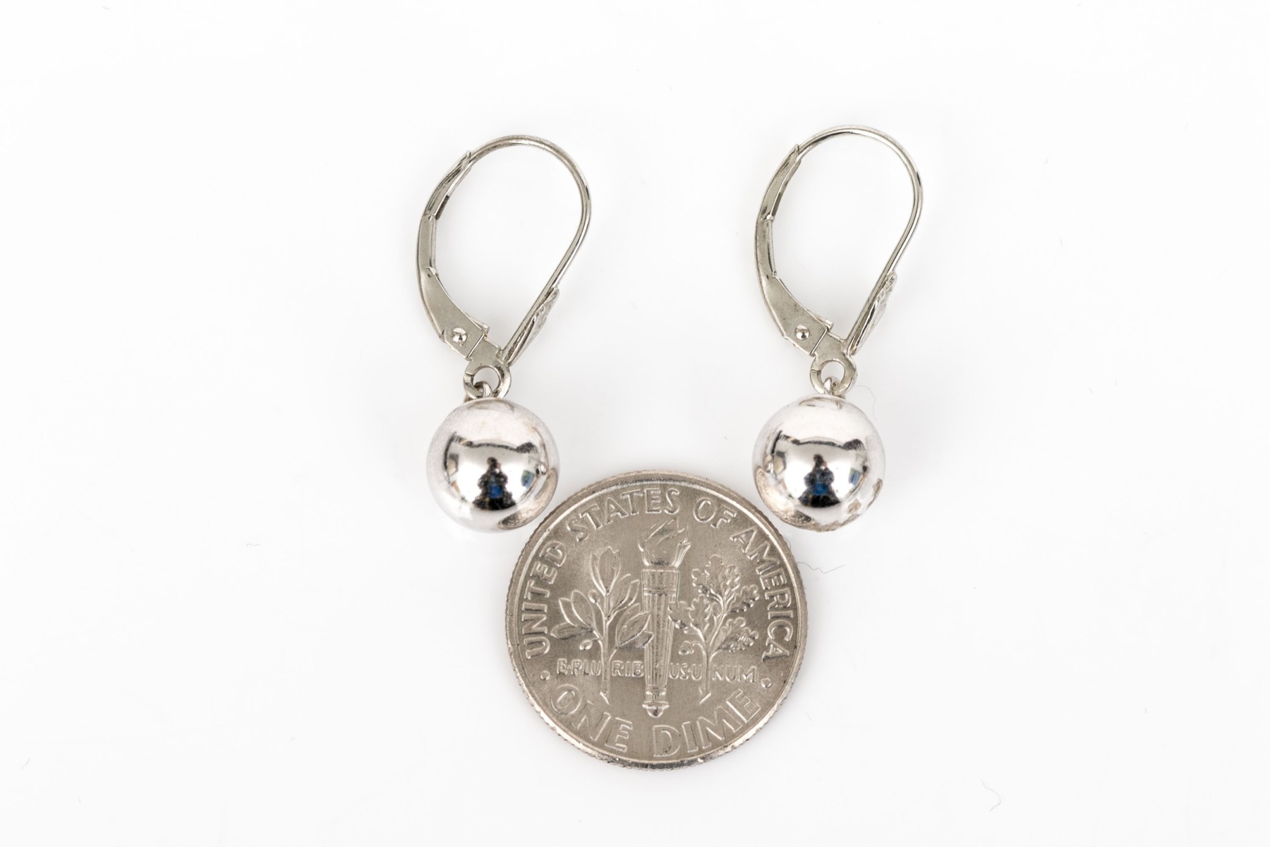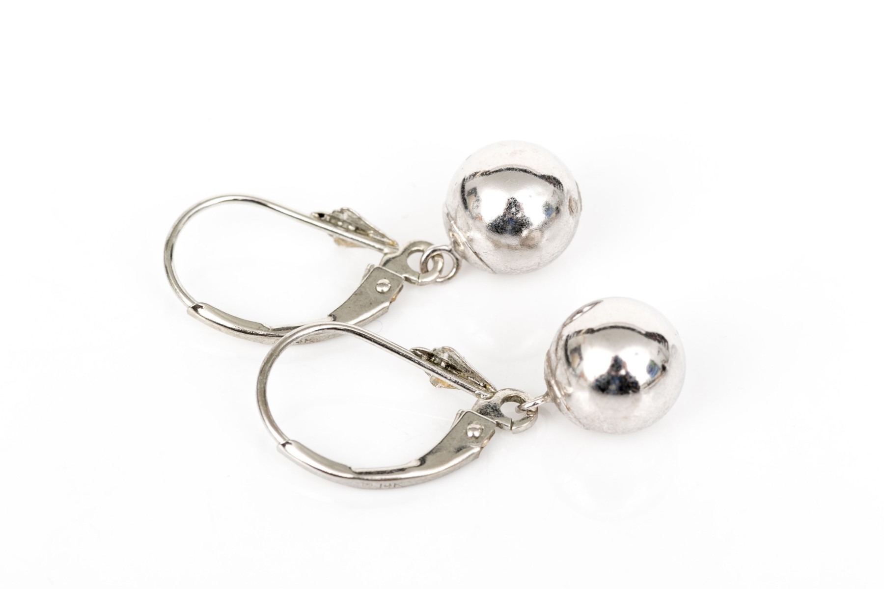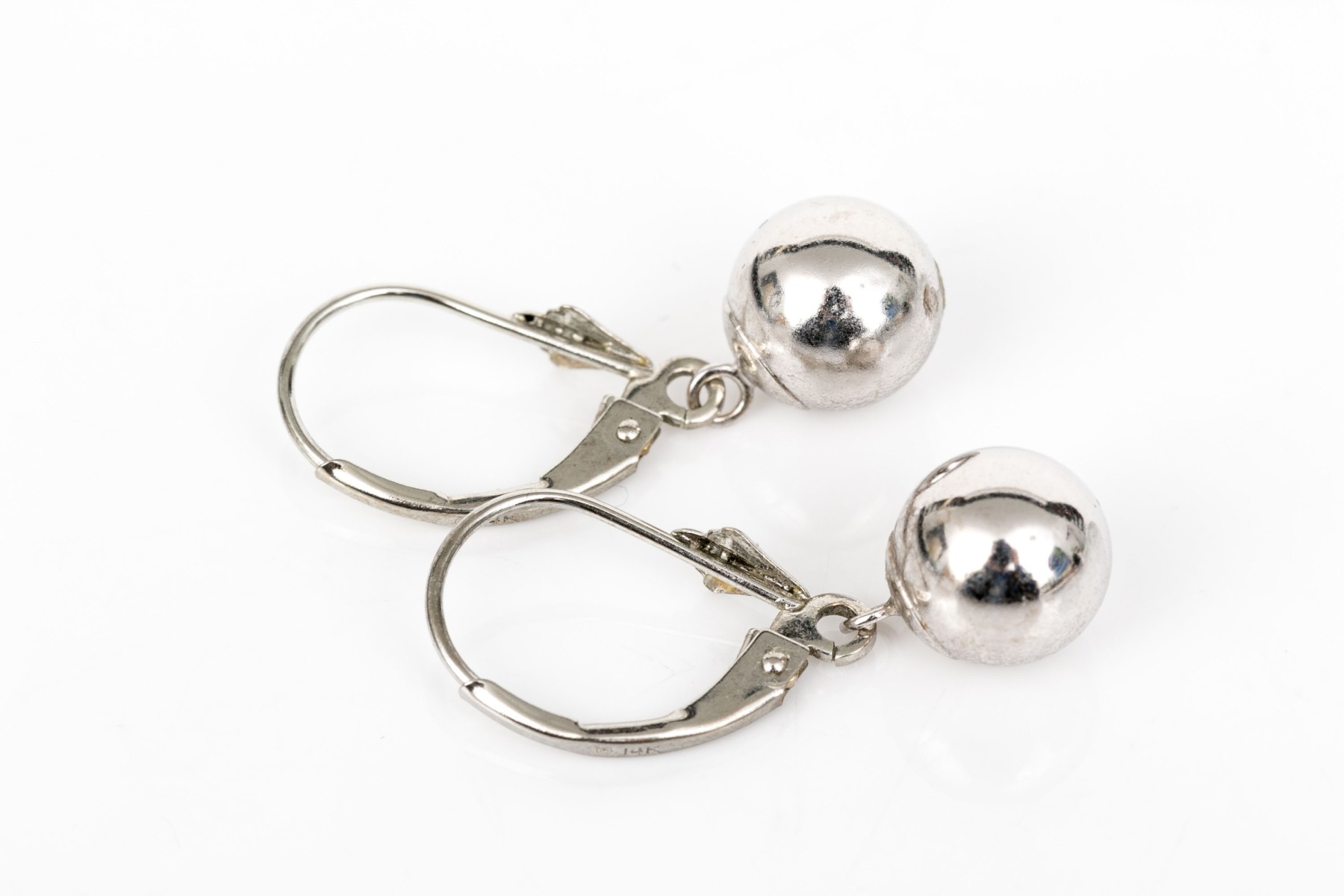 14k white gold simple drop pendant ball earrings, high polished, finished with wires and lever style backs