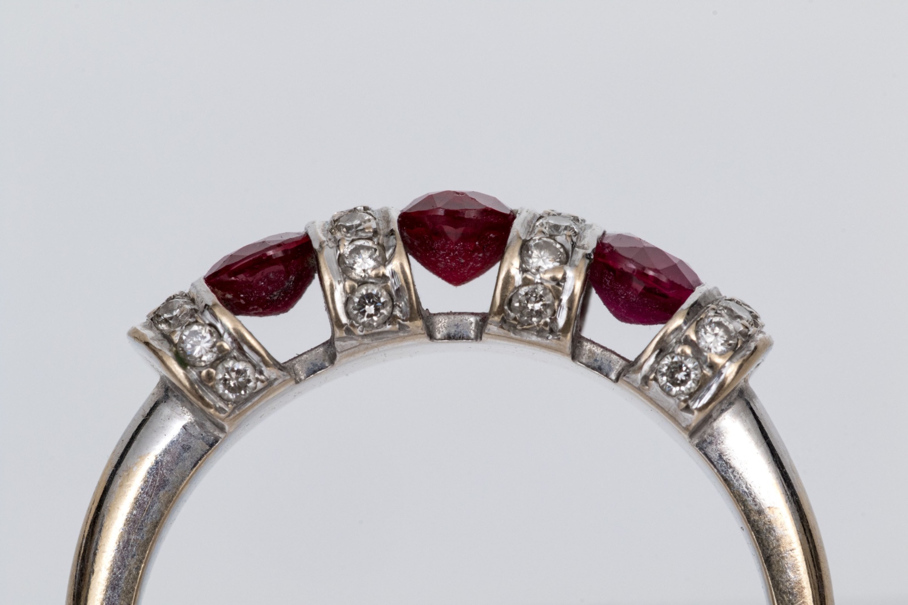 14k white gold size oval synthetic ruby and diamond bar set ring, size 6.5. This eye-catching ring features three, oval faceted synthetic rubies, bar set with round faceted diamonds, app. 0.14 TCW