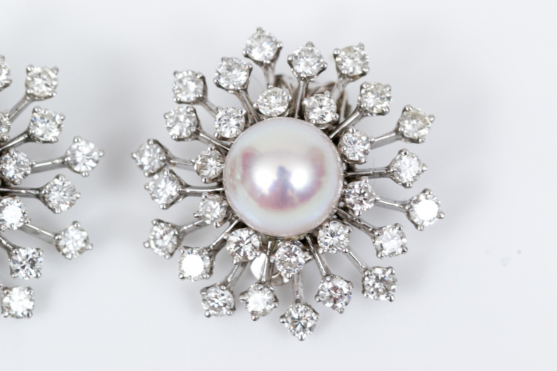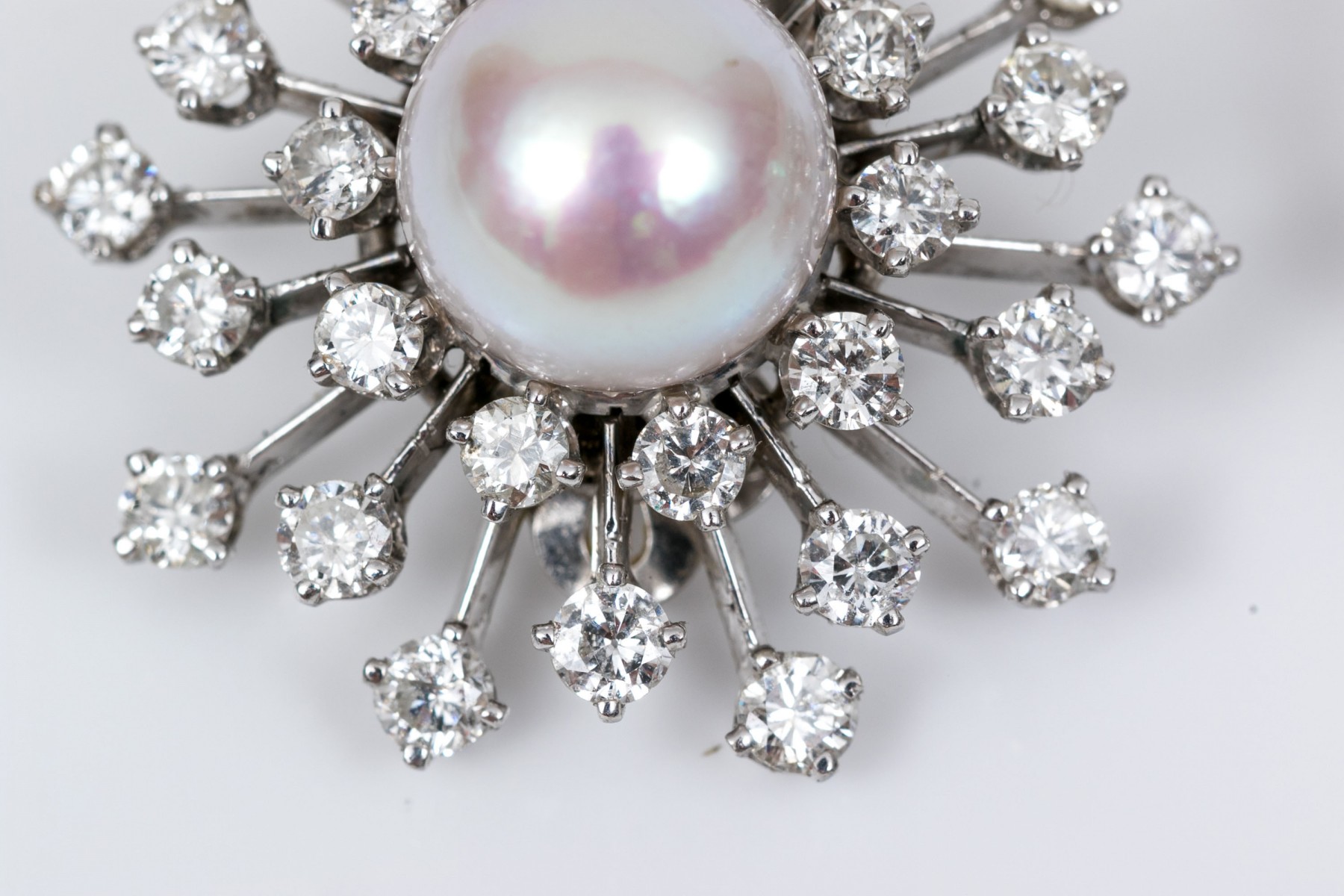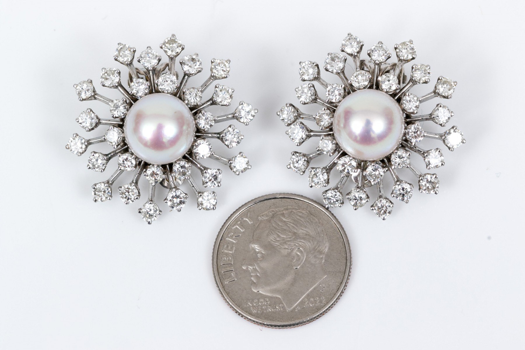 14k white gold stunning cultured pearl and diamond spray earrings. These beautiful earrings feature a center 8.75 cultured pearl, pink tones, surrounded by a spray of round faceted cut diamonds, approximately 2.20 TCW, prong set. The earrings are finished with clip on style backs