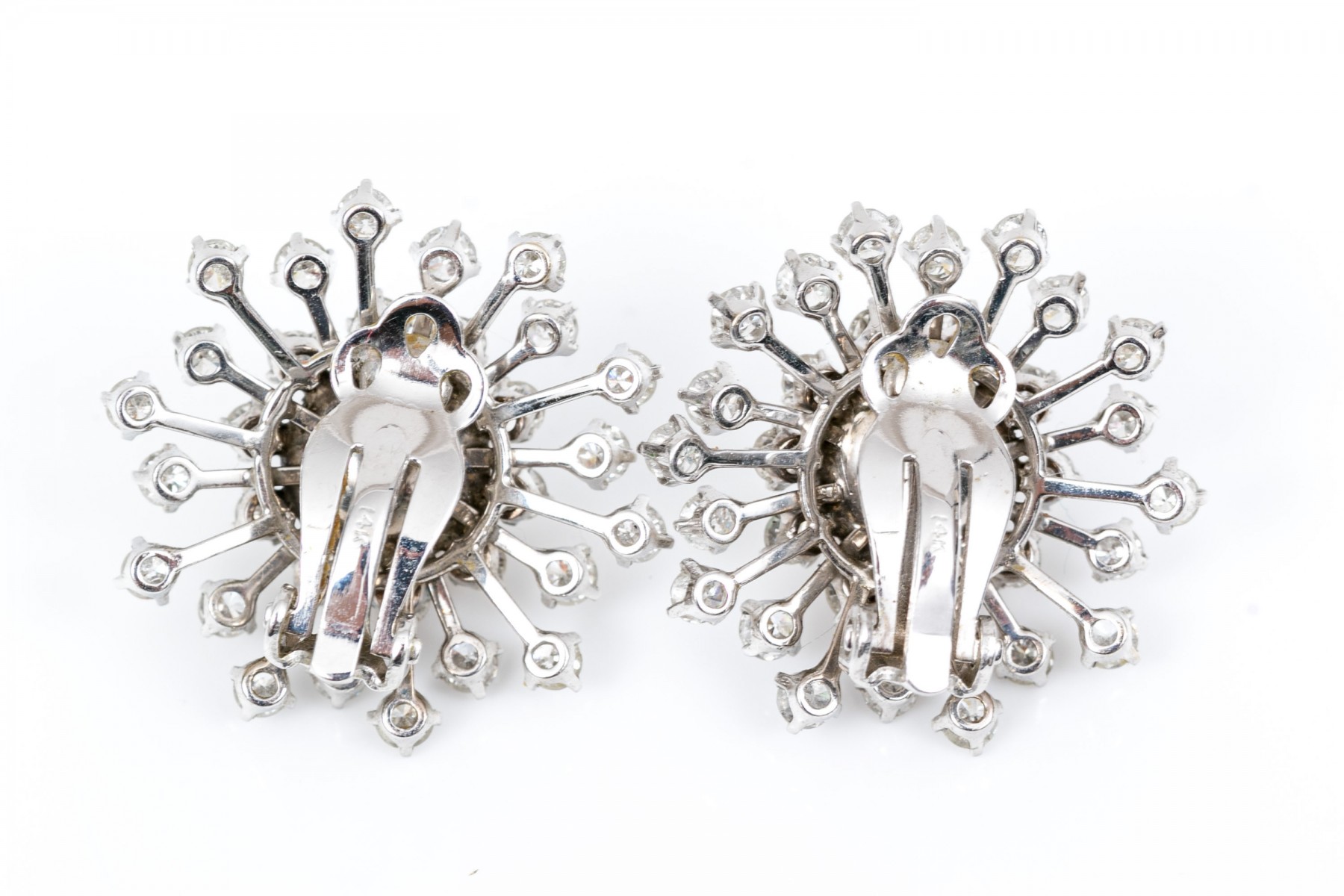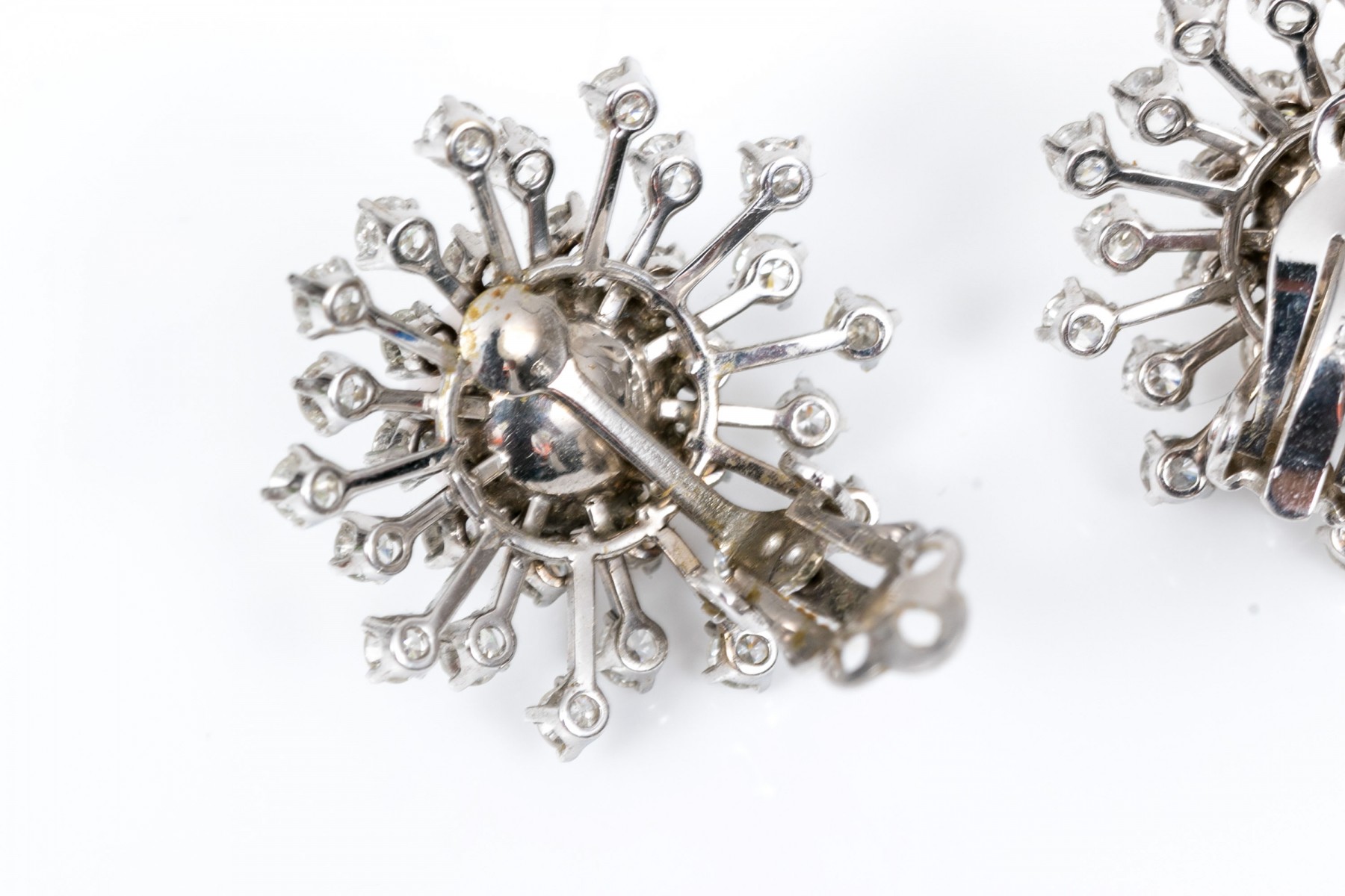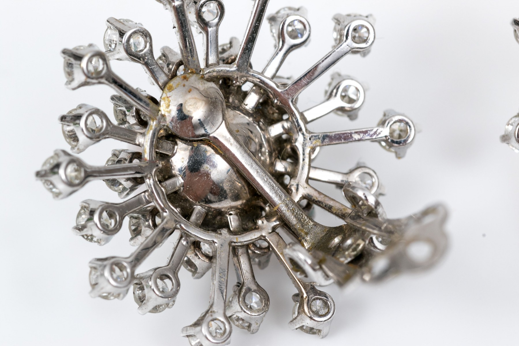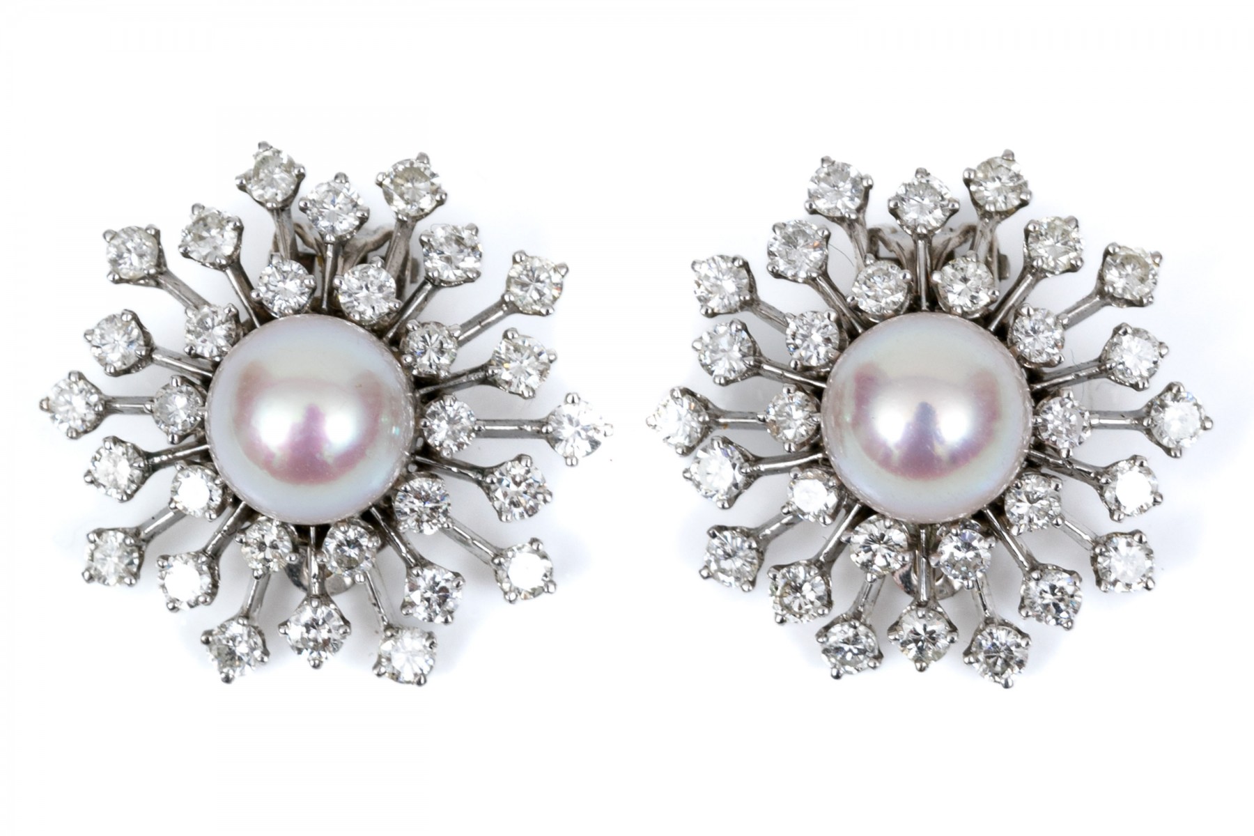 14k white gold stunning cultured pearl and diamond spray earrings. These beautiful earrings feature a center 8.75 cultured pearl, pink tones, surrounded by a spray of round faceted cut diamonds, approximately 2.20 TCW, prong set. The earrings are finished with clip on style backs