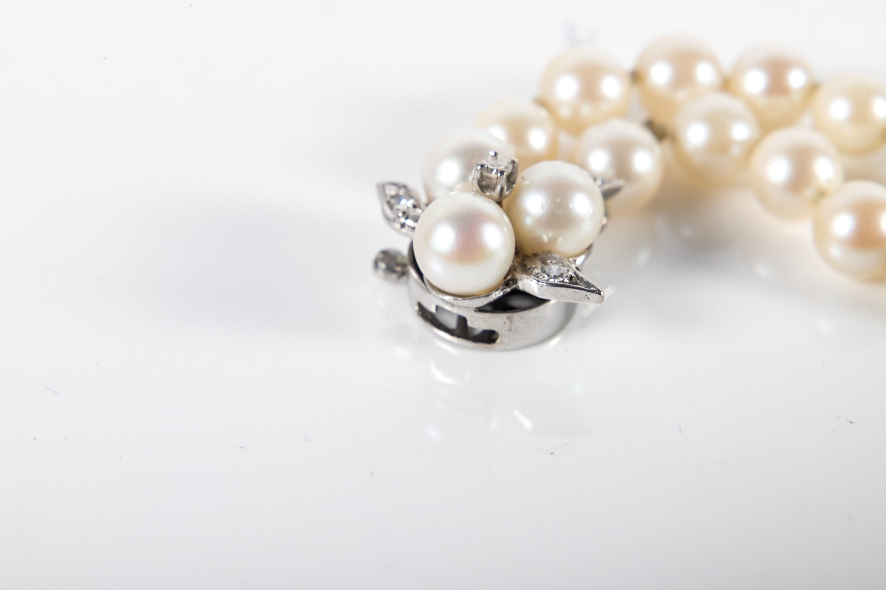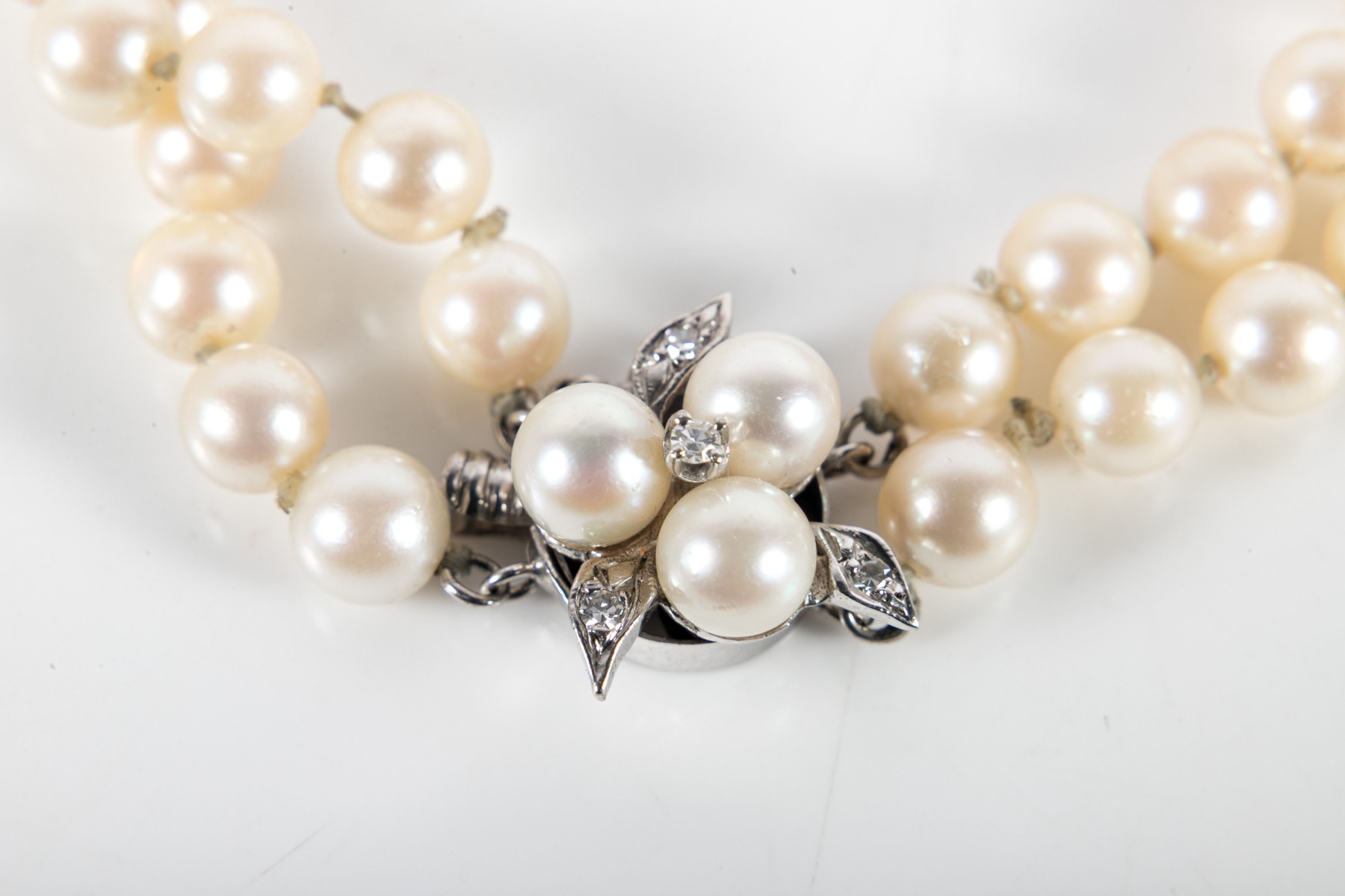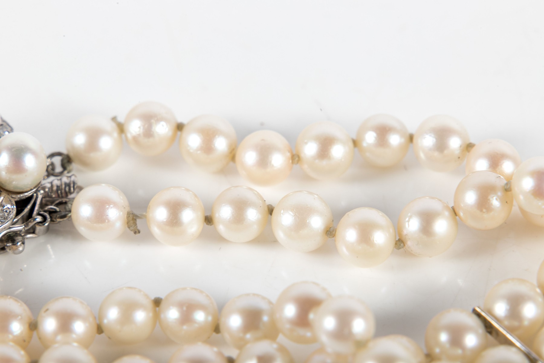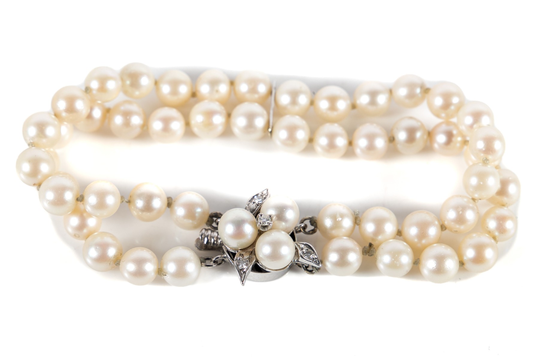 A beautiful bracelet displaying two strands of knotted warm-white cultured pearls reaching a white gold clasp with foliate designs accented with round white sapphires.