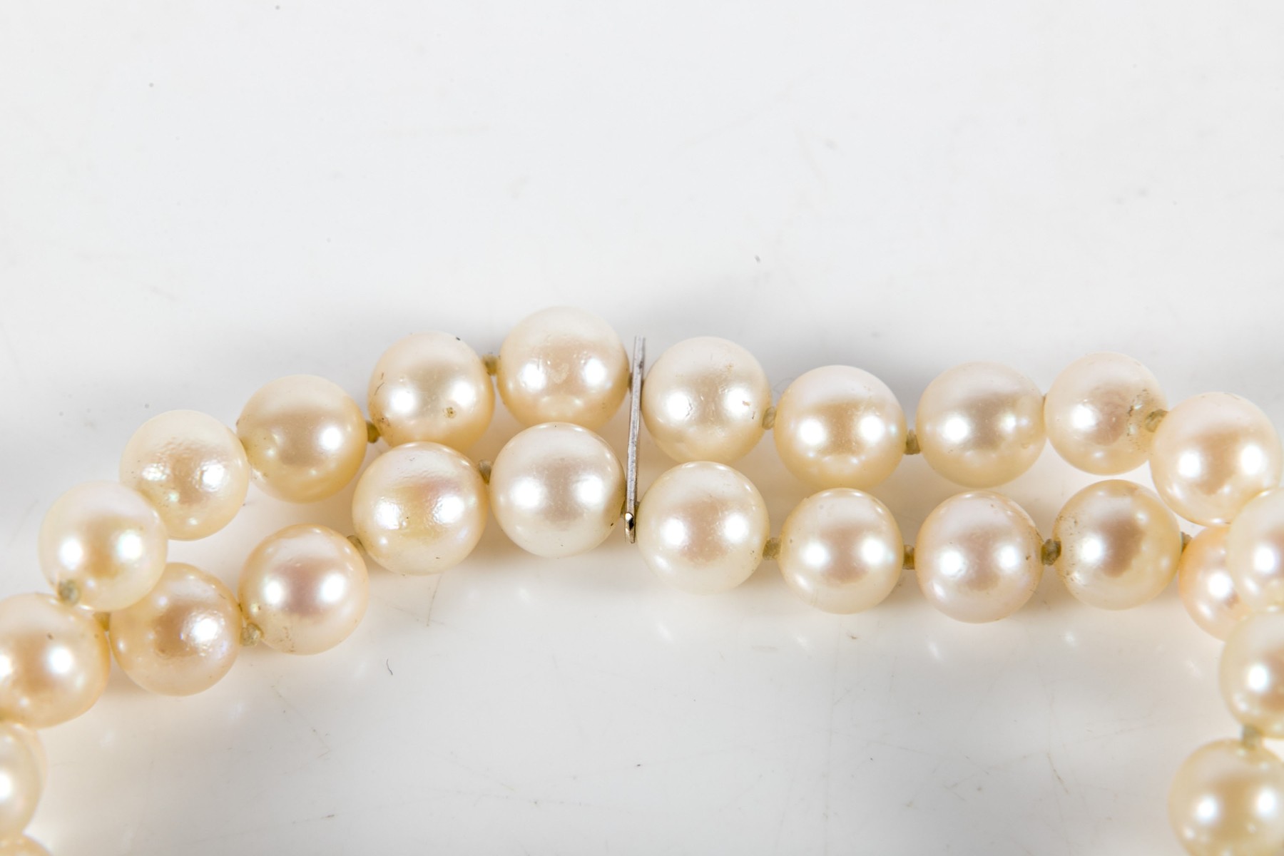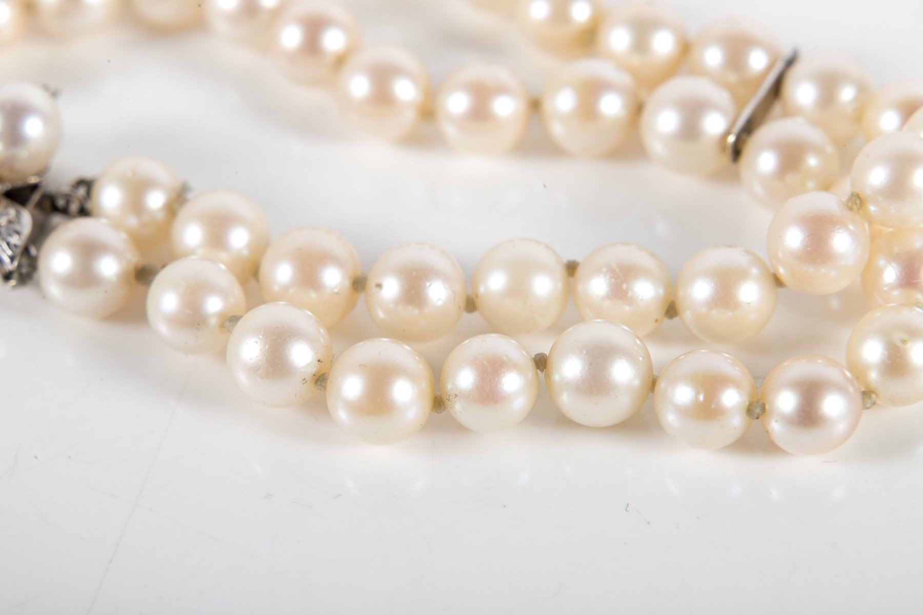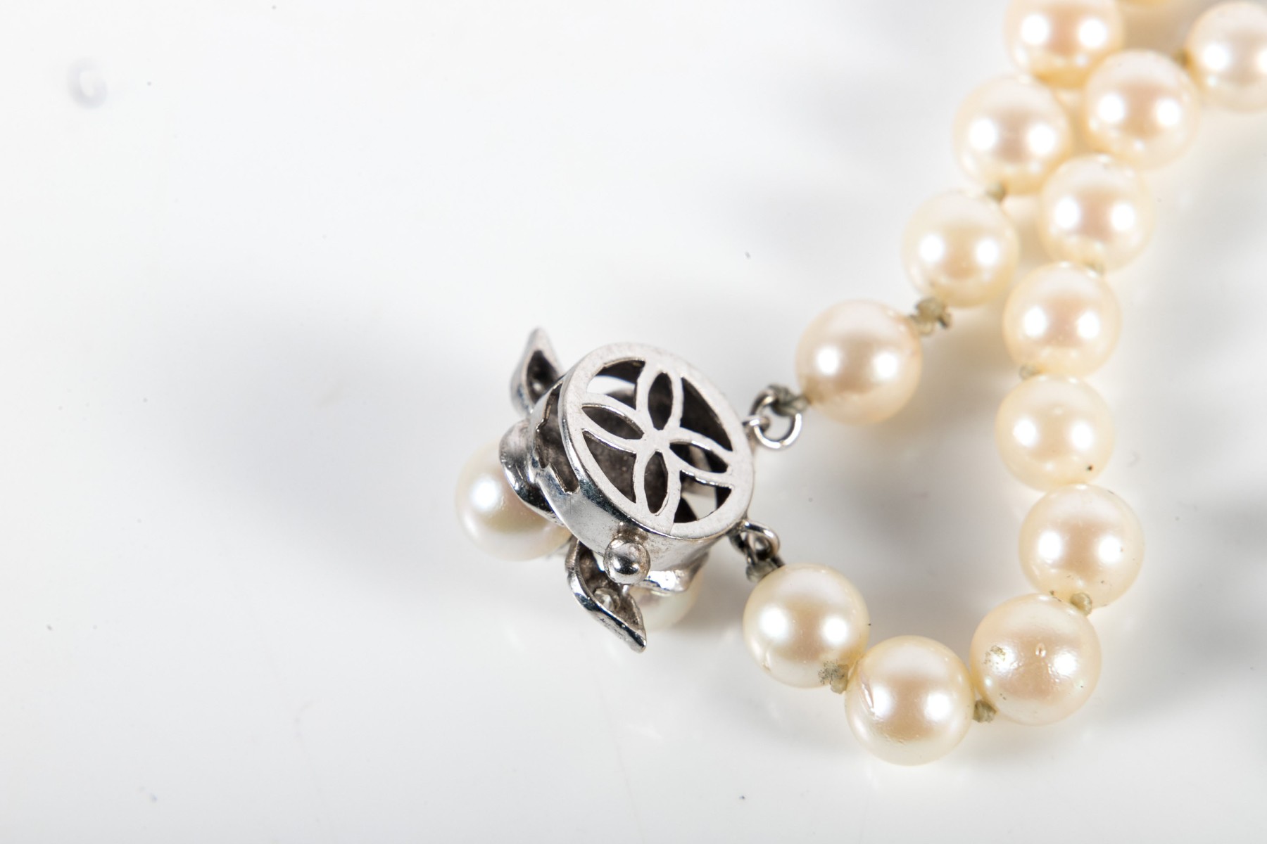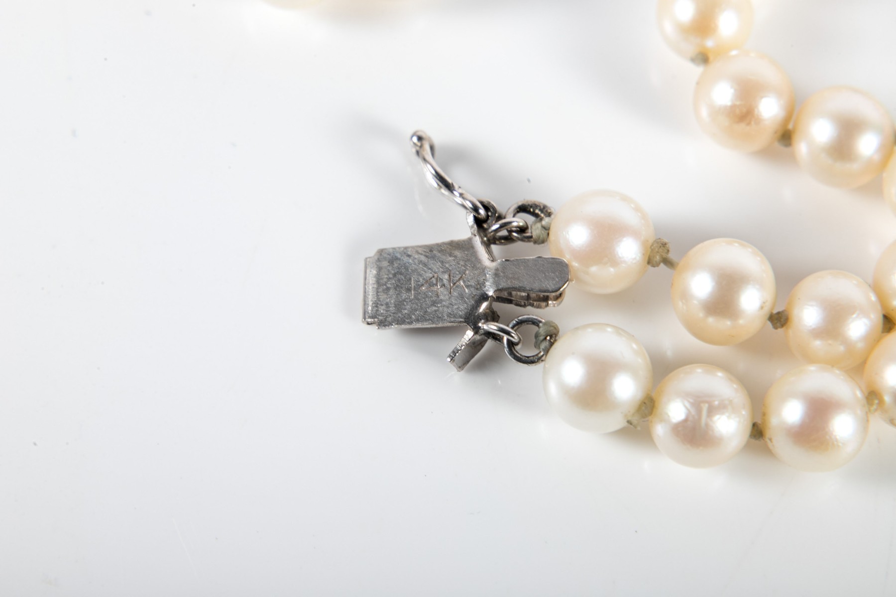 A beautiful bracelet displaying two strands of knotted warm-white cultured pearls reaching a white gold clasp with foliate designs accented with round white sapphires.
