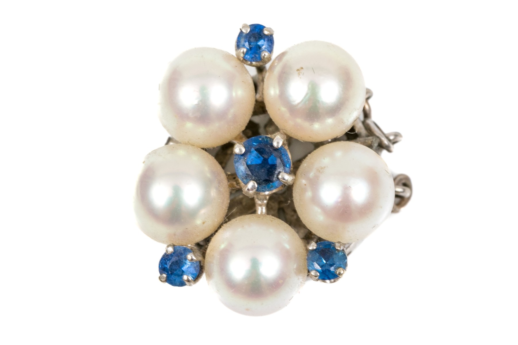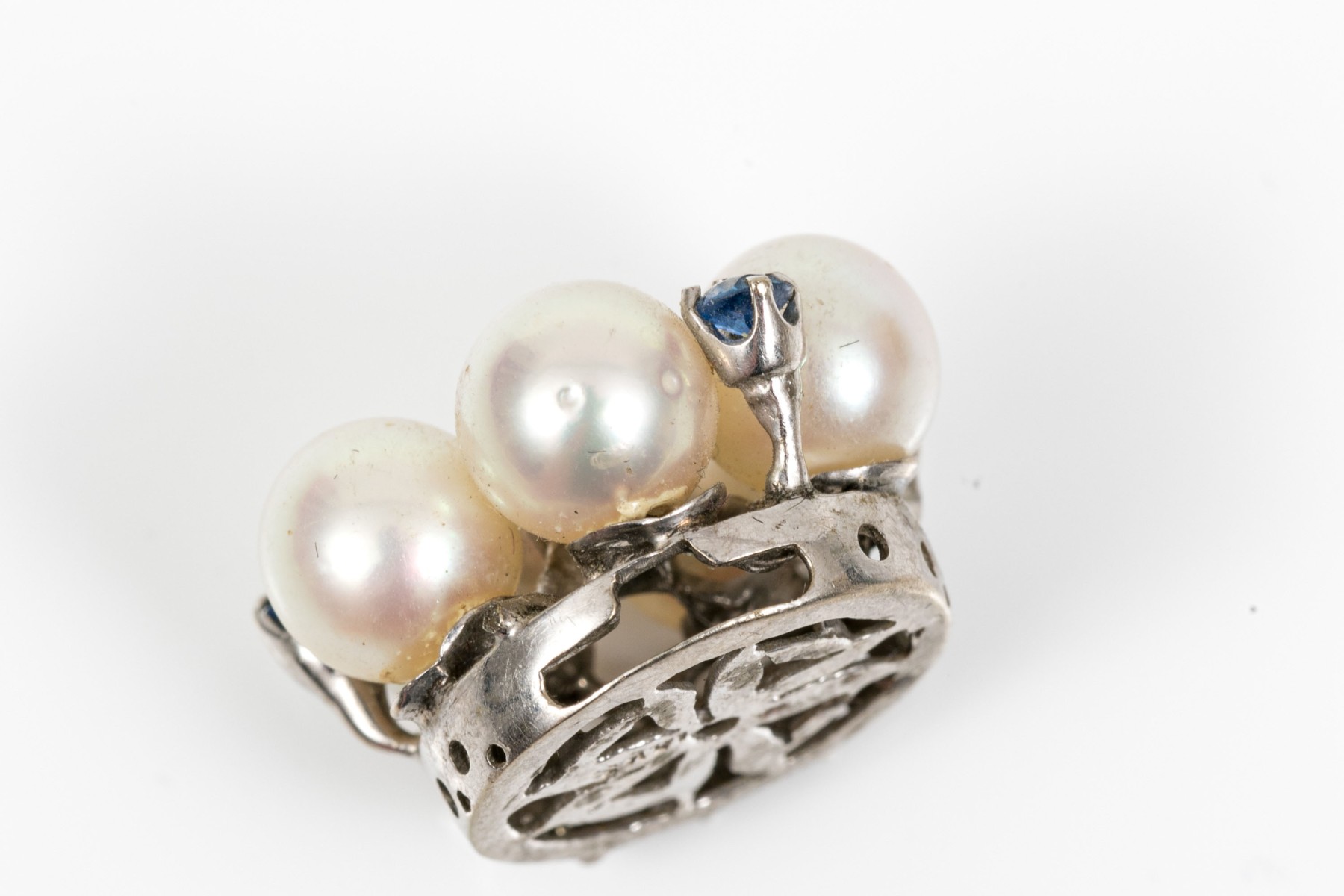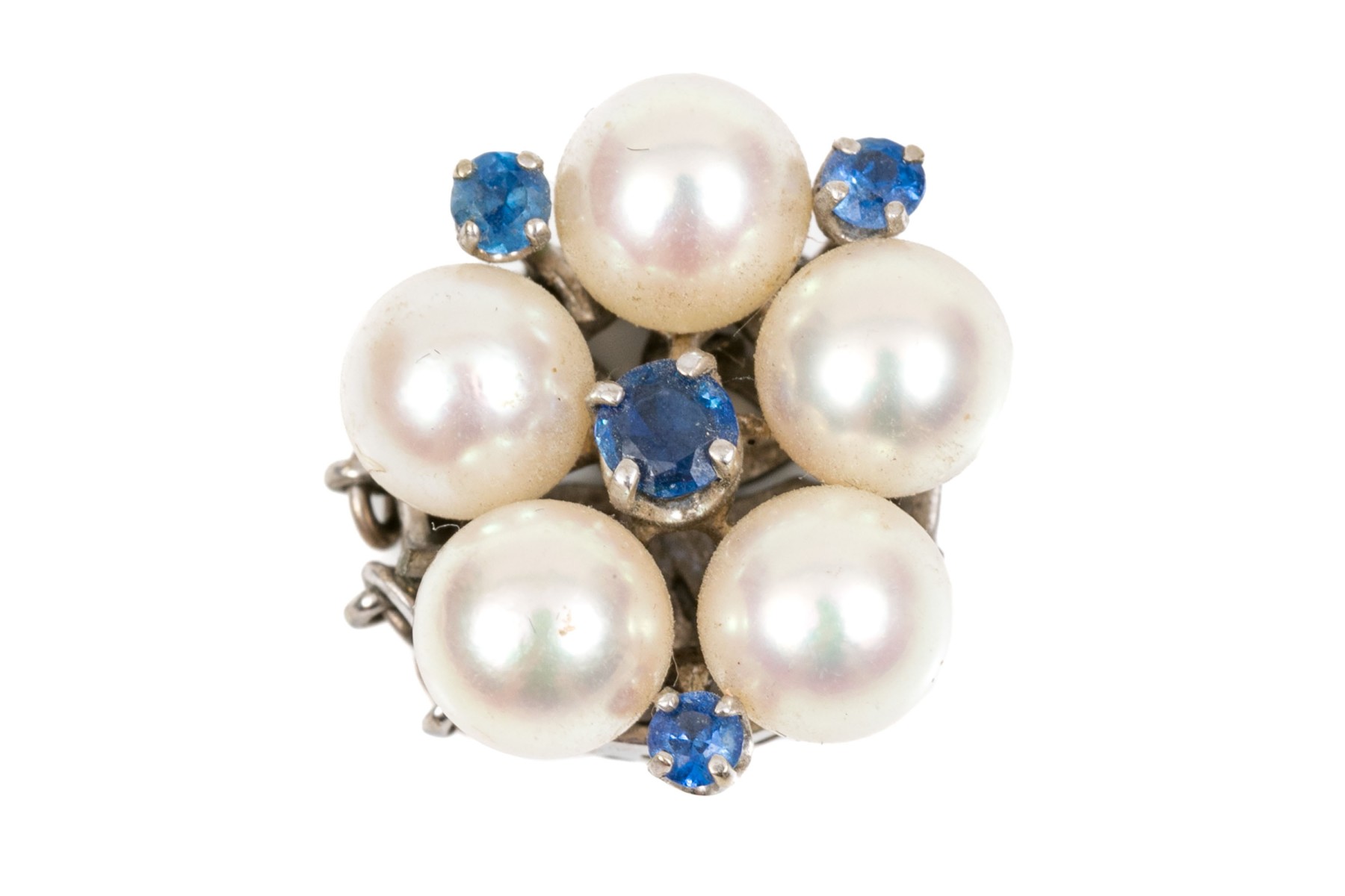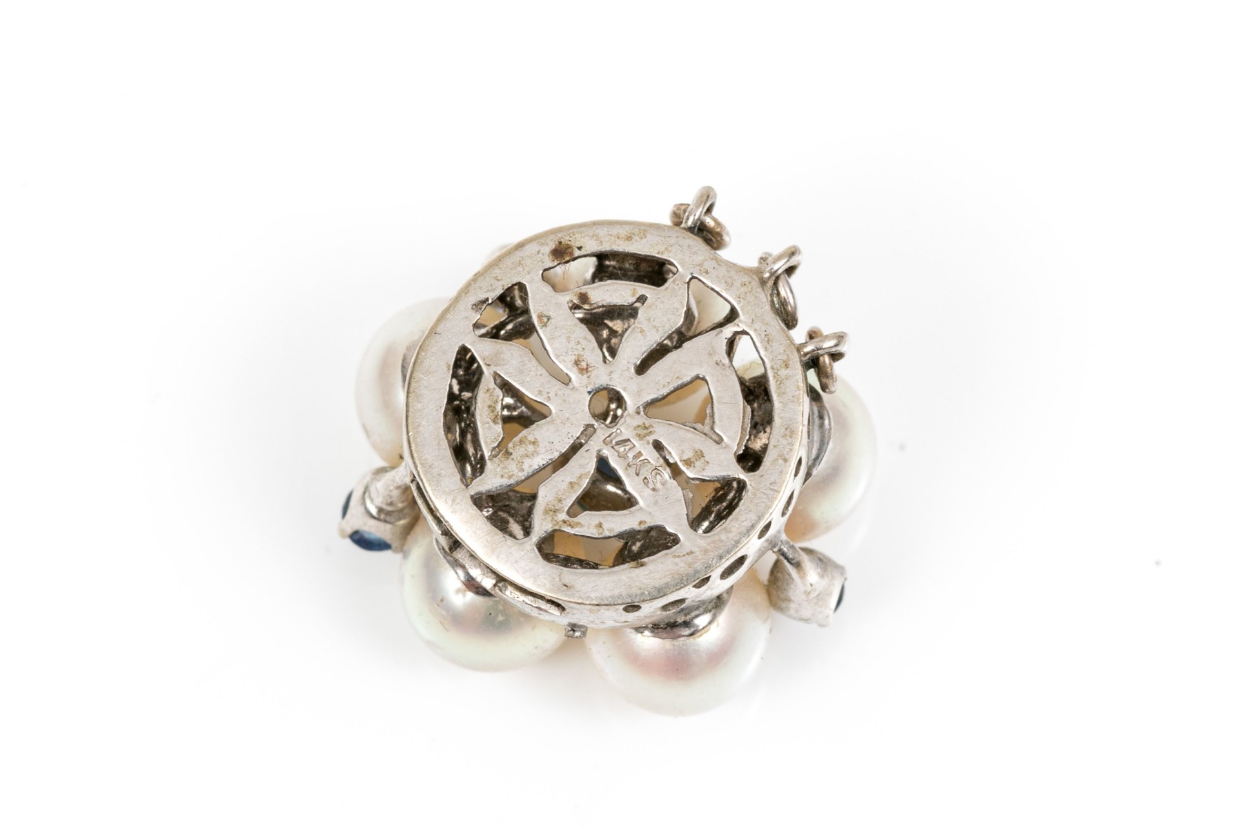 14k white gold vintage 6.5mm cultured pearl and sapphire cluster half bead clasp