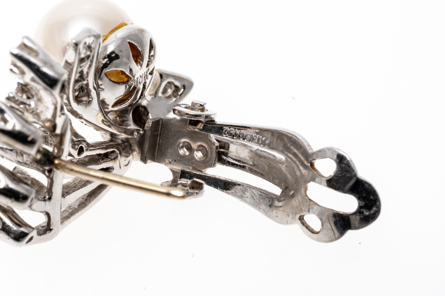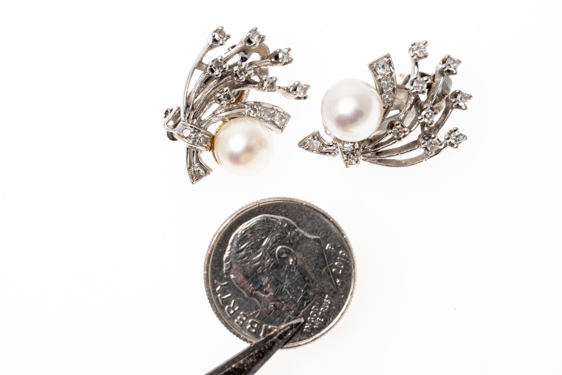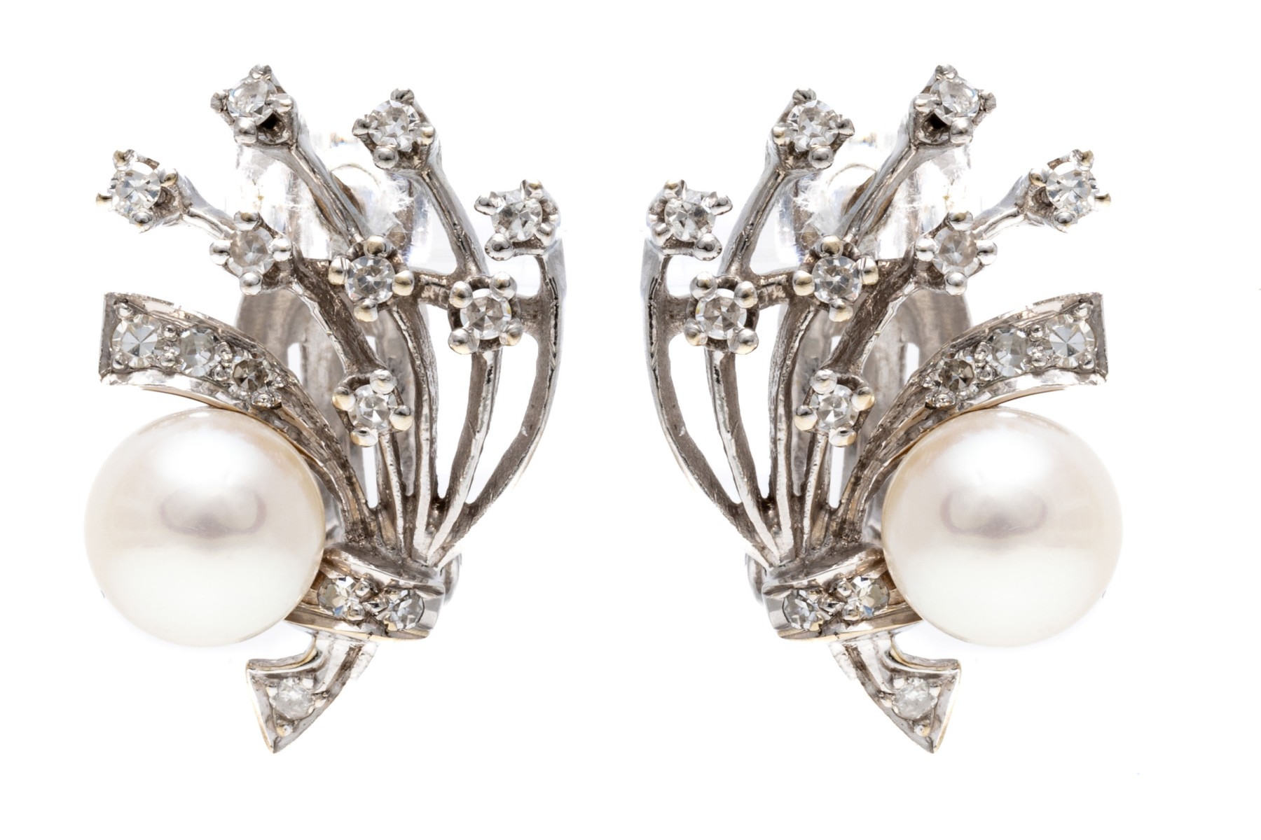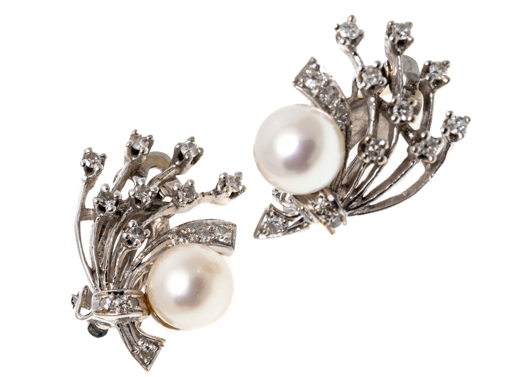 14k white gold vintage cultured 7.25 mm pearl and diamond spray earrings, app. 0.26 TCW. The earrings have posts and hinged style clip backs