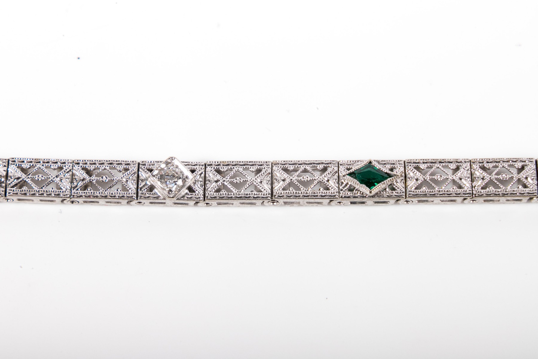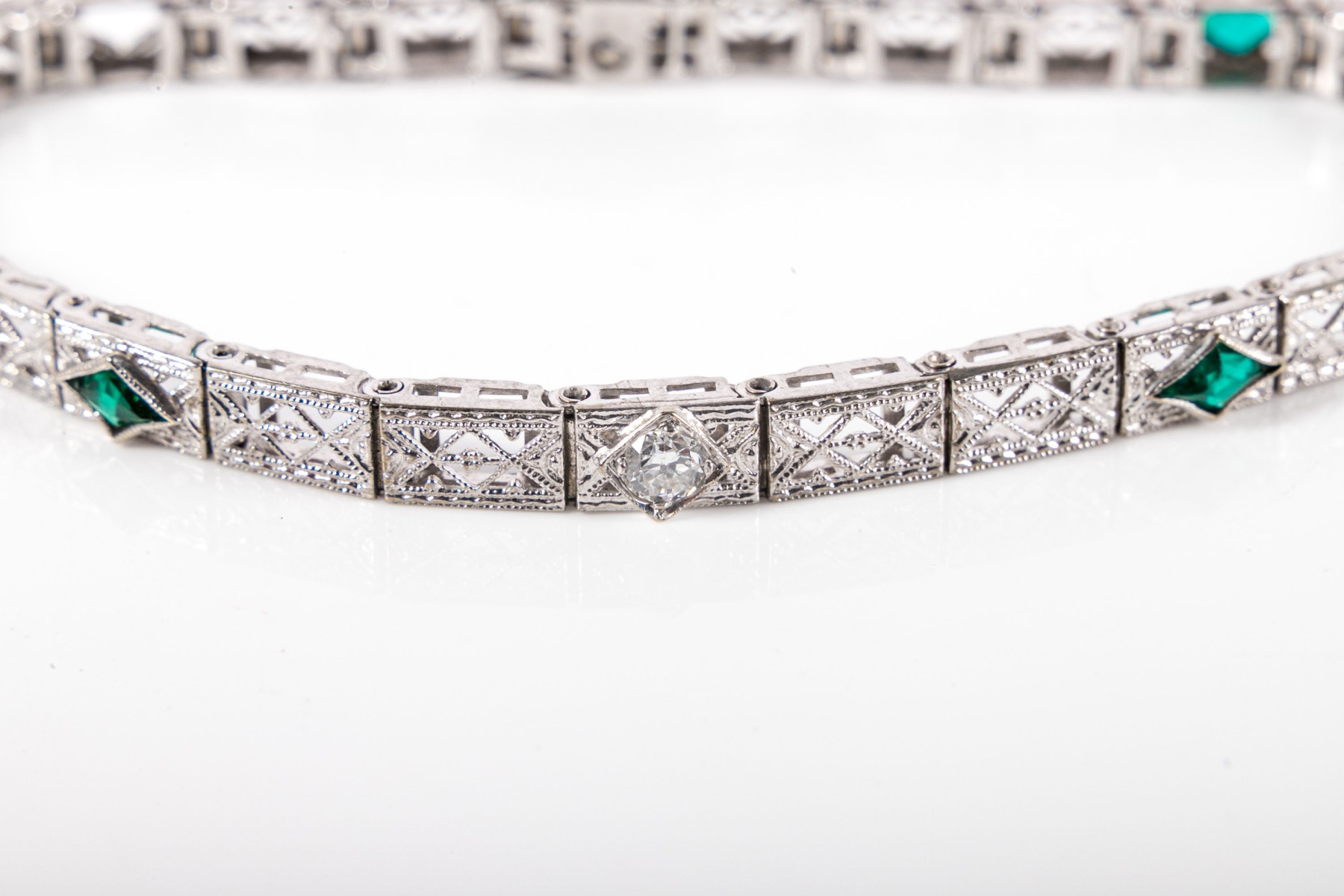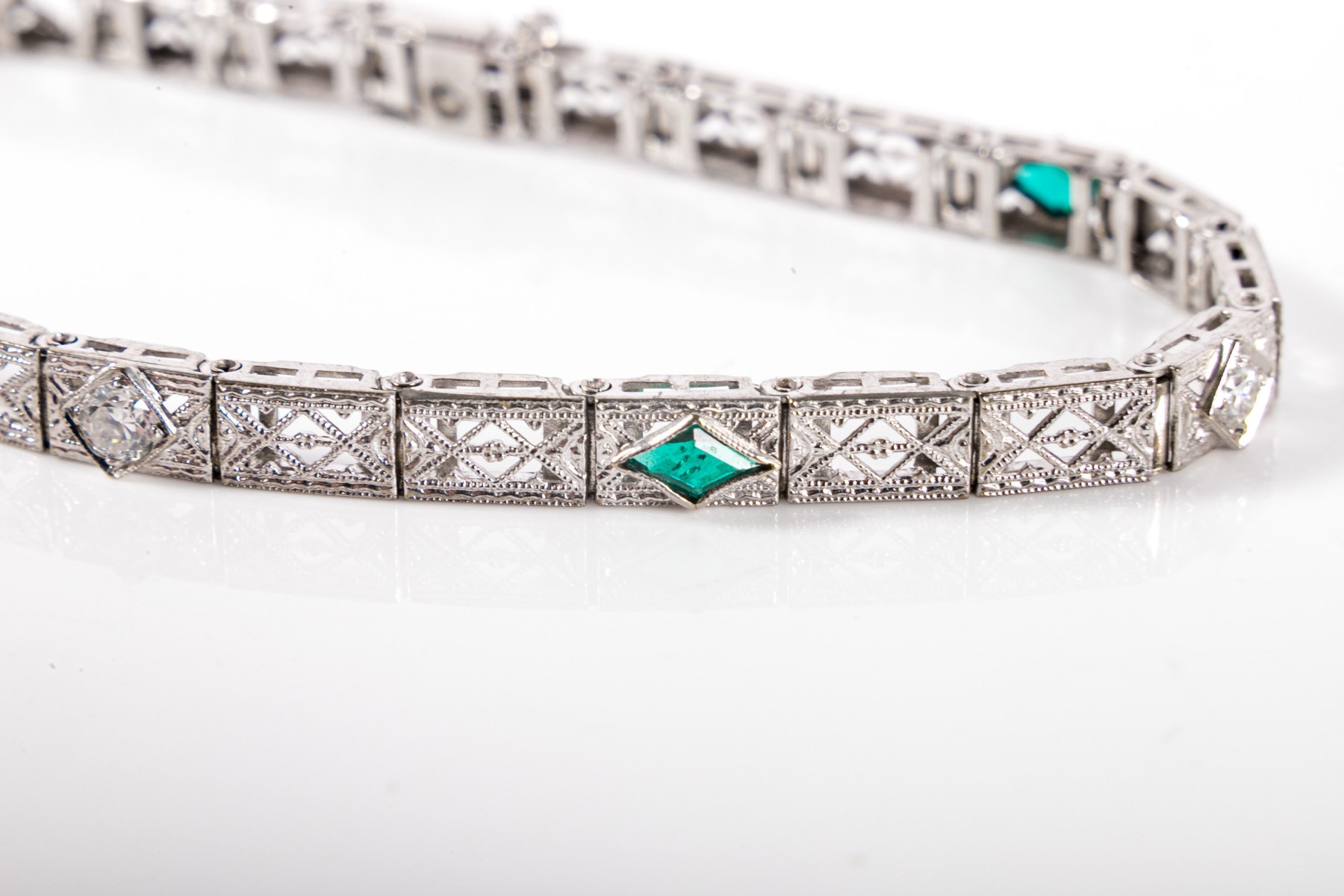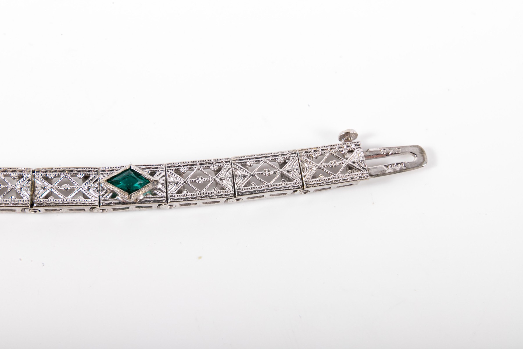 14K white gold bracelet. This bracelet has a delicate antique style design with open filigree links, set with three diamond shaped synthetic emeralds and three round cut diamonds, approximately 0.26 TCW. The bracelet secures with a box style clasp and safety latch.