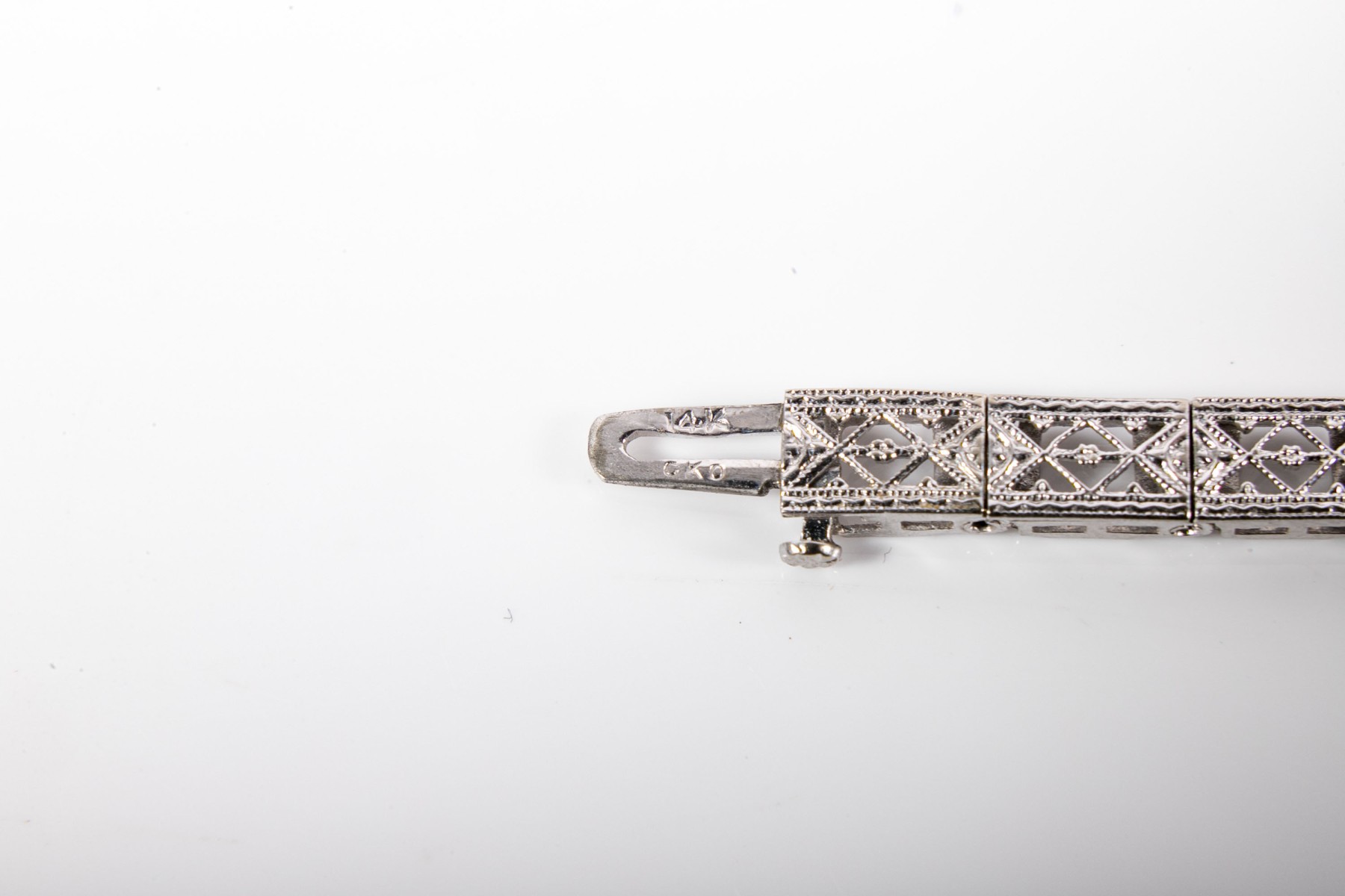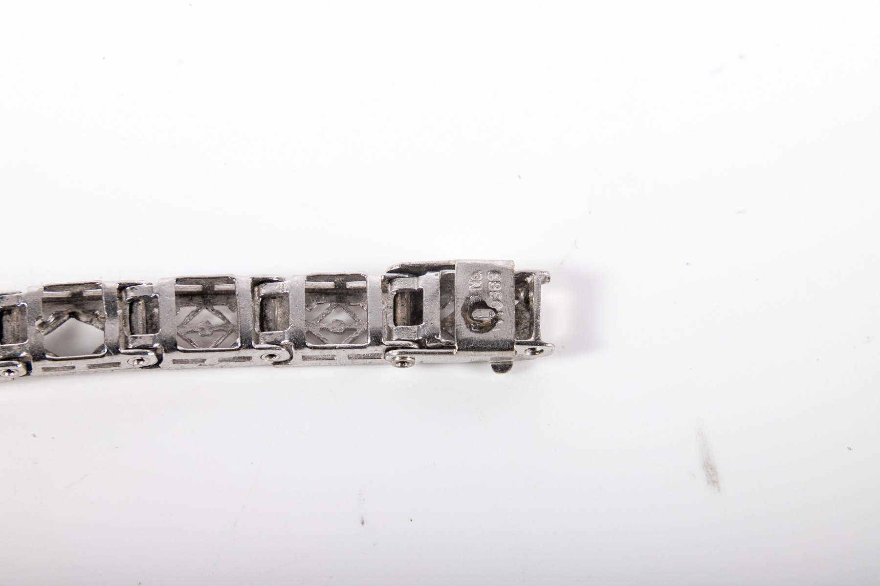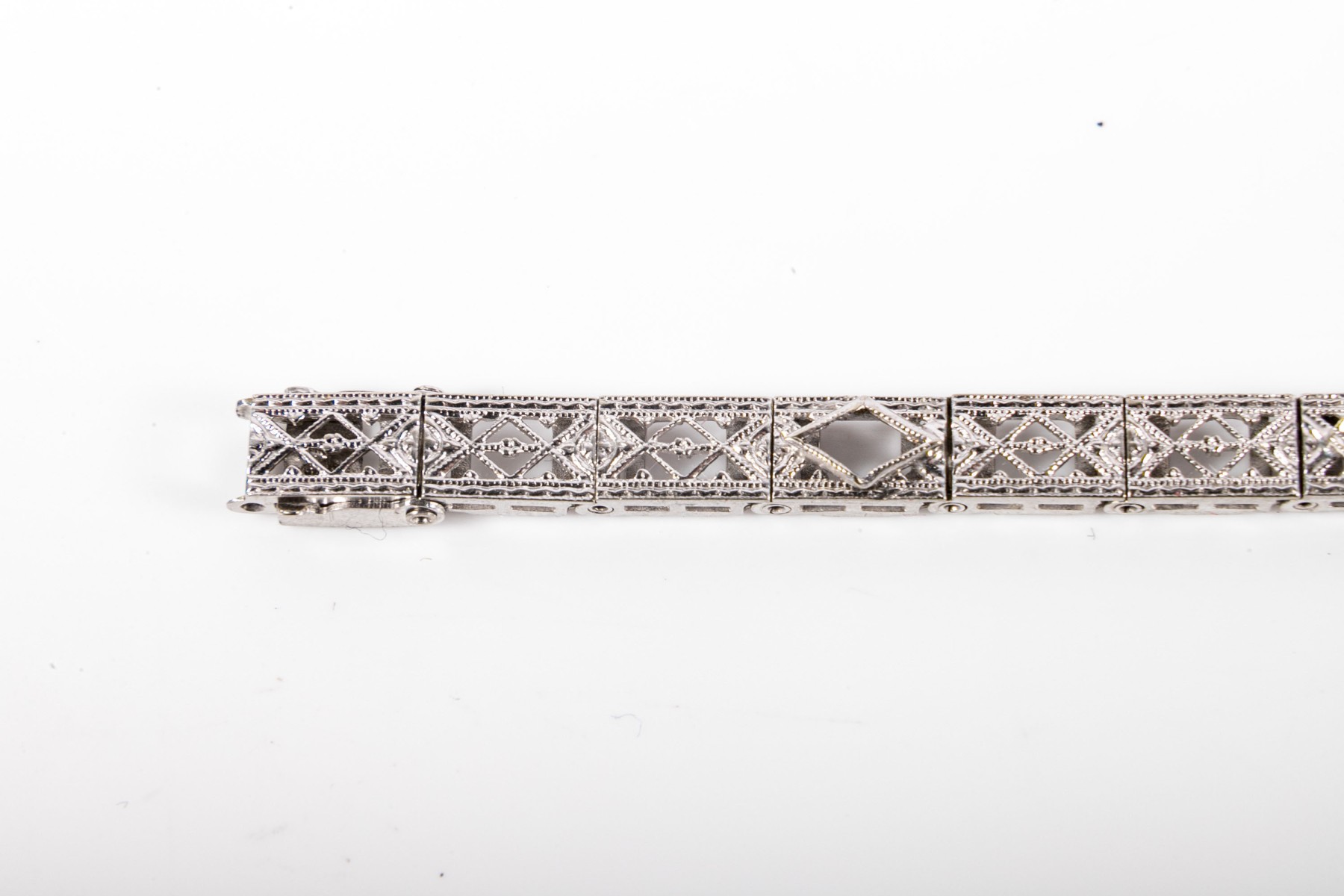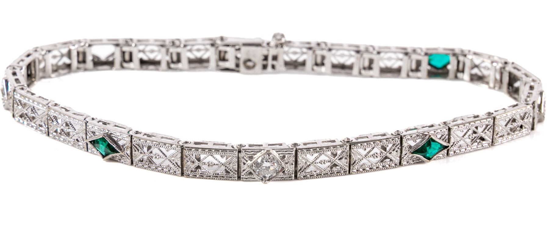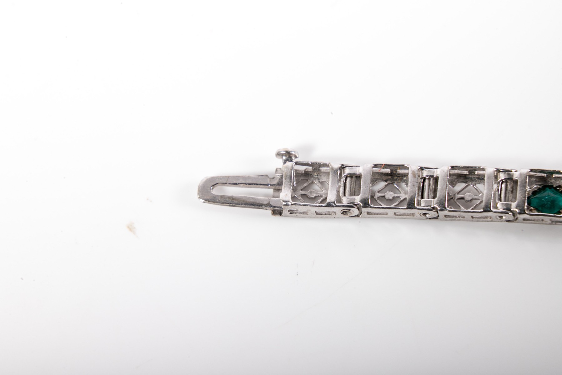 14K white gold bracelet. This bracelet has a delicate antique style design with open filigree links, set with three diamond shaped synthetic emeralds and three round cut diamonds, approximately 0.26 TCW. The bracelet secures with a box style clasp and safety latch.
