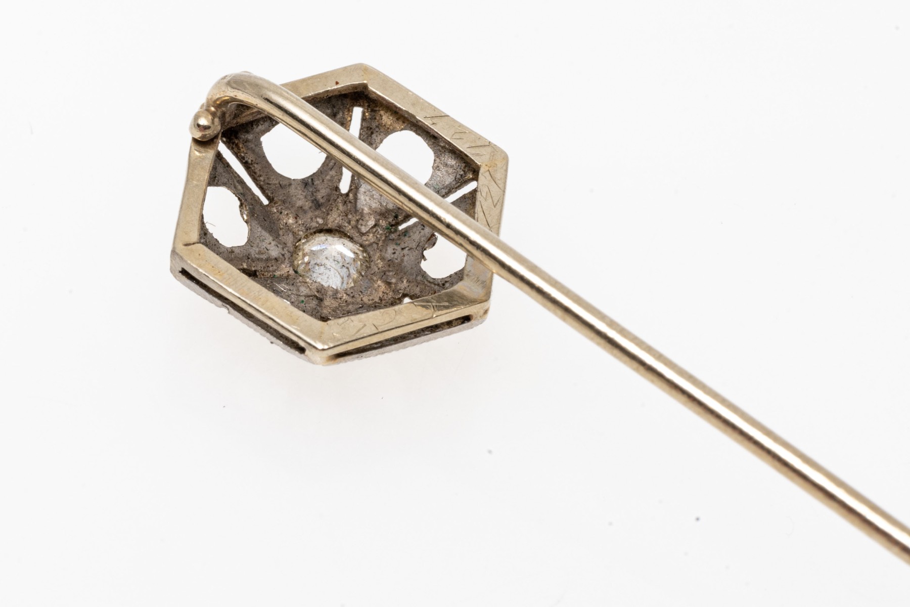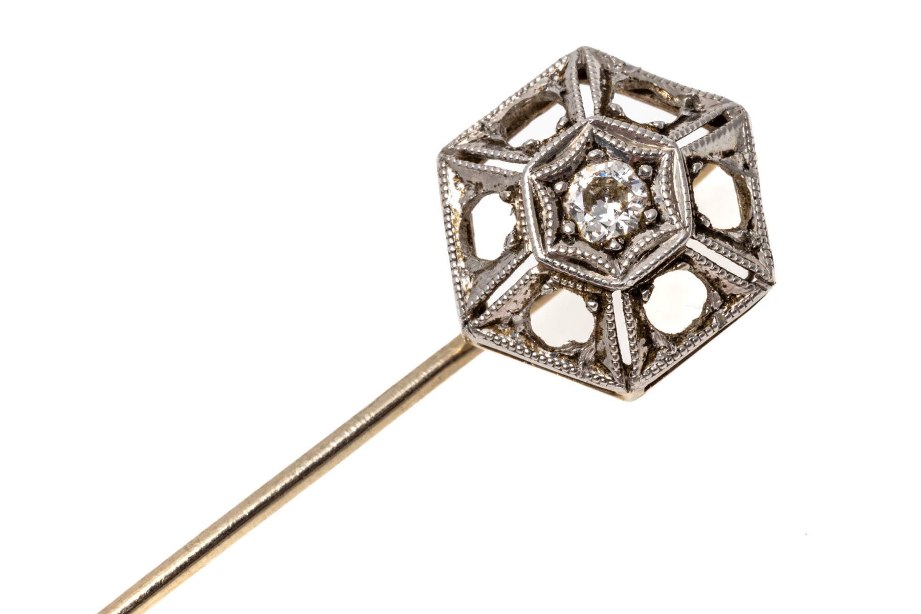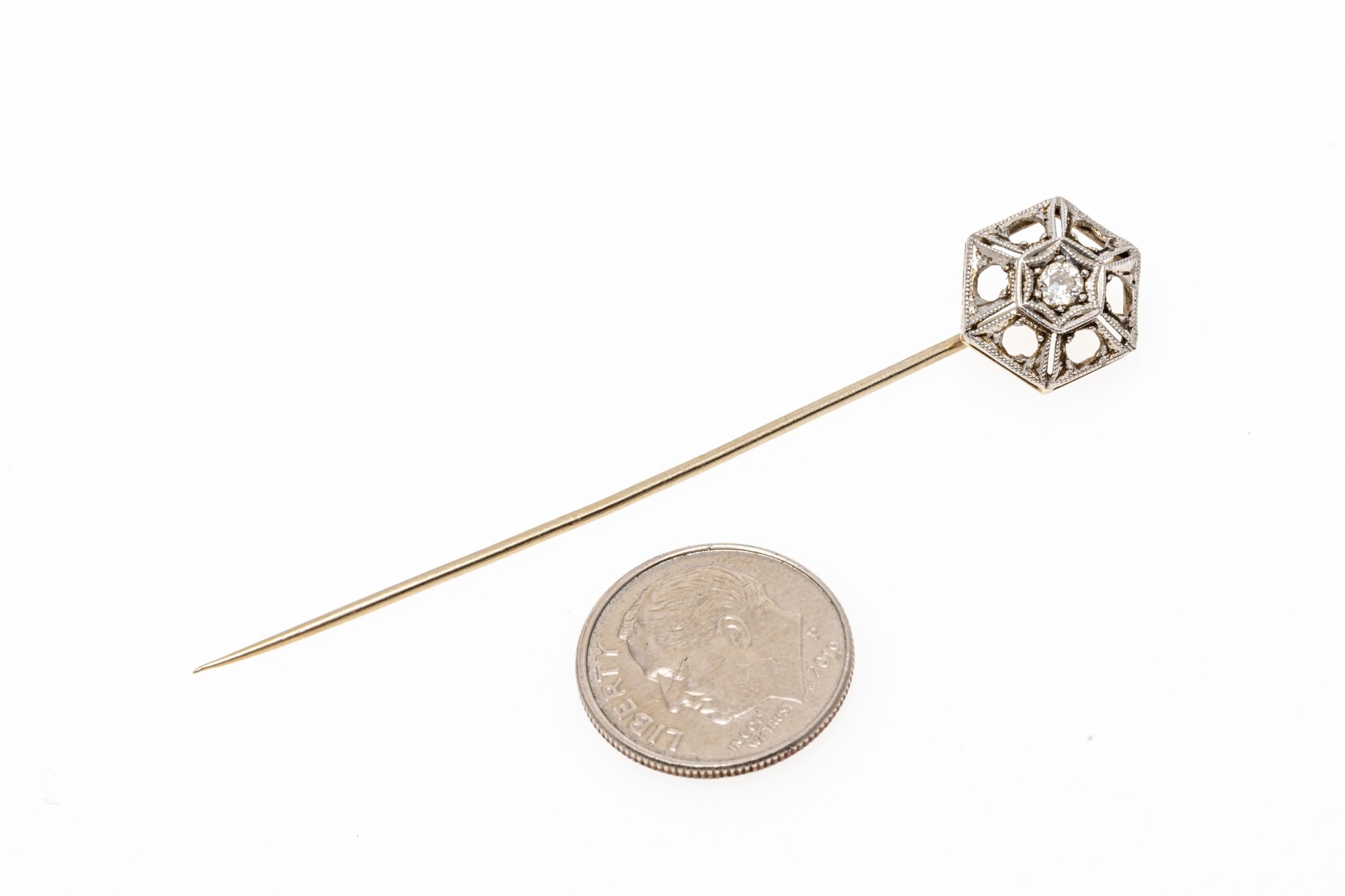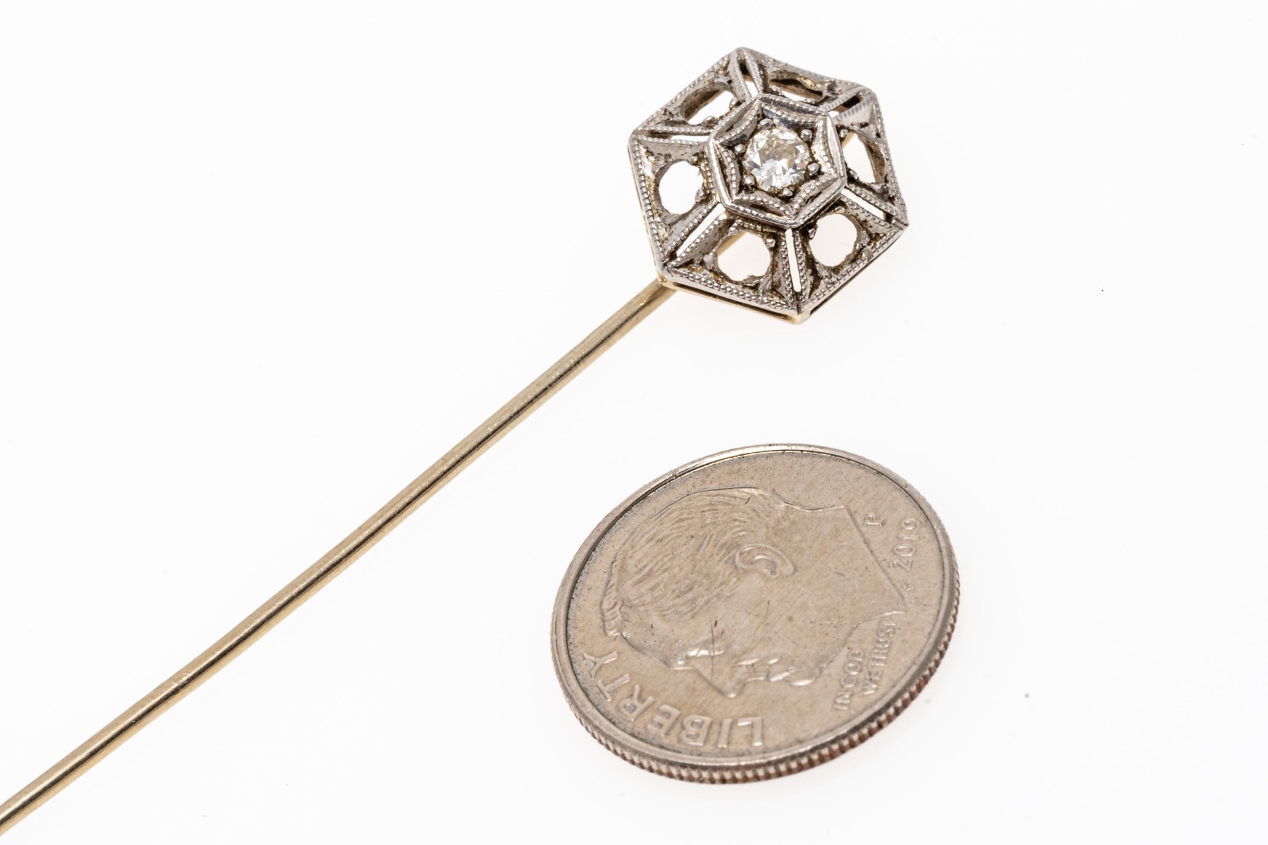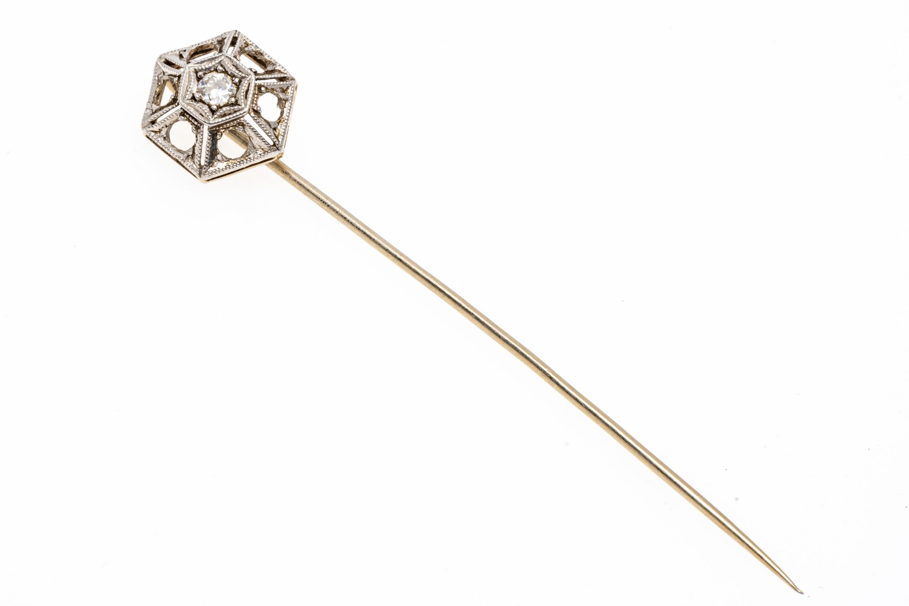 14k white gold vintage filigree top stick pin, diamond set, approximately 0.10 CTS