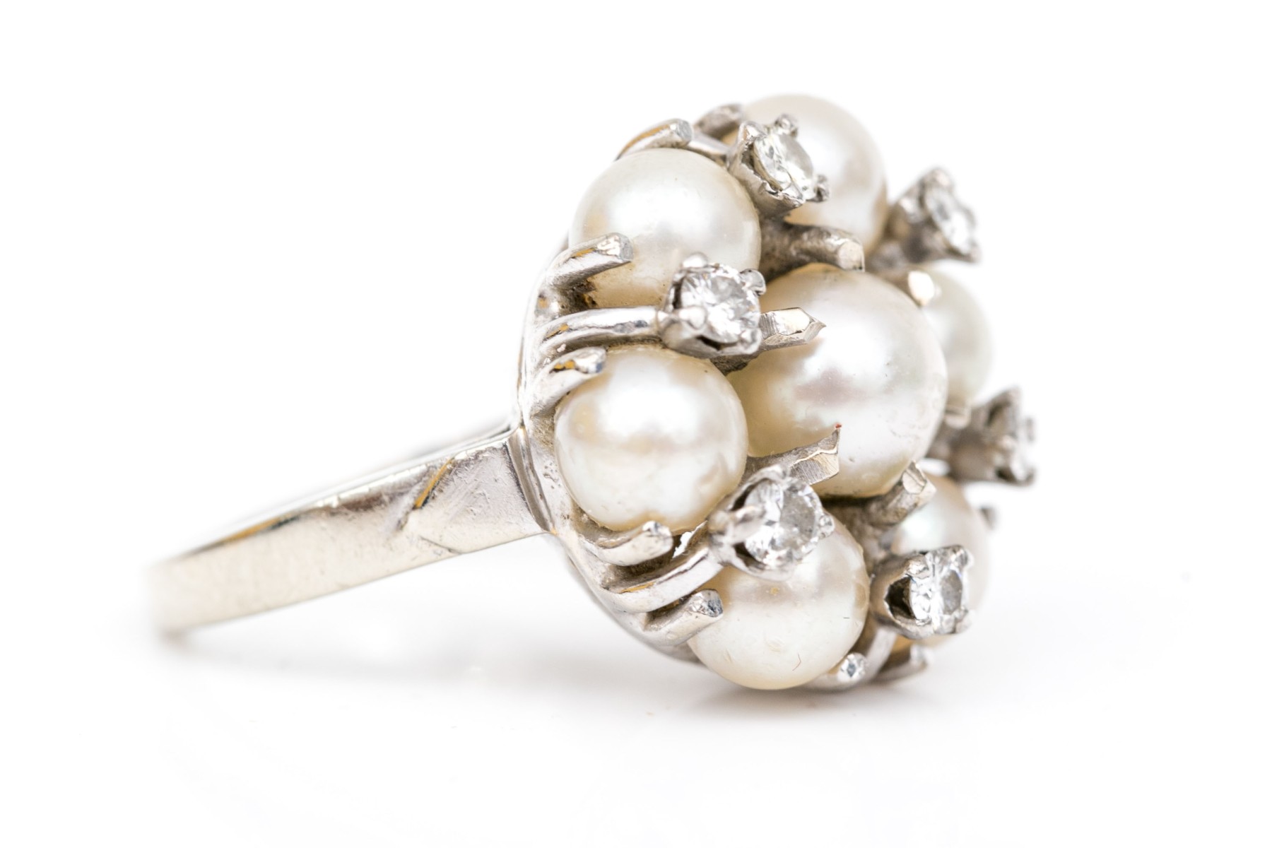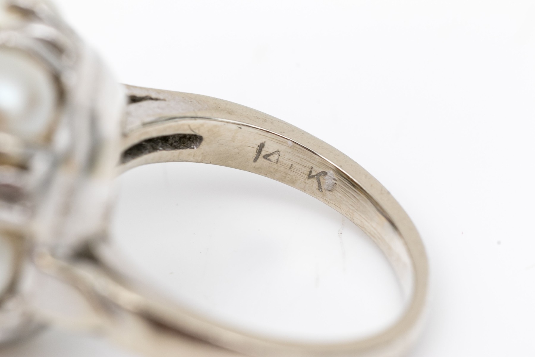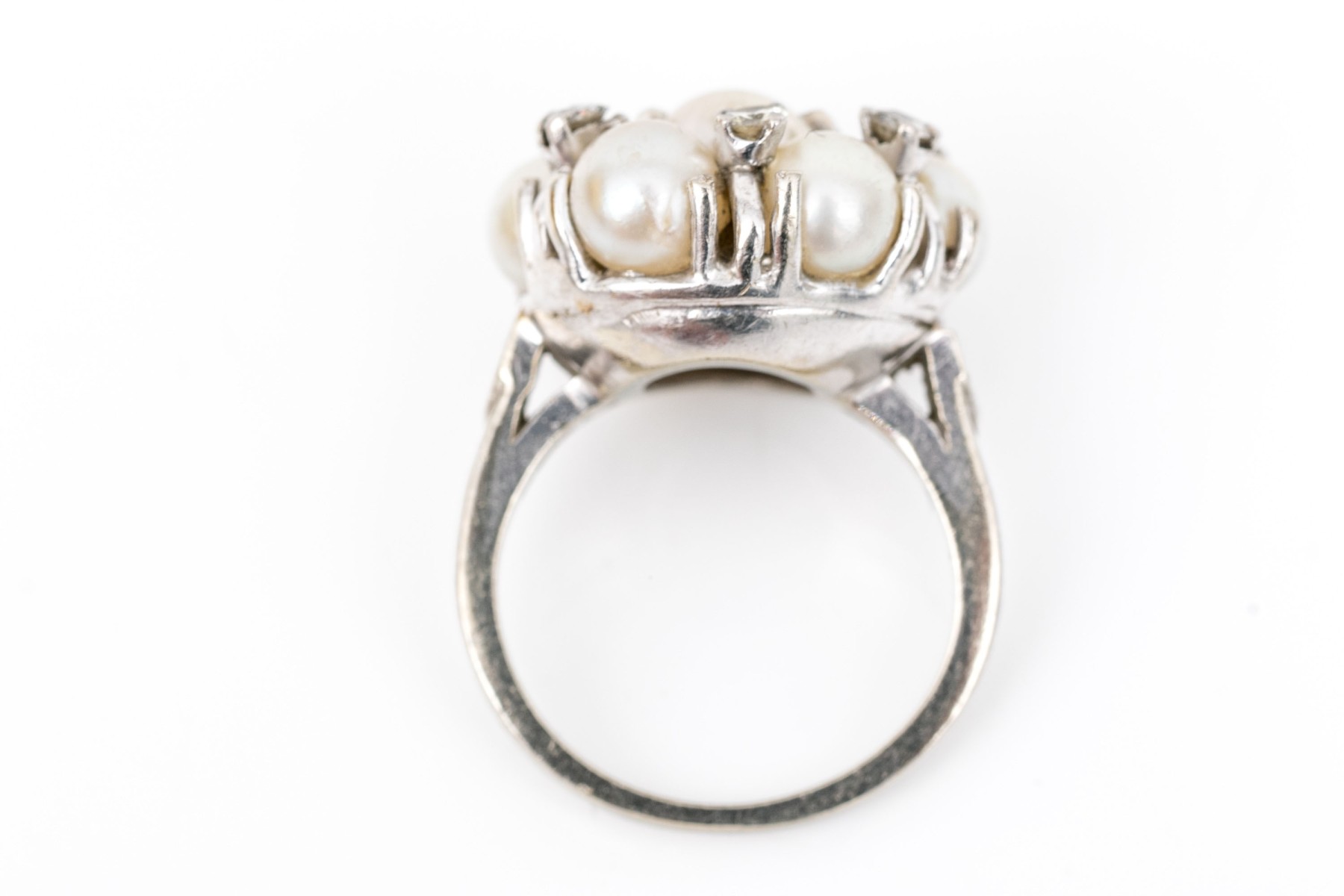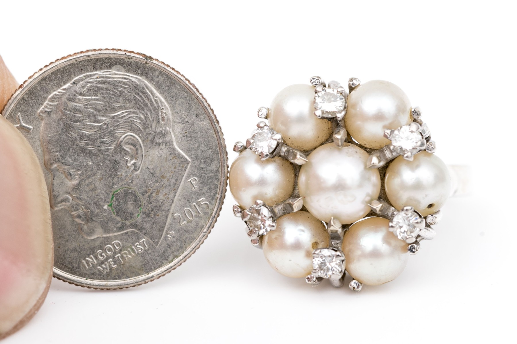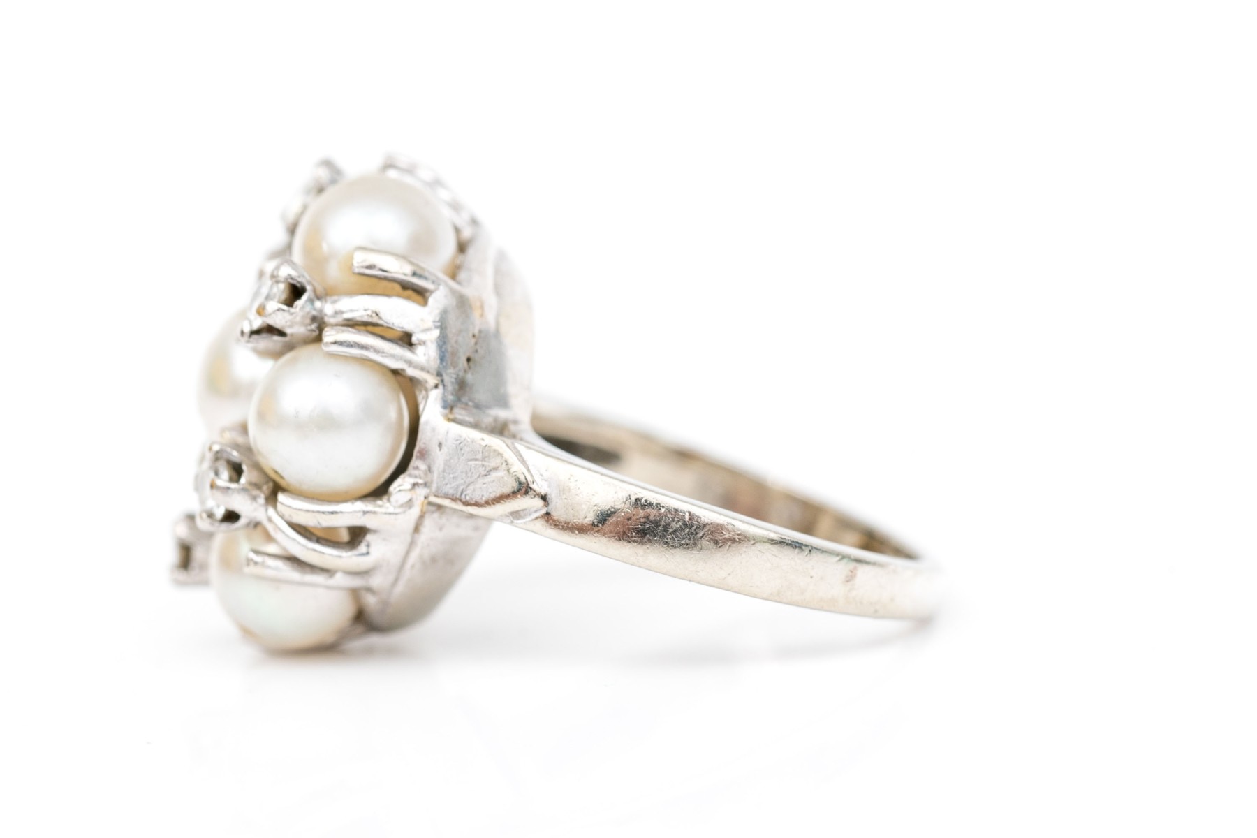 14k white gold vintage pretty cultured pearl and diamond cluster ring, size 3, set with 4.75 mm cultured pearls, interspersed with round faceted diamonds, approximately 0.18 TCW.