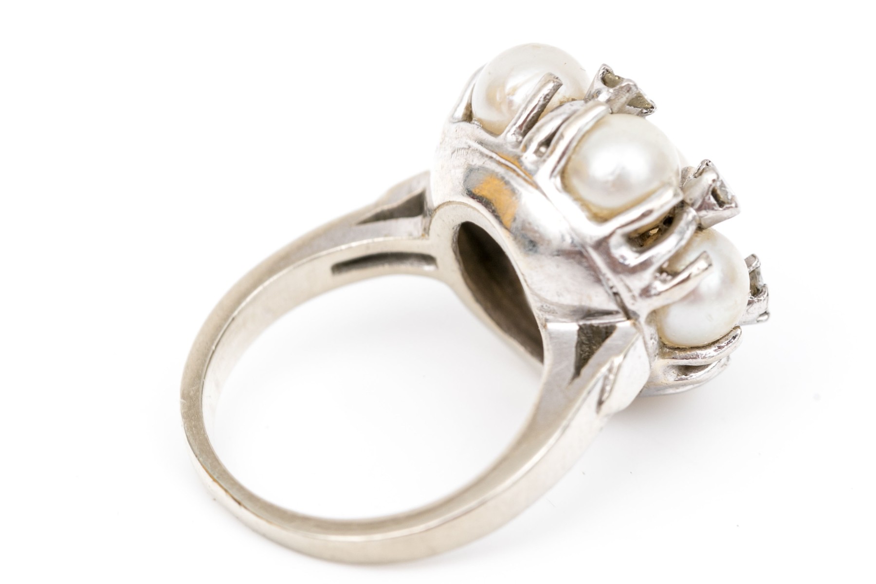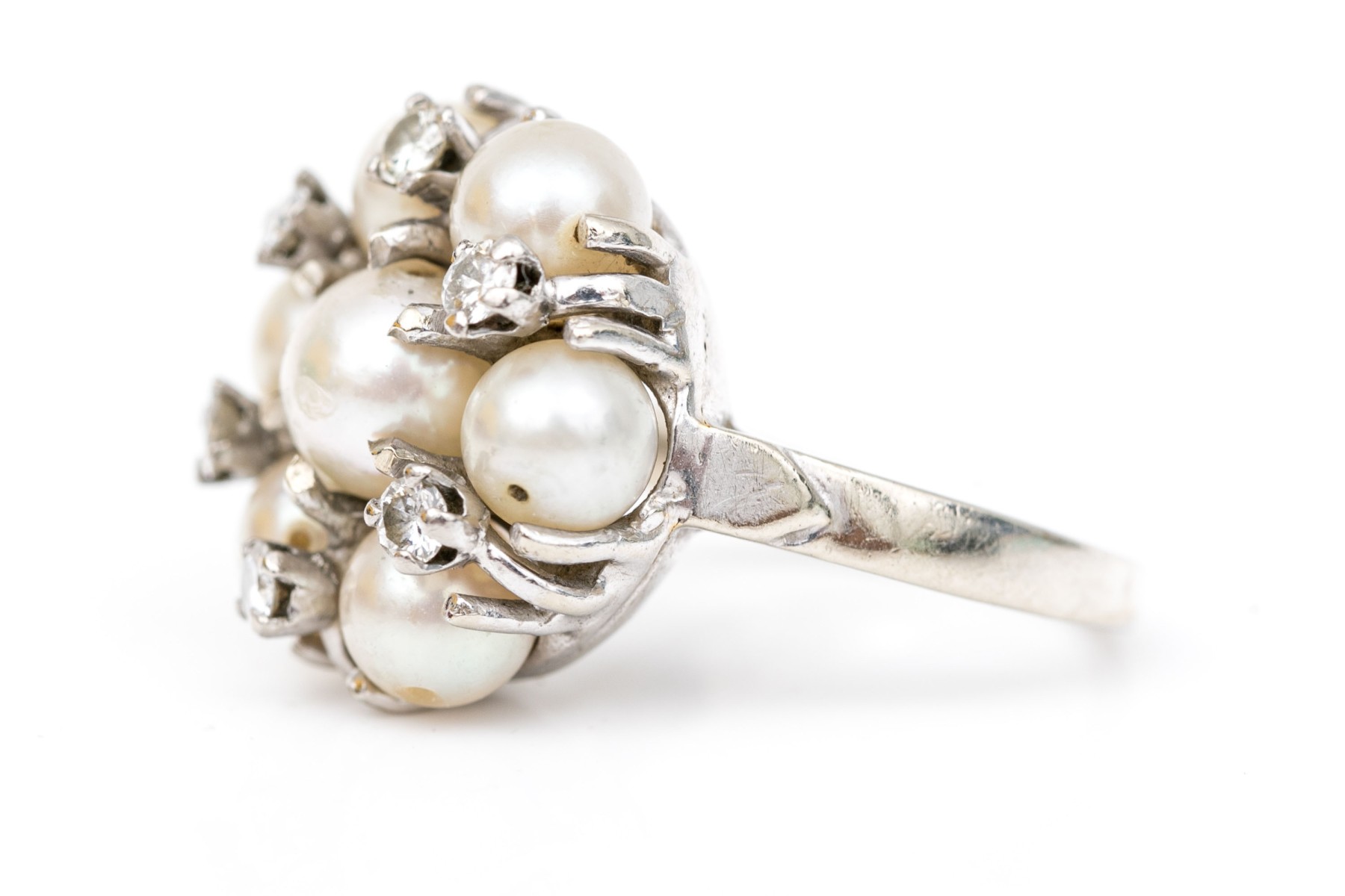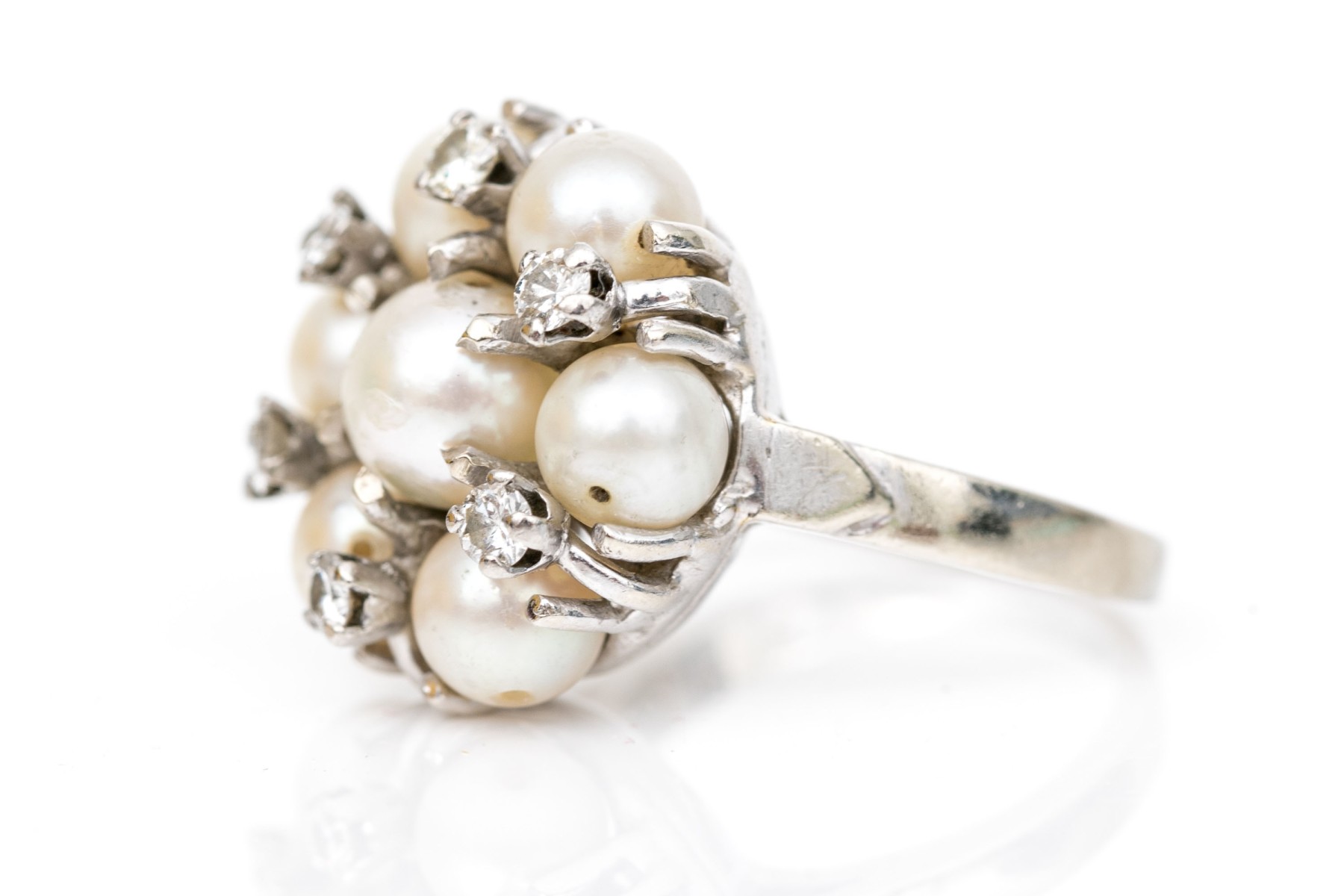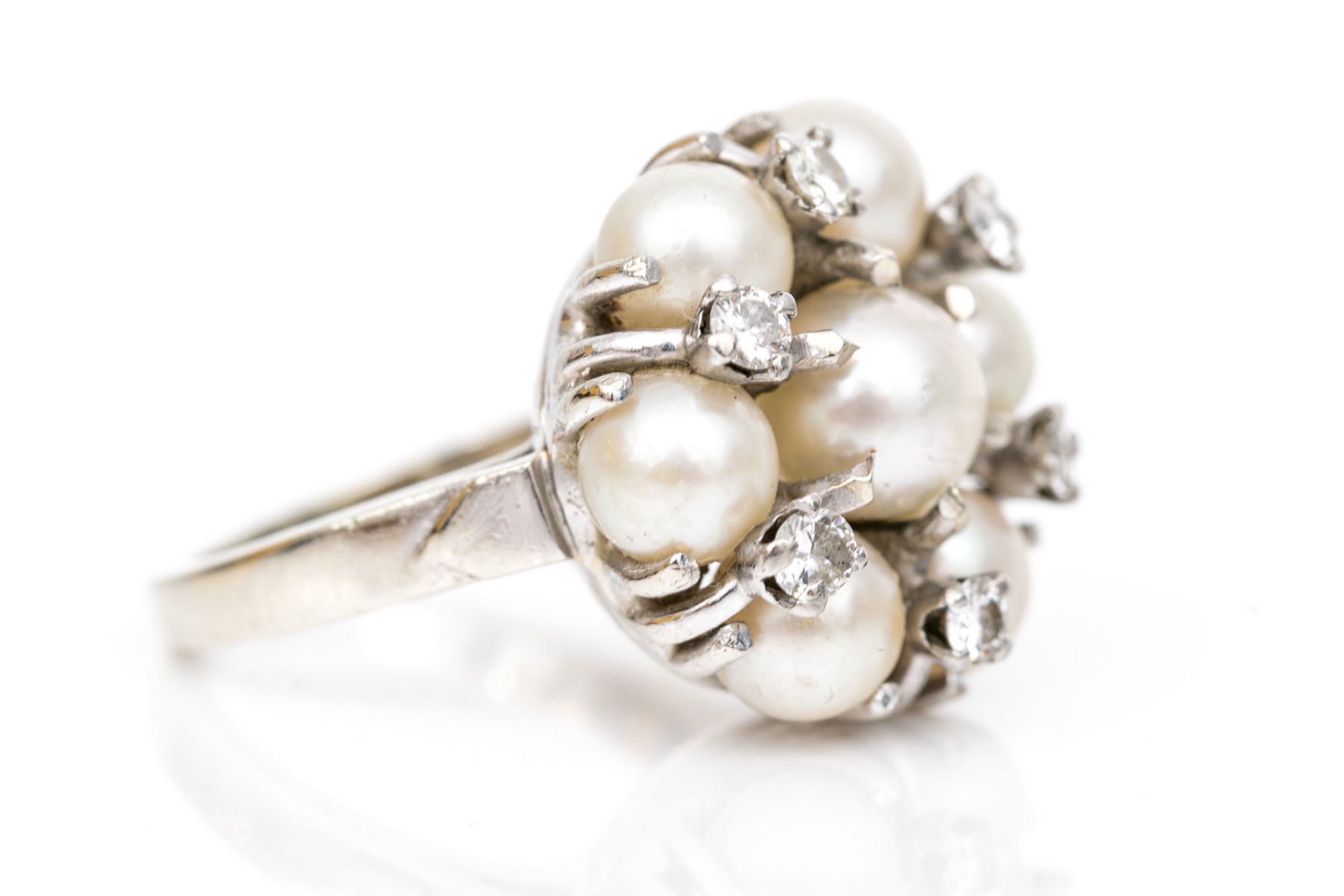 14k white gold vintage pretty cultured pearl and diamond cluster ring, size 3, set with 4.75 mm cultured pearls, interspersed with round faceted diamonds, approximately 0.18 TCW.