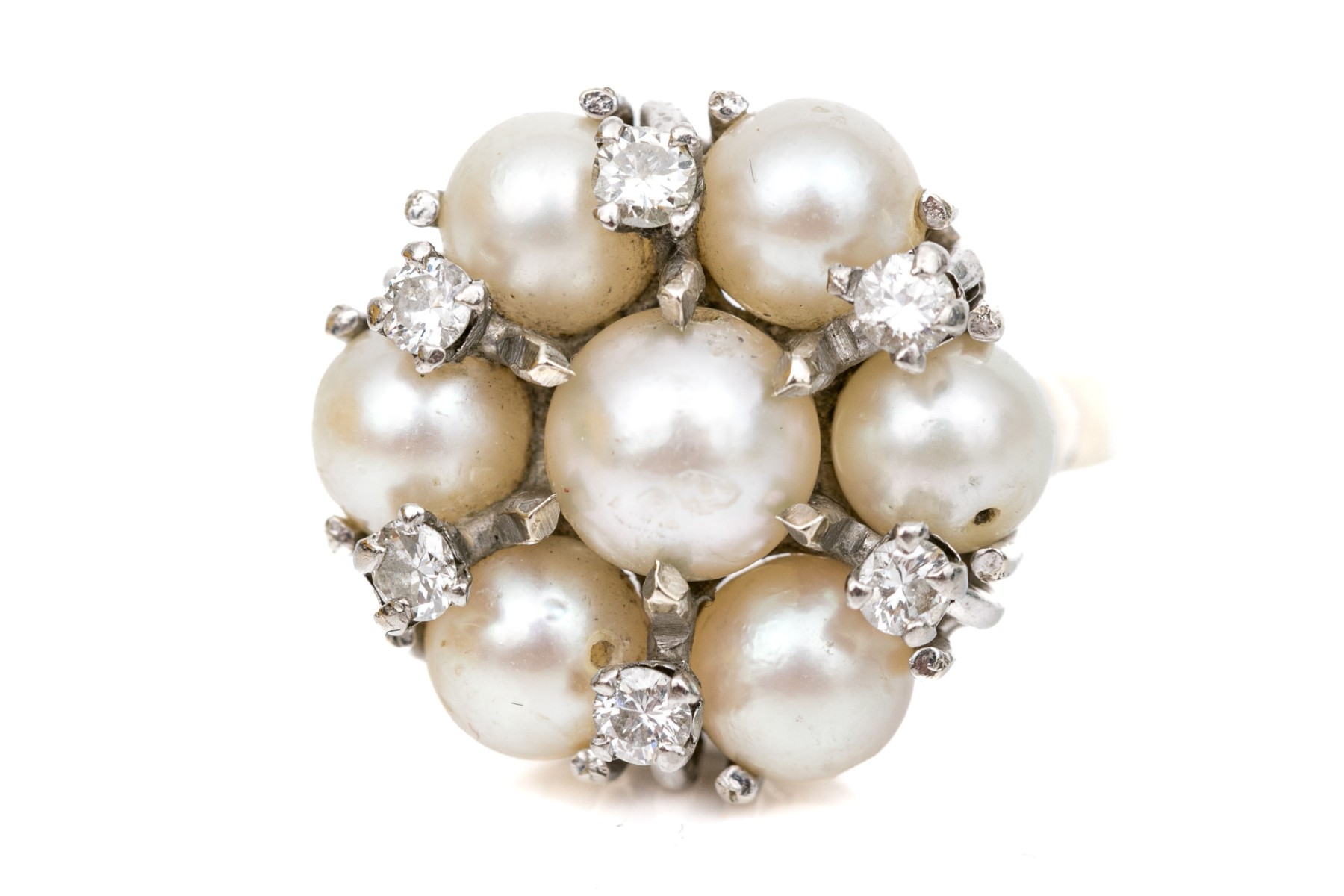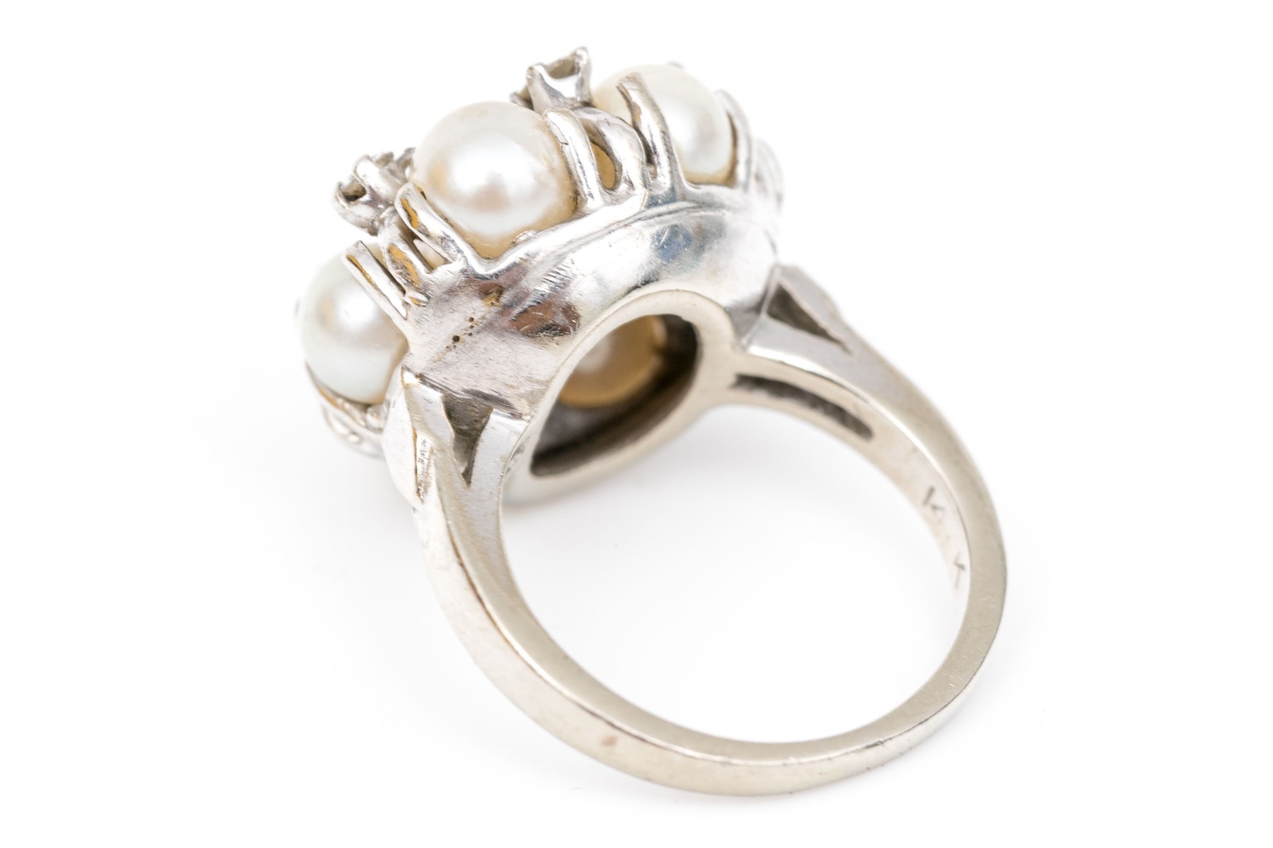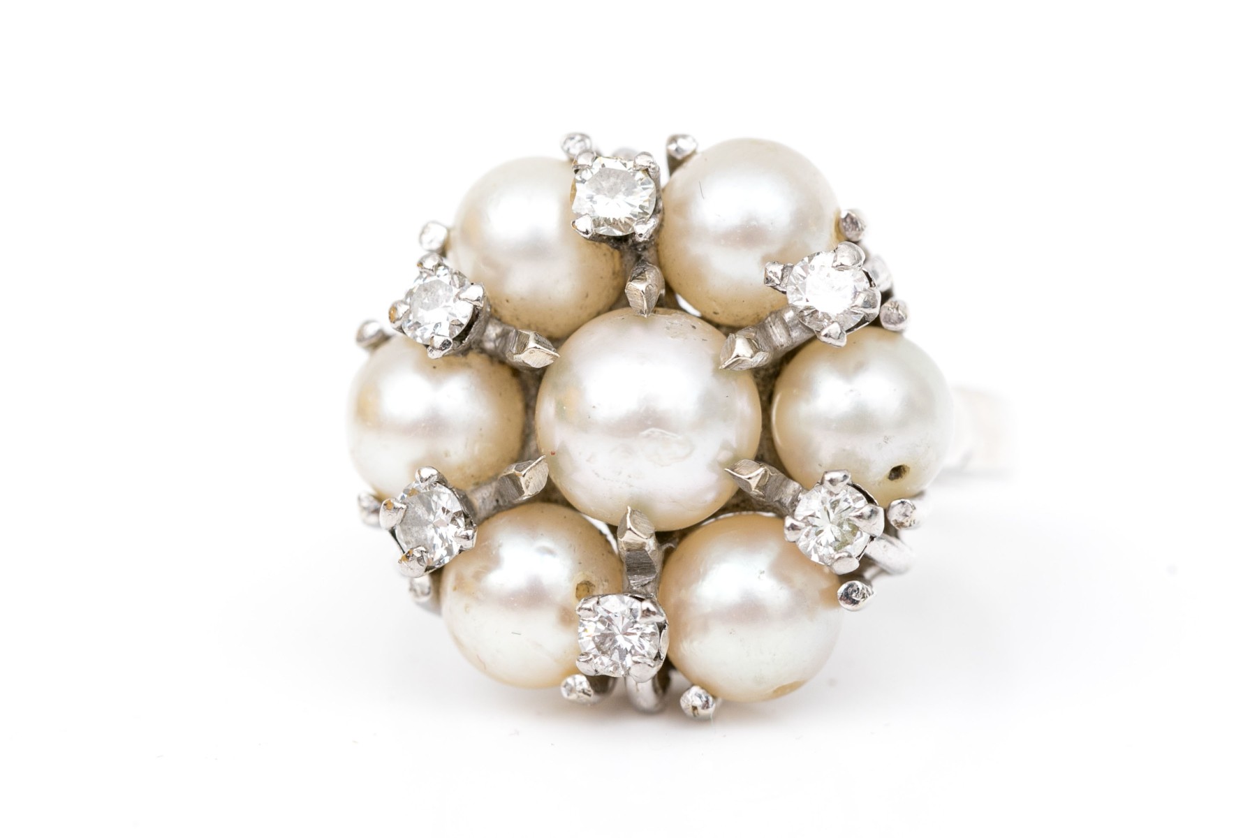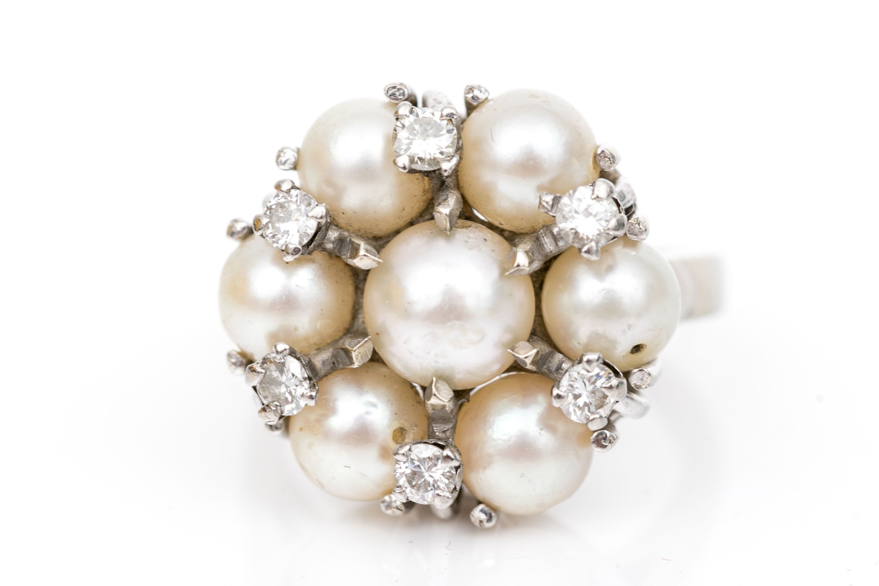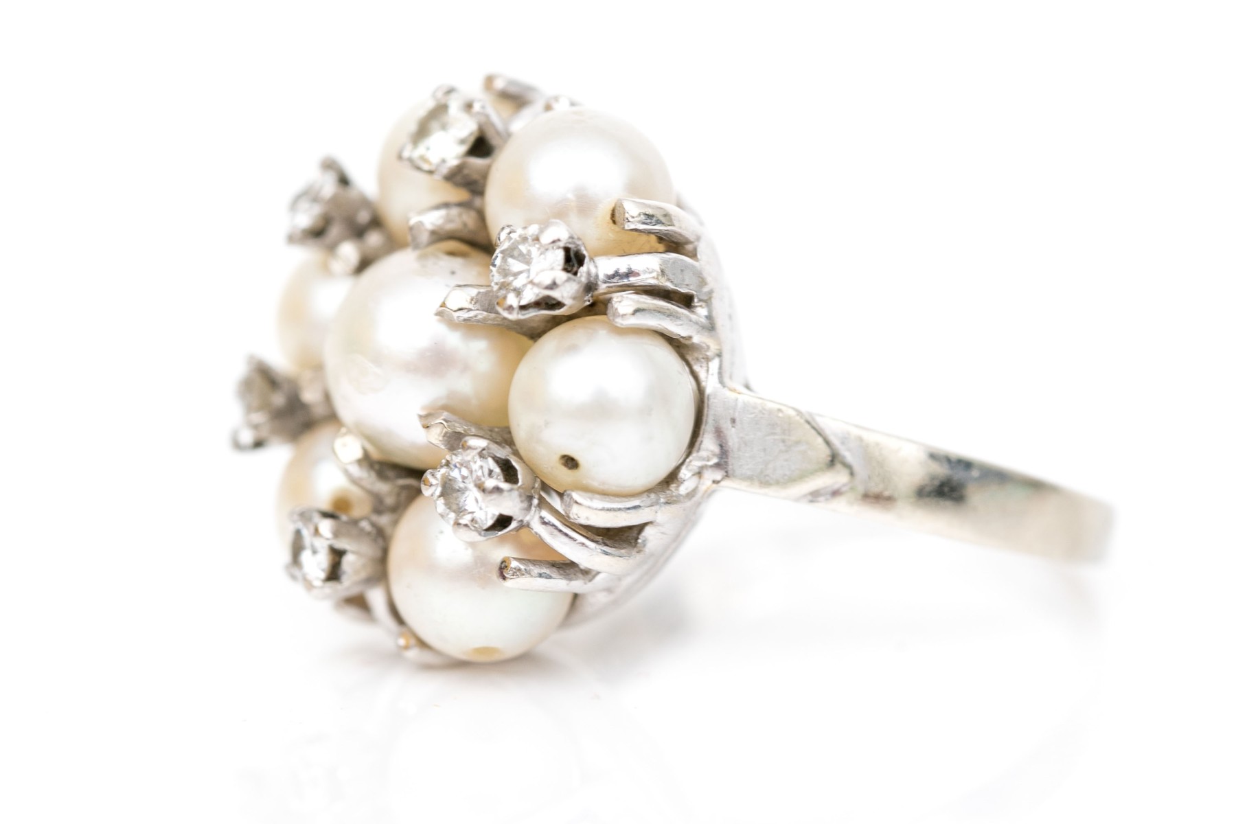 14k white gold vintage pretty cultured pearl and diamond cluster ring, size 3, set with 4.75 mm cultured pearls, interspersed with round faceted diamonds, approximately 0.18 TCW.