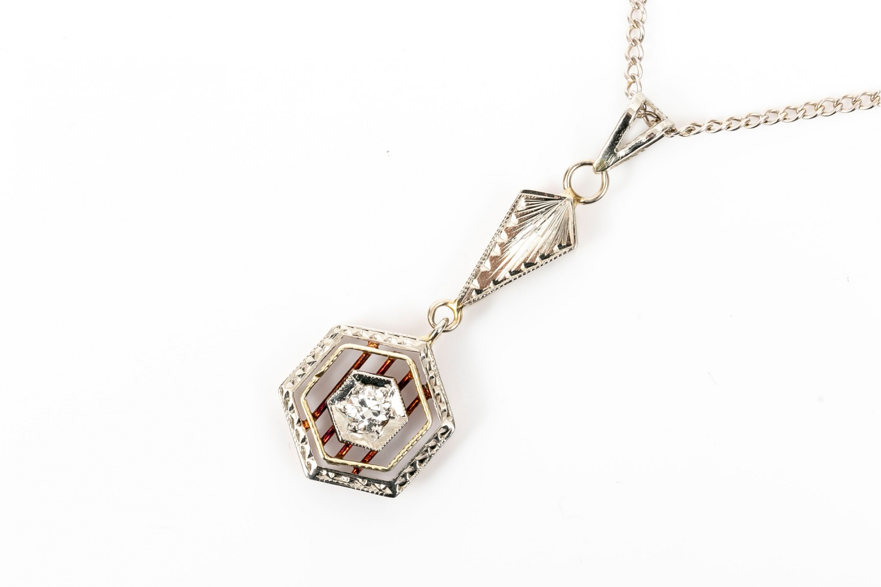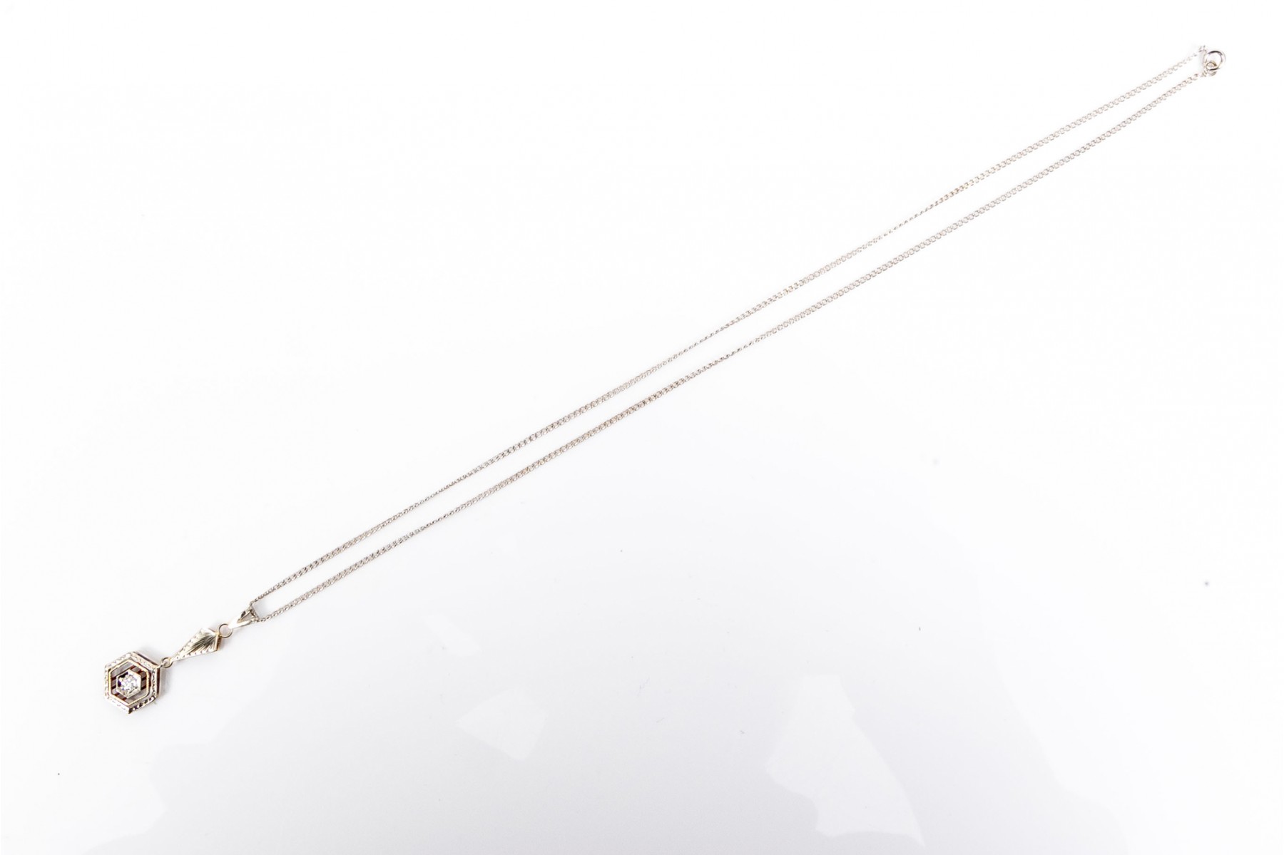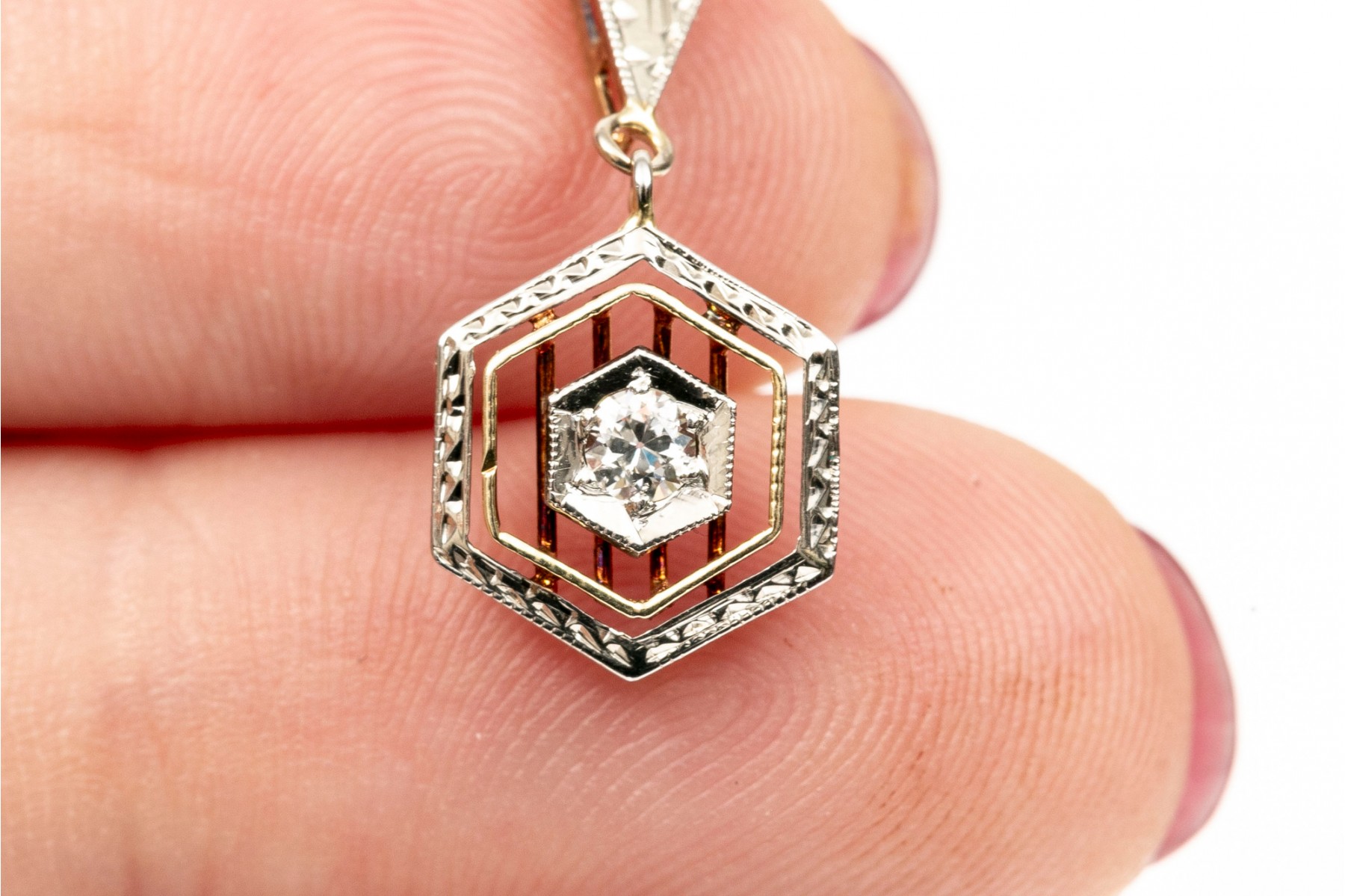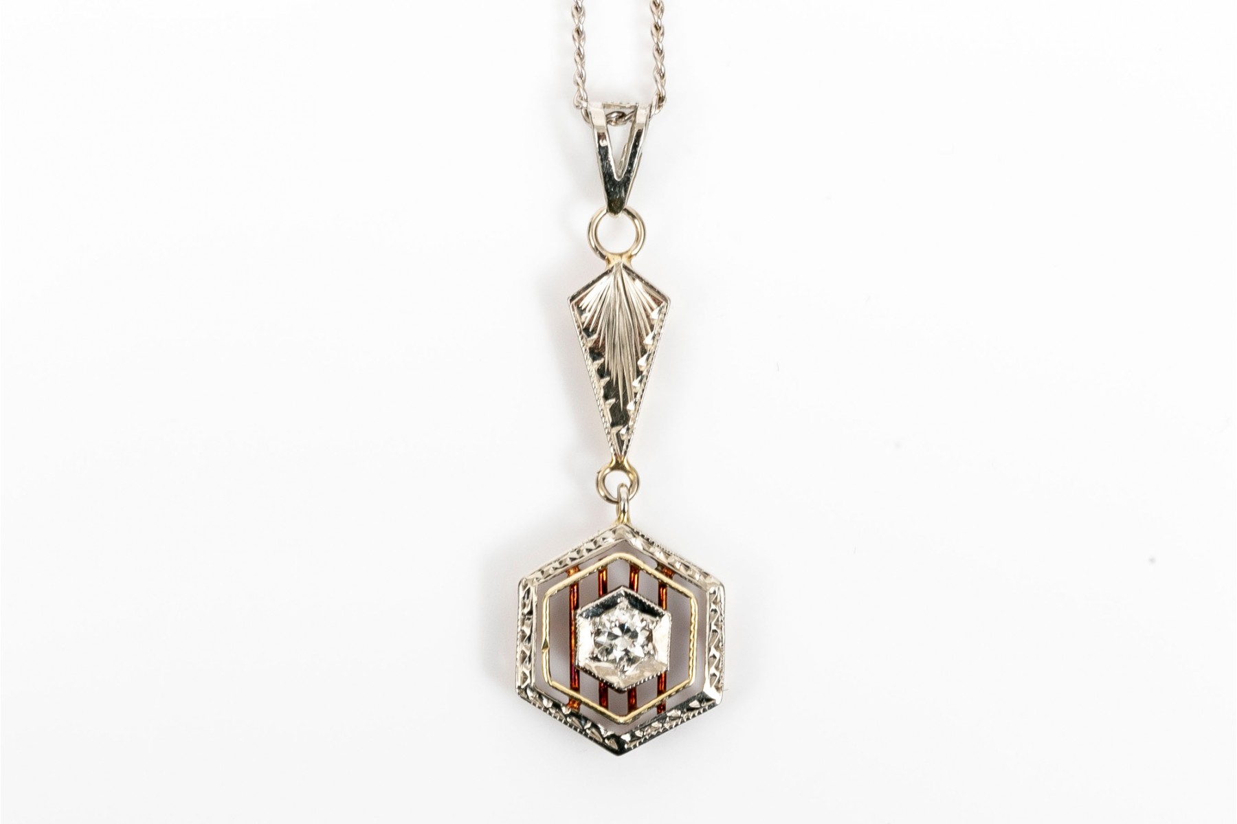 A 14K white gold curb chain displaying a vintage style pendant. Set into the hexagonal base of the pendant is a simple round brilliant cut diamond, approximately 0.05 TCW. Spring ring clasp.
