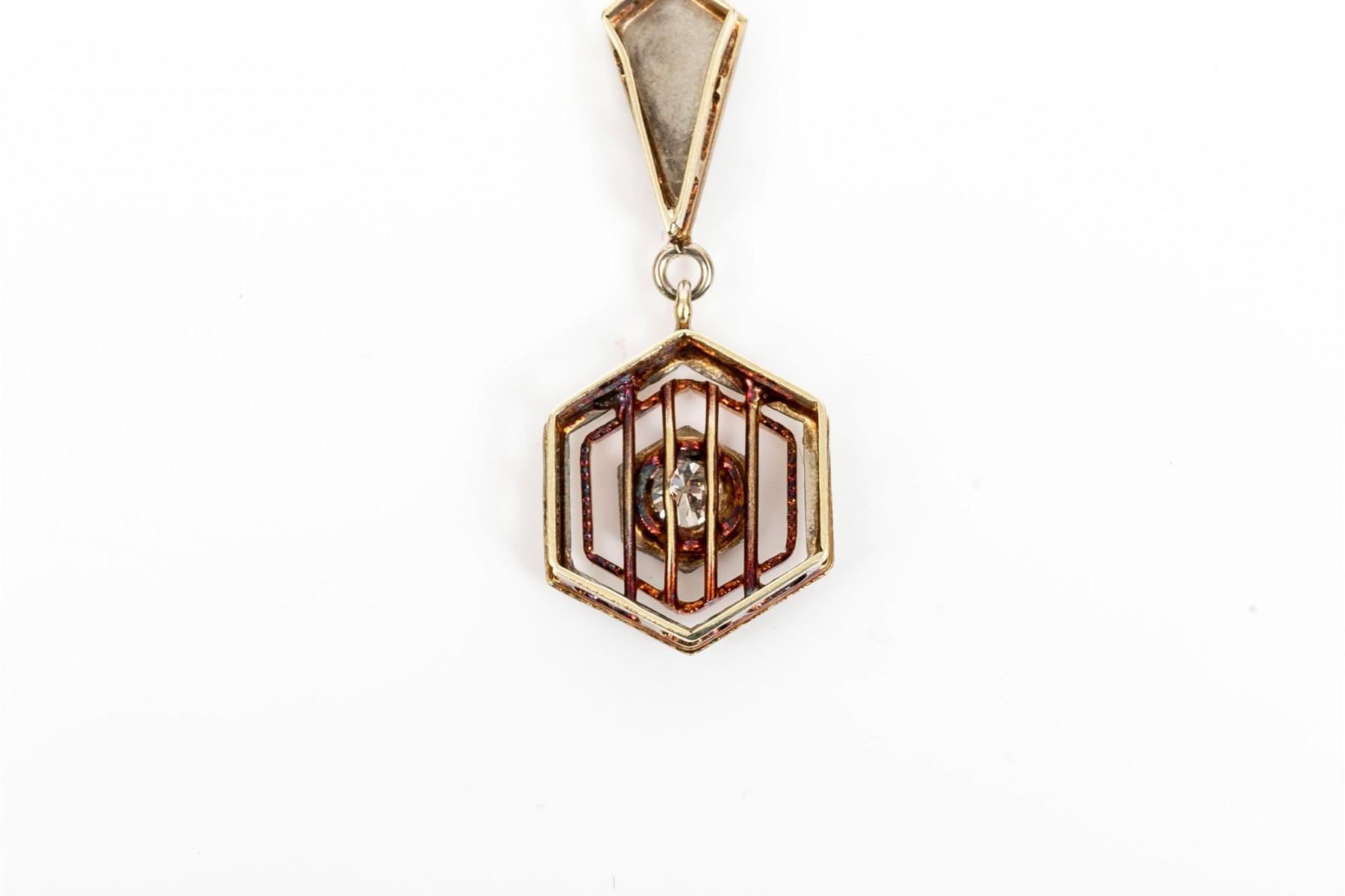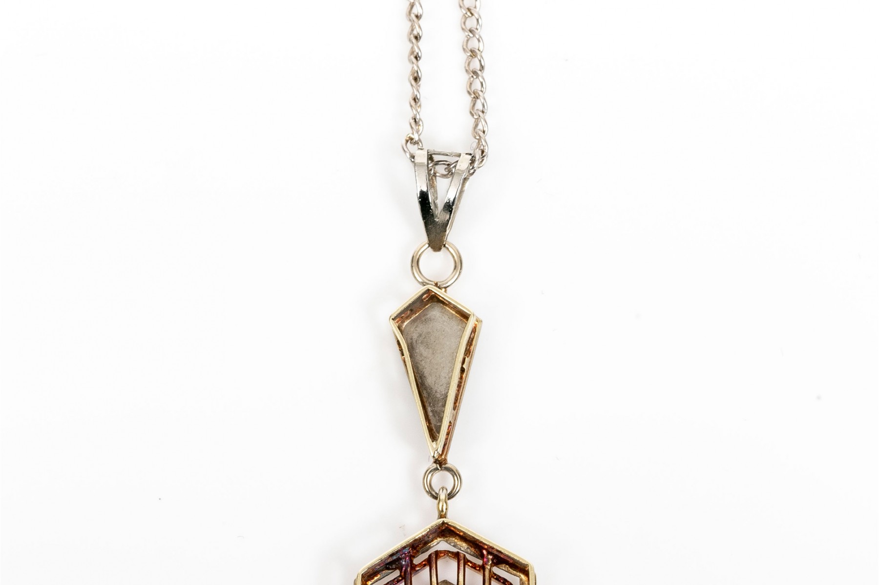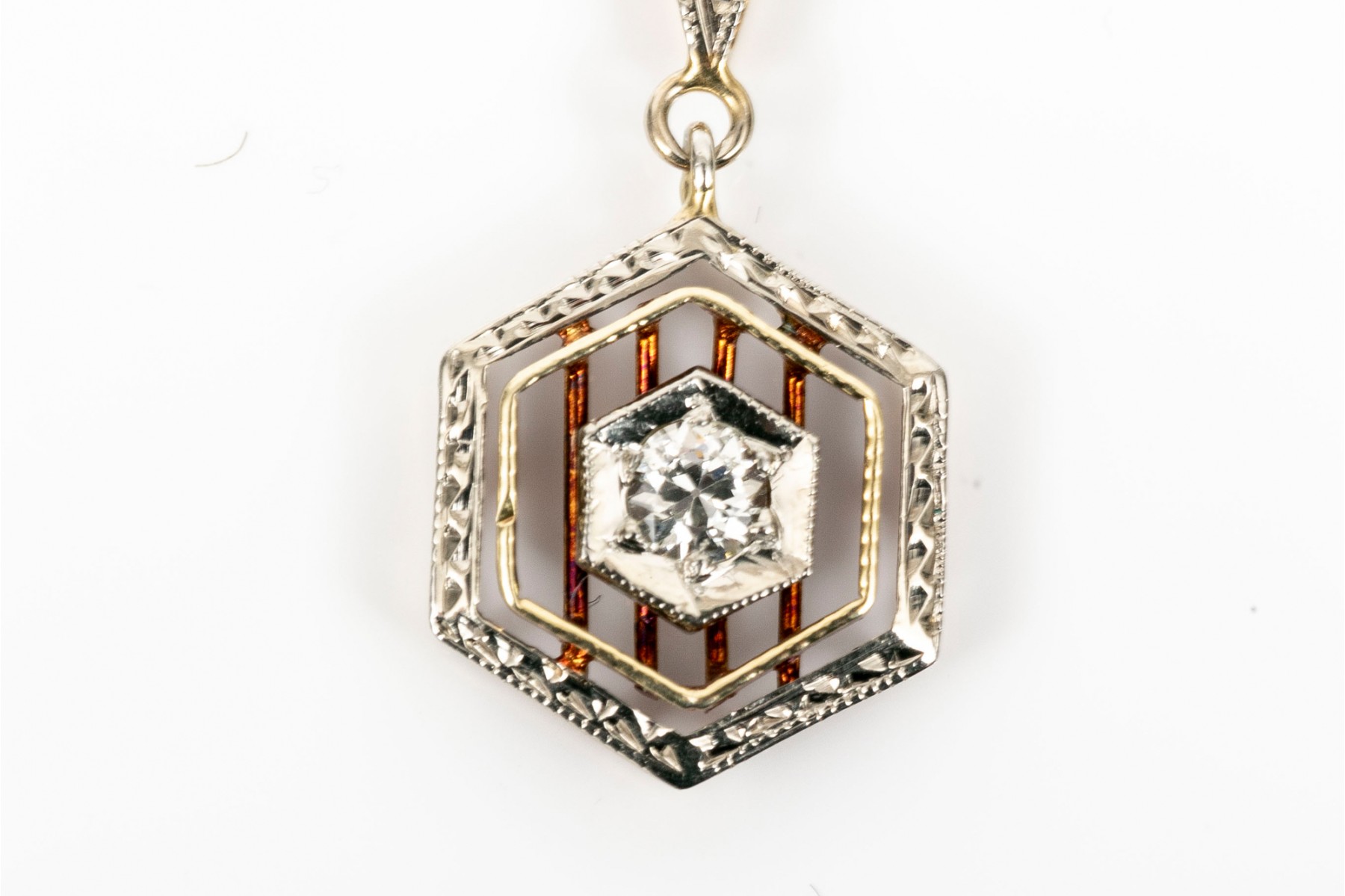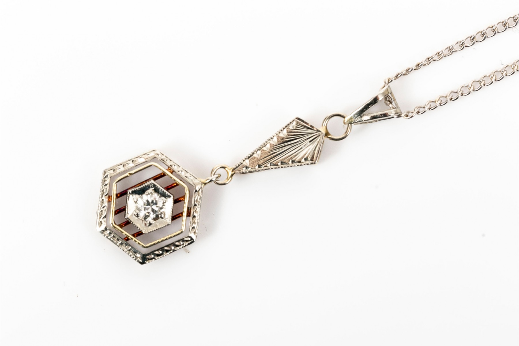 A 14K white gold curb chain displaying a vintage style pendant. Set into the hexagonal base of the pendant is a simple round brilliant cut diamond, approximately 0.05 TCW. Spring ring clasp.