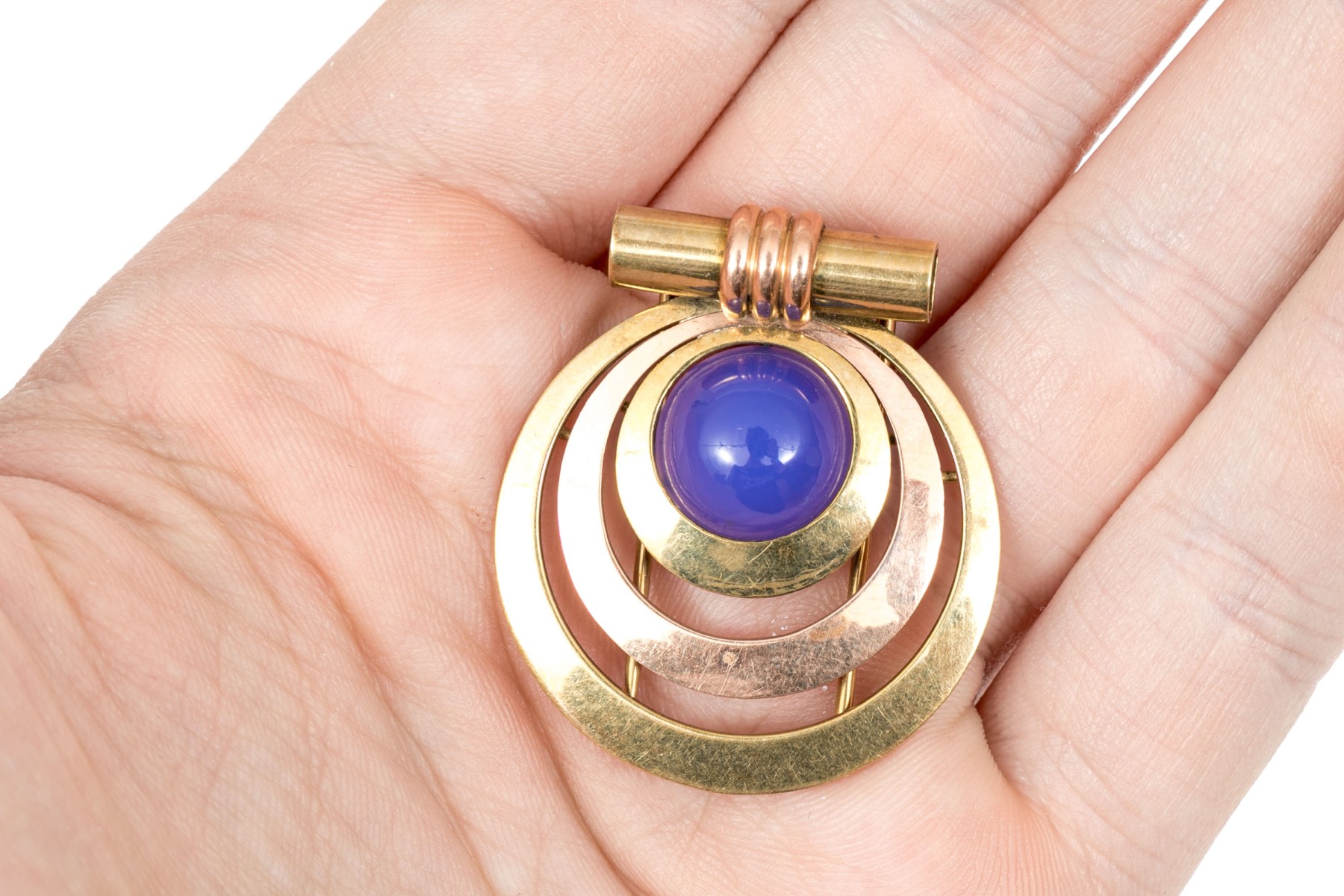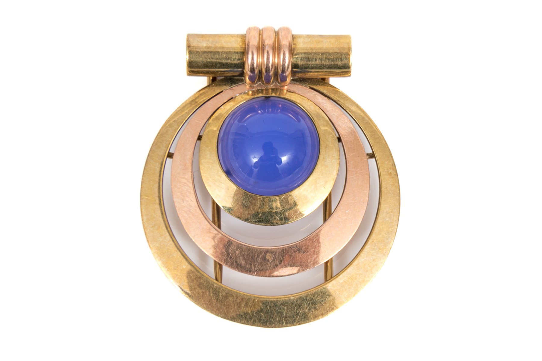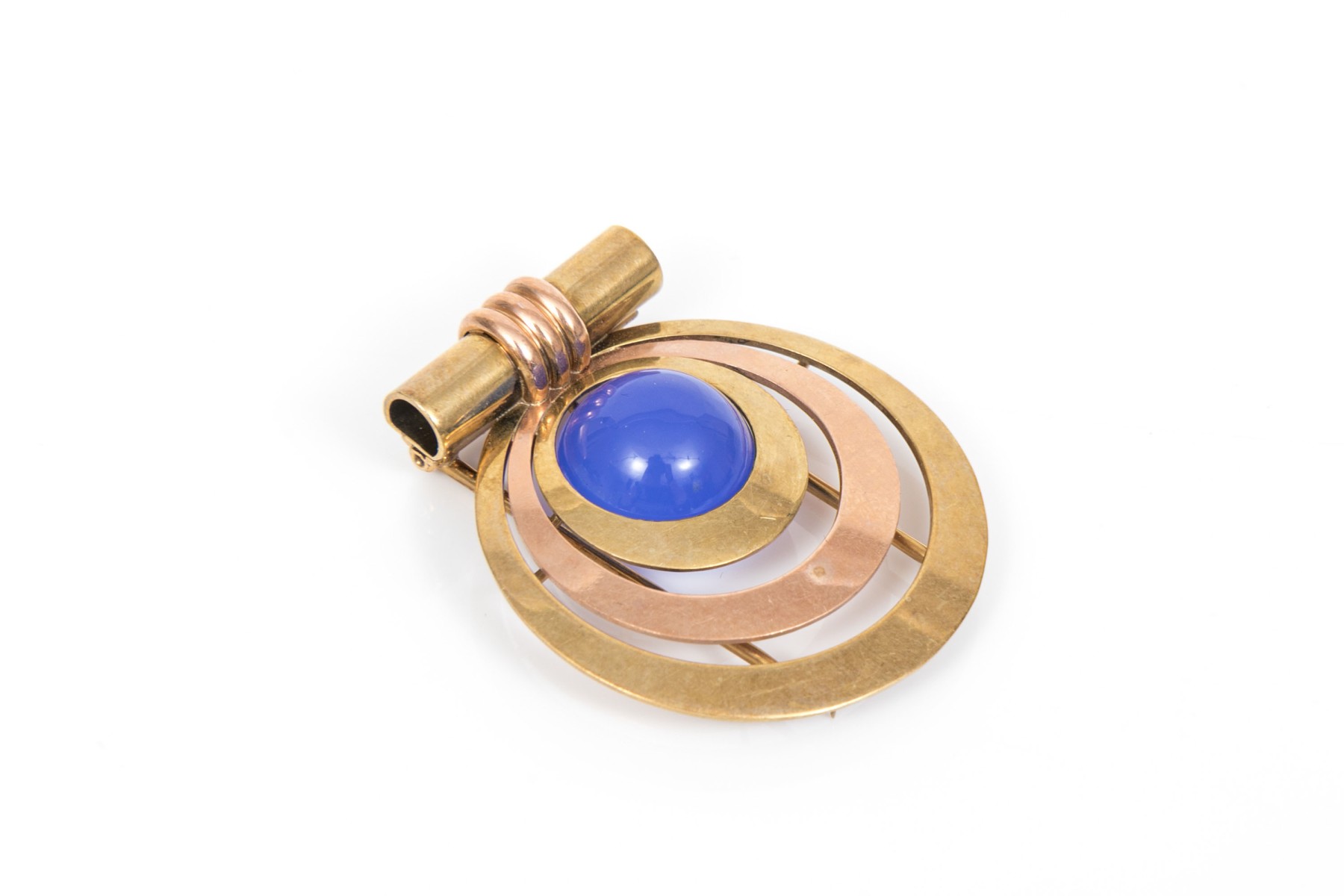 14k yellow and rose gold fabulous Deco style blue chalcedony coat clip