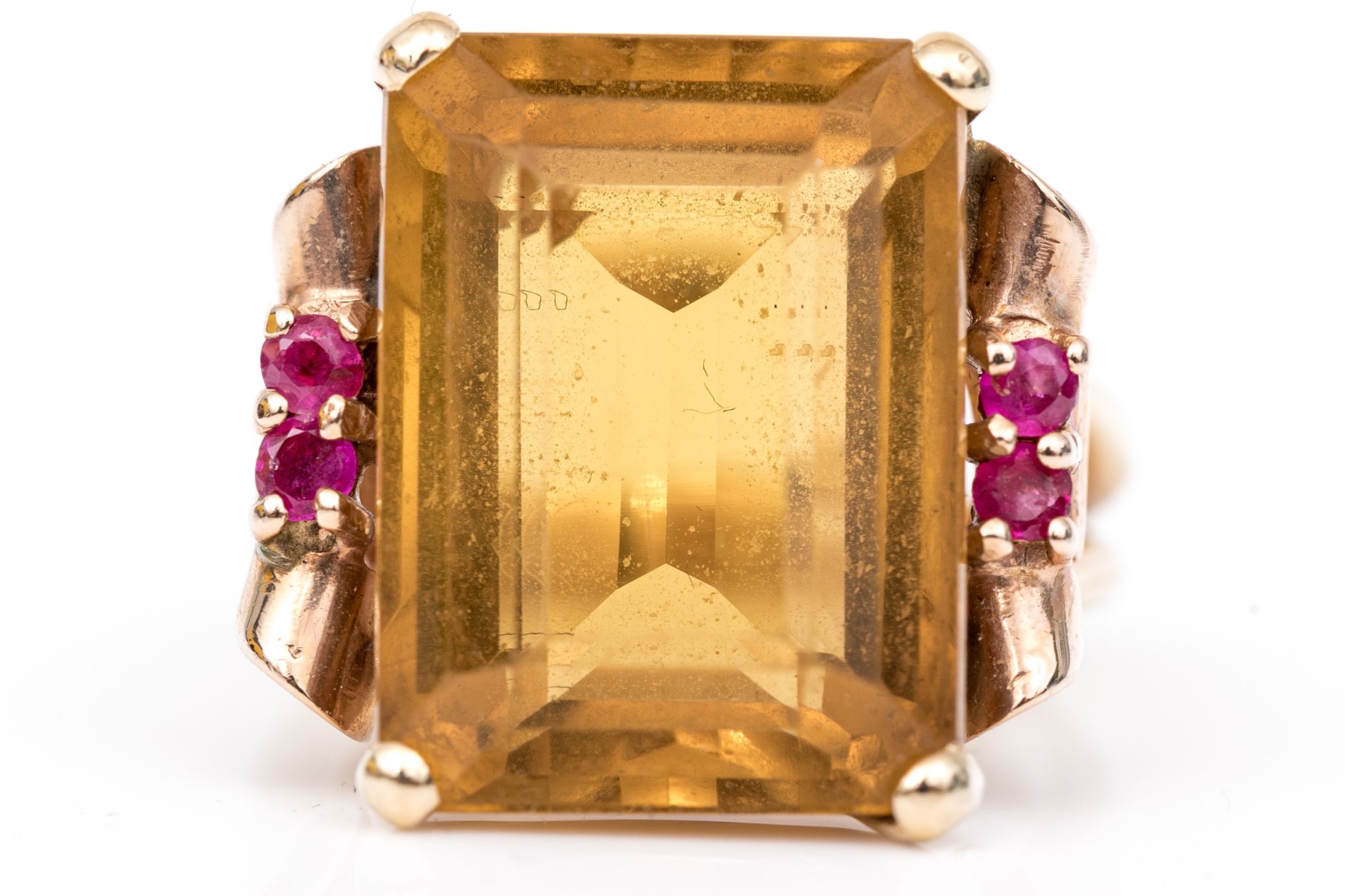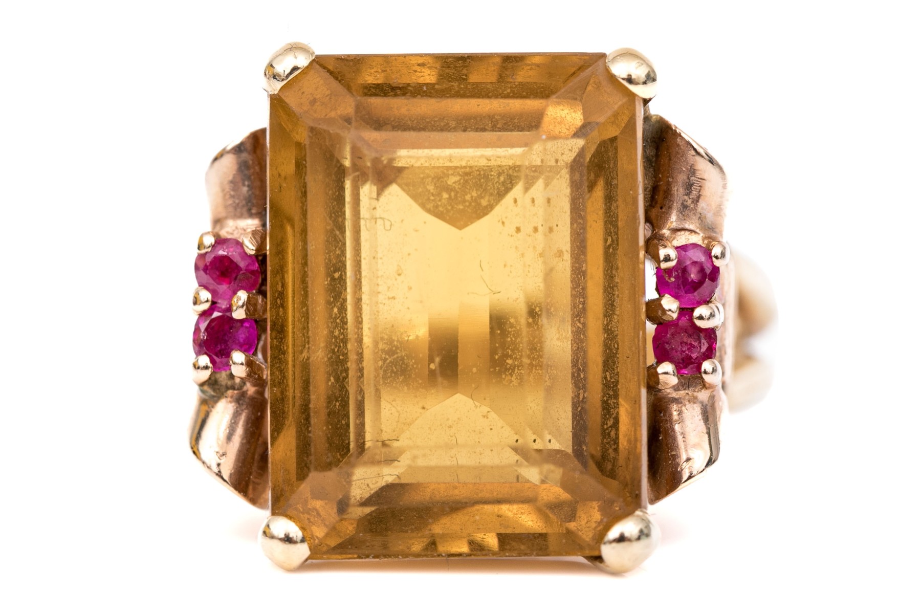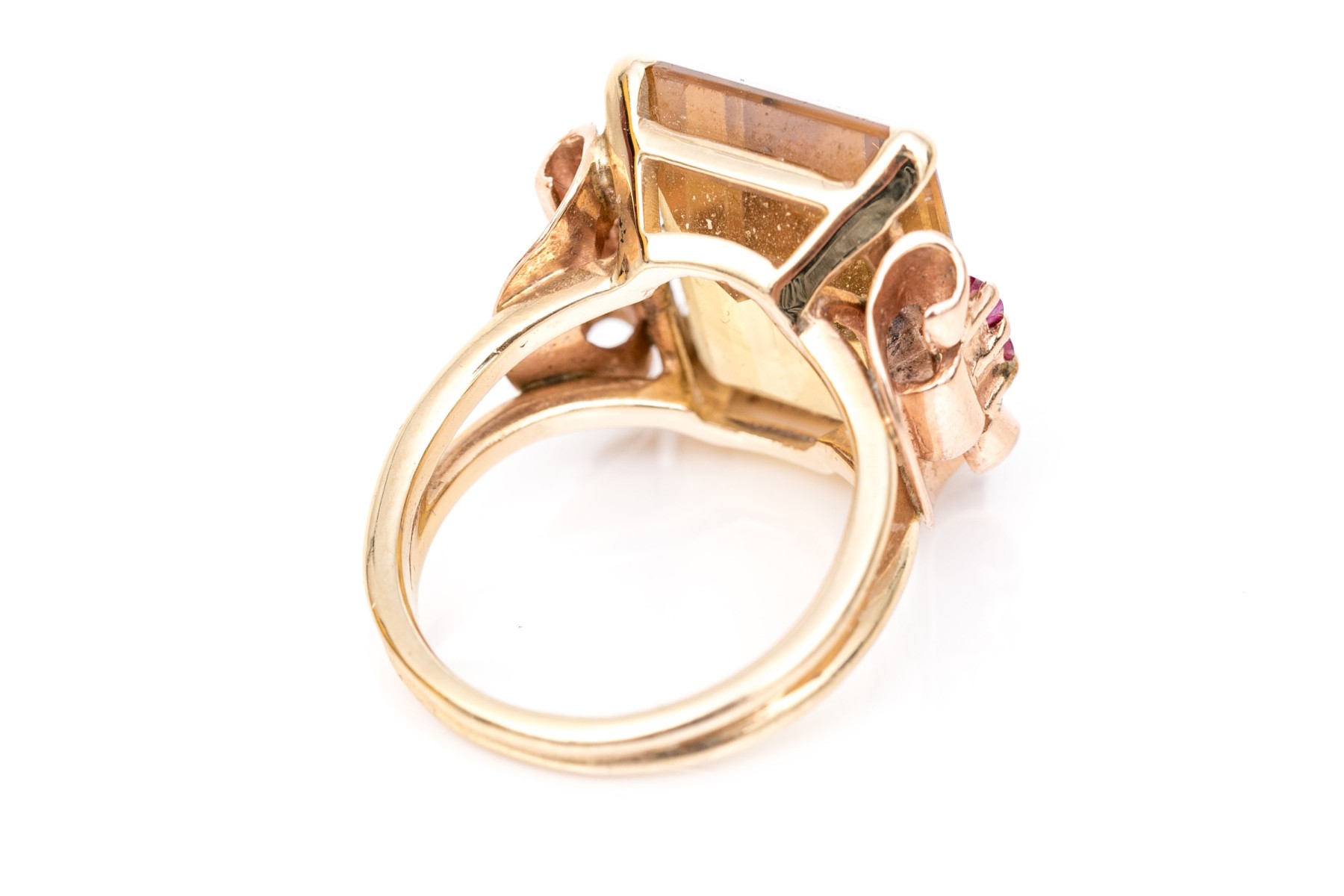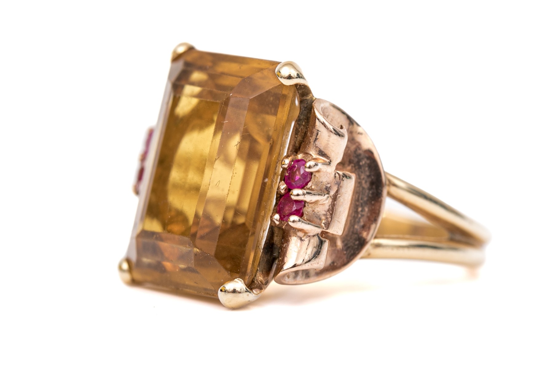 14k yellow and rose gold handsome vintage citrine (app. 9.44 CTS) and round faceted ruby (app. 0.20 TCW) scroll motif ring, finished with split shoulders, size 5.5.