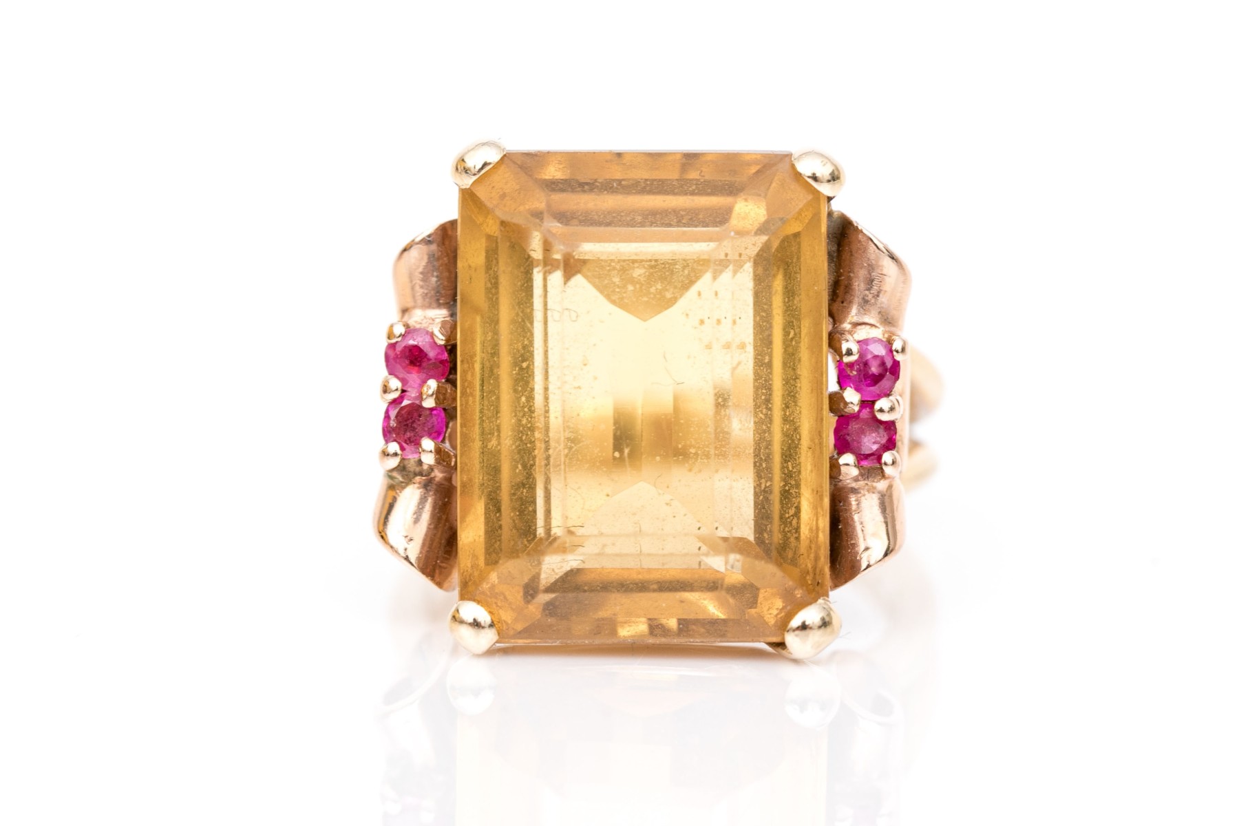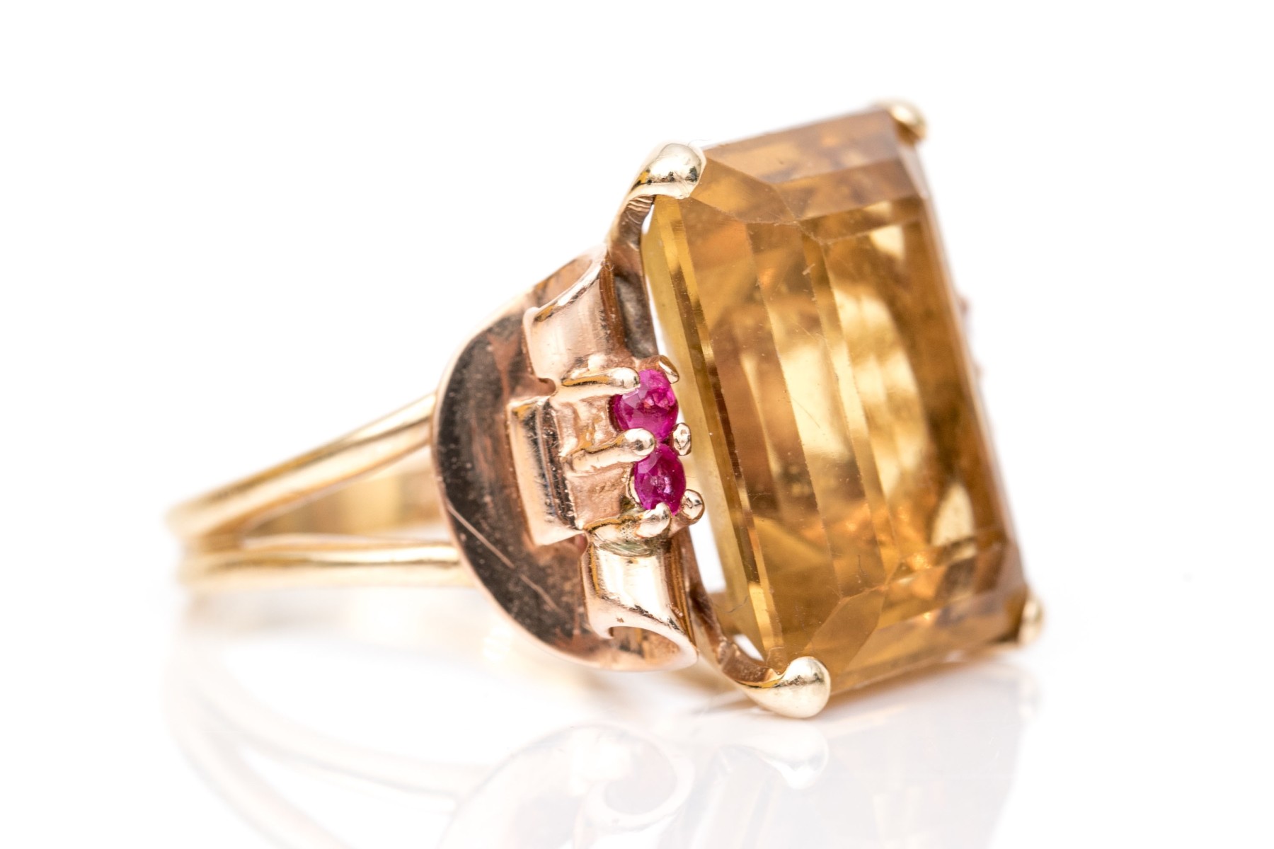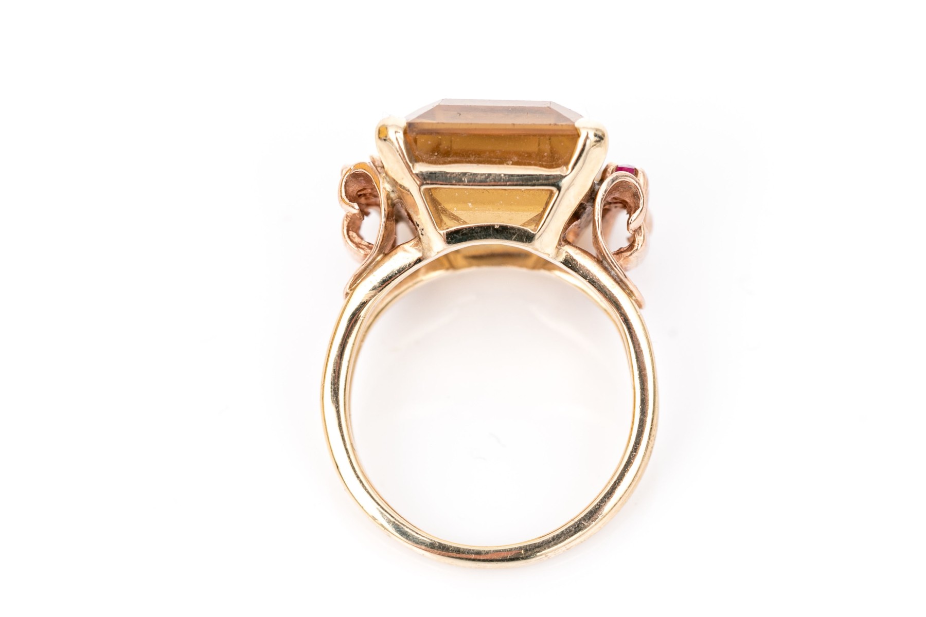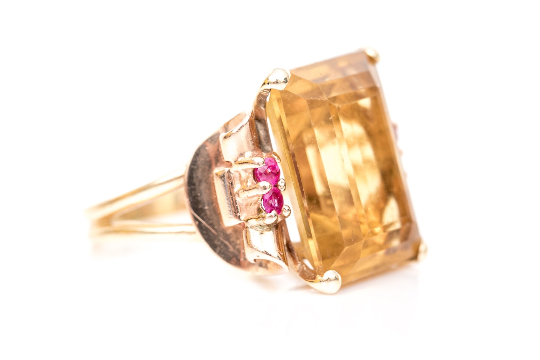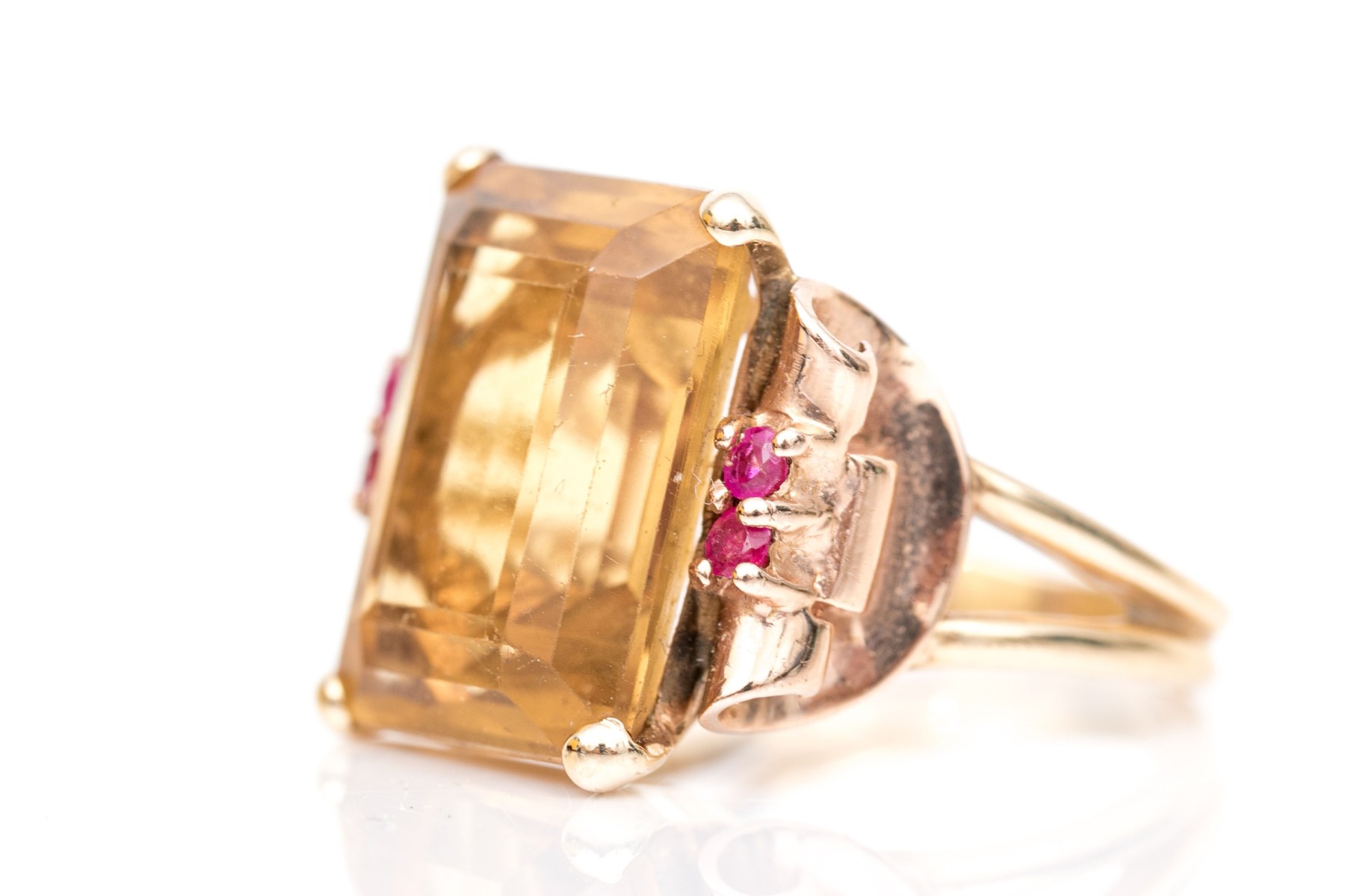 14k yellow and rose gold handsome vintage citrine (app. 9.44 CTS) and round faceted ruby (app. 0.20 TCW) scroll motif ring, finished with split shoulders, size 5.5.