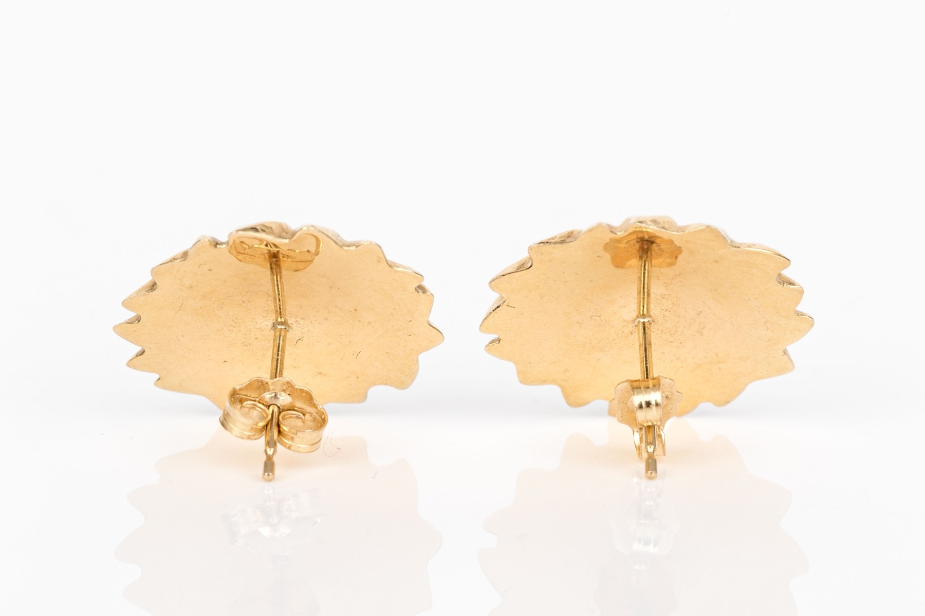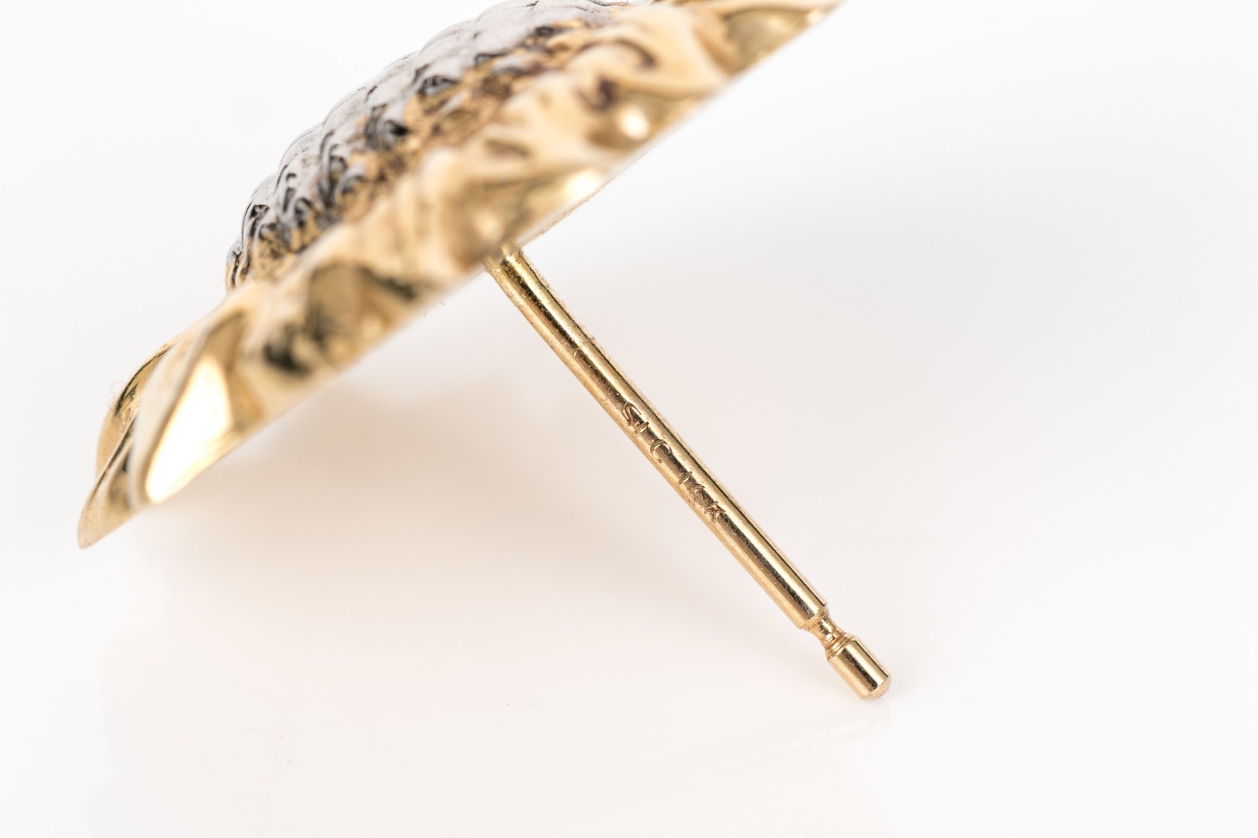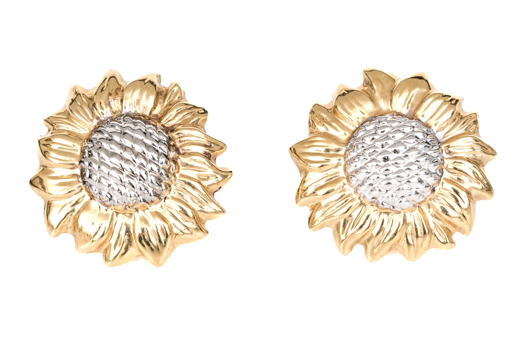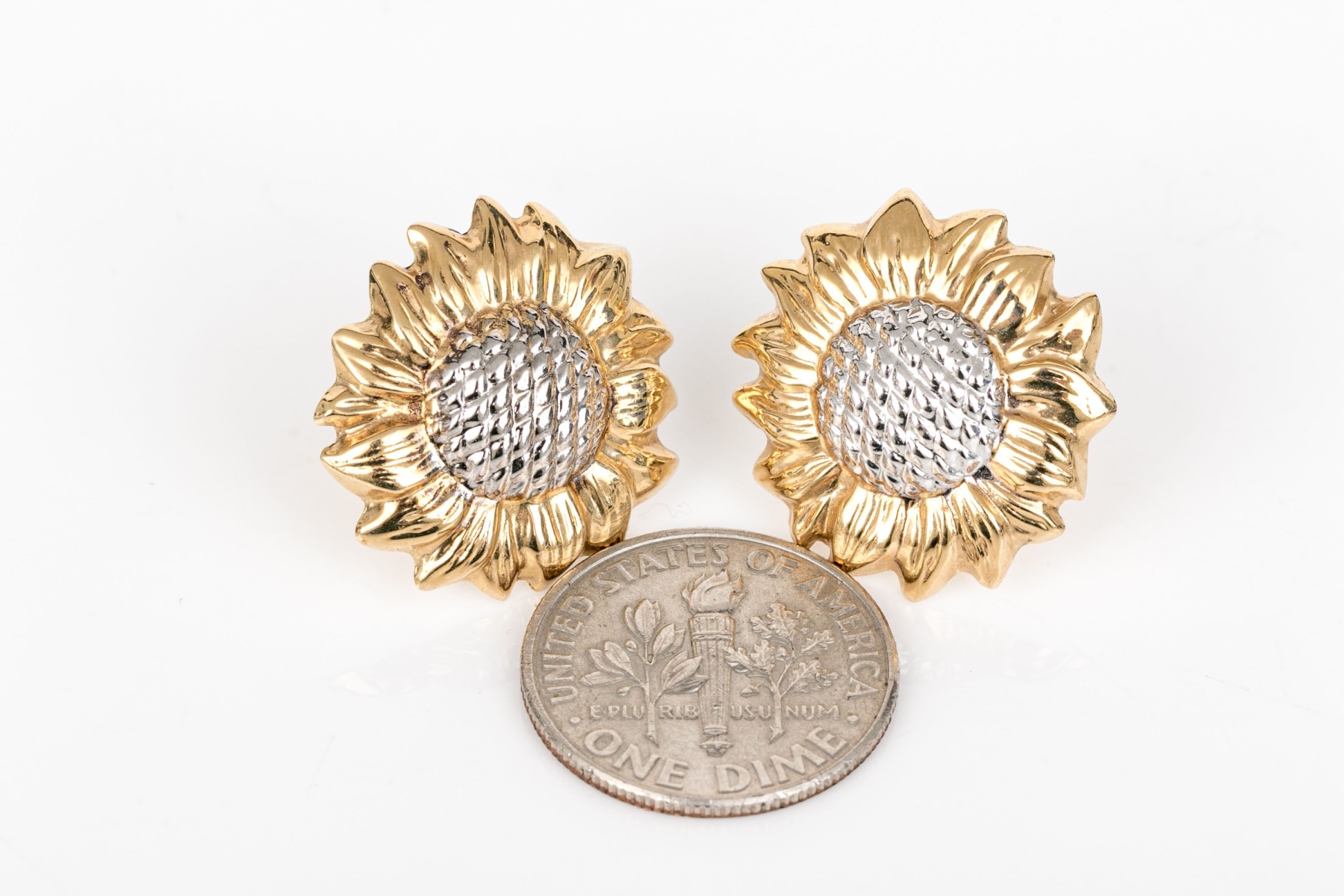 14k yellow and white attractive puffed sunflower motif earrings, finished with posts and clutch style backs (one clutch is not gold)