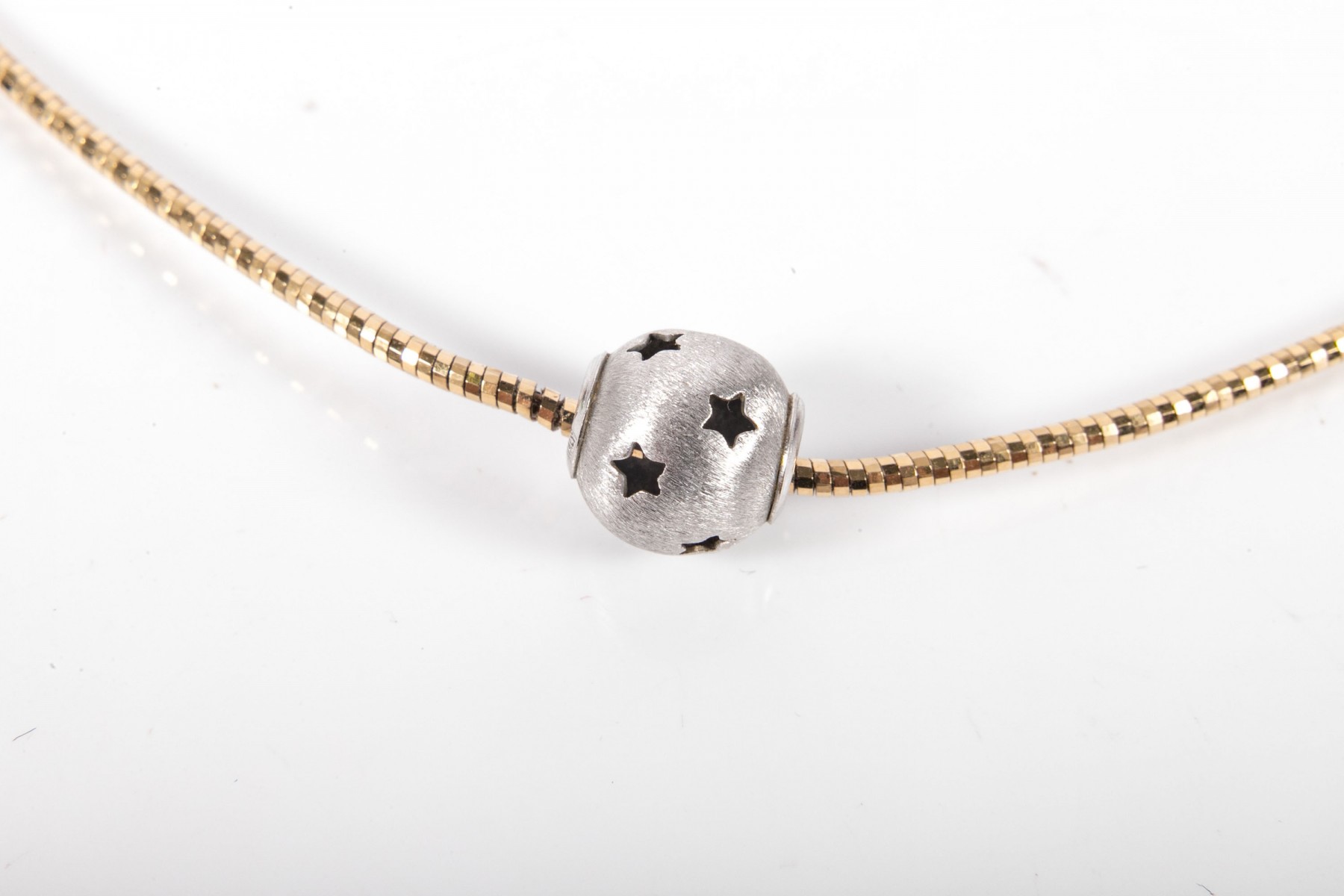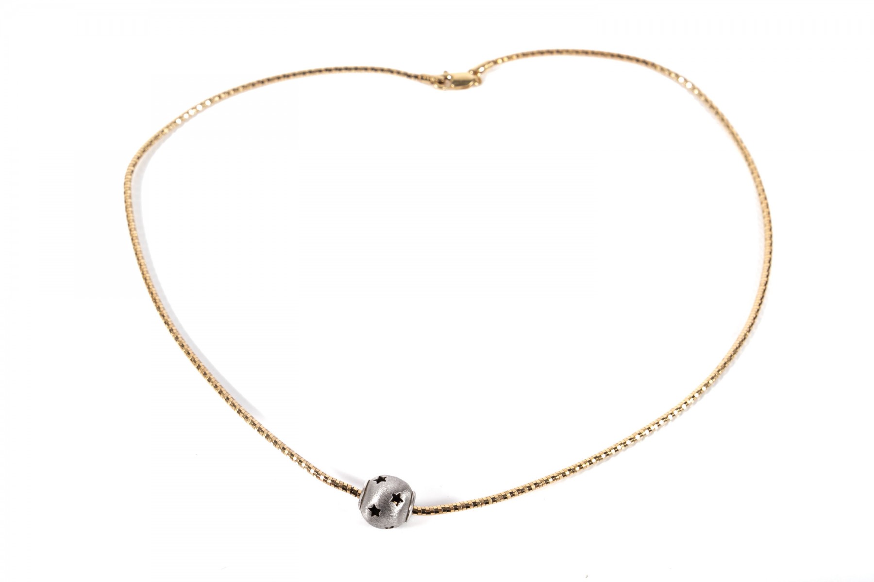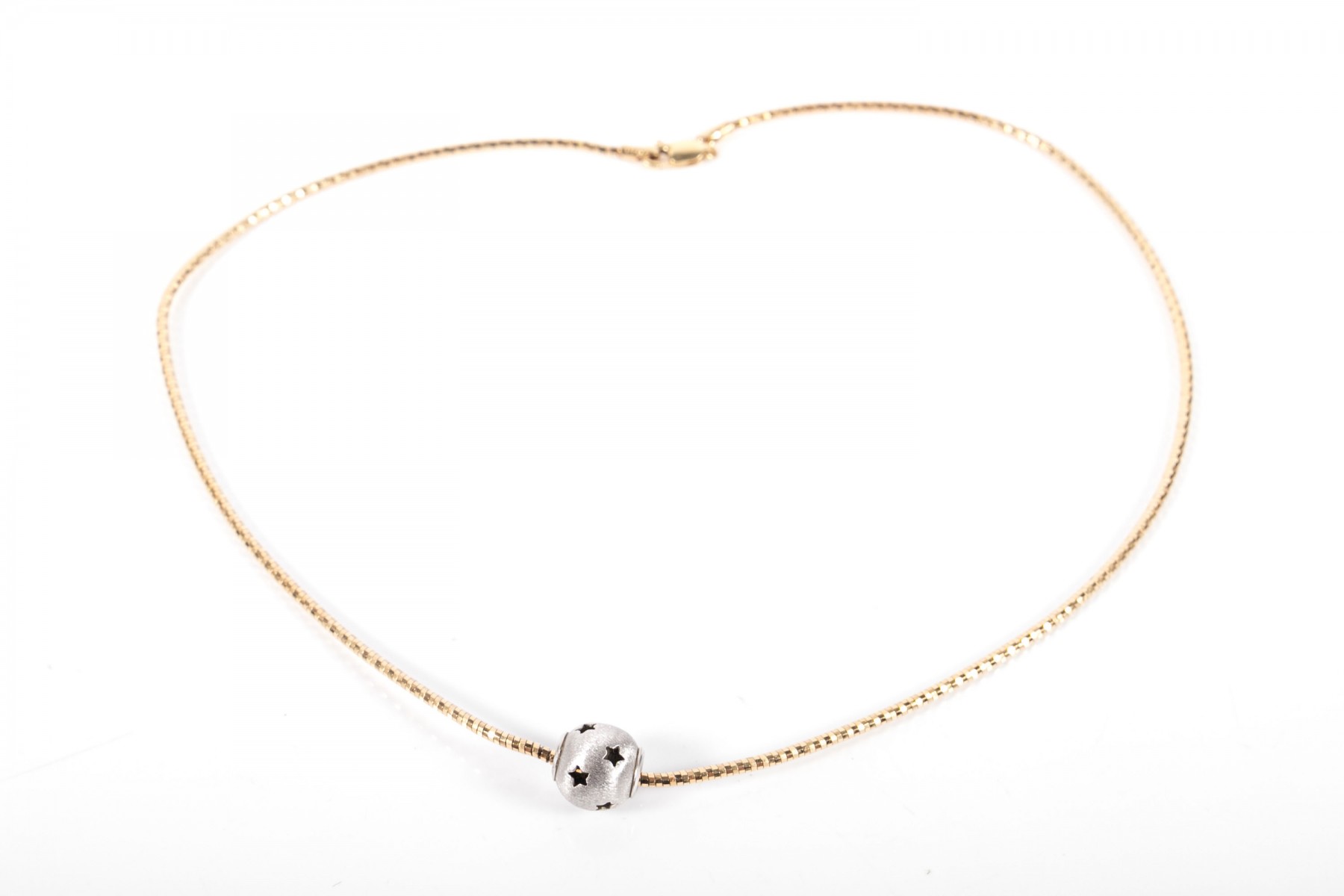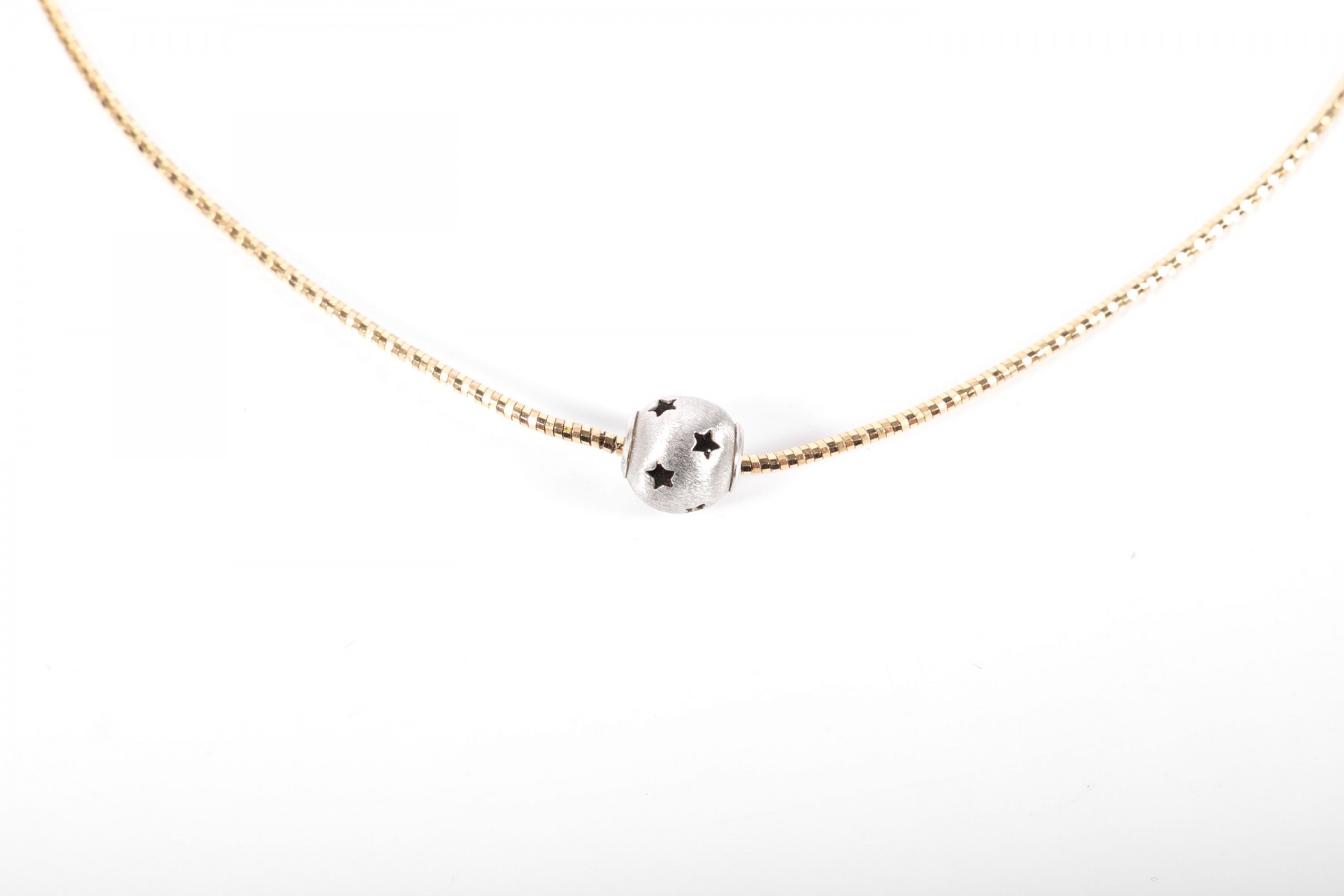 A fun yet elegant necklace displaying a brushed-matte white gold roundel pendant pierced with star motifs hanging from a yellow gold cable.