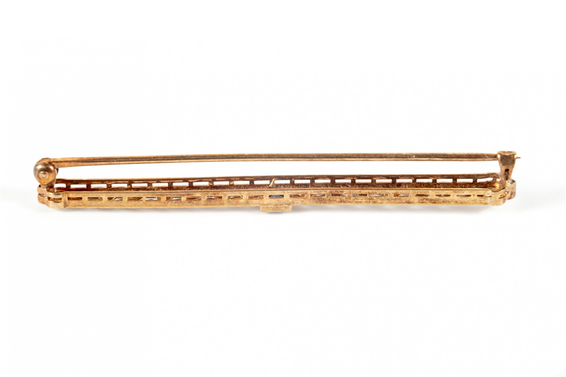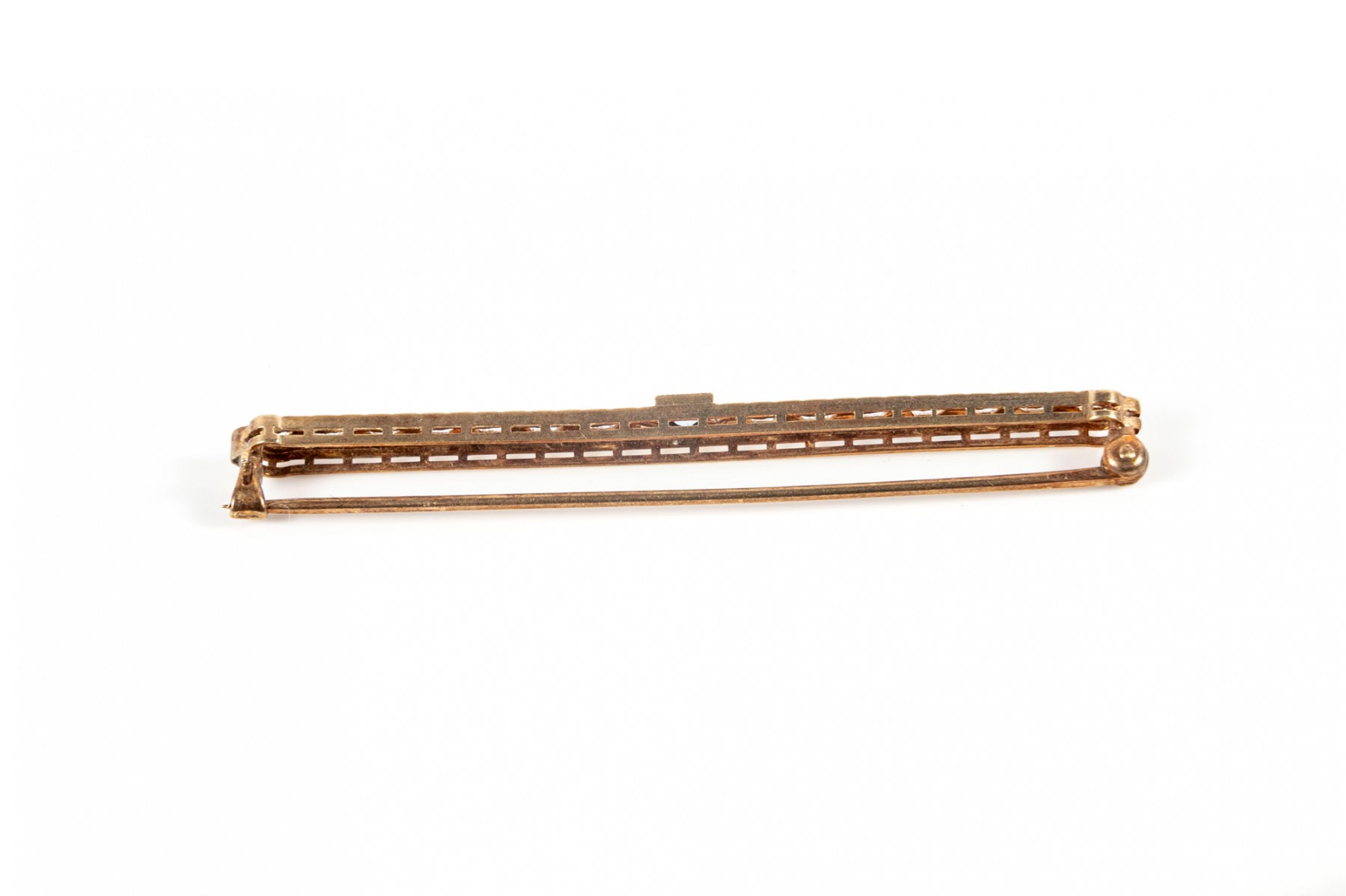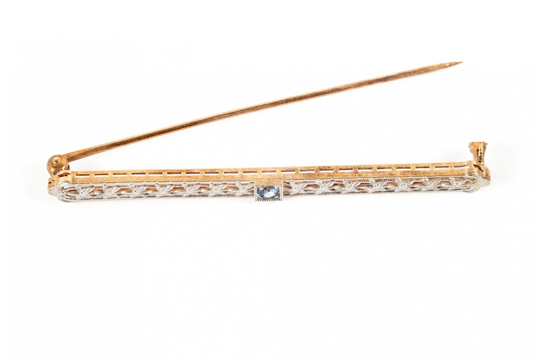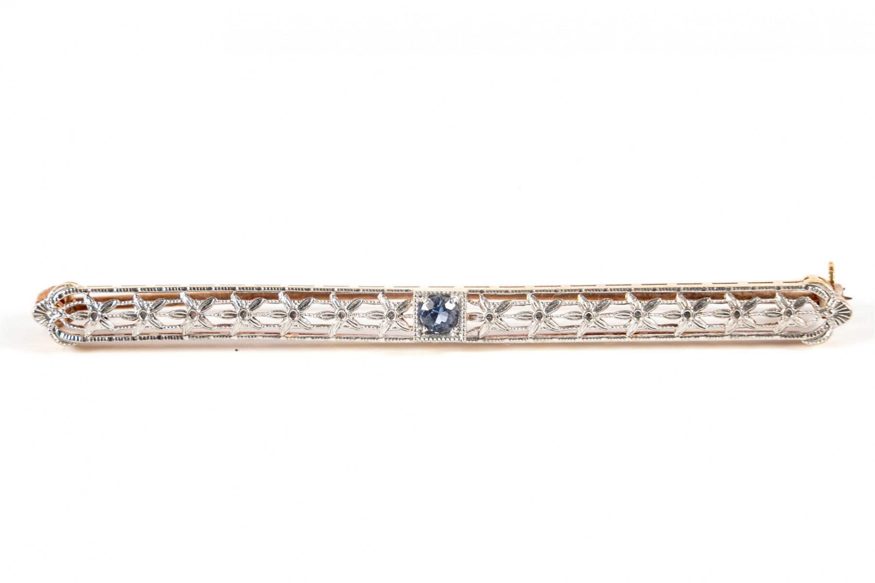 A delightful bar brooch displaying a yellow gold body and a front decorated with fine floral openwork in white gold, leading to a round pale baby blue sapphire at the center.