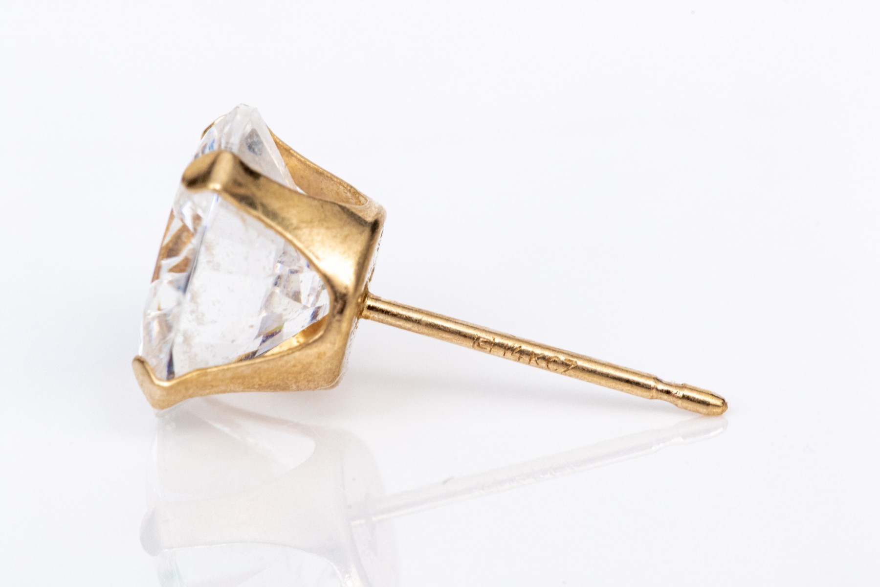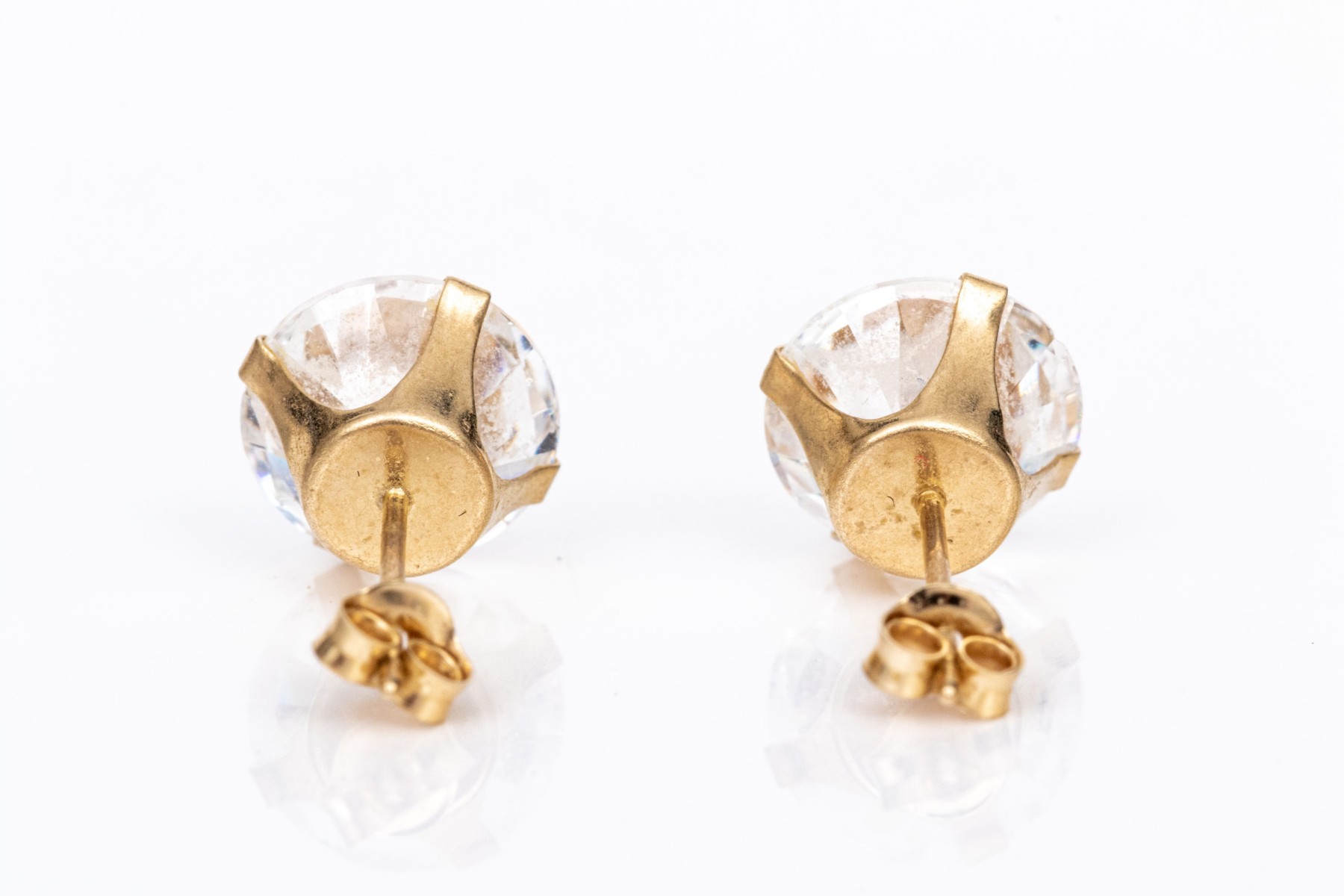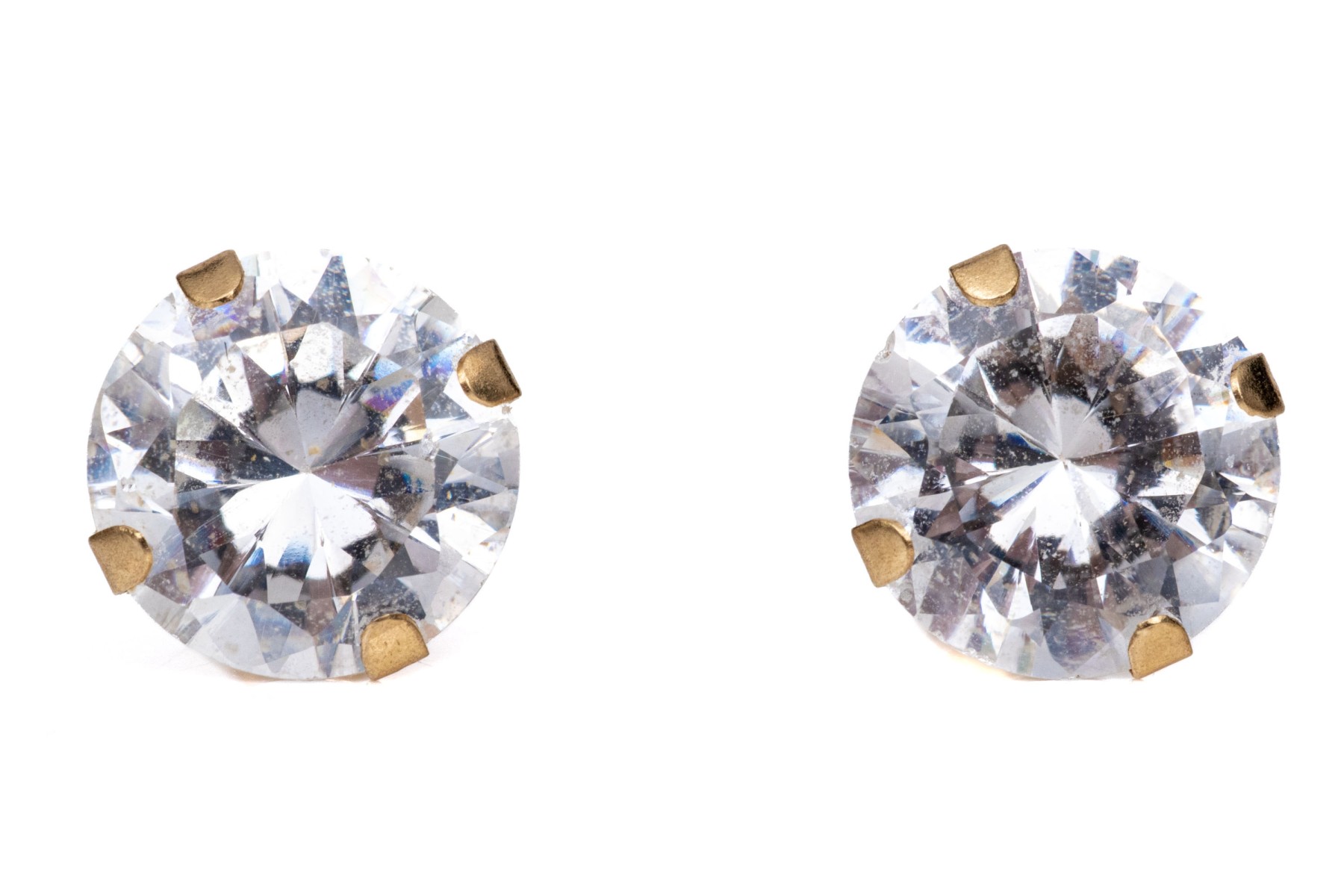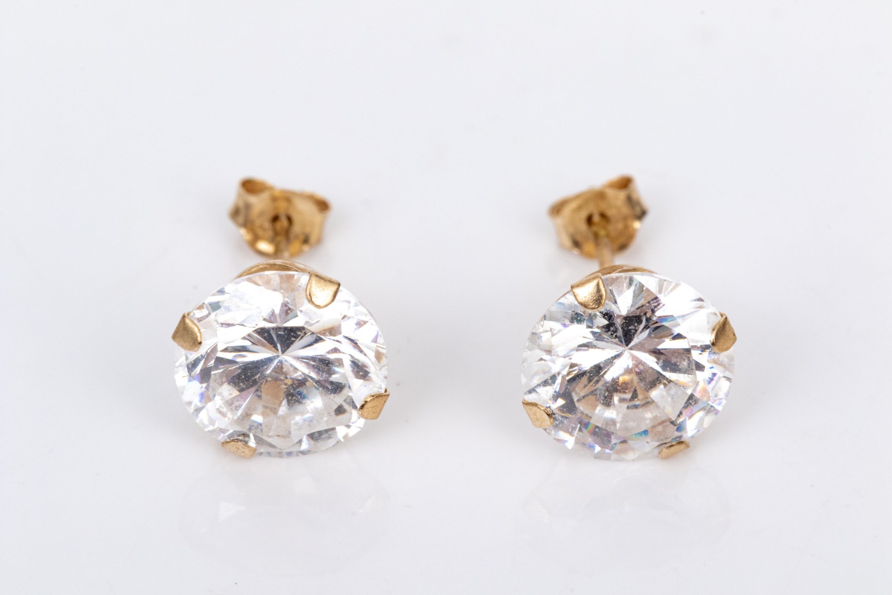 14k yellow gold 8mm CZ solitaire stud earrings. These classic stud earrings are set with four prongs are are finished with posts and clutch style backs