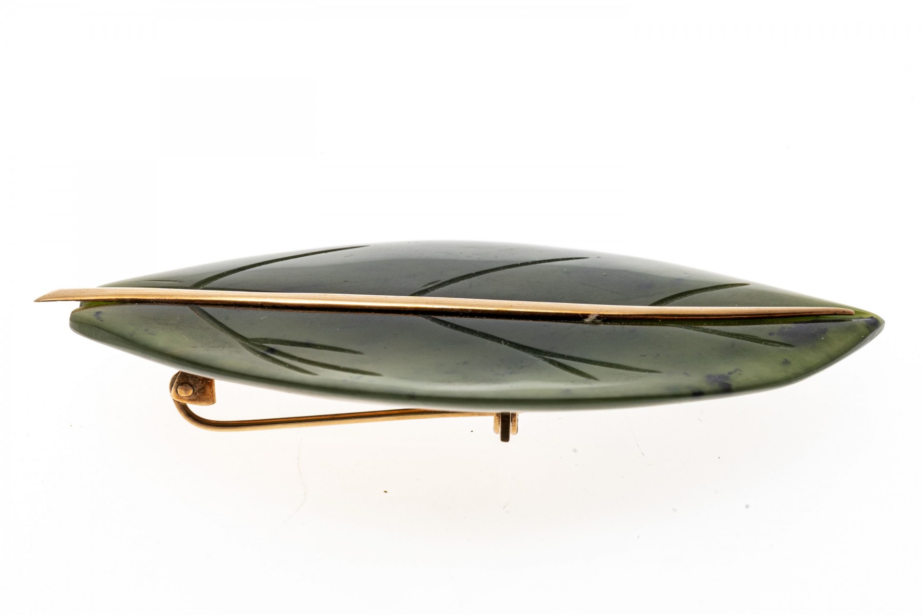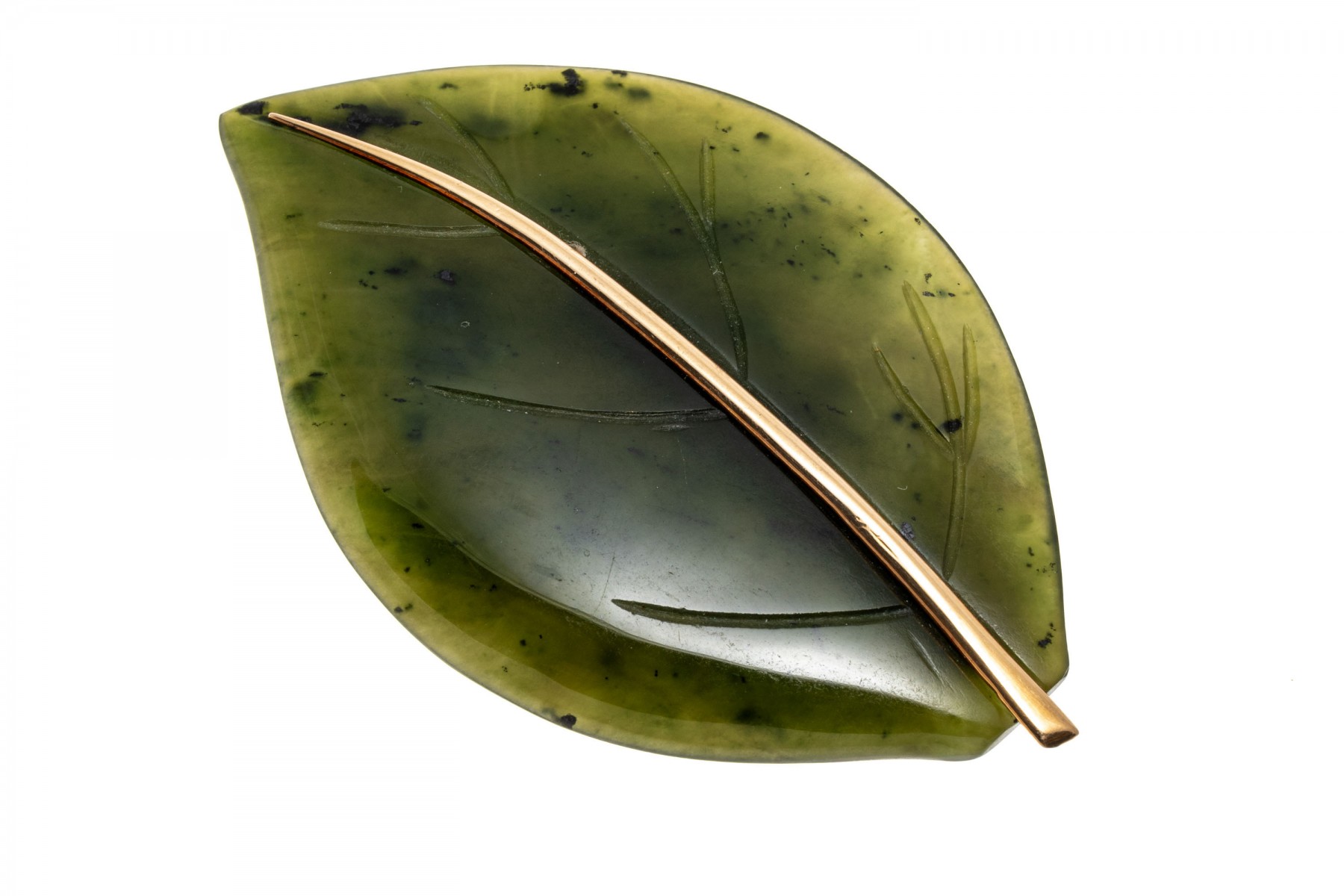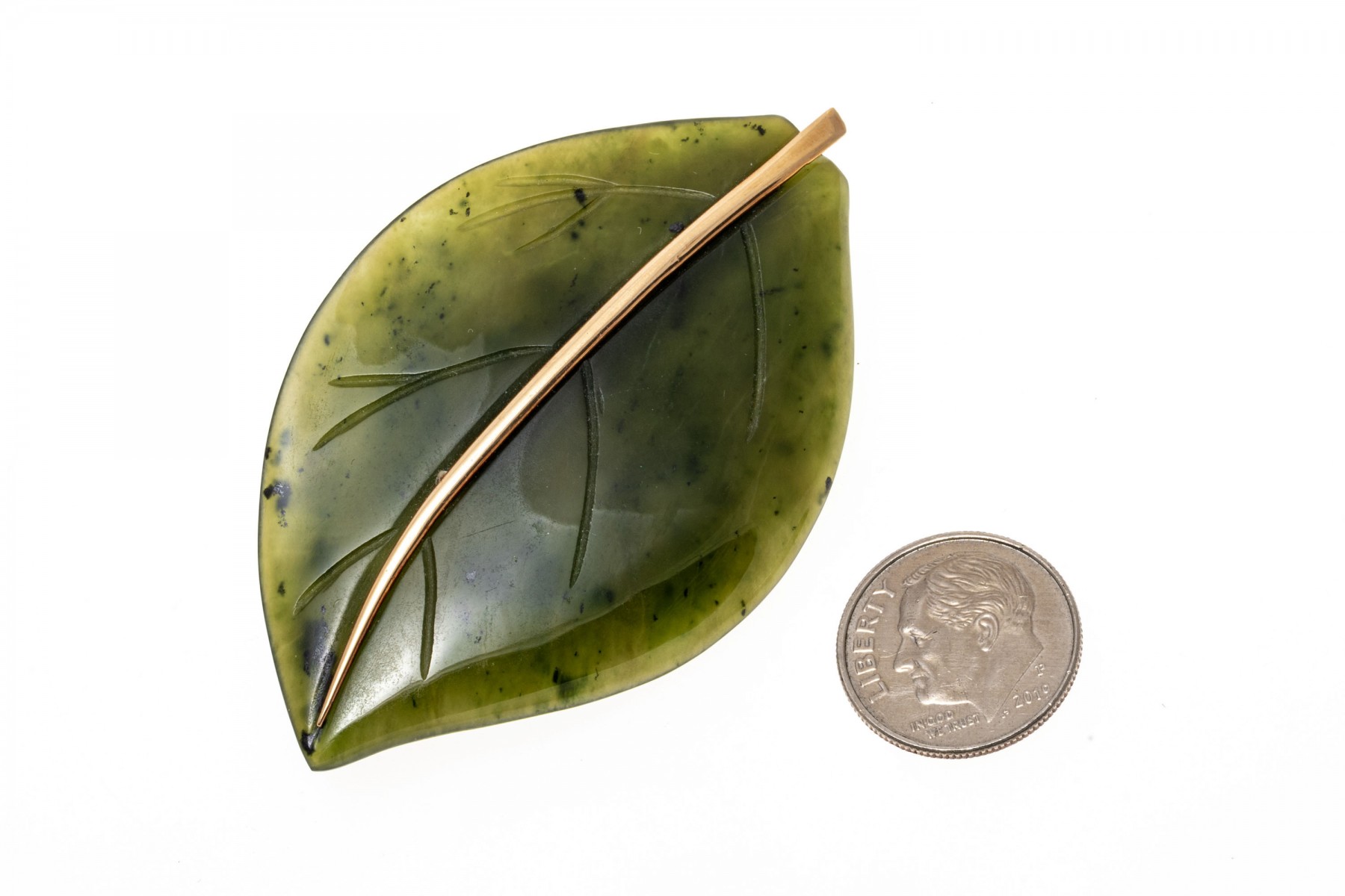 14k yellow gold and carved green nephrite jade lovely leaf motif brooch, decorated with a yellow gold center vein