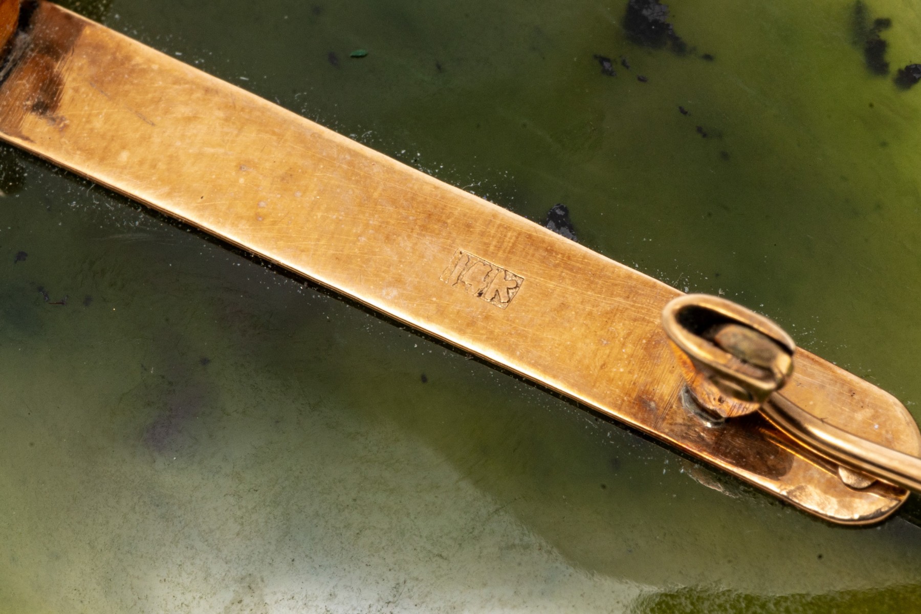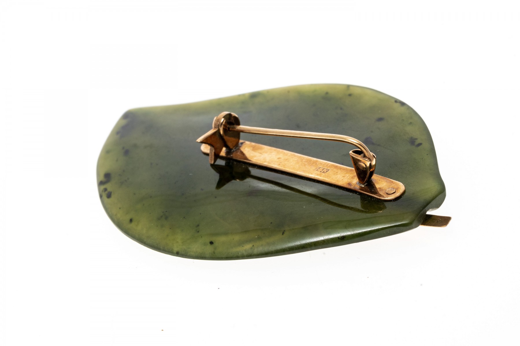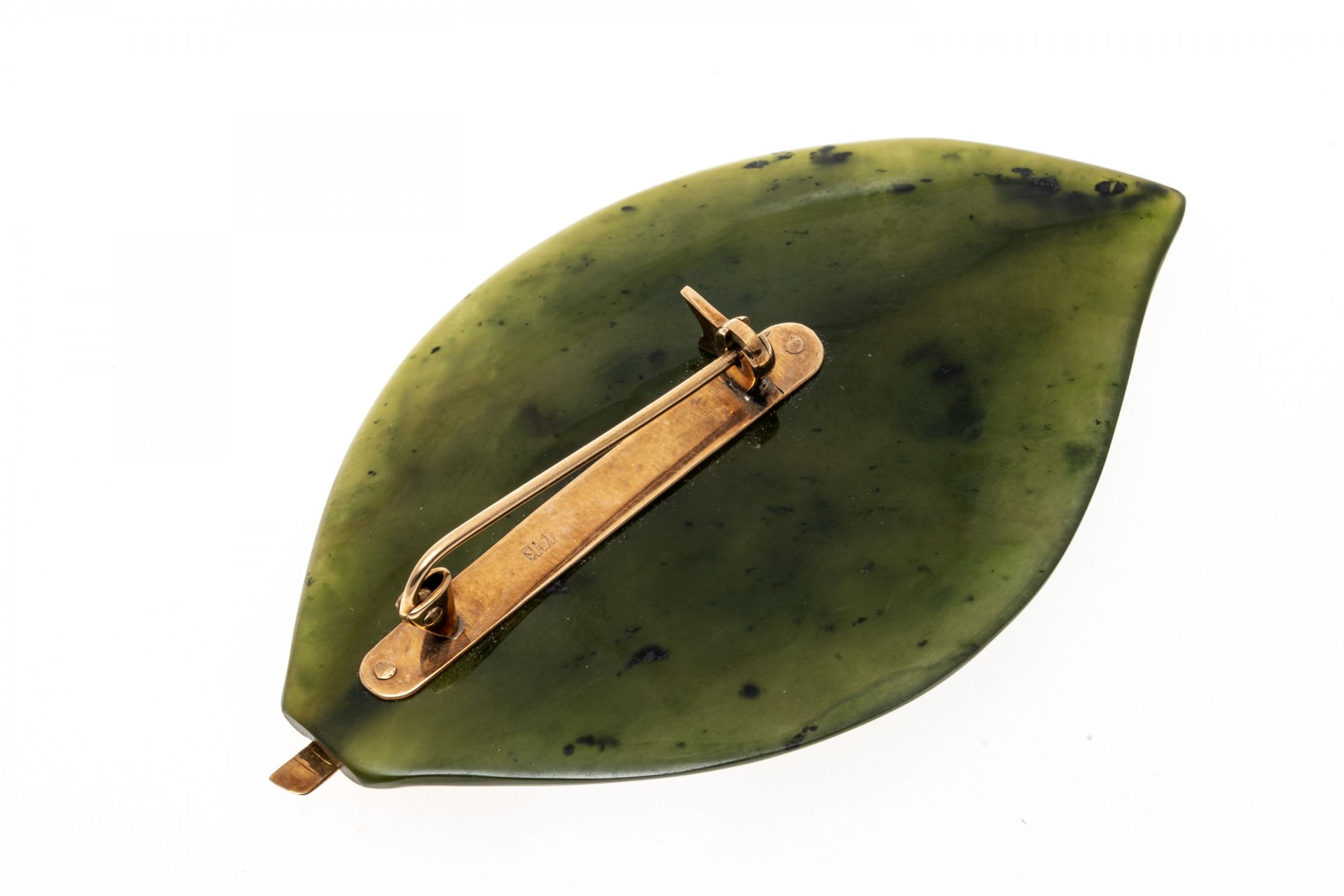 14k yellow gold and carved green nephrite jade lovely leaf motif brooch, decorated with a yellow gold center vein