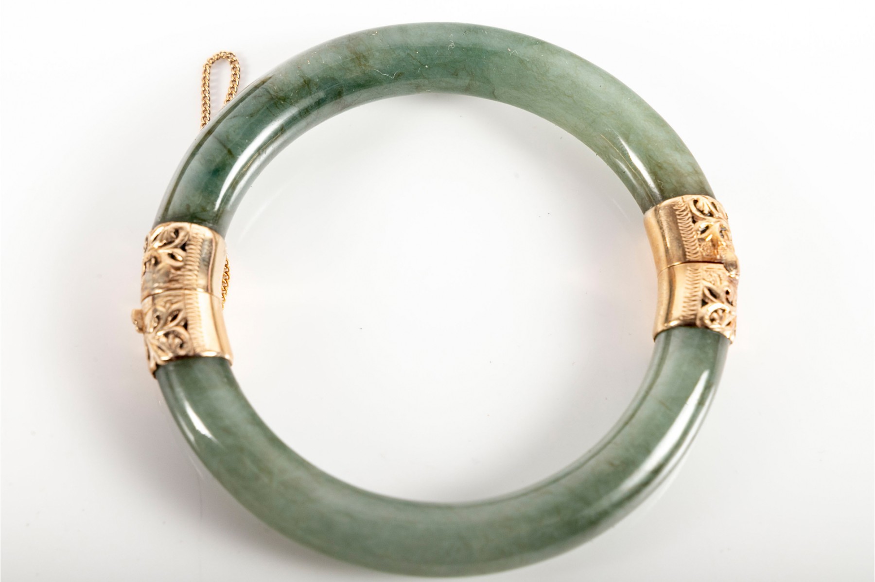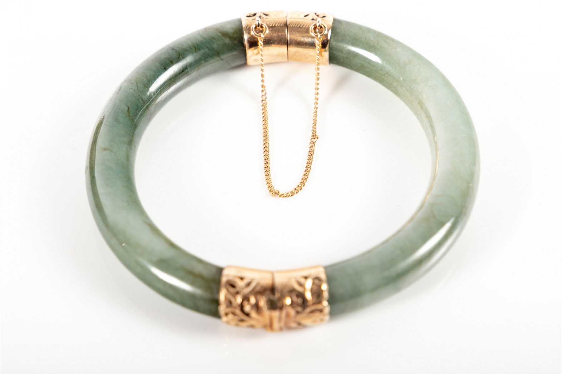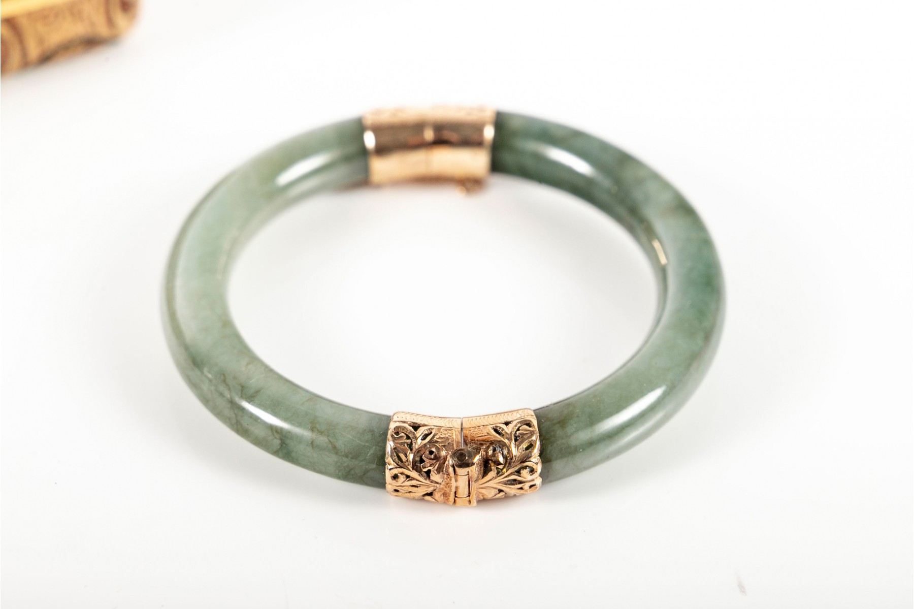 A beautiful mossy green jade bracelet with elegant yellow gold openwork at the clasp and hinge, displaying foliate scrolls and etched borders. Accompanied by a Ming's gilt jacquard display box.