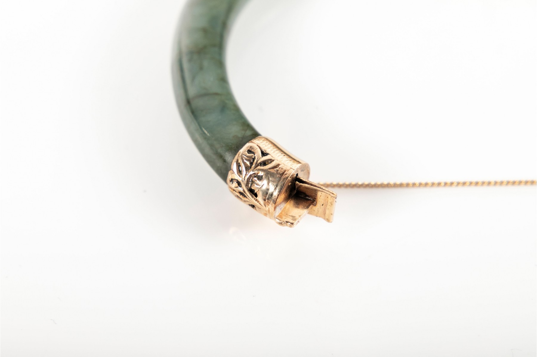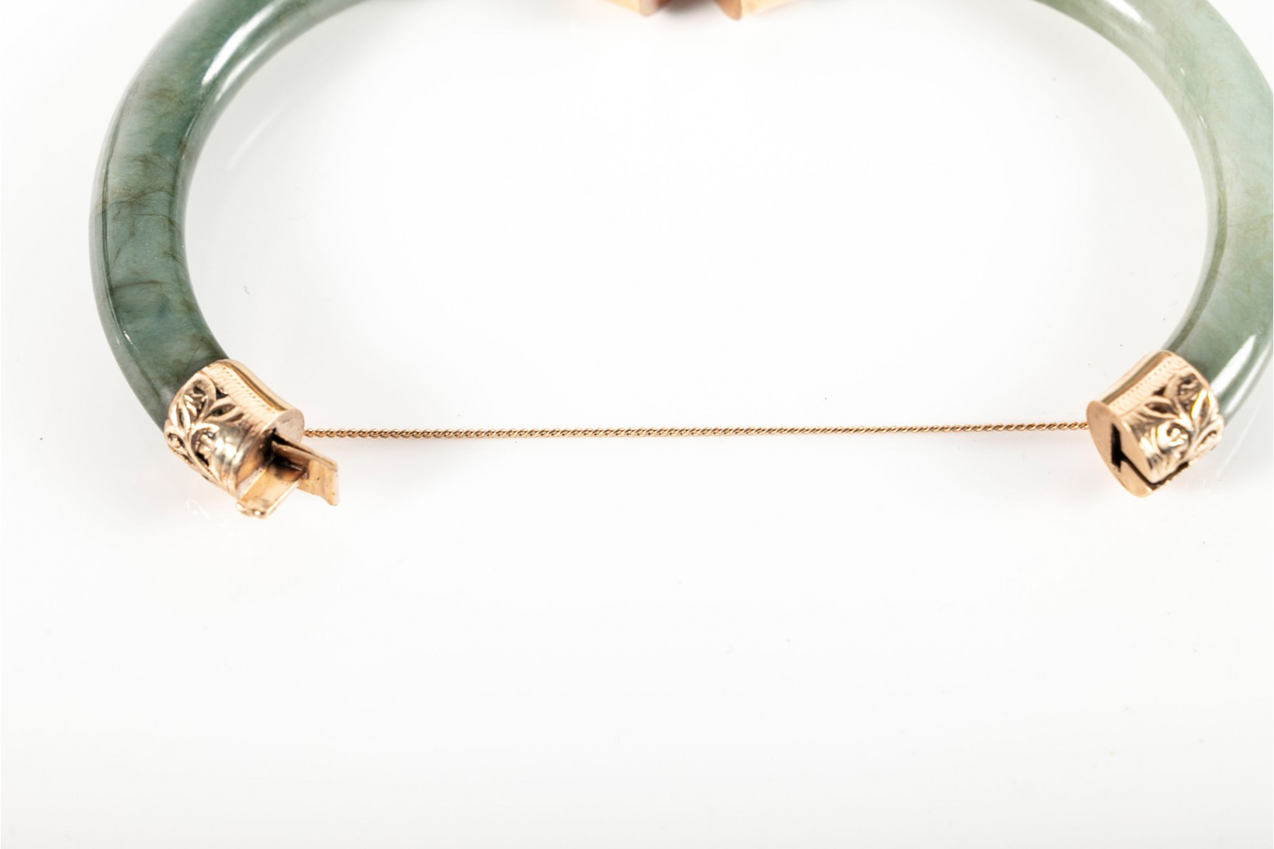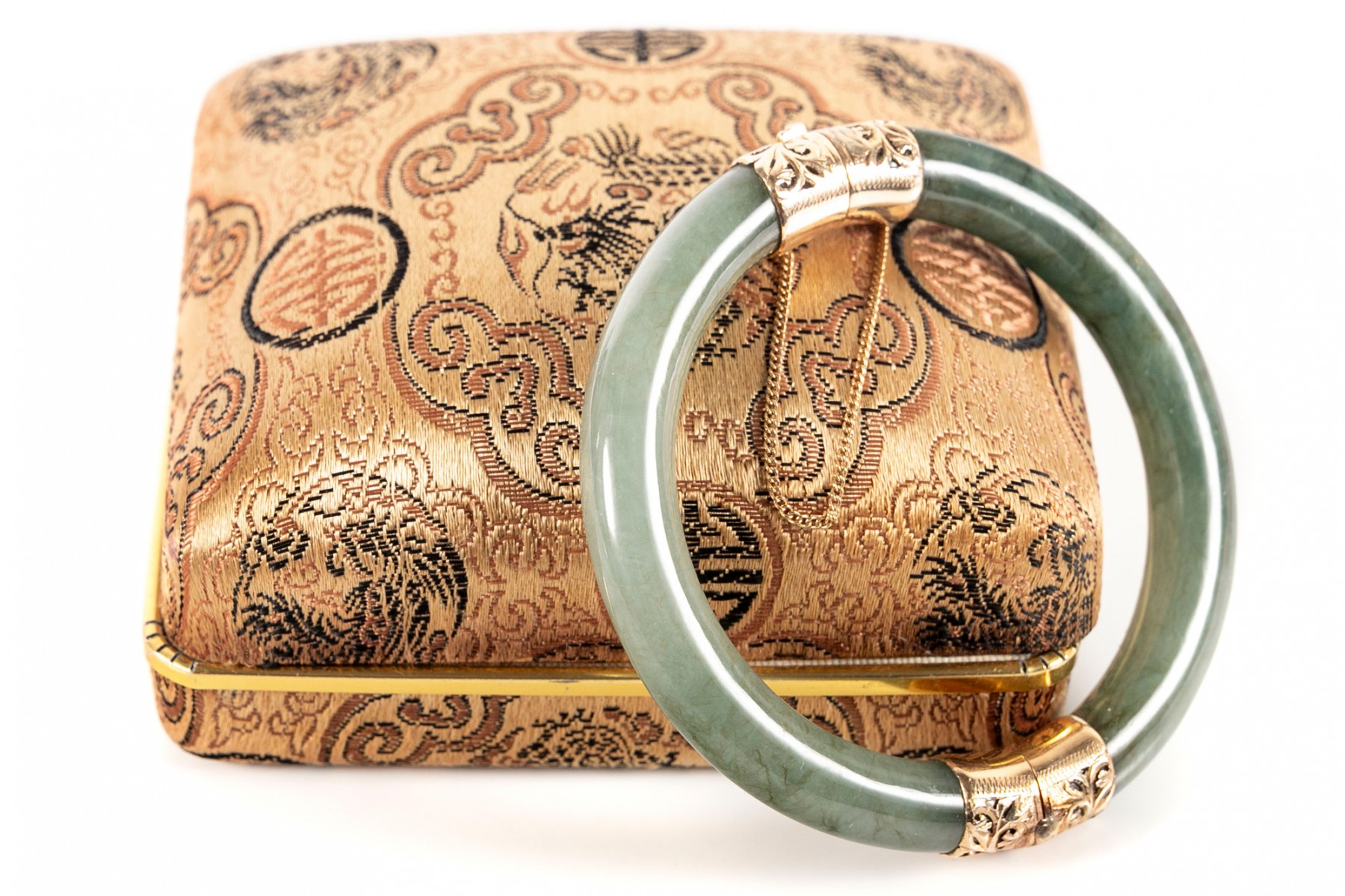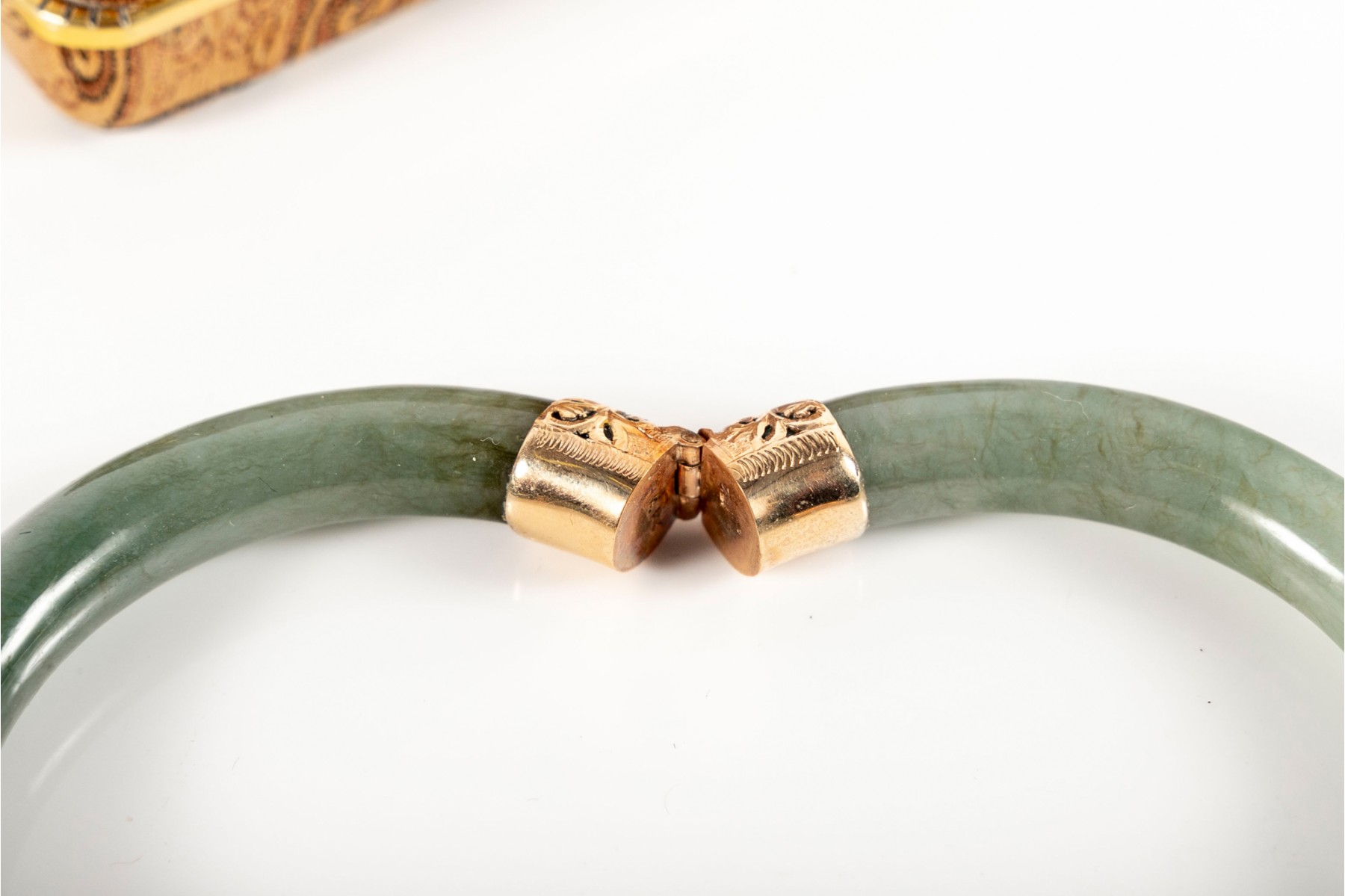 A beautiful mossy green jade bracelet with elegant yellow gold openwork at the clasp and hinge, displaying foliate scrolls and etched borders. Accompanied by a Ming's gilt jacquard display box.