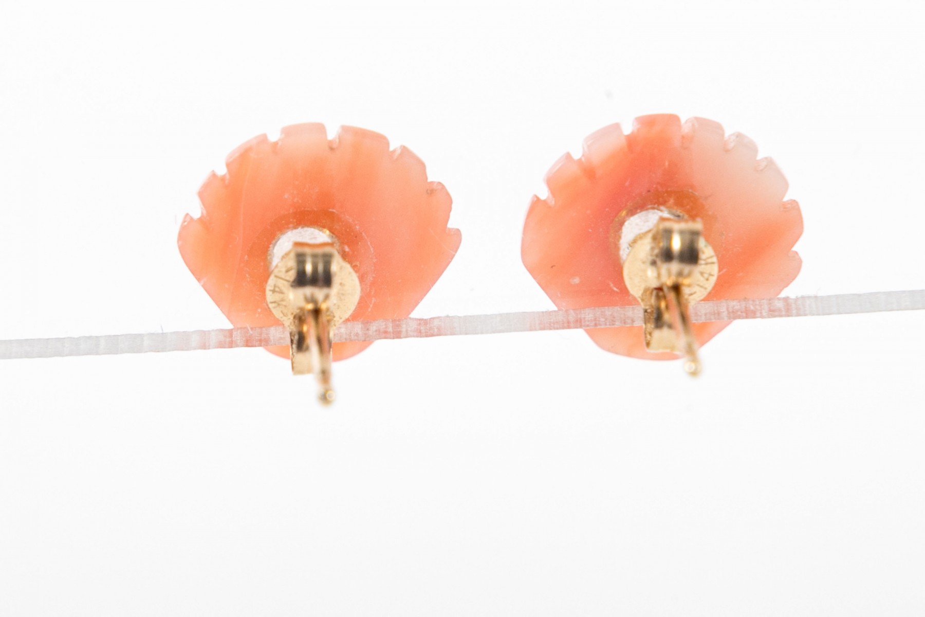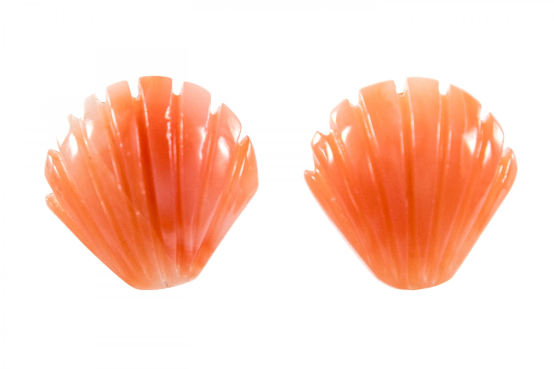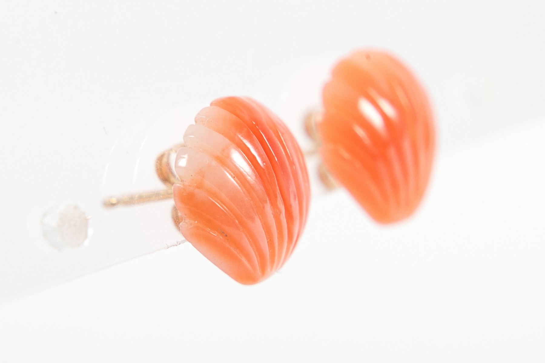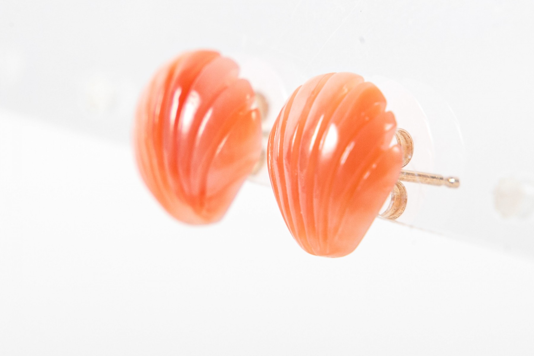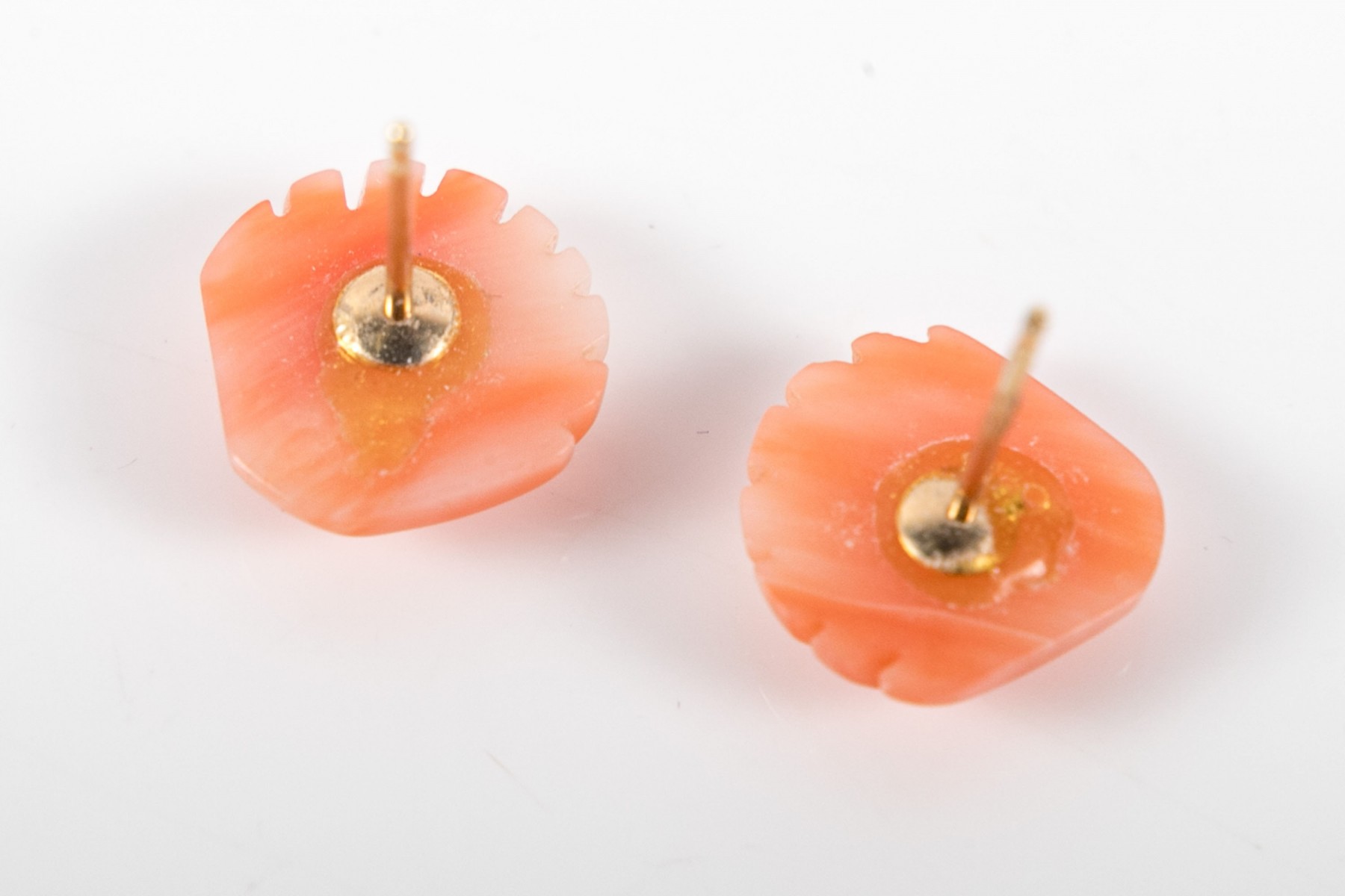 A wonderful pair of yellow gold studs displaying shell-shaped carved coral in mottled salmon pink and white.