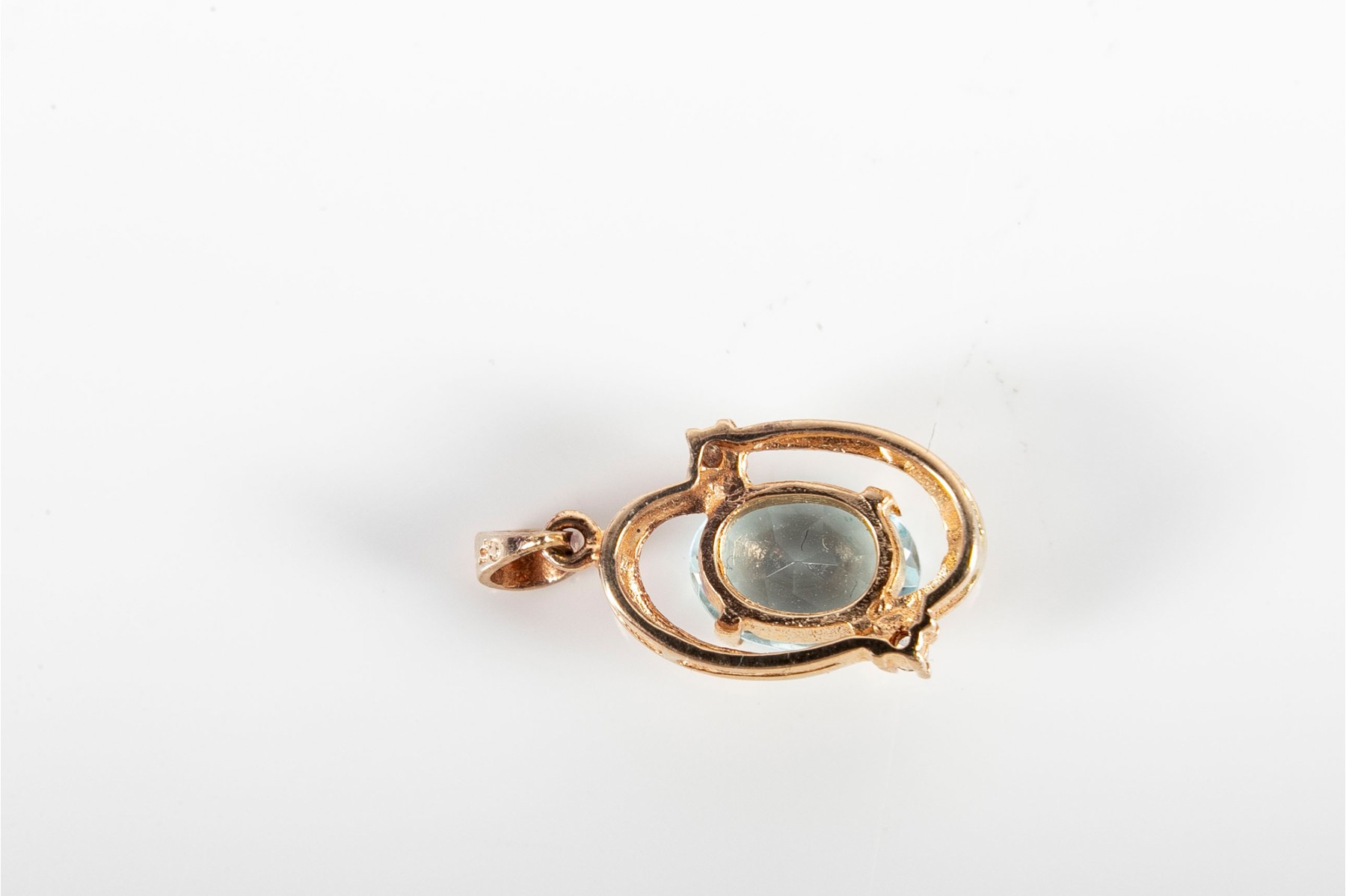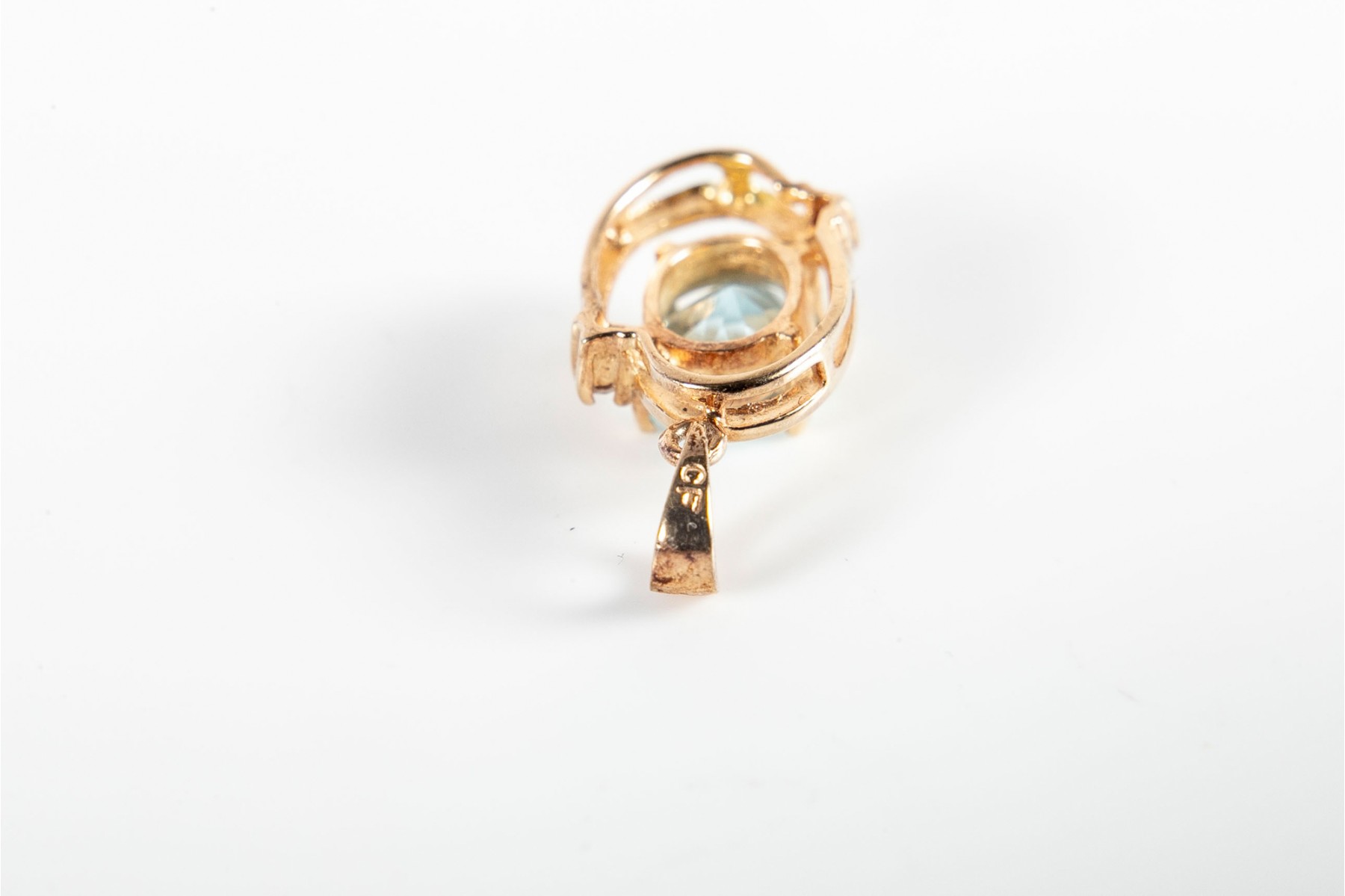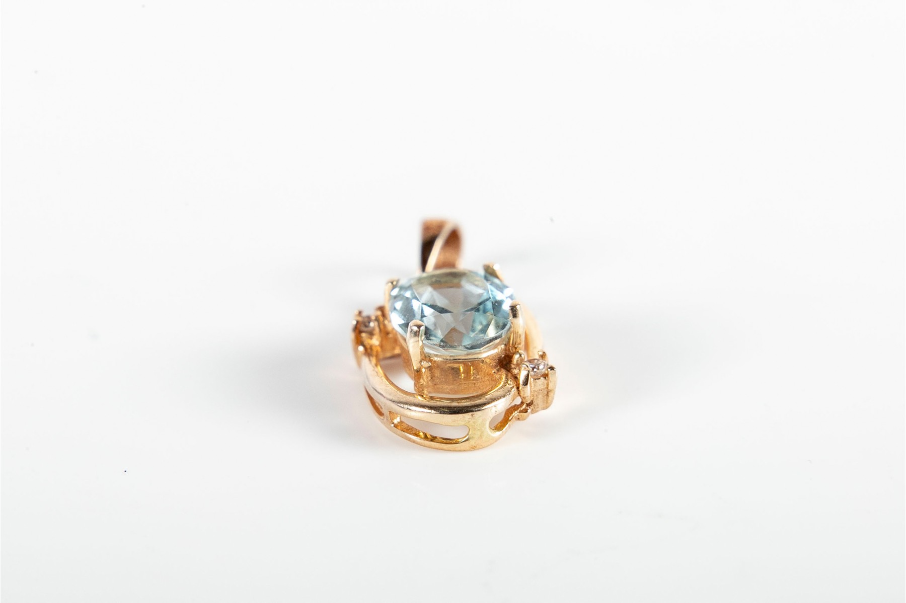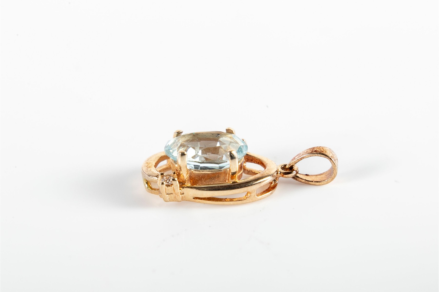 A beautiful yellow gold pendant displaying an oval pale blue aquamarine surrounded by an asymmetrical swooping halo with two round diamond accents, finished with a triangular bail.