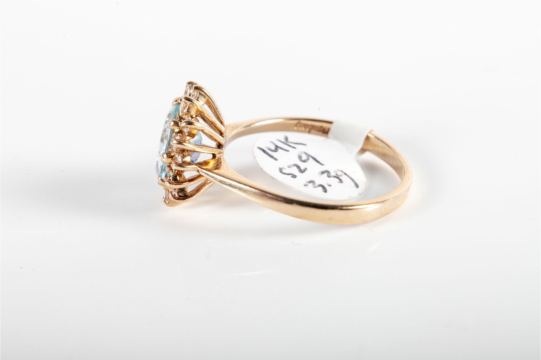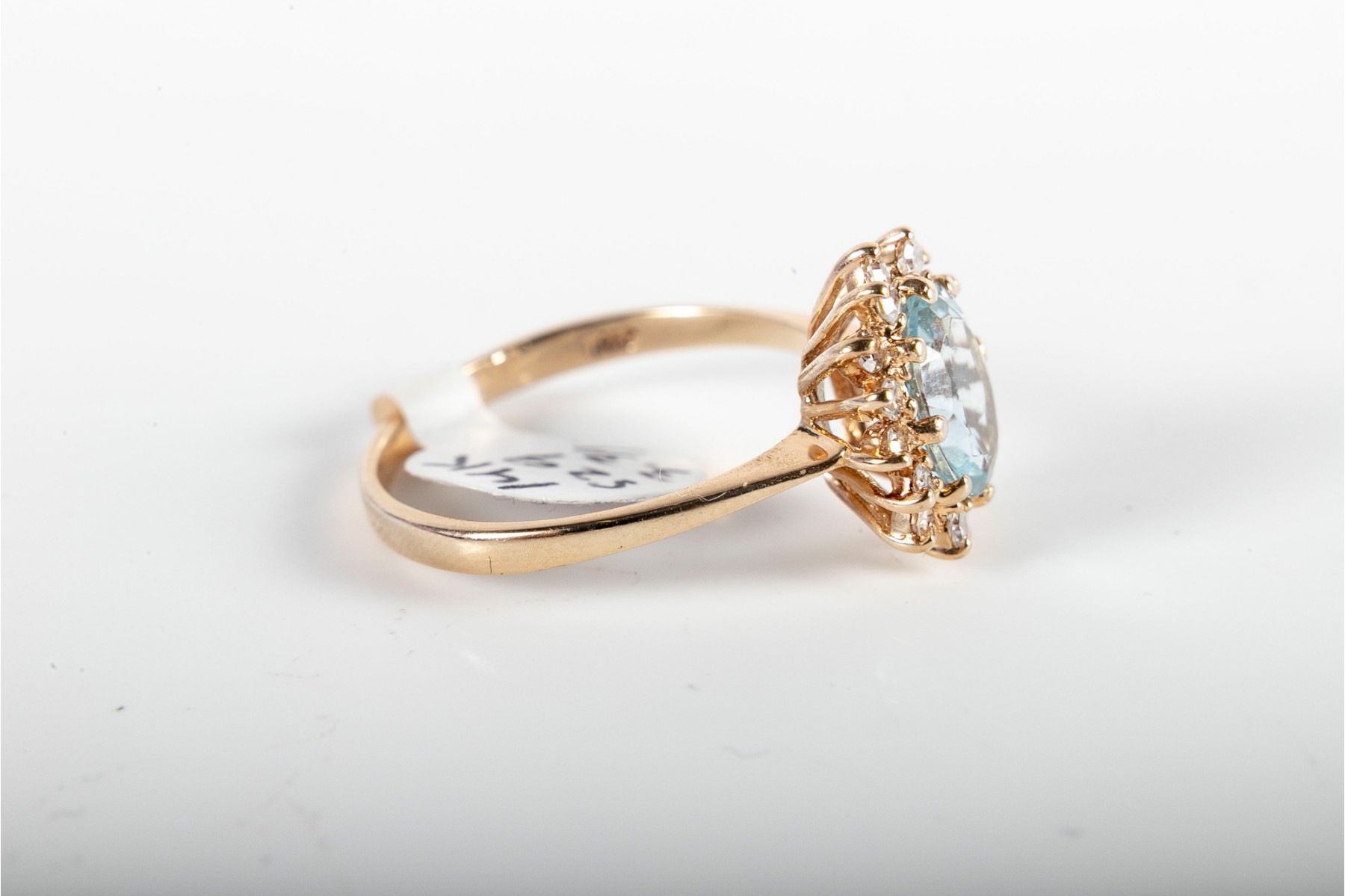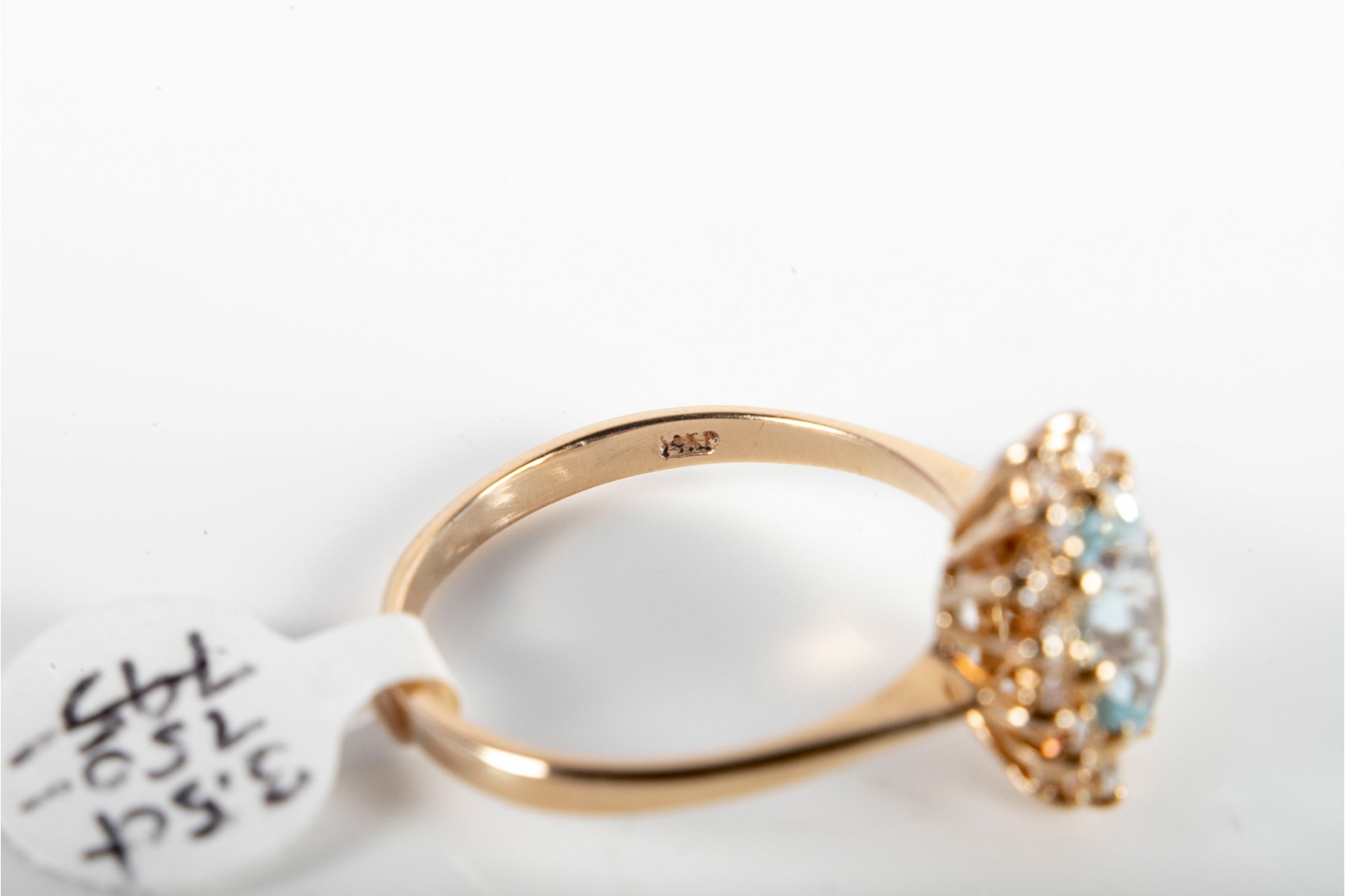 An elegant yellow gold ring displaying an oval pale blue aquamarine surrounded by white moissanite.