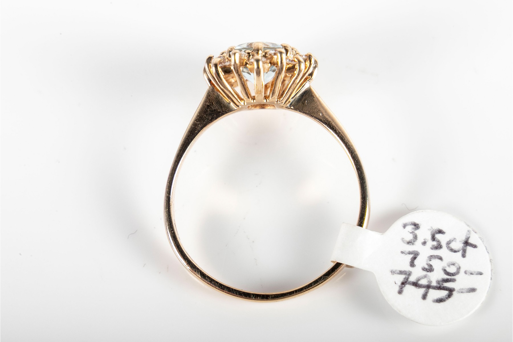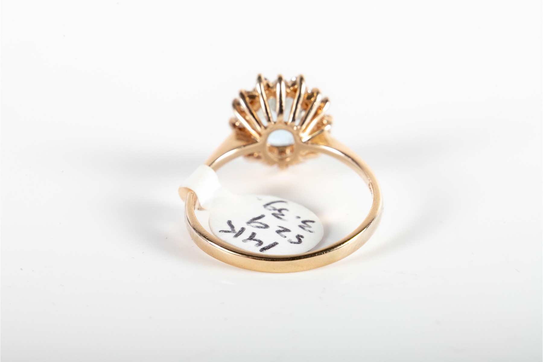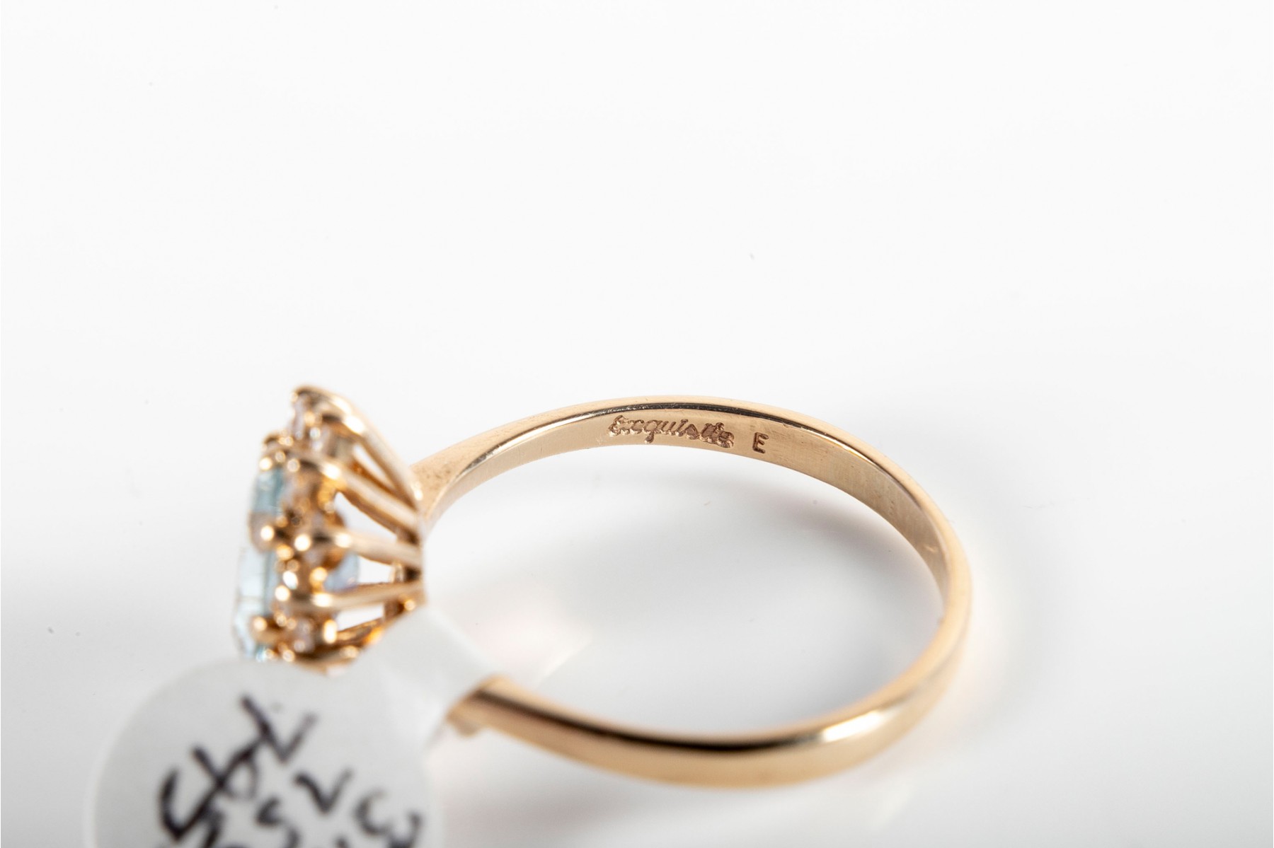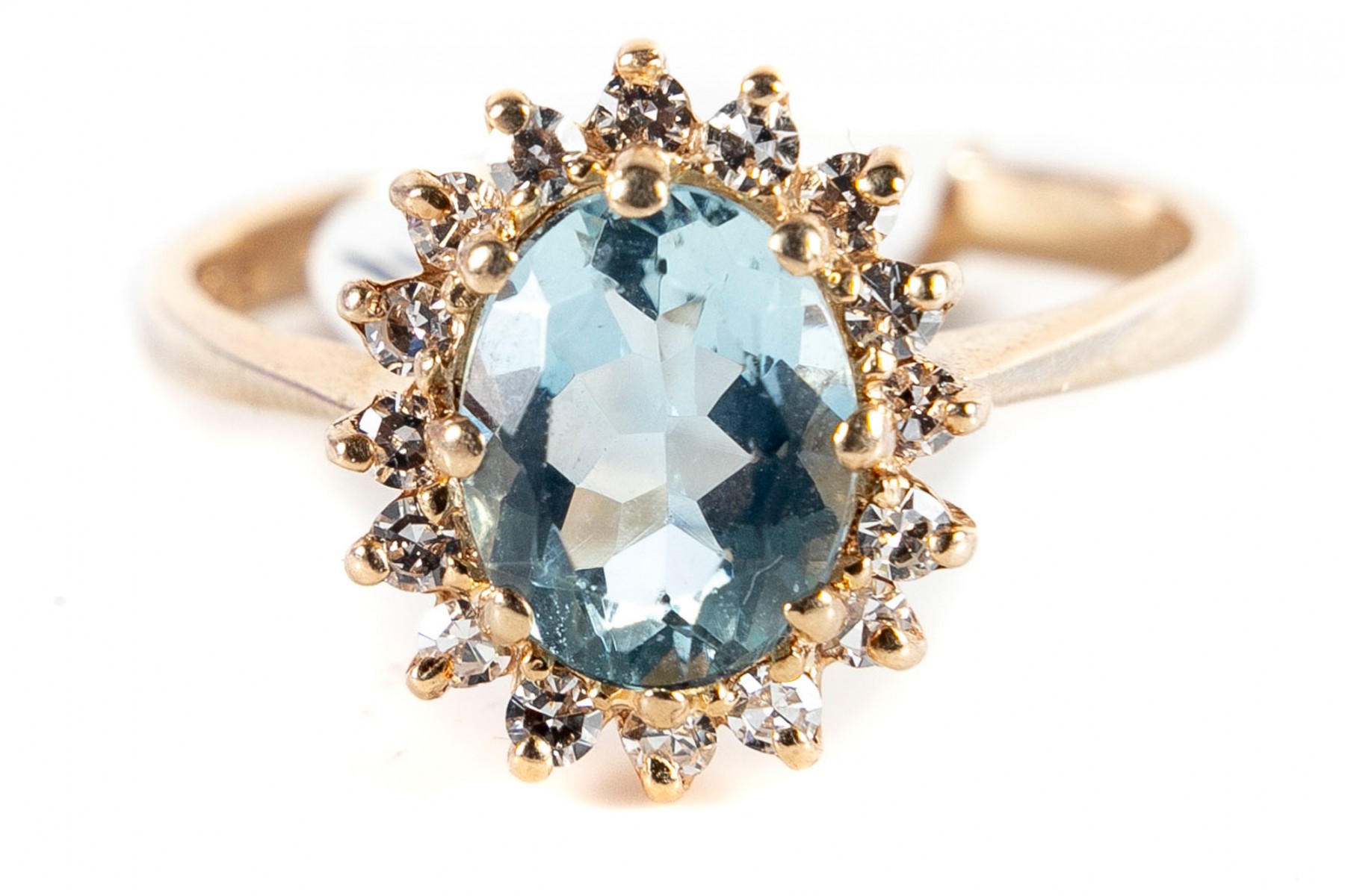 An elegant yellow gold ring displaying an oval pale blue aquamarine surrounded by white moissanite.