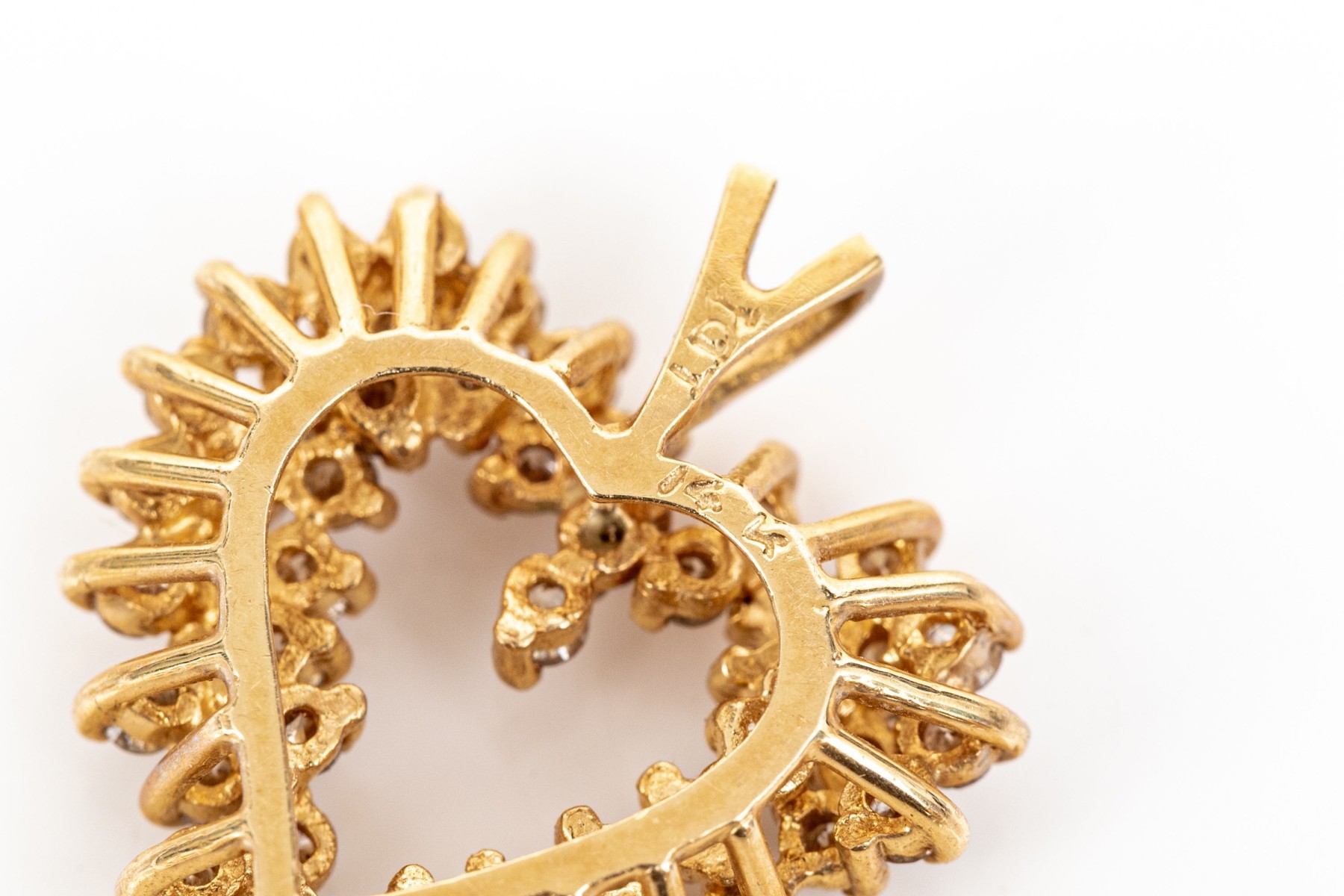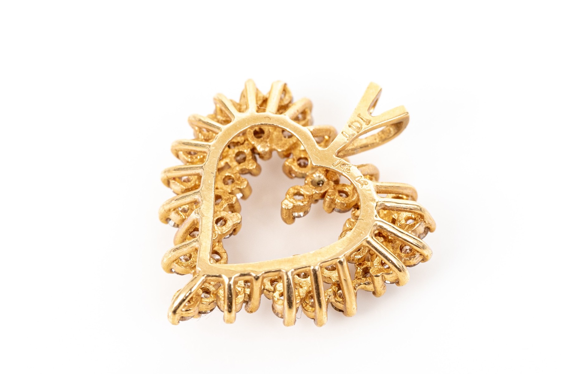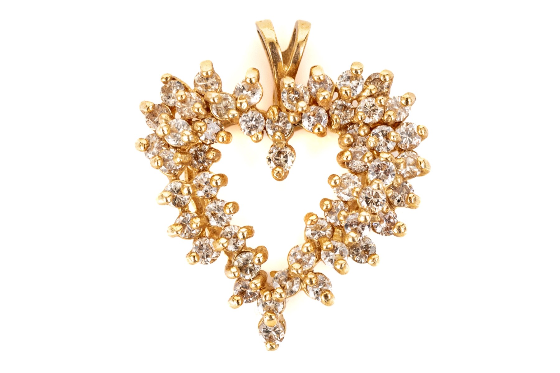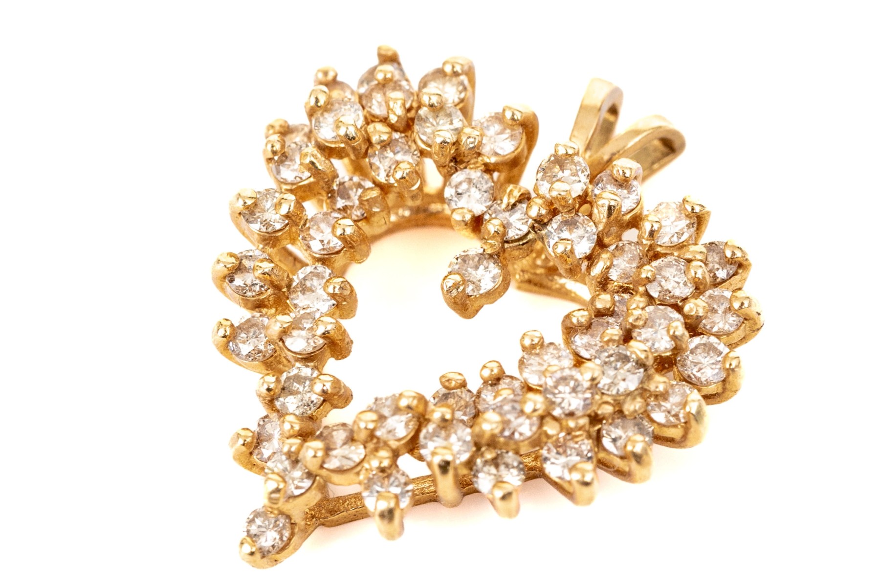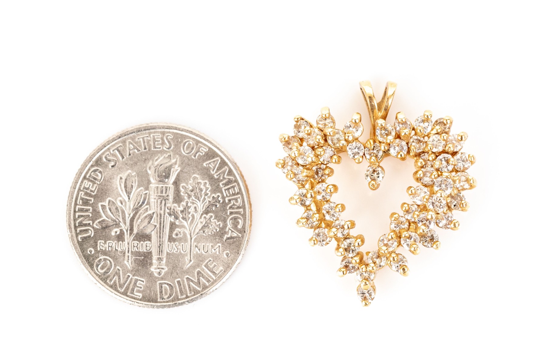 14k yellow gold asymmetrical diamond spray heart pendant, app.0.49 TCW, prong set, finished with a split bale. The diamonds are I1 clarity, L to M color