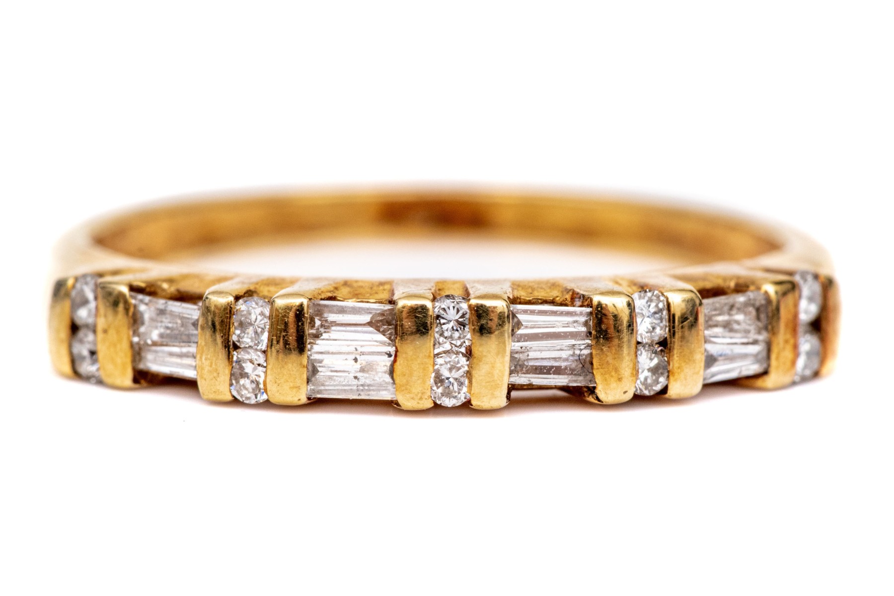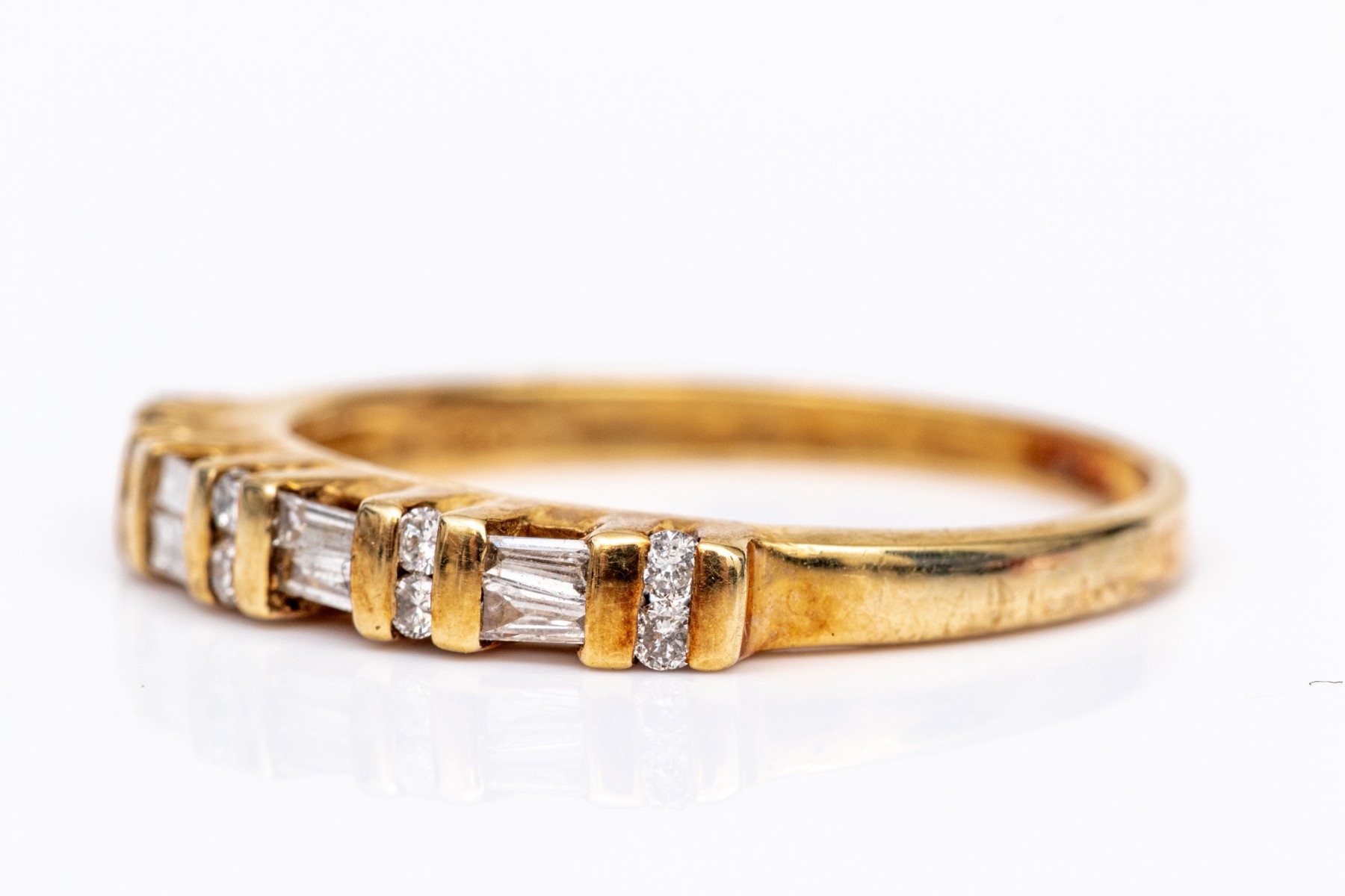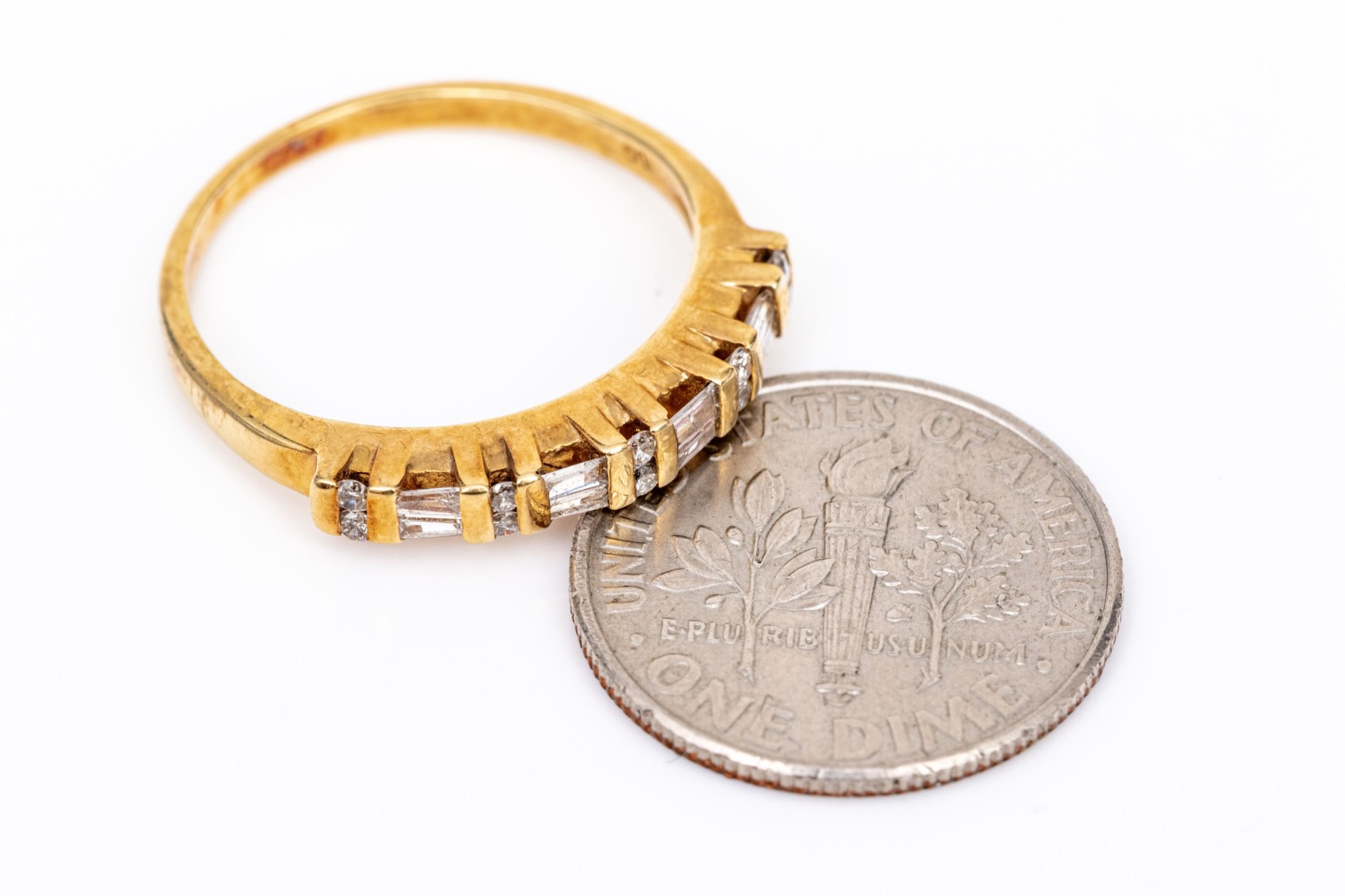 14k yellow gold baguette and round diamond bar set ring, app. 0.18 TCW, size 6.25