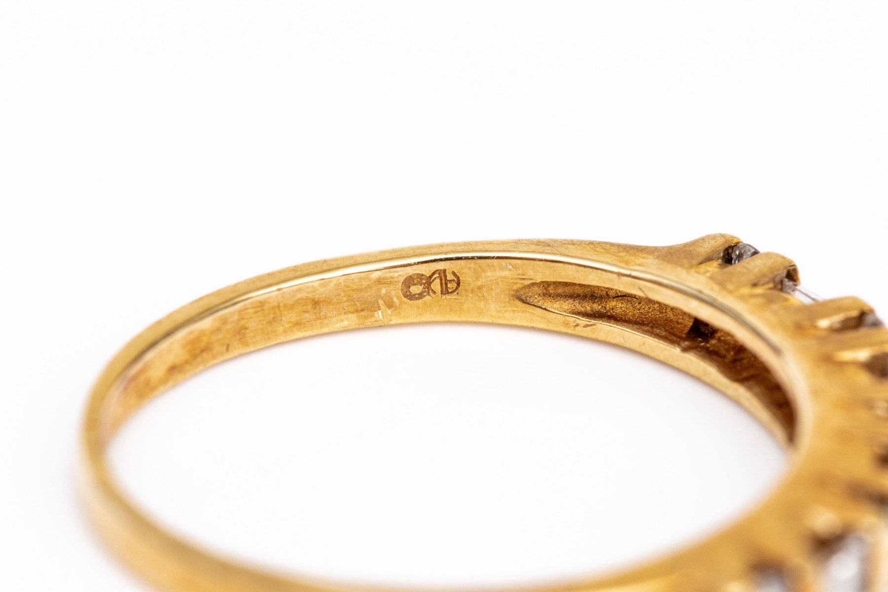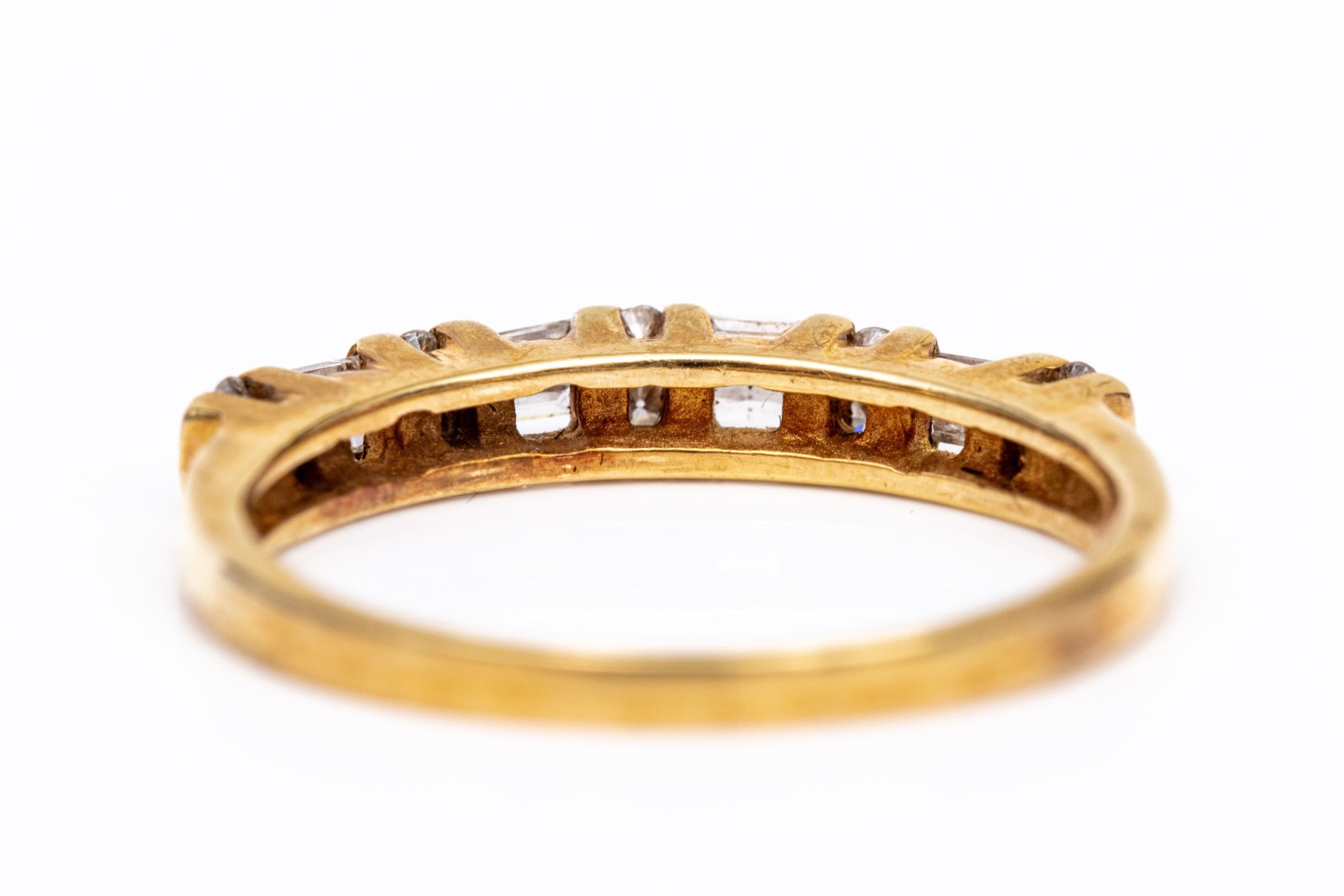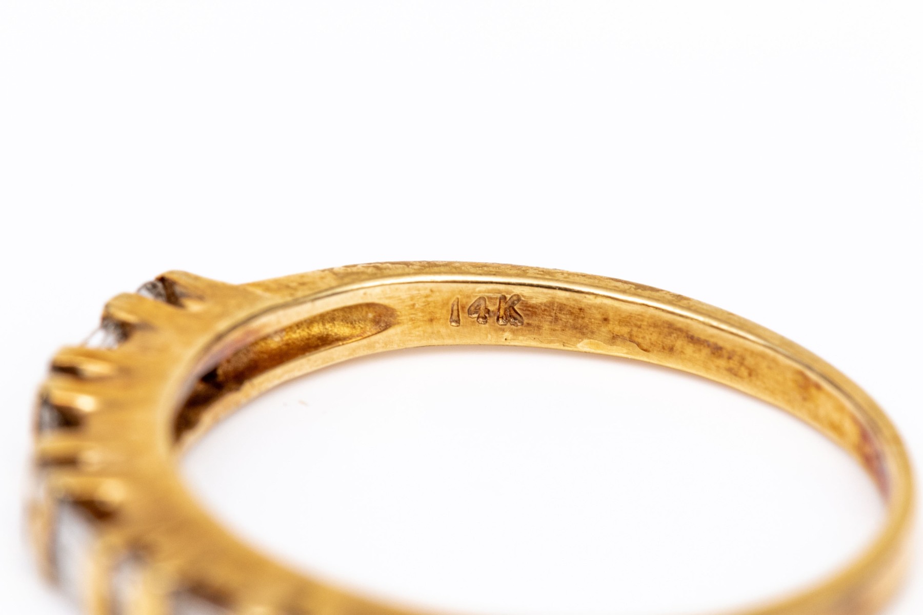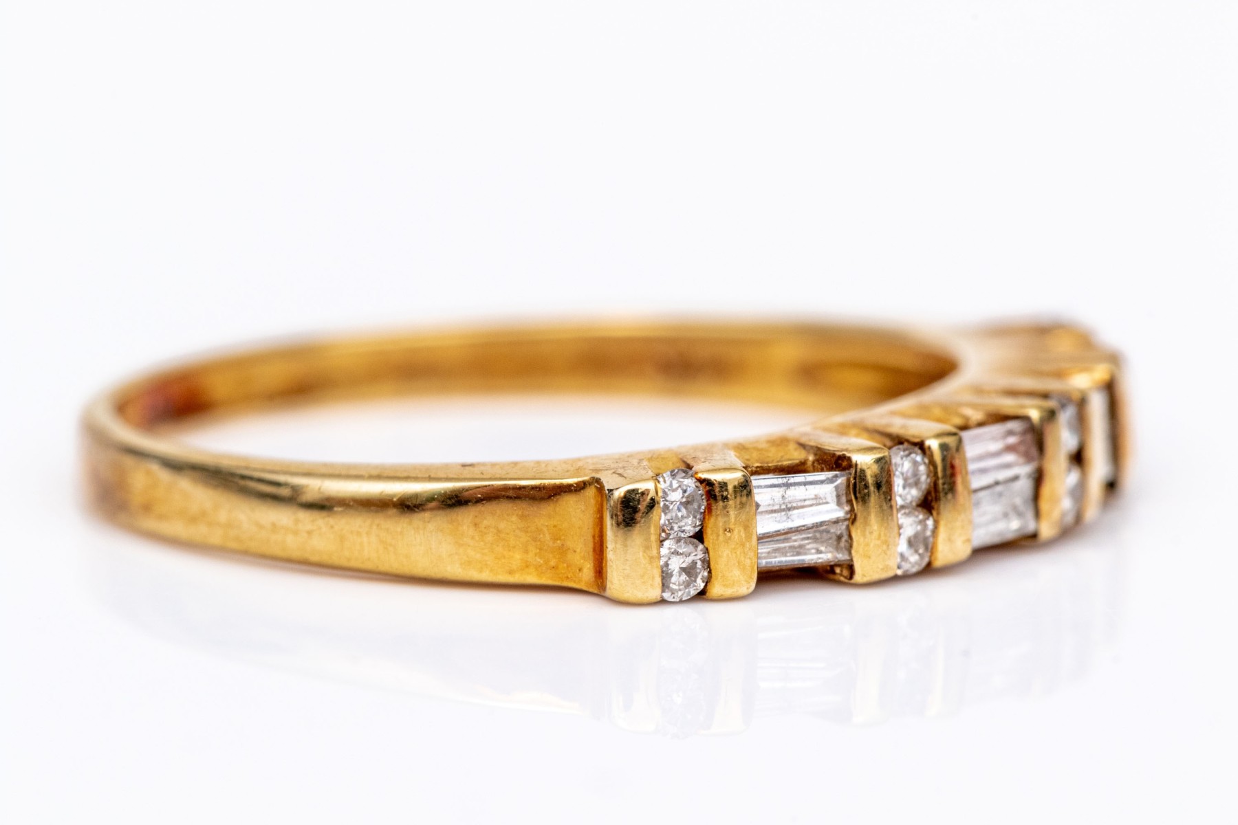 14k yellow gold baguette and round diamond bar set ring, app. 0.18 TCW, size 6.25