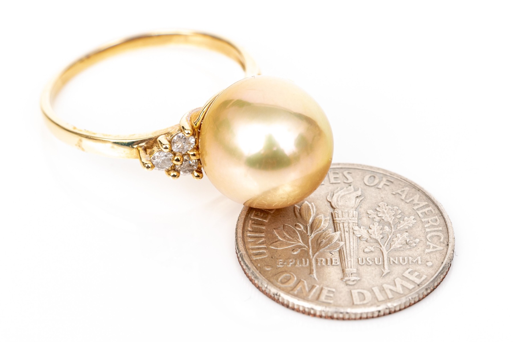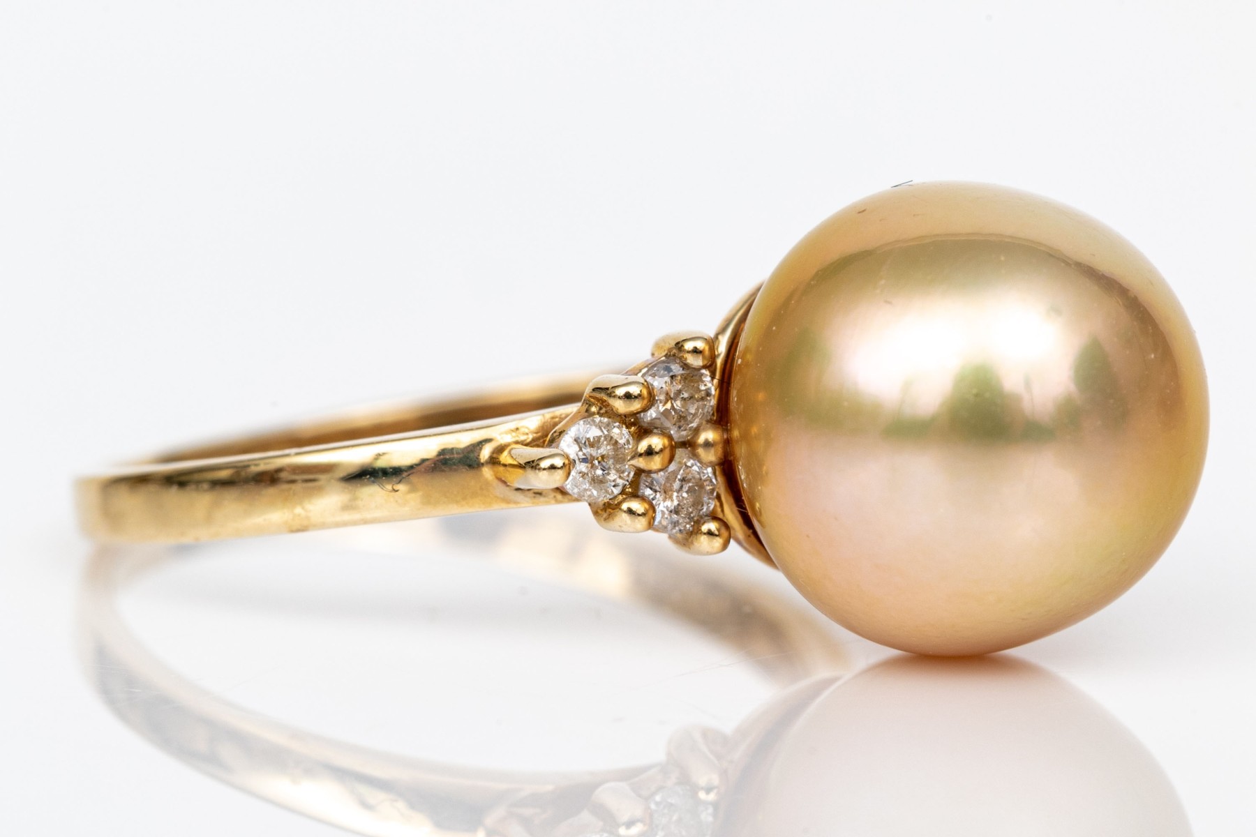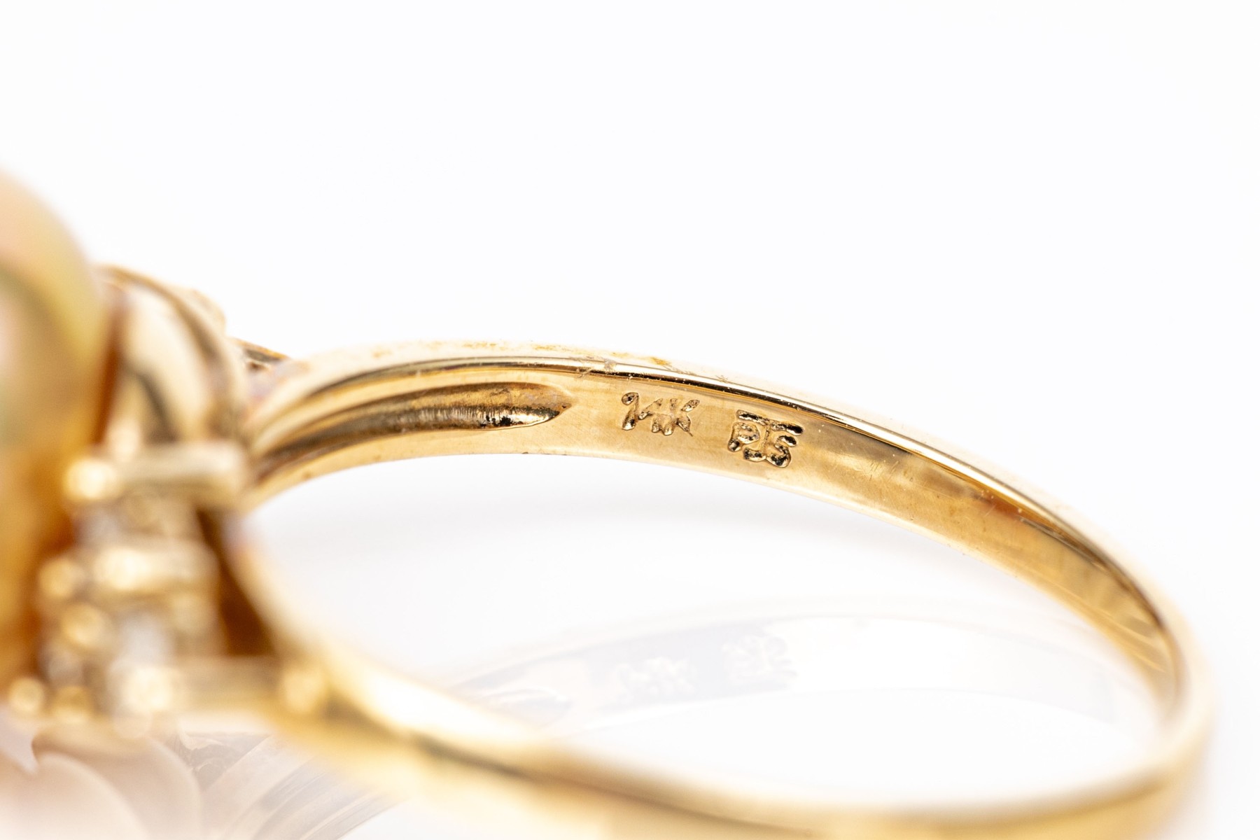 14k yellow gold beautiful 10mm champagne cultured pearl and diamond ring, size 6, app. 0.12TCW