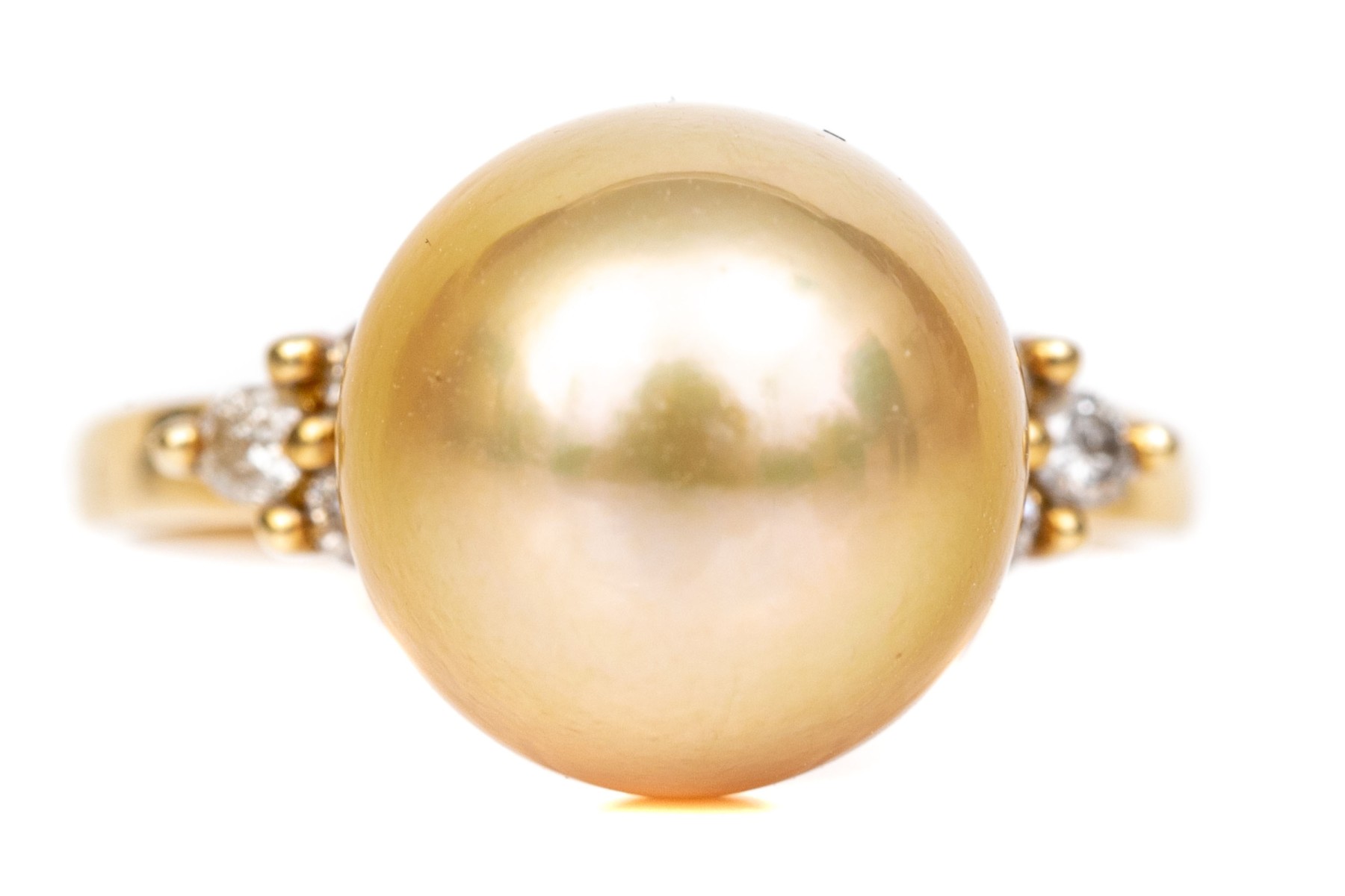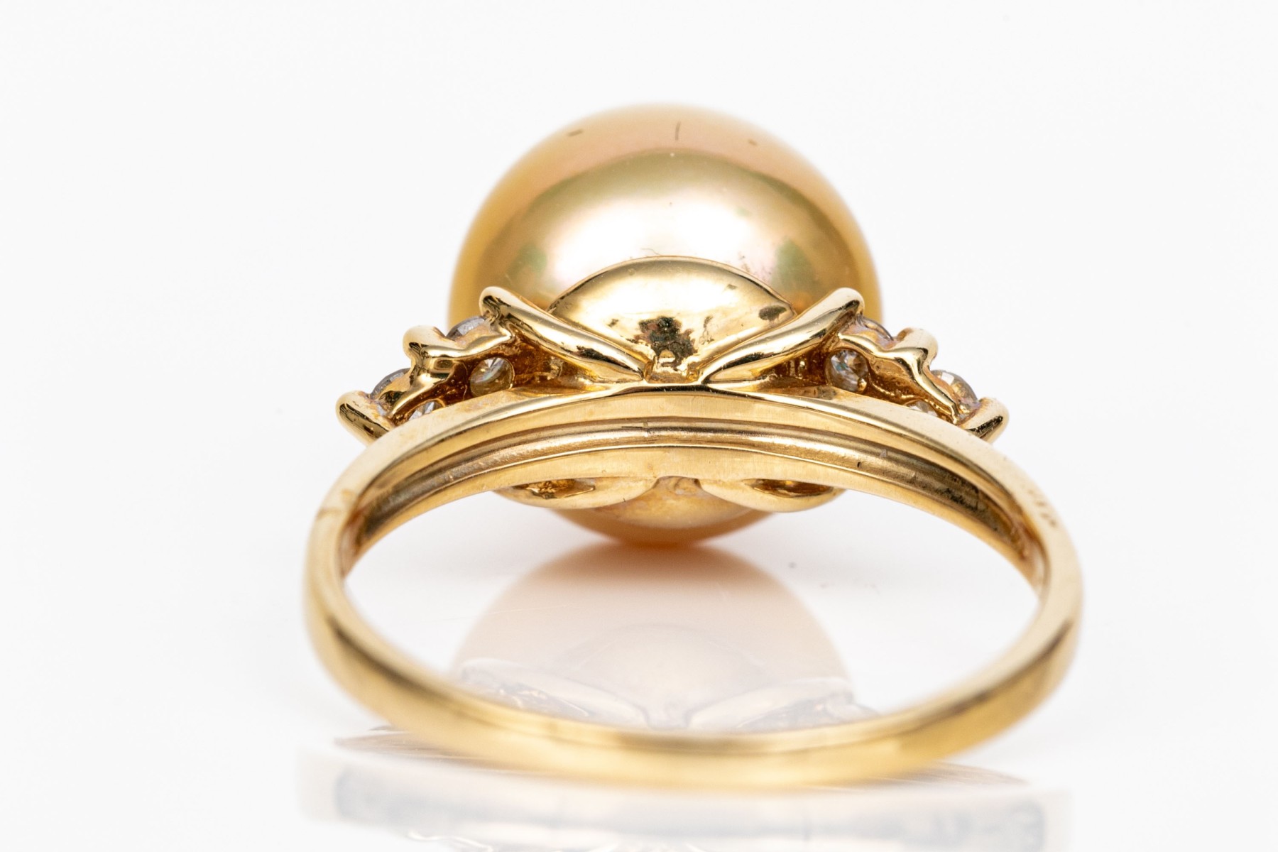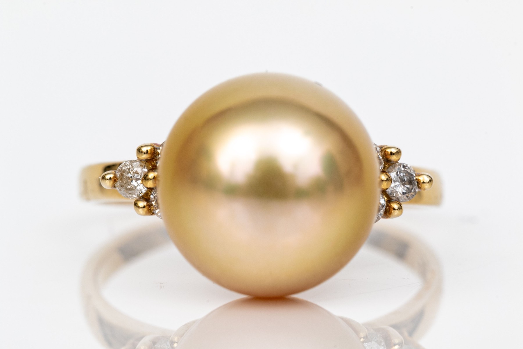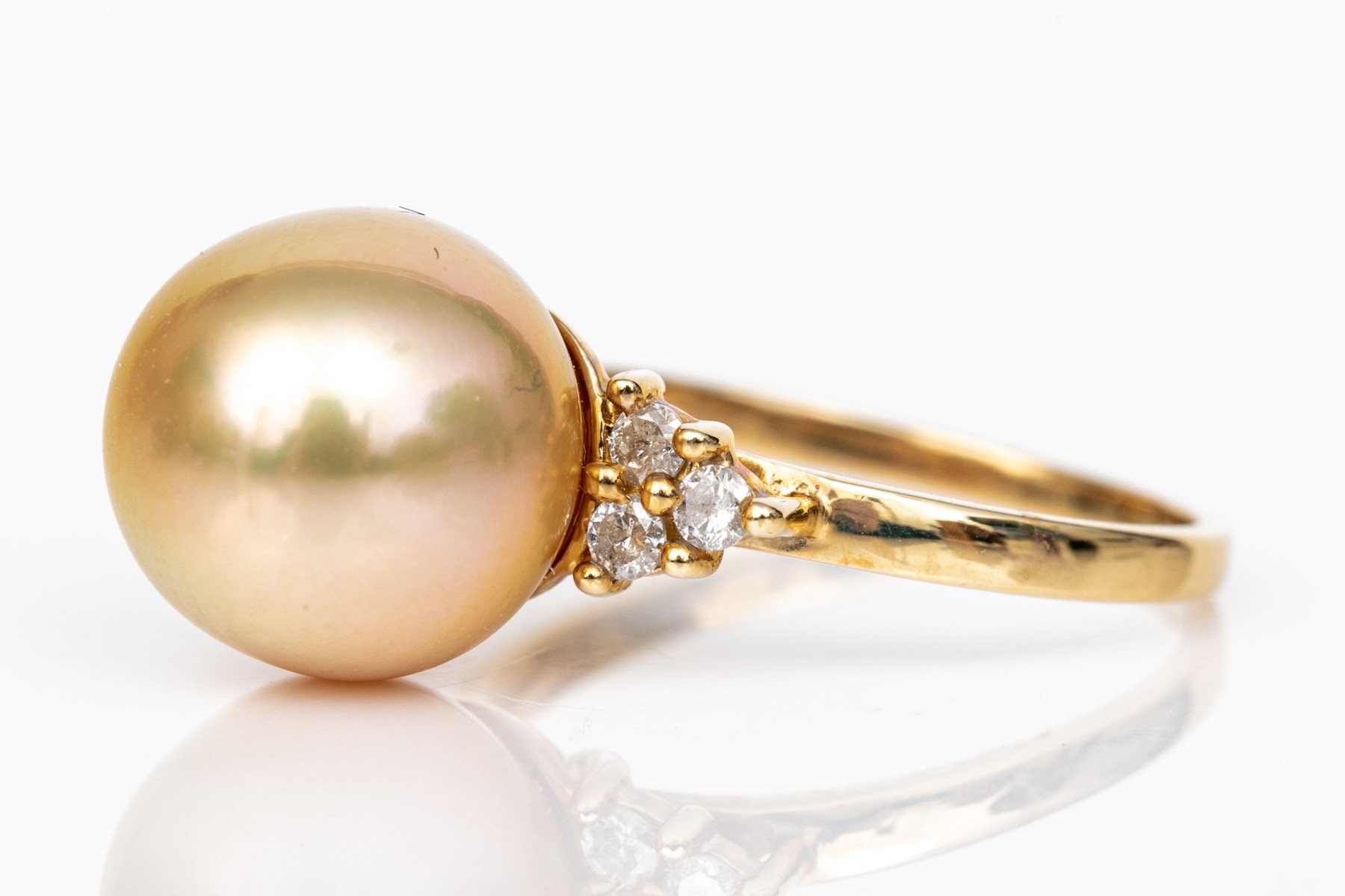 14k yellow gold beautiful 10mm champagne cultured pearl and diamond ring, size 6, app. 0.12TCW