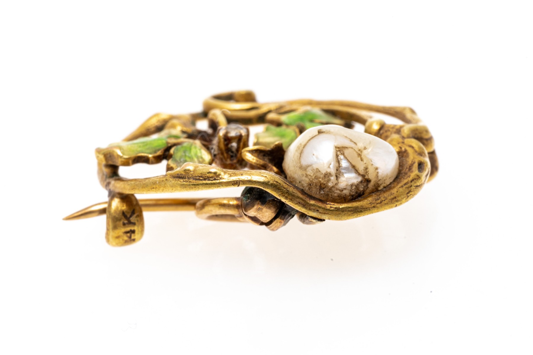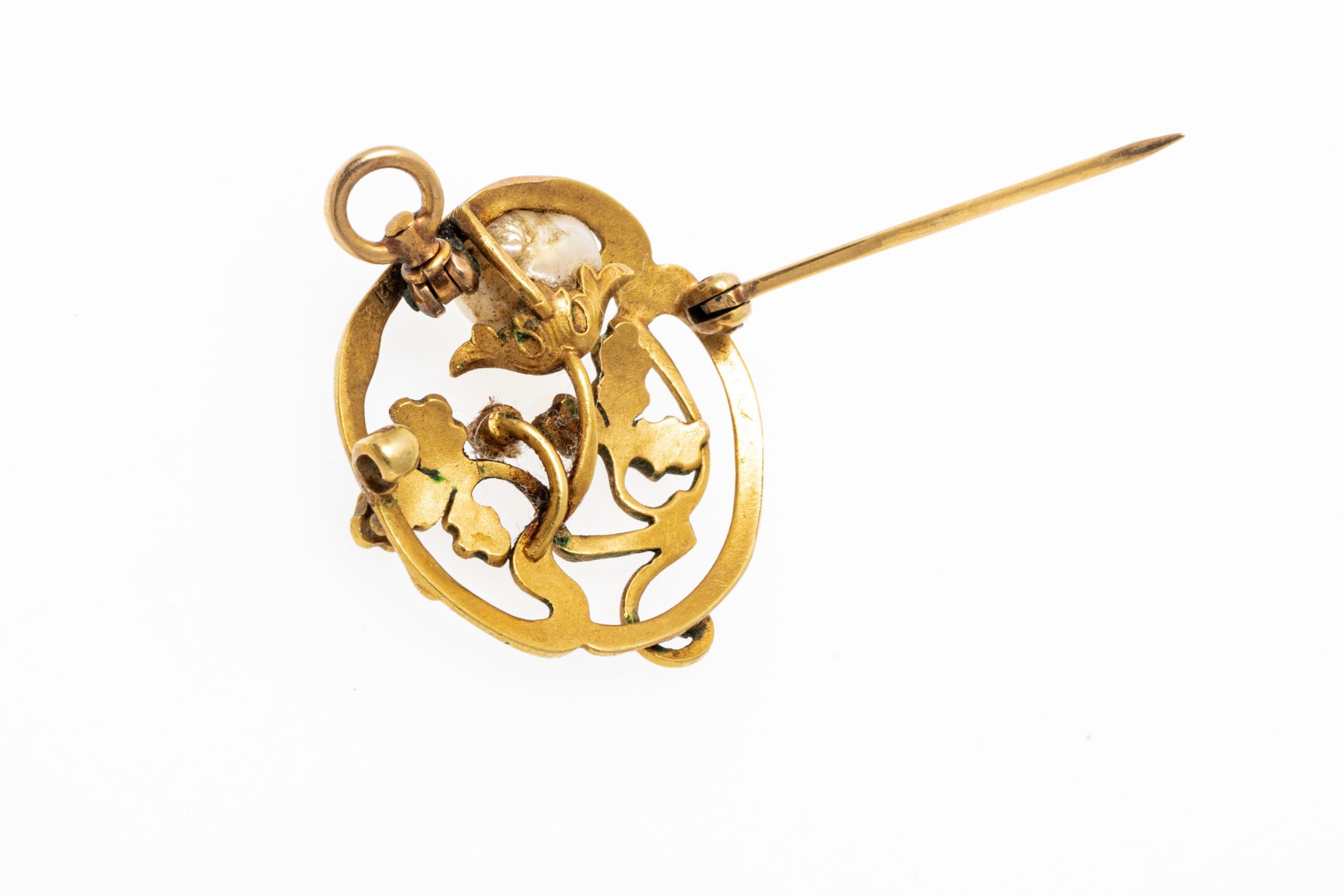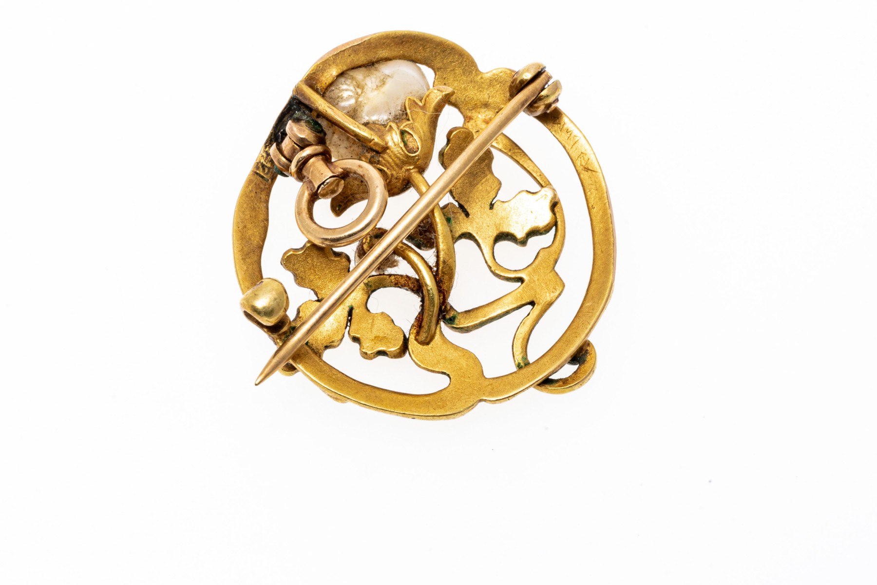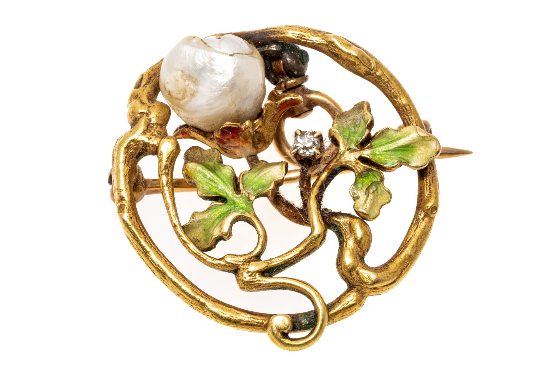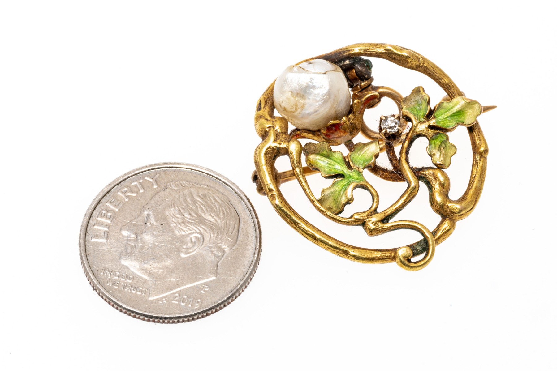 14k yellow gold beautiful antique Art Nouveau enamel and cultured pearl brooch, diamond accented