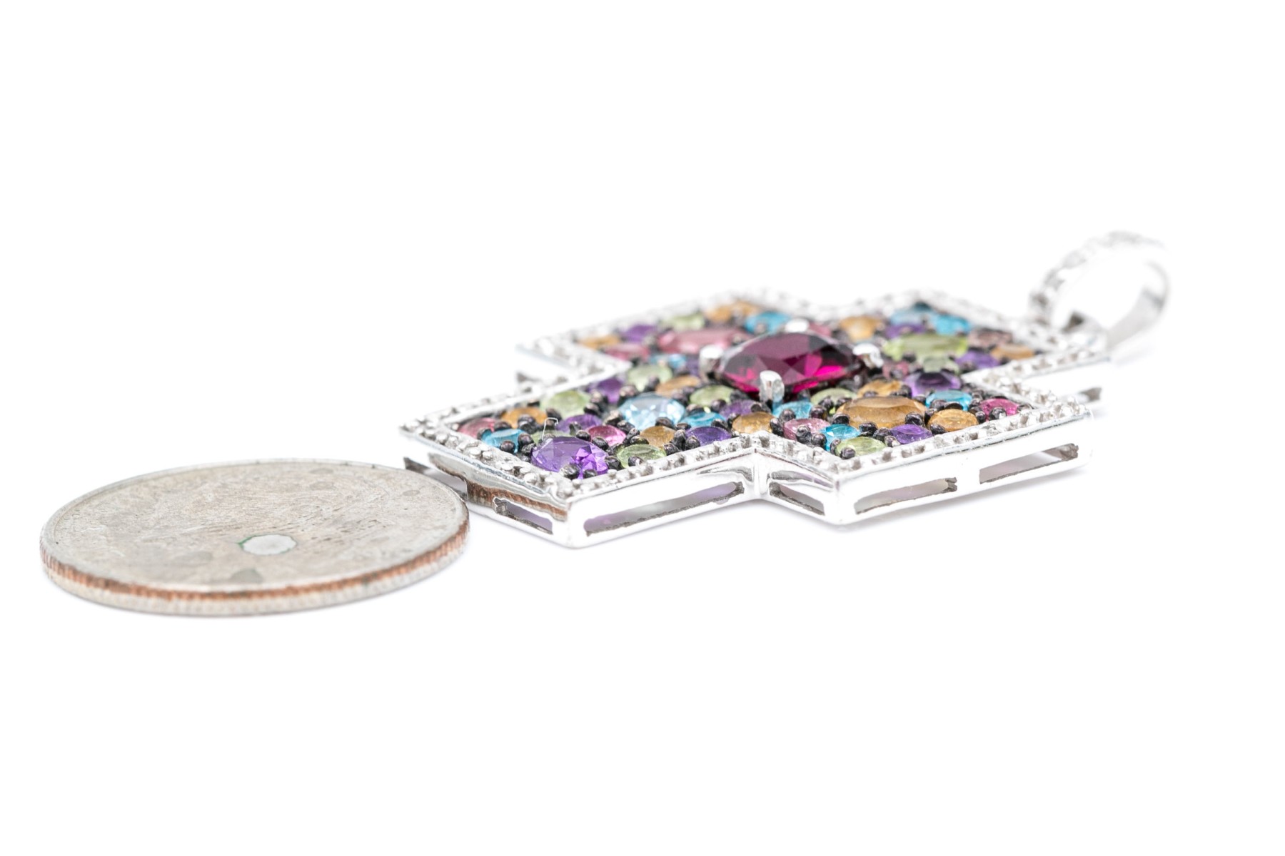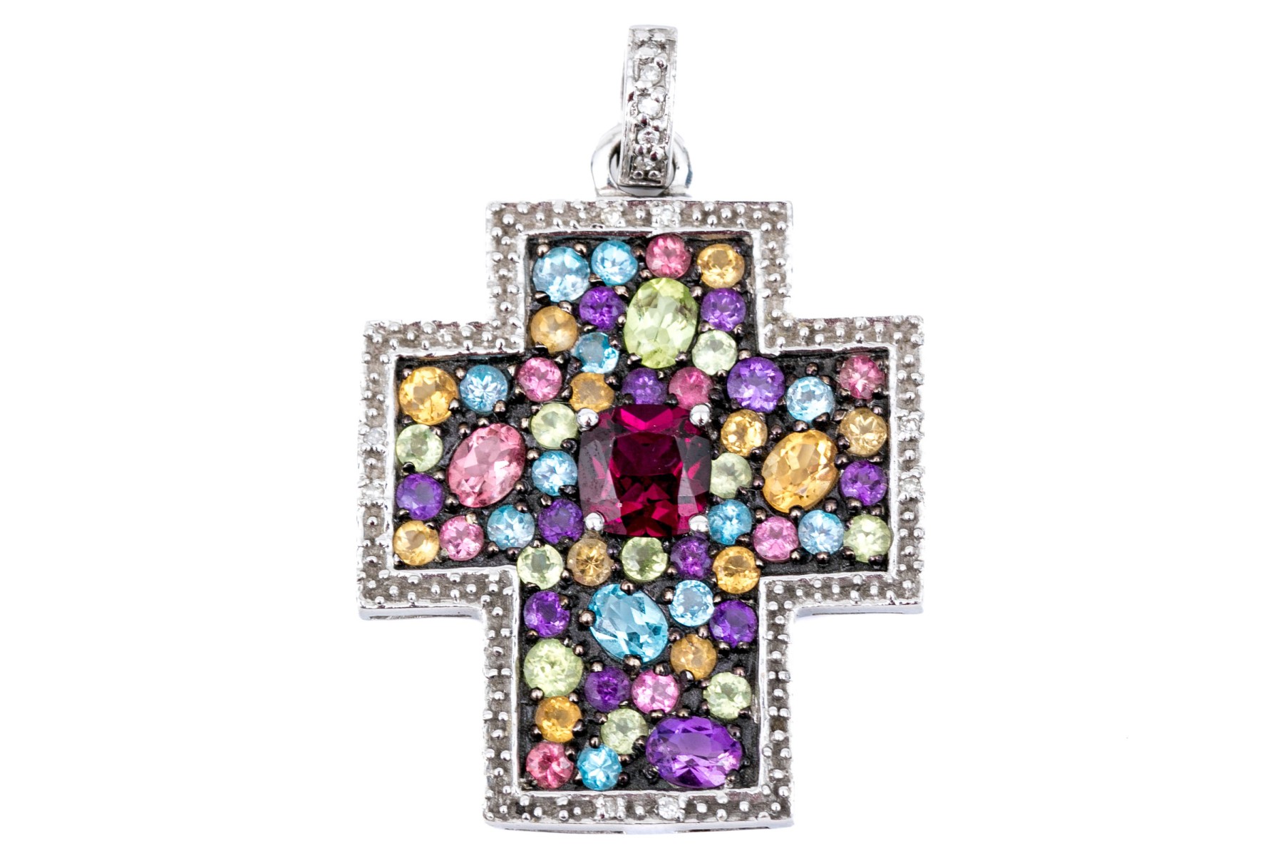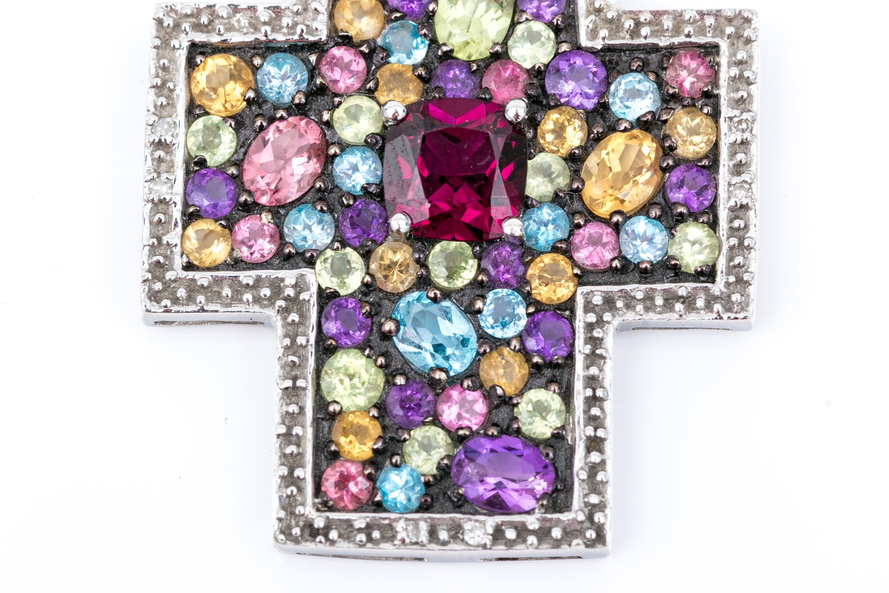 14k white gold beautiful chunky multi stone cross pendant, prong set with garnet, tourmaline, citrine amethyst and blue topaz stones, edged in diamonds, finished with a diamond bale