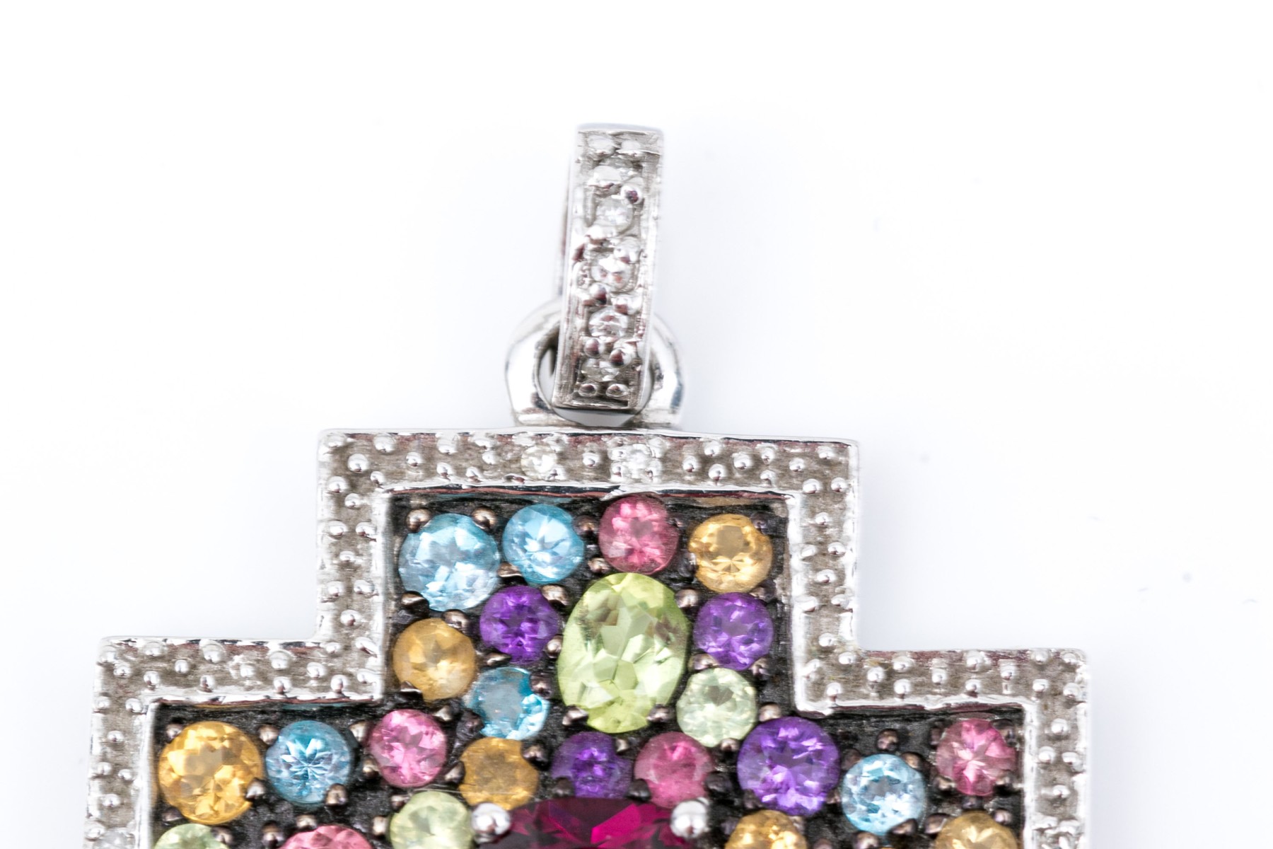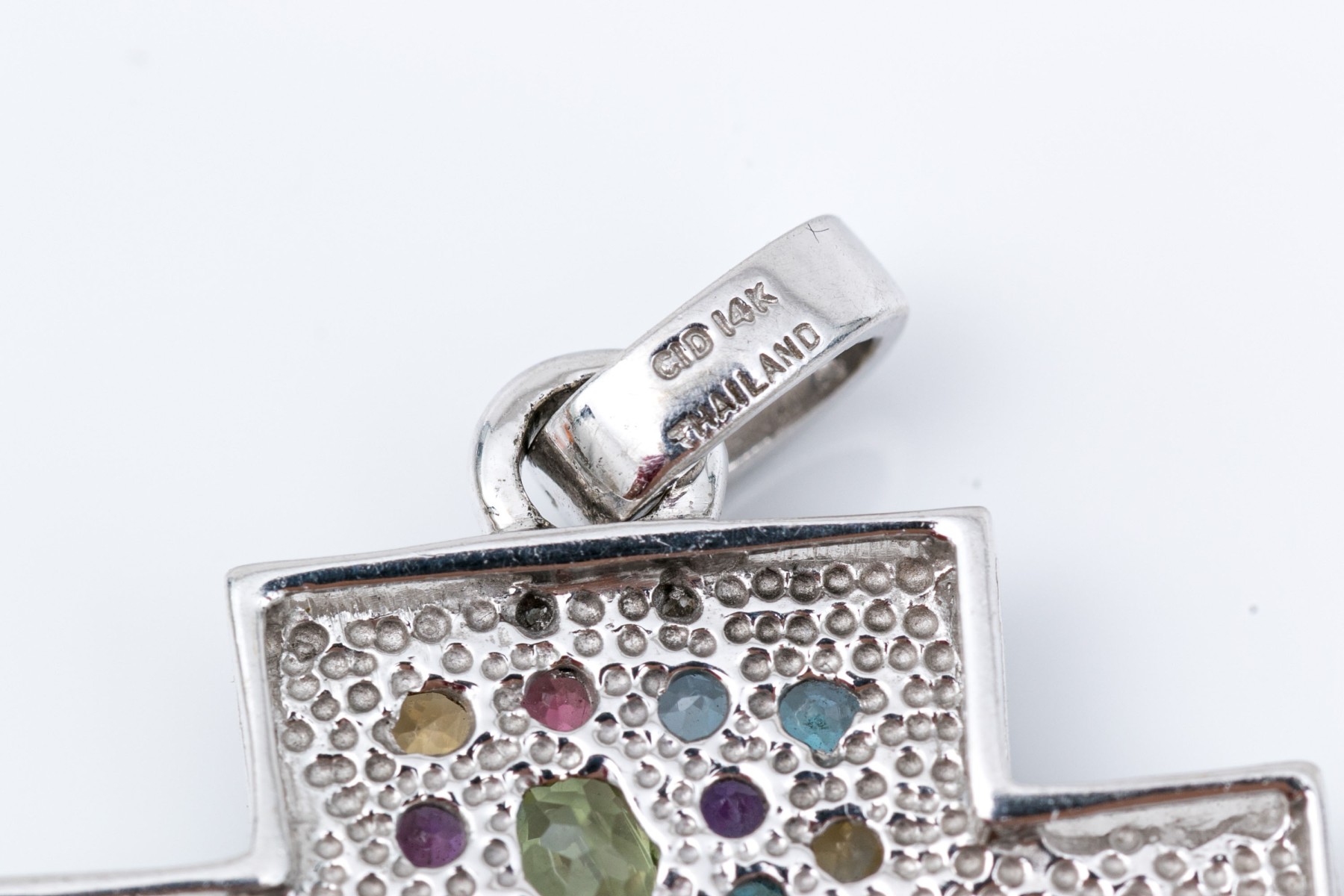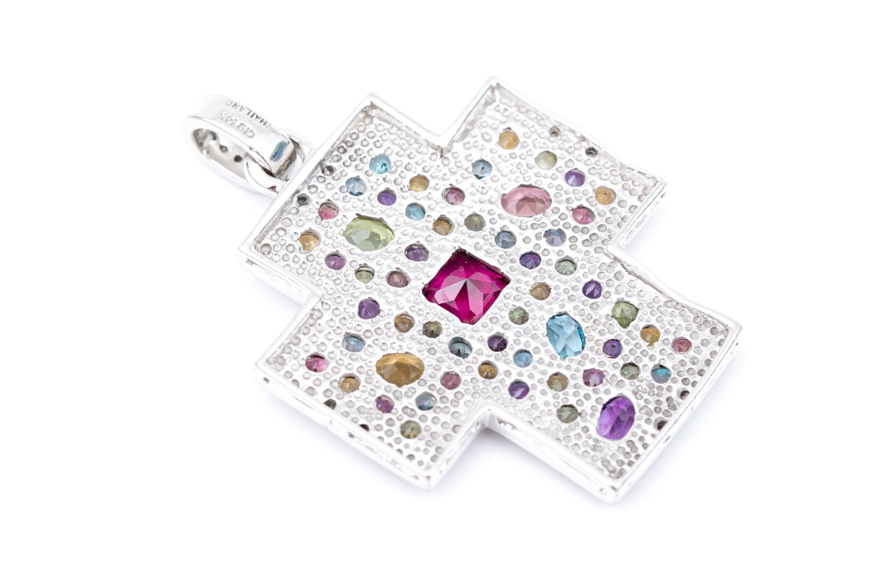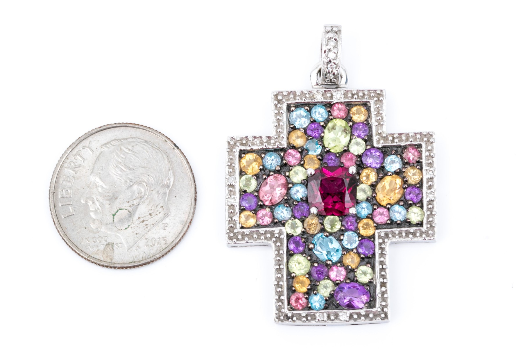14k white gold beautiful chunky multi stone cross pendant, prong set with garnet, tourmaline, citrine amethyst and blue topaz stones, edged in diamonds, finished with a diamond bale